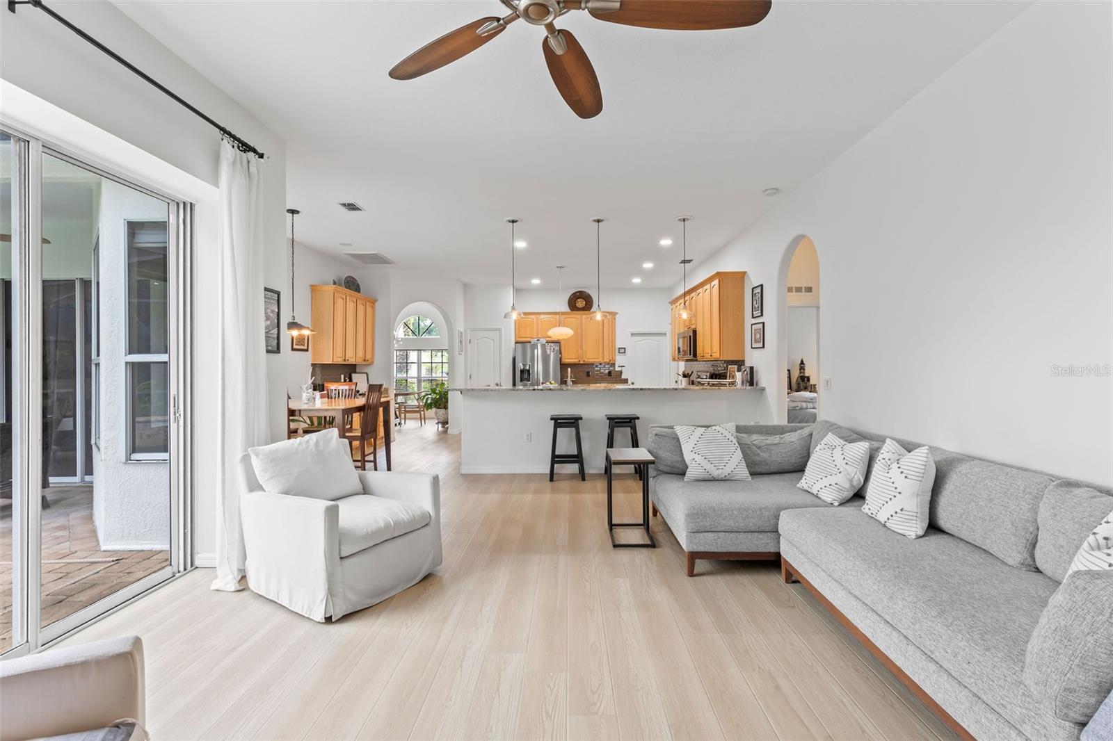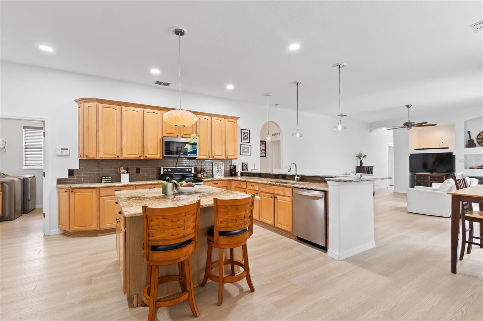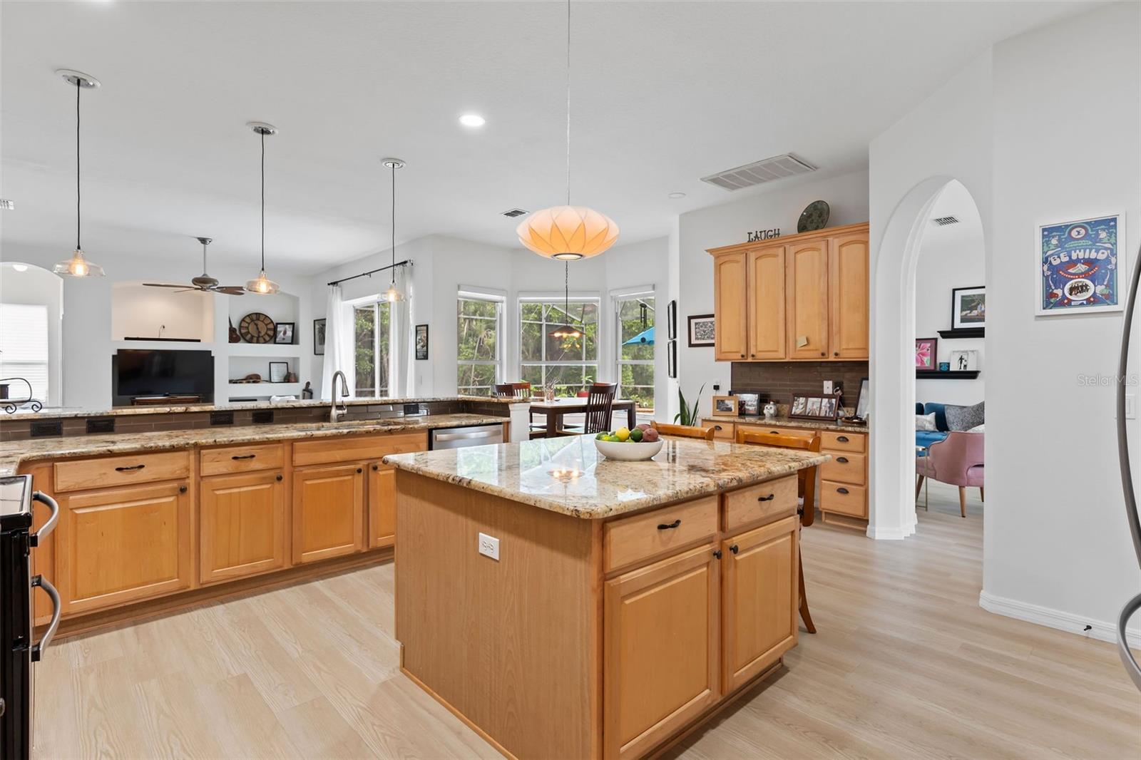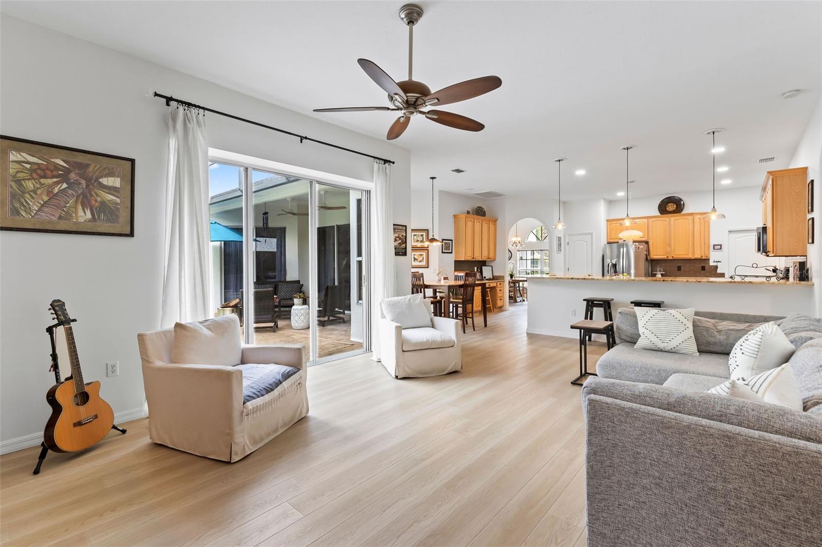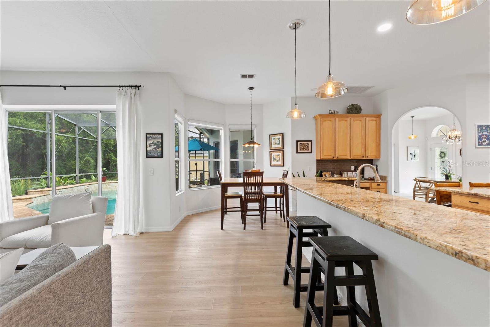Live the Florida lifestyle in this stylish 4-bedroom, 3-bath saltwater pool home in the desirable Sunrise Oaks community. Designed with function and flow in mind, this home offers a split bedroom layout, high ceilings, and an open concept living space ideal for modern living. The large kitchen boasts granite countertops, stainless steel appliances, a center island, and a breakfast bar—seamlessly connecting to the spacious family room and eat-in dining area. There’s also a separate living room, perfect for additional entertainment space, a quiet reading nook, or a more formal setting as well as formal dining room. With luxury vinyl plank flooring throughout and one recently renovated bathroom, the home is updated and move-in ready. The private master suite features an ensuite with soaking tub, separate shower, and water closet. Two additional bedroom wings provide ideal privacy for guests or multi-generational living, and one bathroom offers direct access to the pool. A separate office and laundry room with sink add convenience, while the 3-car garage ensures space for everything. This home has never flooded, offering both comfort and peace of mind. Updates include a brand-new roof (2024), HVAC (2016), and water heater (2020). All information taken from the tax record, and while deemed reliable, cannot be guaranteed.