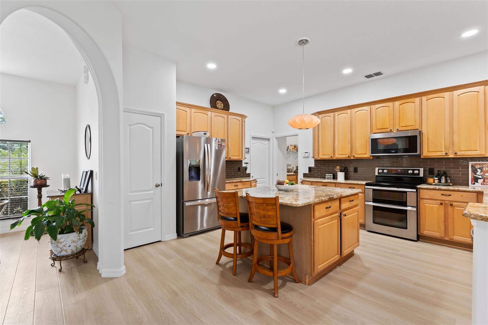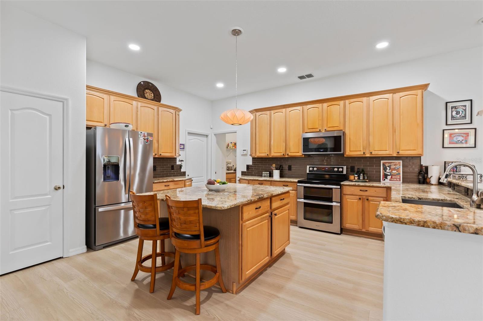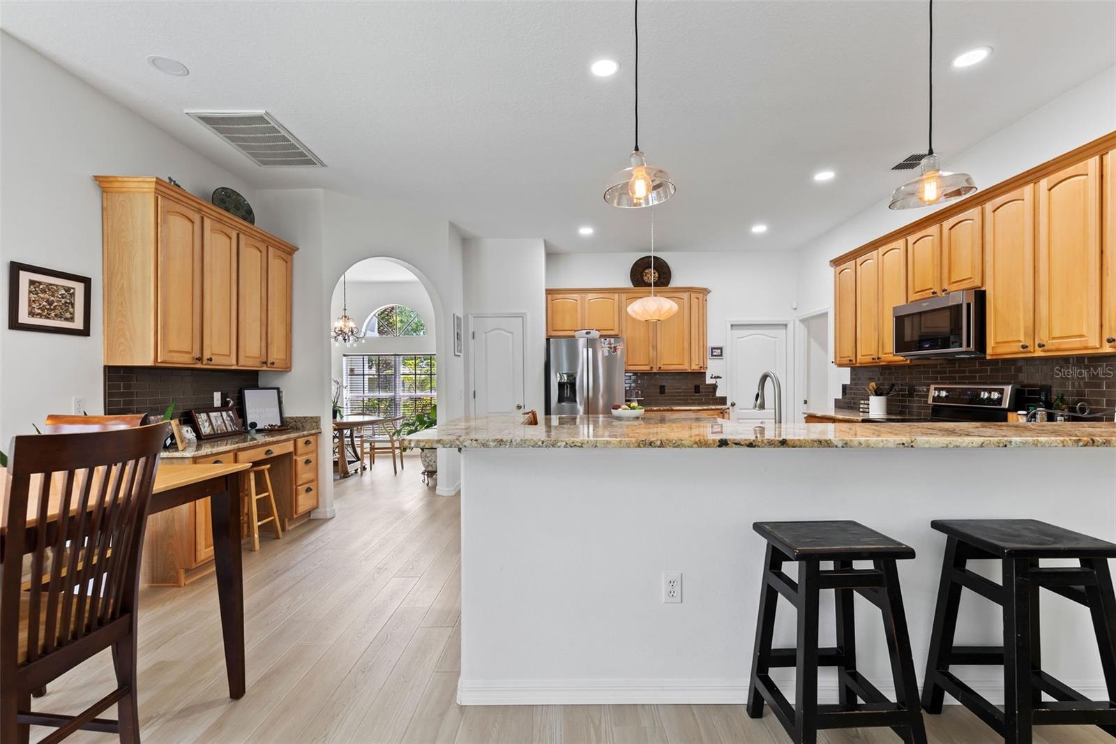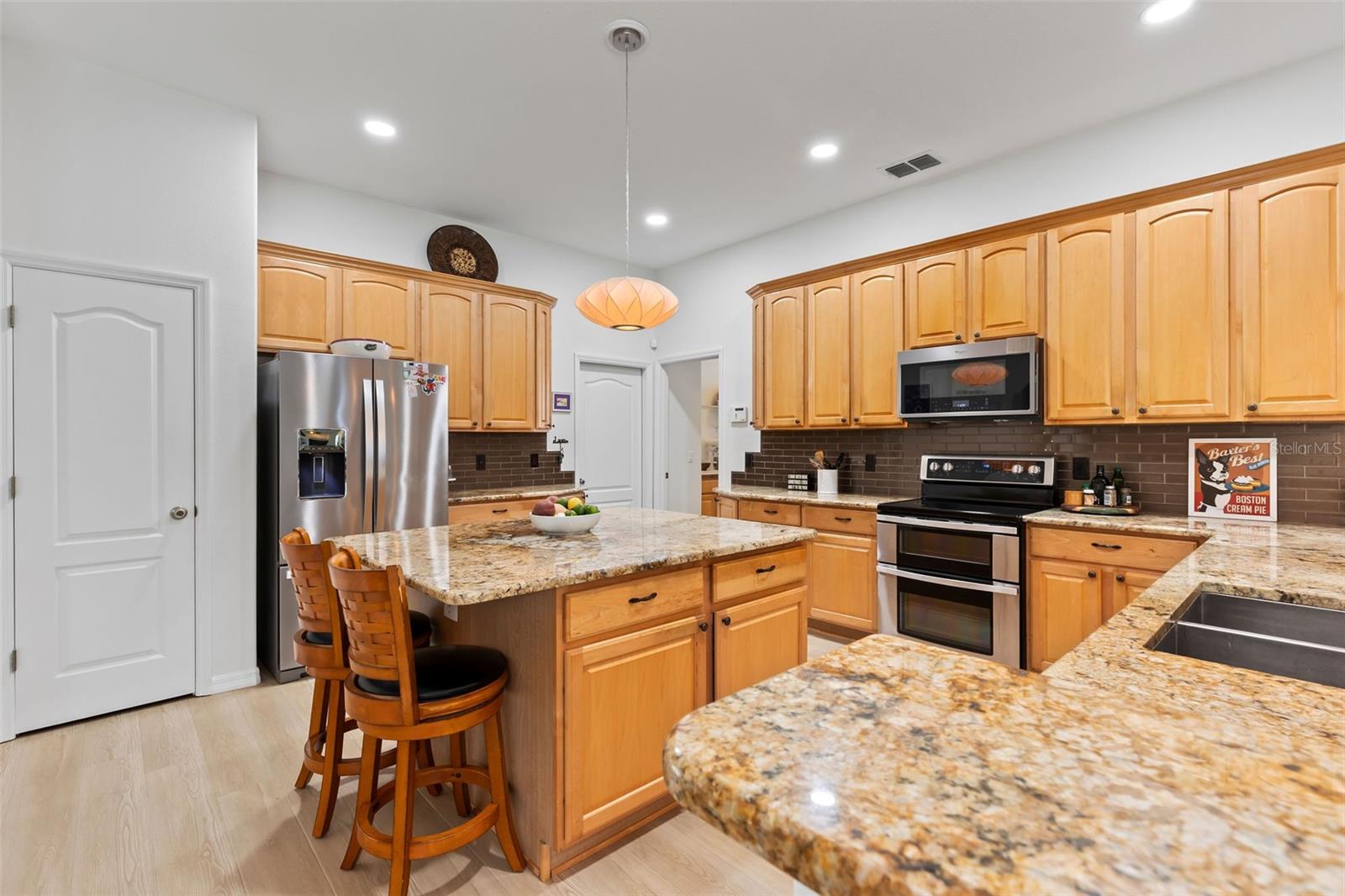 Live the Florida lifestyle in this stylish 4-bedroom, 3-bath saltwater pool home in the desirable Sunrise Oaks community. Designed with function and flow in mind, this home offers a split bedroom layout, high ceilings, and an open concept living space ideal for modern living. The large kitchen boasts granite countertops, stainless steel appliances, a center island, and a breakfast bar—seamlessly connecting to the spacious family room and eat-in dining area. There’s also a separate living room, perfect for additional entertainment space, a quiet reading nook, or a more formal setting as well as formal dining room. With luxury vinyl plank flooring throughout and one recently renovated bathroom, the home is updated and move-in ready. The private master suite features an ensuite with soaking tub, separate shower, and water closet. Two additional bedroom wings provide ideal privacy for guests or multi-generational living, and one bathroom offers direct access to the pool. A separate office and laundry room with sink add convenience, while the 3-car garage ensures space for everything. This home has never flooded, offering both comfort and peace of mind. Updates include a brand-new roof (2024), HVAC (2016), and water heater (2020). All information taken from the tax record, and while deemed reliable, cannot be guaranteed.