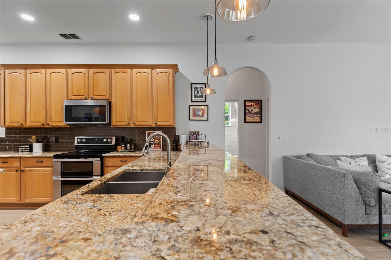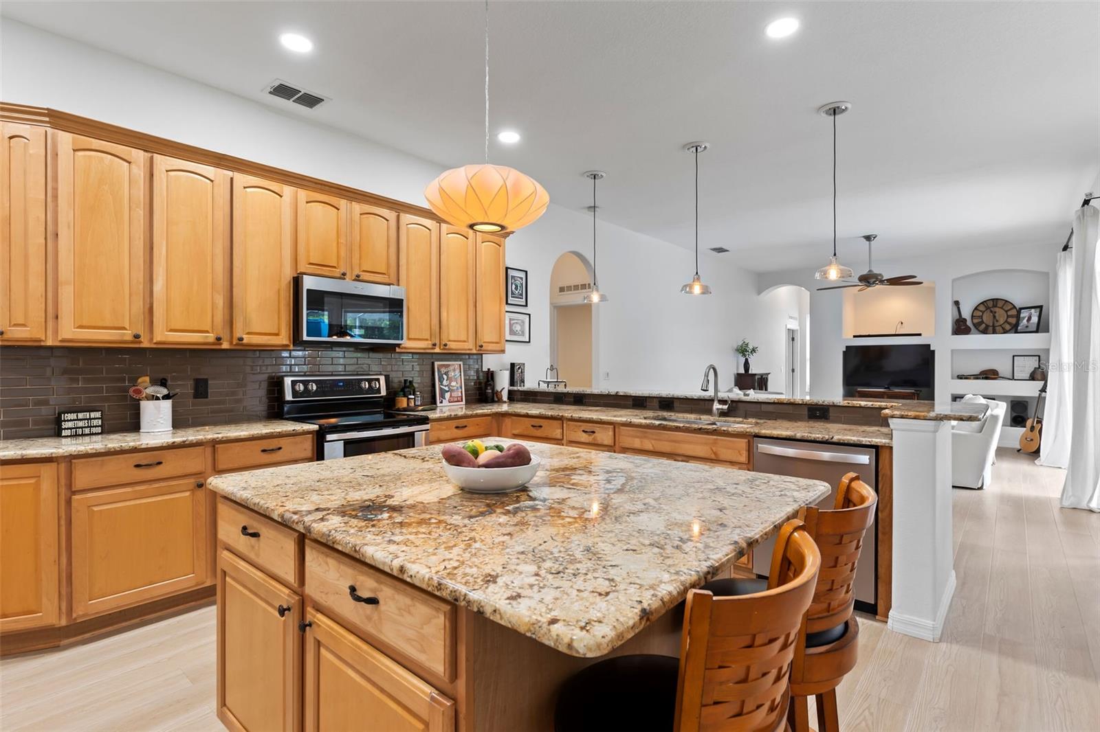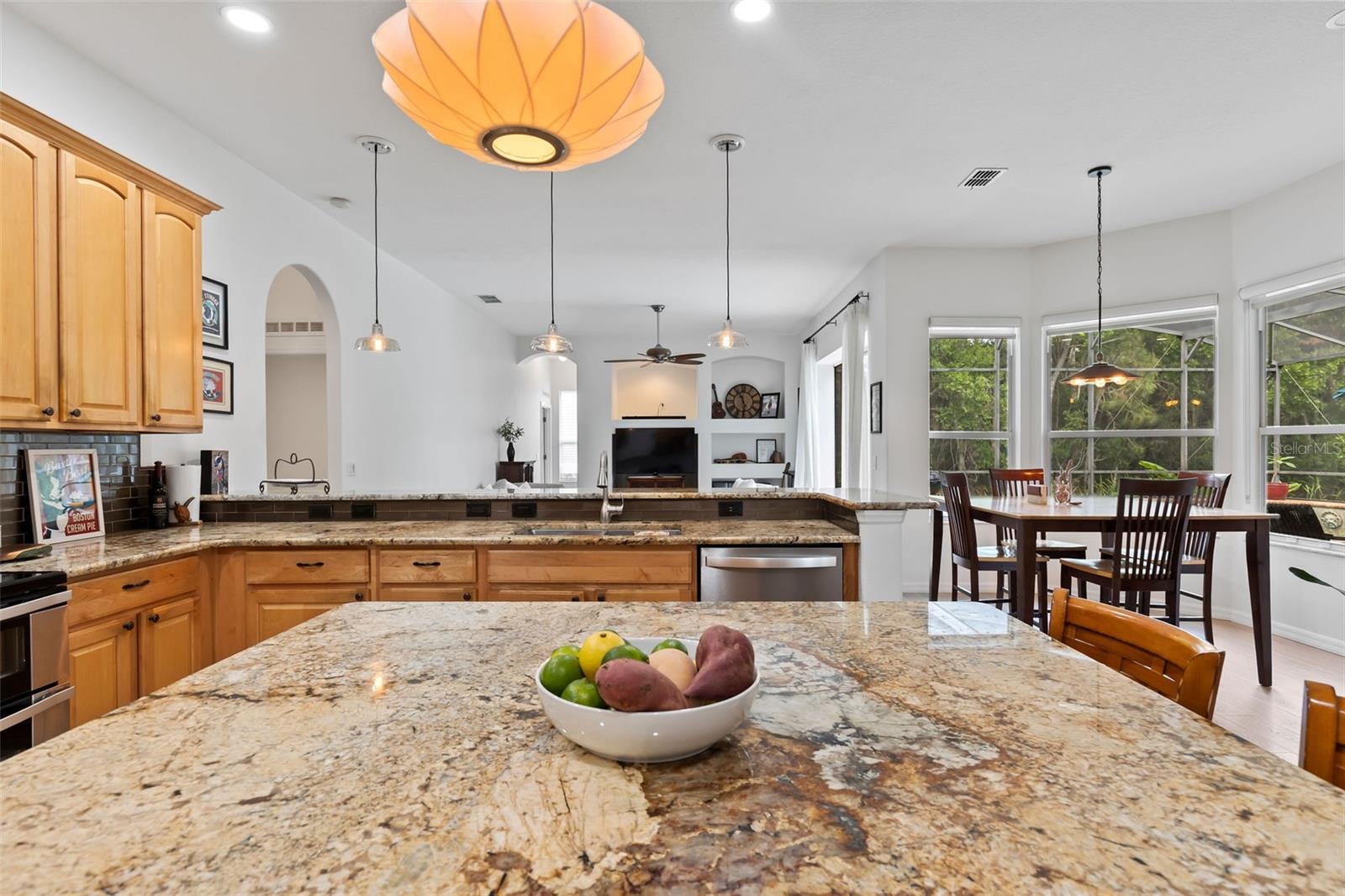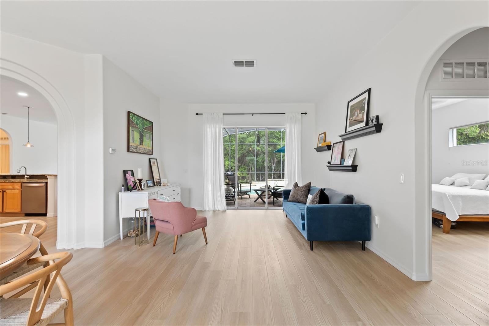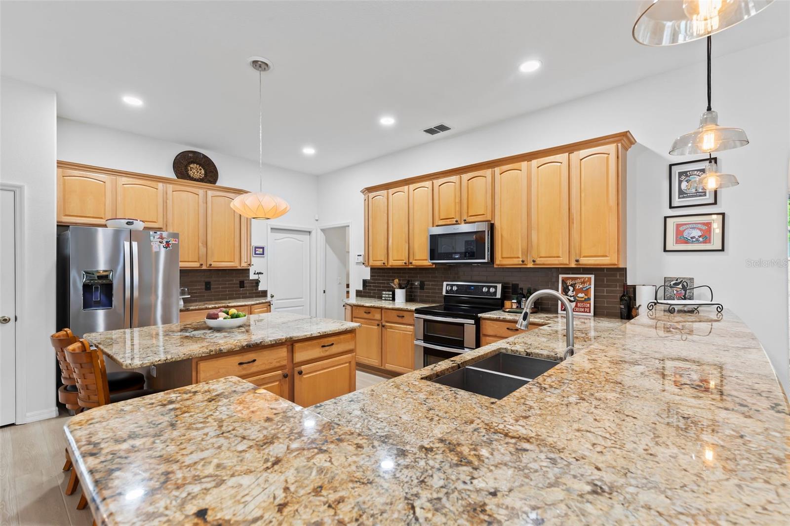 Live the Florida lifestyle in this stylish 4-bedroom, 3-bath saltwater pool home in the desirable Sunrise Oaks community. Designed with function and flow in mind, this home offers a split bedroom layout, high ceilings, and an open concept living space ideal for modern living. The large kitchen boasts granite countertops, stainless steel appliances, a center island, and a breakfast bar—seamlessly connecting to the spacious family room and eat-in dining area. There’s also a separate living room, perfect for additional entertainment space, a quiet reading nook, or a more formal setting as well as formal dining room. With luxury vinyl plank flooring throughout and one recently renovated bathroom, the home is updated and move-in ready. The private master suite features an ensuite with soaking tub, separate shower, and water closet. Two additional bedroom wings provide ideal privacy for guests or multi-generational living, and one bathroom offers direct access to the pool. A separate office and laundry room with sink add convenience, while the 3-car garage ensures space for everything. This home has never flooded, offering both comfort and peace of mind. Updates include a brand-new roof (2024), HVAC (2016), and water heater (2020). All information taken from the tax record, and while deemed reliable, cannot be guaranteed.