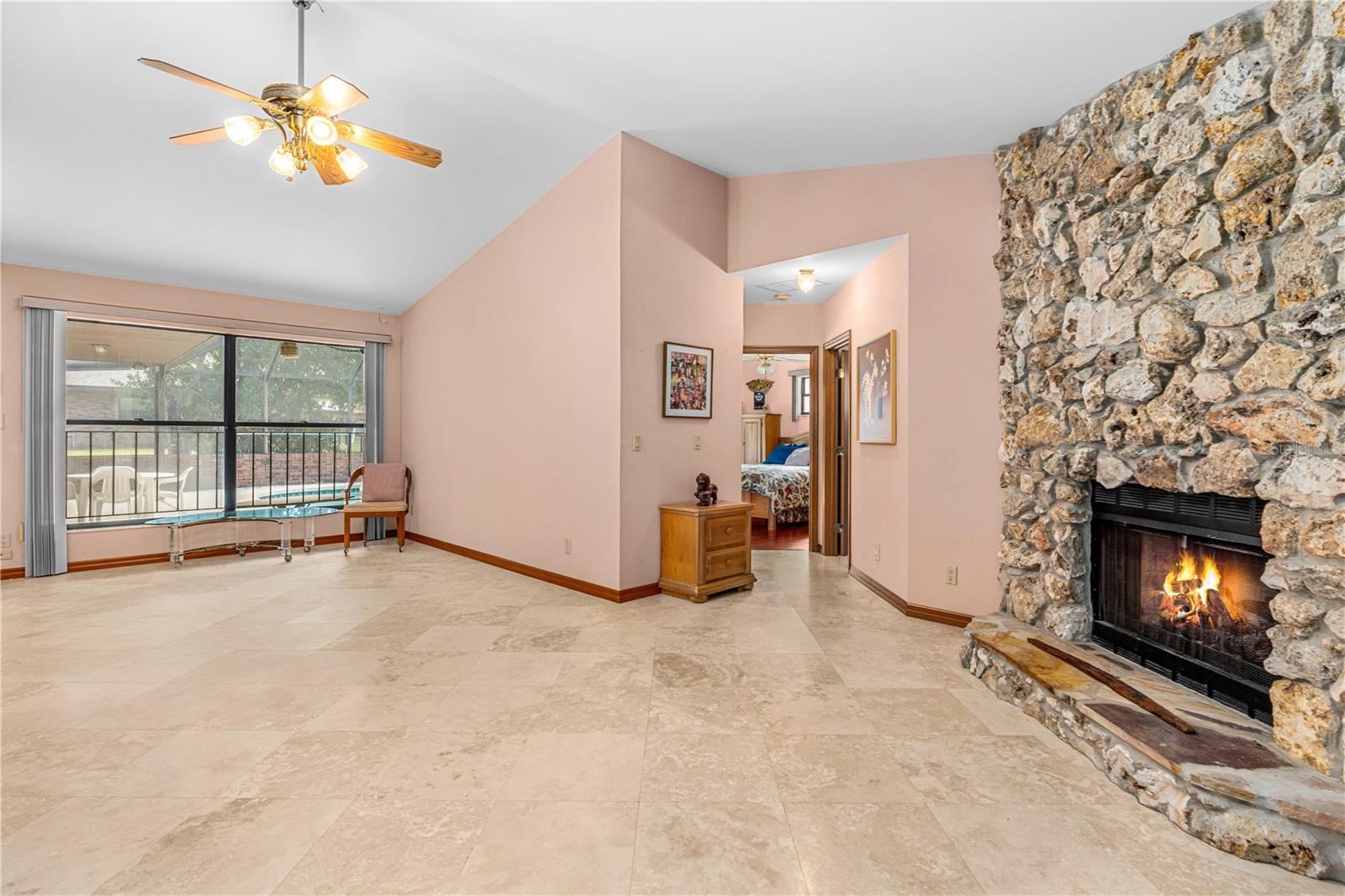 Private Pool Home on 1 Acre in the Heart of Port Orange. Welcome to this beautifully maintained 3-bedroom, 2-bath pool home situated on a full 1-acre lot offering space, privacy, and versatility. Designed with a split floor plan, this home features a custom-updated kitchen with upgraded cabinetry, countertops, and travertine flooring, perfect for both everyday living and entertaining. The formal dining room and spacious living area with fireplace create a warm and inviting atmosphere. The primary suite showcases travertine flooring, sliders leading directly to the screened pool area, and a well-appointed bath with double sink vanity and a separate vanity space ideal for daily routines. One guest bedroom is poolside with sliders, providing a quiet and private retreat, while the second guest bedroom—currently used as a music room—offers flexibility for guests or a home office. Outside, enjoy the screened pool area along with two storage sheds for lawn equipment and tools. The rear of the property features a detached garage with two 14' doors, ideal for storing recreational vehicles, collector cars, or creating a workshop. This property offers the perfect blend of indoor comfort and outdoor functionality. All measurements and information deemed to be accurate but cannot be guaranteed. Buyers and Realtors are advised to verify.
