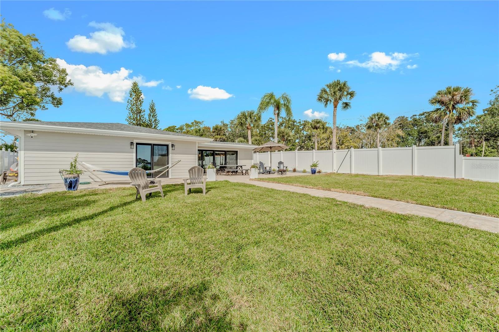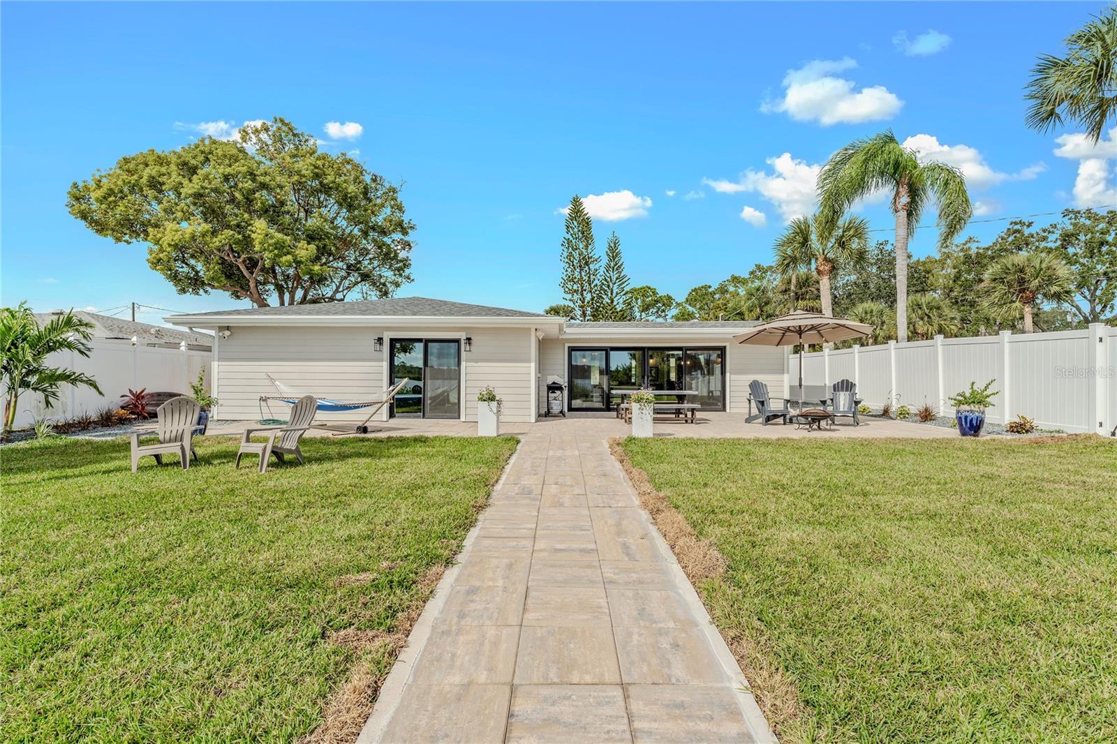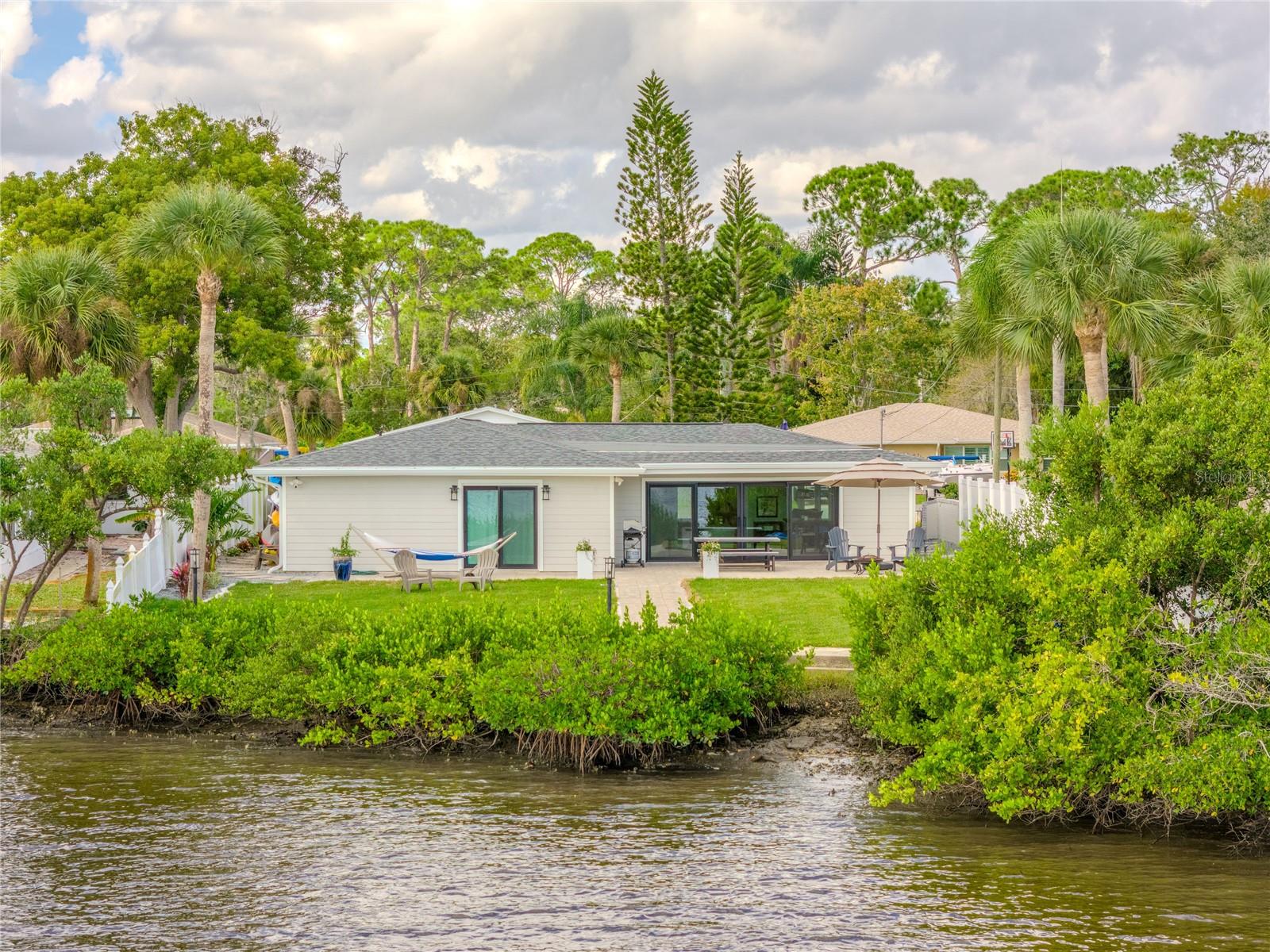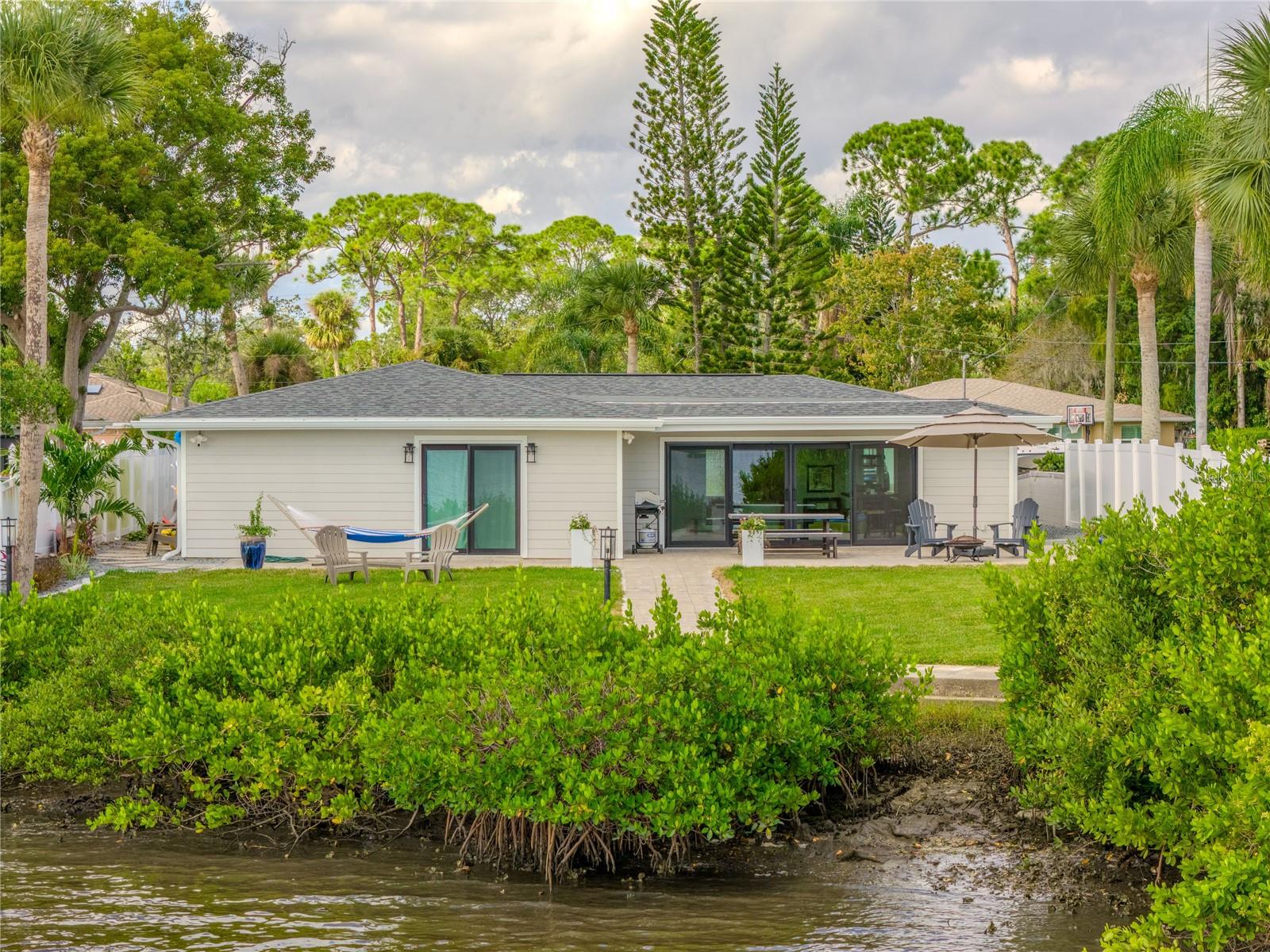 Indulge in the tranquility of coastal living with this enchanting property, boasting nearly 80 feet of bay frontage along the serene Rosebay. A gateway to coastal delights awaits you, inviting you to immerse yourself in expansive views, enjoy leisurely fishing and kayaking, and revel in the delightful company of dolphins and manatees—just a short boat ride away from the inlet and Disappearing Island. After a day spent on the water, find your oasis of calm on the hammock, gently swaying with the rhythm of the bay breeze on the spacious stone patio. The coastal charm seamlessly extends indoors, where a beautiful new bay window and sliders frame the scenery. Modern finishes, durable neutral porcelain tile, and custom light fixtures enhance the inviting atmosphere throughout the home. The heart of this tropical retreat lies in its open floor plan, anchored by a brand new kitchen featuring an entertainer's dream island. Discover the joy of cooking with all-new appliances and an extended area dedicated to your wine and coffee pleasures, offering ample storage for your convenience. The owner's suite is a dream space, providing a captivating view of Rosebay, a walk-in closet, a second storage closet, and an extended patio for those serene sunrise moments. Luxuriate in the upgraded master bath adorned with designer finishes. Two other generously sized bedrooms offer ample space and storage, complemented by a nearby delightful guest bath. This coastal haven is not only a retreat for the soul but also a practical investment with recent upgrades including a new roof, AC units, water heaters, appliances, windows, irrigation, and landscaping. Discover the allure of this home, nestled in a vibrant marine ecosystem right behind its walls, with delicious restaurants and pristine beaches just minutes away. Welcome to your new sanctuary by the sea!