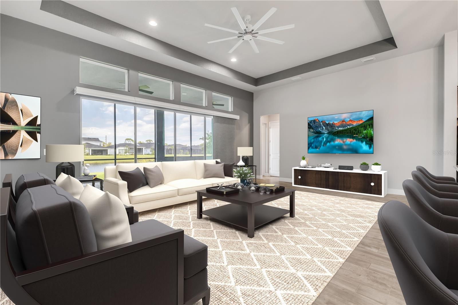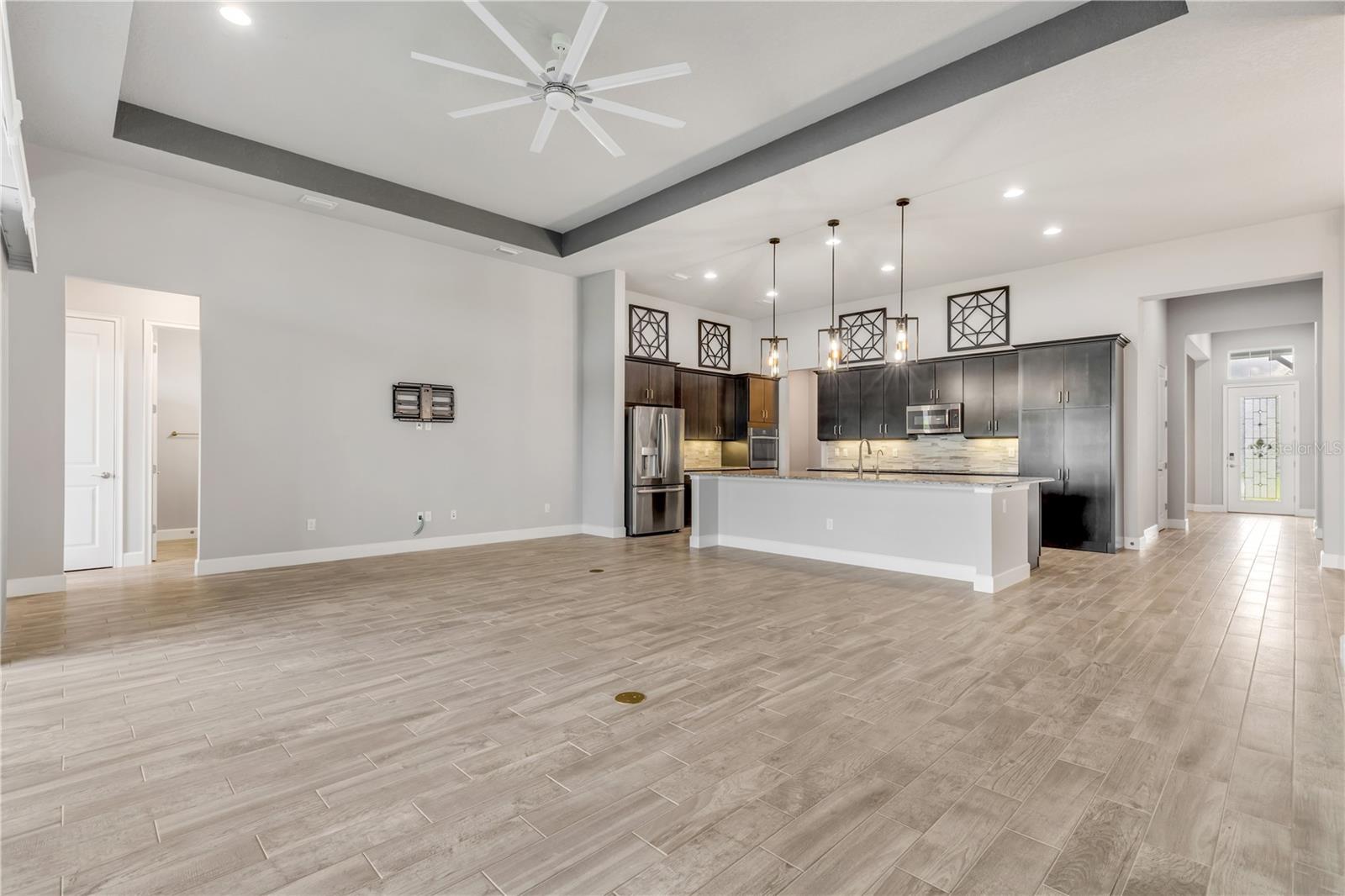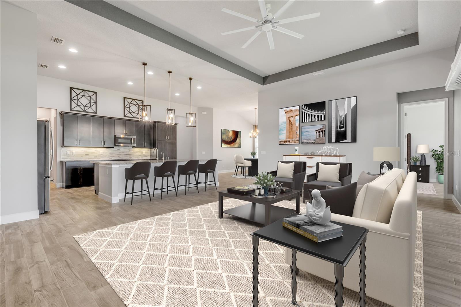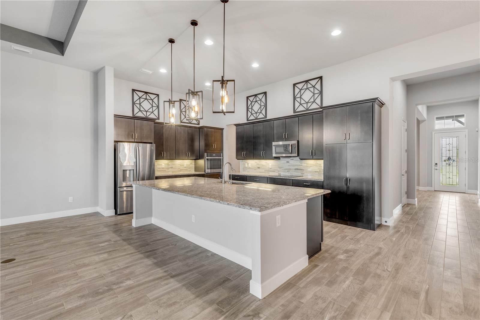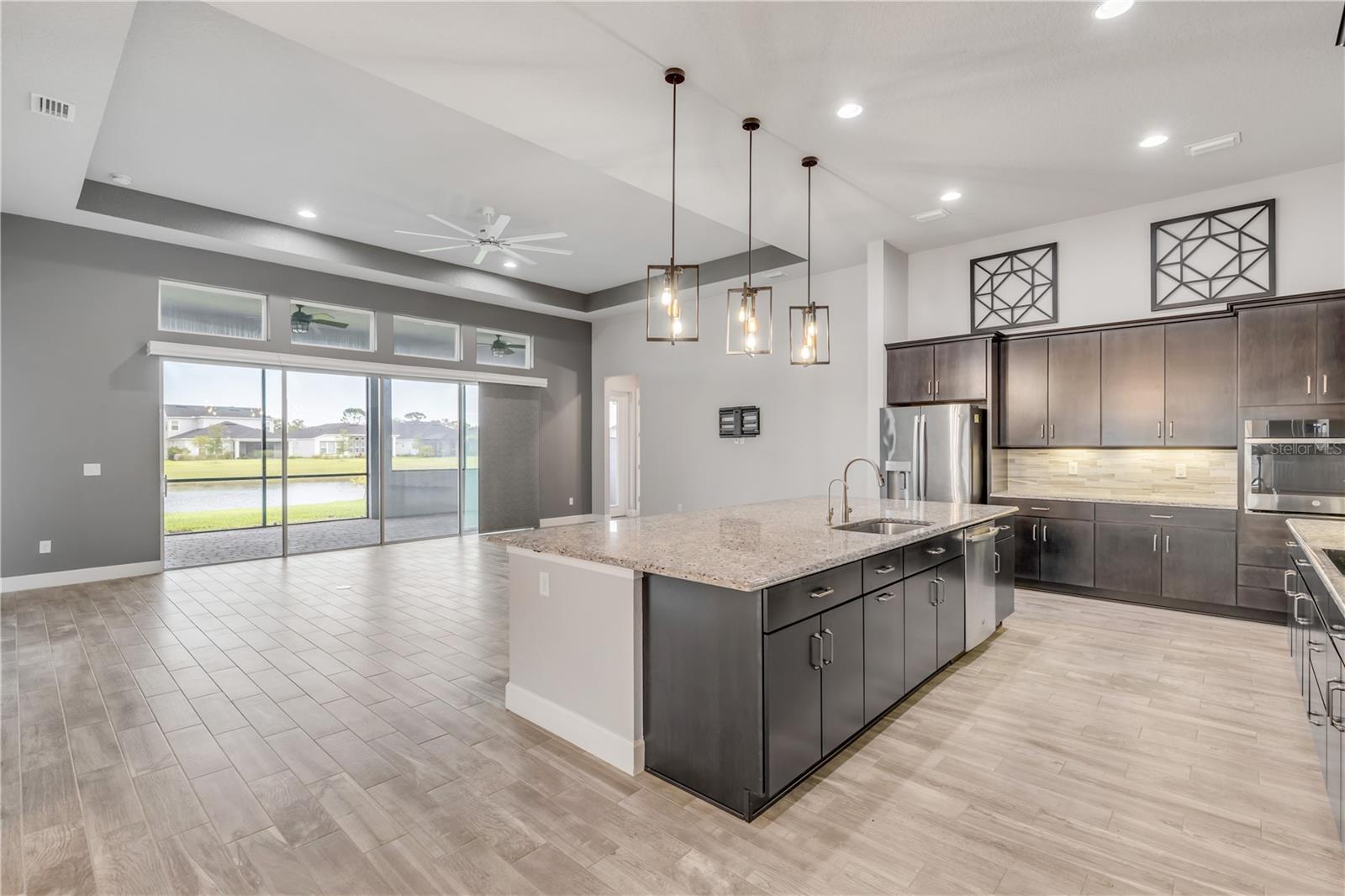 One or more photo(s) has been virtually staged. Nestled in the serene gated community of Woodhaven in Port Orange, Florida, this exceptional single-family home provides a blend of luxury and comfort. Boasting 4 bedrooms and 3 bathrooms across 2,545 square feet of beautifully designed living space, this residence is perfect for those seeking both style and practicality. As you arrive, you'll appreciate the upgraded brick-paved driveway, which leads you to a welcoming entrance. Inside, high ceilings and abundant natural light create an inviting atmosphere throughout the spacious open floor plan. The heart of the home—the kitchen—features modern pendant lighting, stainless steel appliances, and a built-in oven. A striking tiled backsplash and ample cabinetry enhance its functionality, while the large granite center island provides additional prep space and a stylish focal point. Connecting seamlessly to the living room, this kitchen is ideal for both everyday living and entertaining. The primary bedroom is a retreat in itself, showcasing vaulted ceilings and windows that frame a serene pond view. The en suite bathroom is designed with luxury in mind, featuring dual sinks with sleek hardware, contemporary lighting, and a generously sized walk-in shower. Outside, the screened-in lanai with ceiling fans provides a perfect space to relax and enjoy the pond view. Additional upgrades include an ICI Home generator and two water softeners, saltwater filtration system, alongside updated fans and lighting throughout. The Woodhaven community itself provides outstanding amenities, including a sparkling resort-style pool, enhancing your living experience in this picturesque setting. Experience unparalleled elegance and modern comfort in a home designed for a refined lifestyle—schedule your showing today and make this dream home yours!