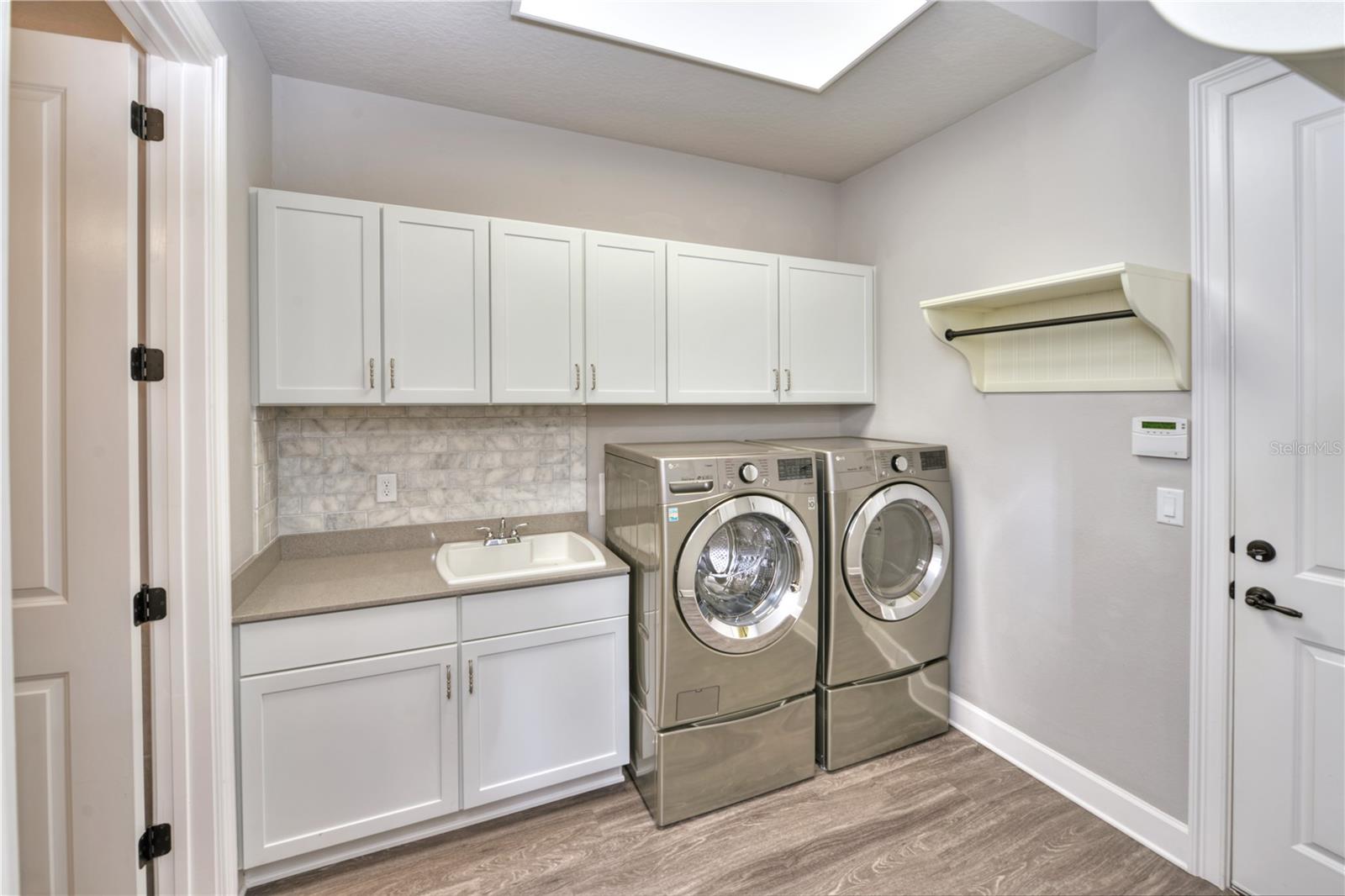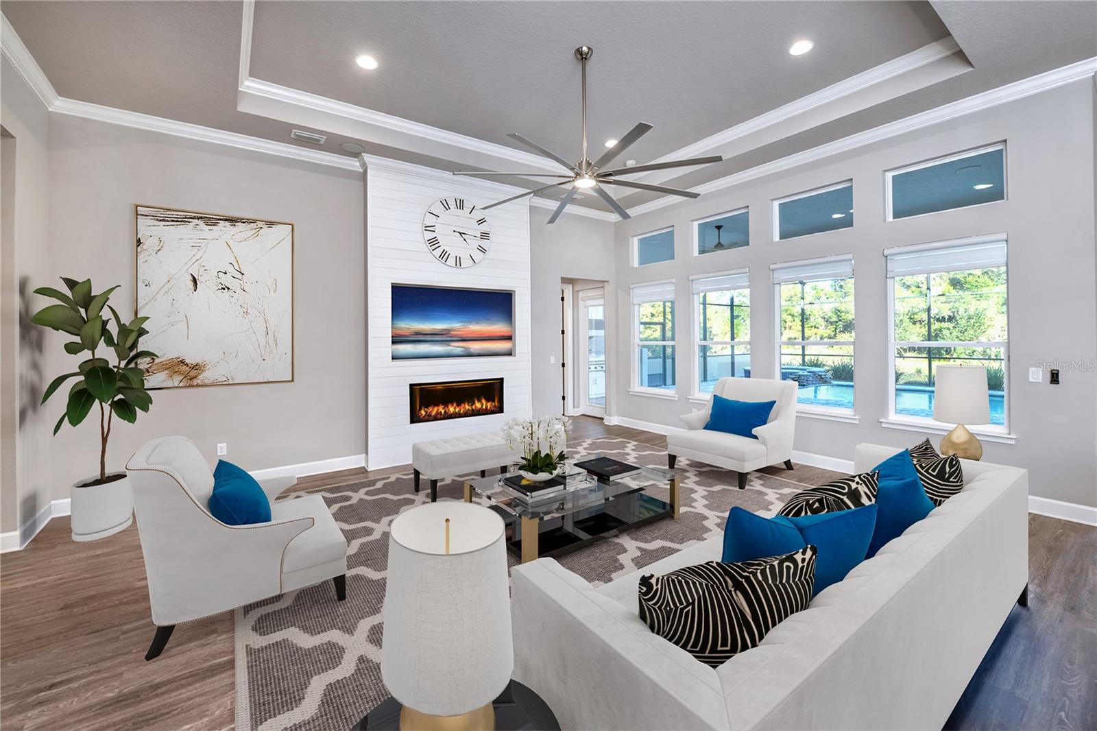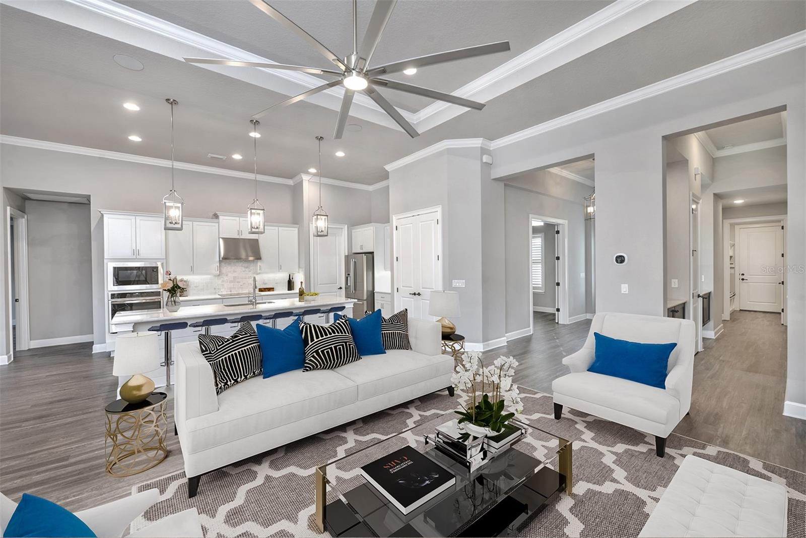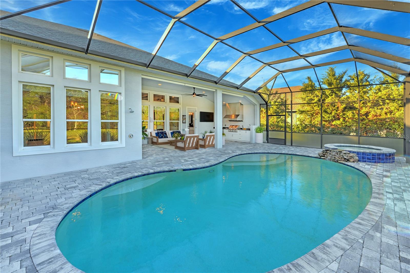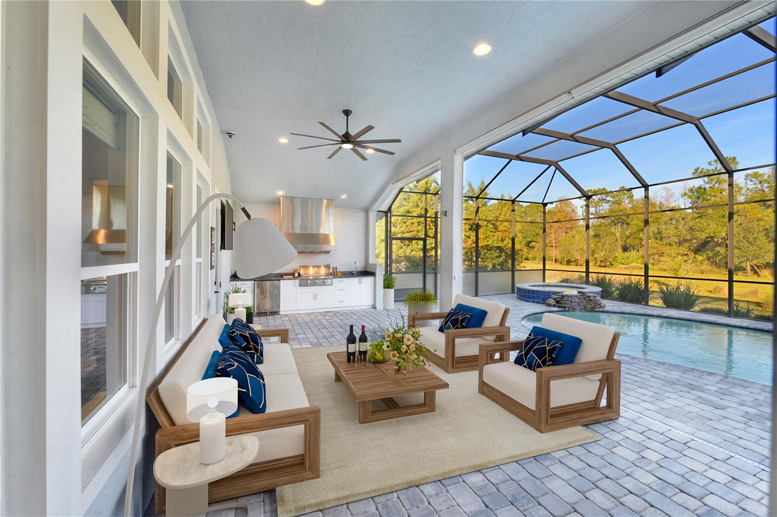 Under contract-accepting backup offers. One or more photo(s) has been virtually staged. Exquisite One-Story Home with Luxurious Features and Private Resort-like Amenities. This exceptional one-story, 3-car garage home seamlessly blends upscale finishes with a sense of comfort and sophistication. The open-concept layout, meticulously designed and appointed, features four spacious bedrooms, office (5th bedroom) and three and a half baths. The great room is highlighted by a shiplap-accented wall, complete with a fireplace that creates a welcoming ambiance, and an expansive wall of windows that invite natural light to fill the space. At the heart of the home, the chef's kitchen offers an abundance of custom cabinetry, a large center island, quartz countertops, and premium stainless steel appliances—creating an ideal space for family gatherings and culinary endeavors. The adjacent dining room offers a seamless transition for entertaining. The luxurious owner's suite is bathed in natural light and showcases an intricate double trey ceiling, with double doors that open to a spa-like bath. The striking oval soaking tub, illuminated by a dazzling chandelier and framed by a waterfall-tiled feature wall, serves as the focal point of the room. The bath also includes a spacious custom shower, double vanities, a separate water closet, and an impressive walk-in closet that leads directly into the conveniently located laundry room. Throughout the home, high-end flooring flows seamlessly from room to room with no transitions, enhancing the cohesive and luxurious feel of the space. Fiber and cable are installed, ensuring modern connectivity throughout. Designed with entertaining in mind, the lanai is an extraordinary outdoor living space, featuring a marine-grade outdoor kitchen complete with a grill, side burner, vent hood with dual fans, refrigerator, sink with disposal, and ample counter space. Relax in the serene outdoor setting as you enjoy the cascading waterfall from the heated spa, which flows into the pool below. The entire space is enhanced by remote-controlled lighting, an outdoor shower, and tall landscaped plantings that offer privacy and seclusion. The home backs to a peaceful preserve, further adding to the tranquil ambiance. Additional highlights include durable epoxy-coated garage floors, hybrid water heater, Grundfos recirculating instant hot water pump, ceiling speakers for surround sound in both living room & lanai plus overhead 8’ garage ceiling storage system. Additional features to be added the week of August 2nd include a new whole house water filtration & water softener system plus a new 77” LG flat screen TV. The home is also equipped with Eufy floodlights, IP cameras, and automated controlled lighting in the halls, bathrooms, and garage for added convenience and security. A private well, installed during construction, serves the home's automated irrigation system and can also be utilized for other outdoor needs. This is truly a private, resort-like retreat an unparalleled combination of elegance, functionality, and comfort. Bullet points of additional upgrades are available. Spruce Creek Fly-In Country Club offers memberships that are open to the public you don't have to be a resident of the community to join. Enjoy access to exceptional golf, dining, and social amenities in one of the most unique private airpark communities in the country. Please note: Some furniture in photos has been virtually staged.