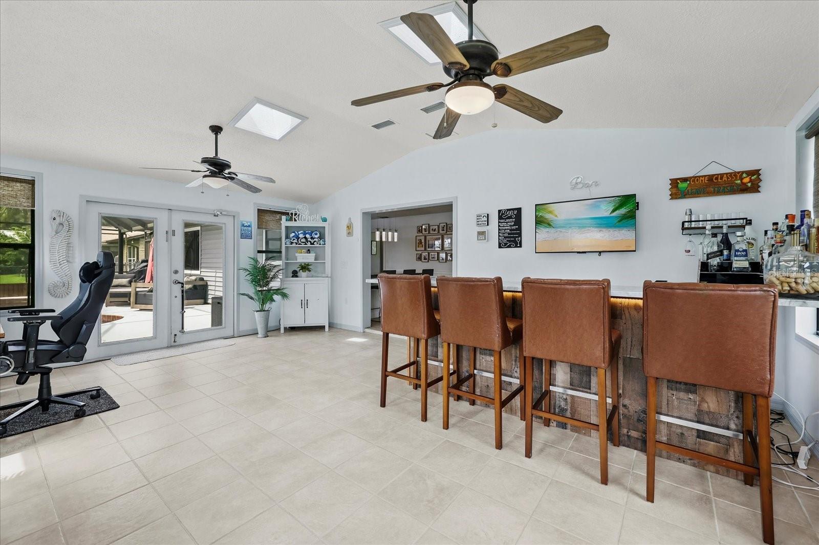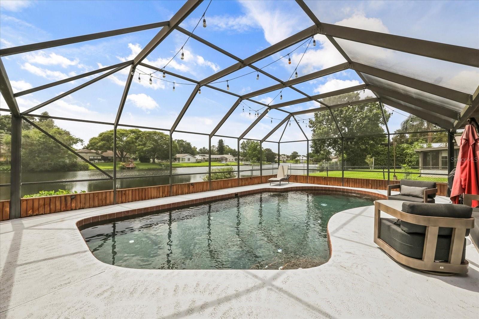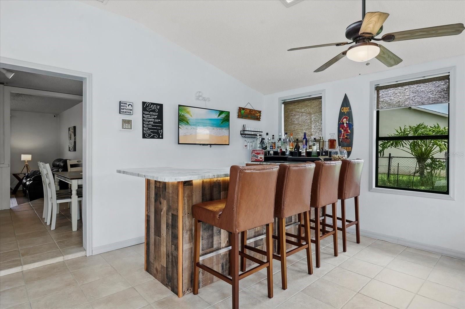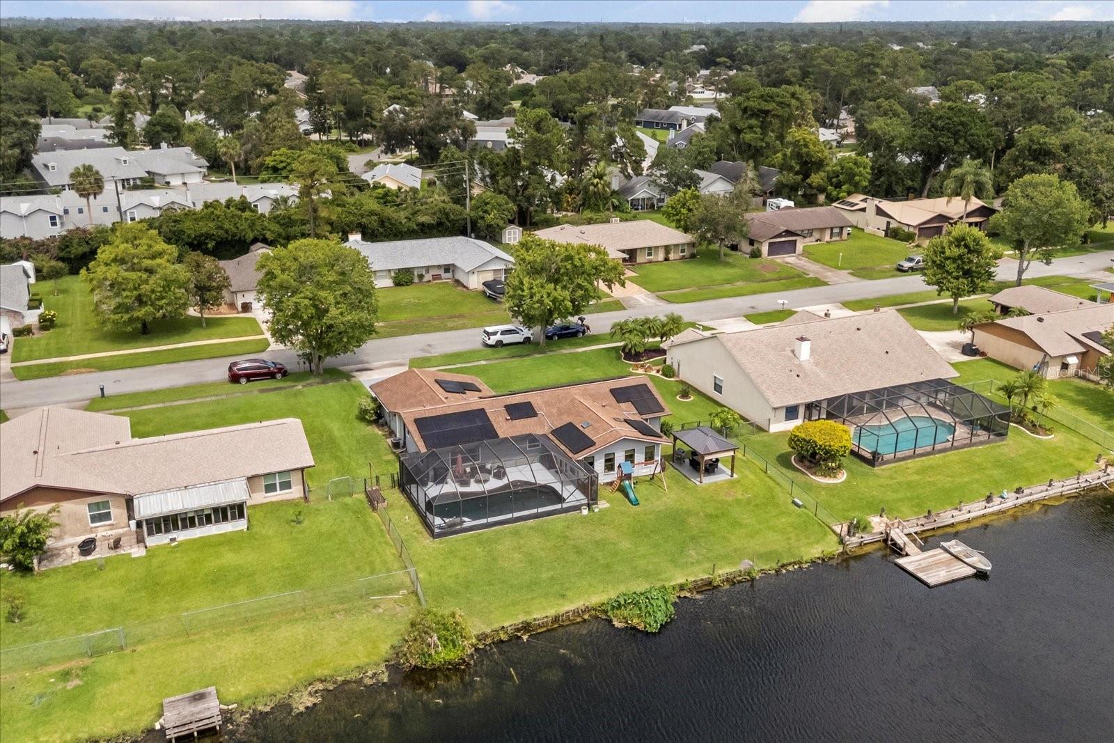 Presenting a beautifully maintained 3-bedroom residence with a spacious master suite, complete with a large walk-in closet, located in one of Port Orange’s most desirable school zones. This thoughtfully designed home offers a split bedroom floor plan and multiple living spaces, including a formal living room, a family room with serene lake views, and a large dining area. The expansive kitchen features modern finishes, ample cabinetry, and a convenient breakfast bar—ideal for both everyday living and entertaining. Interior highlights include tile flooring in the kitchen and family room, complemented by LVT in the formal living room and all bedrooms, creating a warm and inviting atmosphere throughout. A standout feature of this home is the dedicated man cave-style bar—a perfect retreat for entertaining guests or enjoying a relaxing evening at home. Step outside to the screened-in pool area, recently resurfaced with a premium finish, and enjoy stunning lake views in a private, resort-style setting.