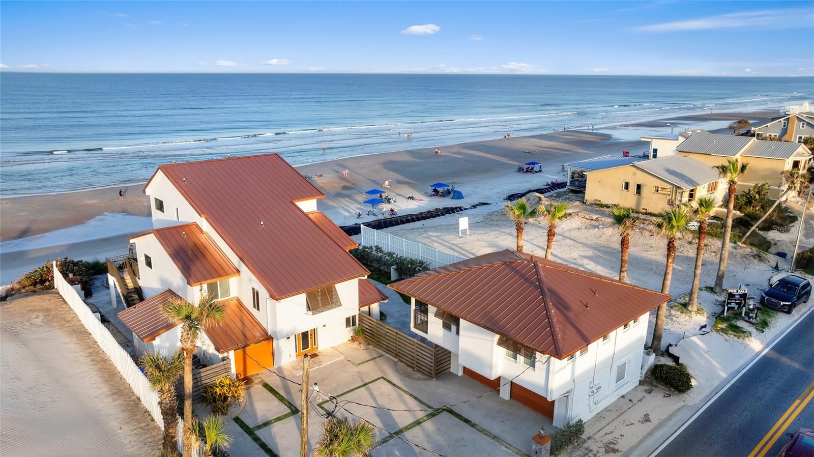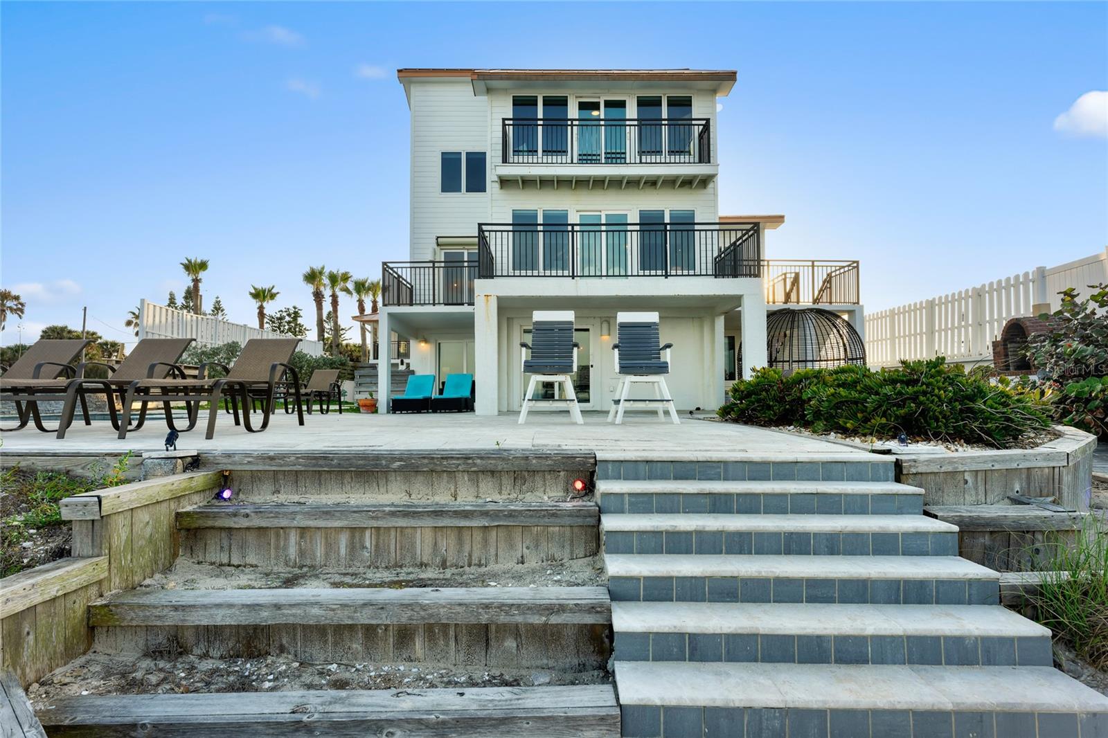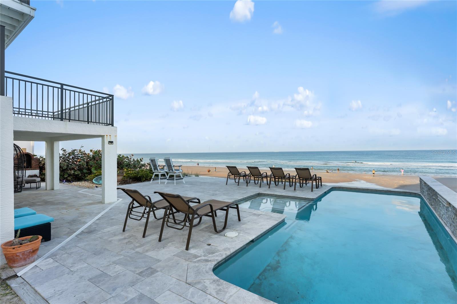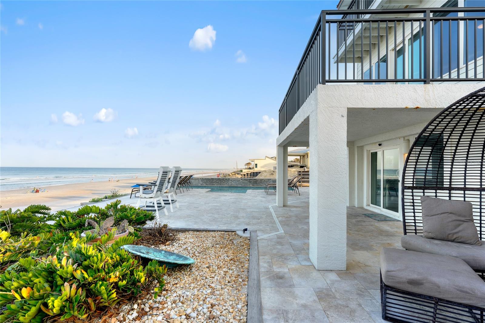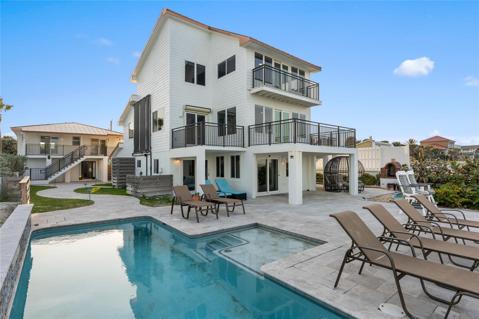 Welcome to your luxurious oceanfront retreat, a sprawling compound designed for both relaxation and entertainment. Nestled on the coastline, this property offers unparalleled views of the ocean and a wealth of amenities to ensure a truly indulgent experience. As you approach, the elegance of the estate is evident from the outset. The concrete driveway with turf inlay sets the stage for the European-inspired architecture that awaits. The main residence, spanning three levels, is a masterpiece of design and functionality. With 5 bedrooms, 5 baths, and a 1 car garage, it effortlessly accommodates both family living and entertaining on a grand scale. Additionally, the detached two-car garage introduces added flexibility with 2 separate guest quarters on the upper floor, each featuring private baths, kitchens, and Murphy beds. Upon entering the home, custom tile with herringbone accents welcomes you into the lower level chef's kitchen. Stone countertops, a center island, and upgraded cabinetry adorned with Viking appliances create a culinary haven that's as stylish as it is practical. The entry level seamlessly flows into the living room and breakfast nook, where large windows and French doors blur the lines between indoor and outdoor living. Step outside to discover a patio, outdoor dining area, and a pool, all framed by panoramic ocean views. Two guest rooms with ocean views and two guest bathrooms (one en-suite) complete the entry level. Ascend to the main level, where soaring 20-foot ceilings and Brazilian oak floors set the stage for a grandeur living experience. Oversized windows and French doors invite natural light to flood the space, showcasing the breathtaking vistas beyond. A second fully equipped water view kitchen, formal living and waterfront dining areas, plus 2 guest bedrooms, 2 guest baths and an office complete this level, offering both functionality and breathtaking vistas. Retreat to the third-floor owner's suite, where a private concrete balcony awaits. Enjoy sweeping ocean views from the comfort of your bed or indulge in the luxurious en-suite bath, complete with a tub and stand-up tile shower. A spacious closet ensures ample storage space, while every detail has been meticulously curated for maximum comfort and convenience. Outside, the indulgence continues with a saltwater solar-heated pool, a private outdoor shower, and a covered patio perfect for al fresco dining. Travertine decking and pathways lead to private beach access, inviting you to explore the pristine shoreline at your leisure. Whether you're seeking a private sanctuary for your family or a lucrative investment opportunity, this oceanfront retreat offers the best of both worlds. With a 30-day minimum for short-term rentals and a proven rental history, it promises both relaxation and potential for financial gain. Don't miss your chance to experience coastal living at its finest - schedule your private tour today.