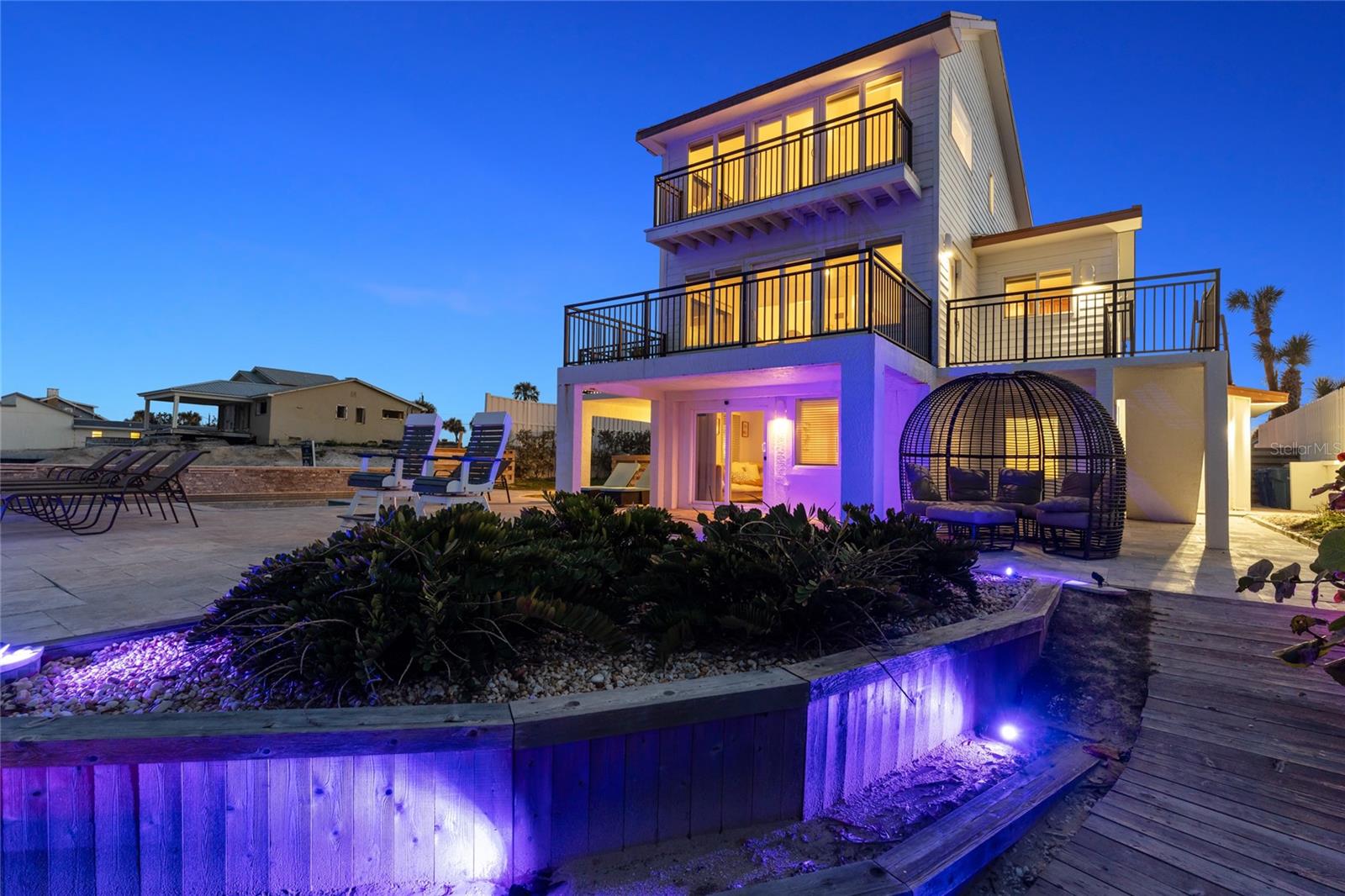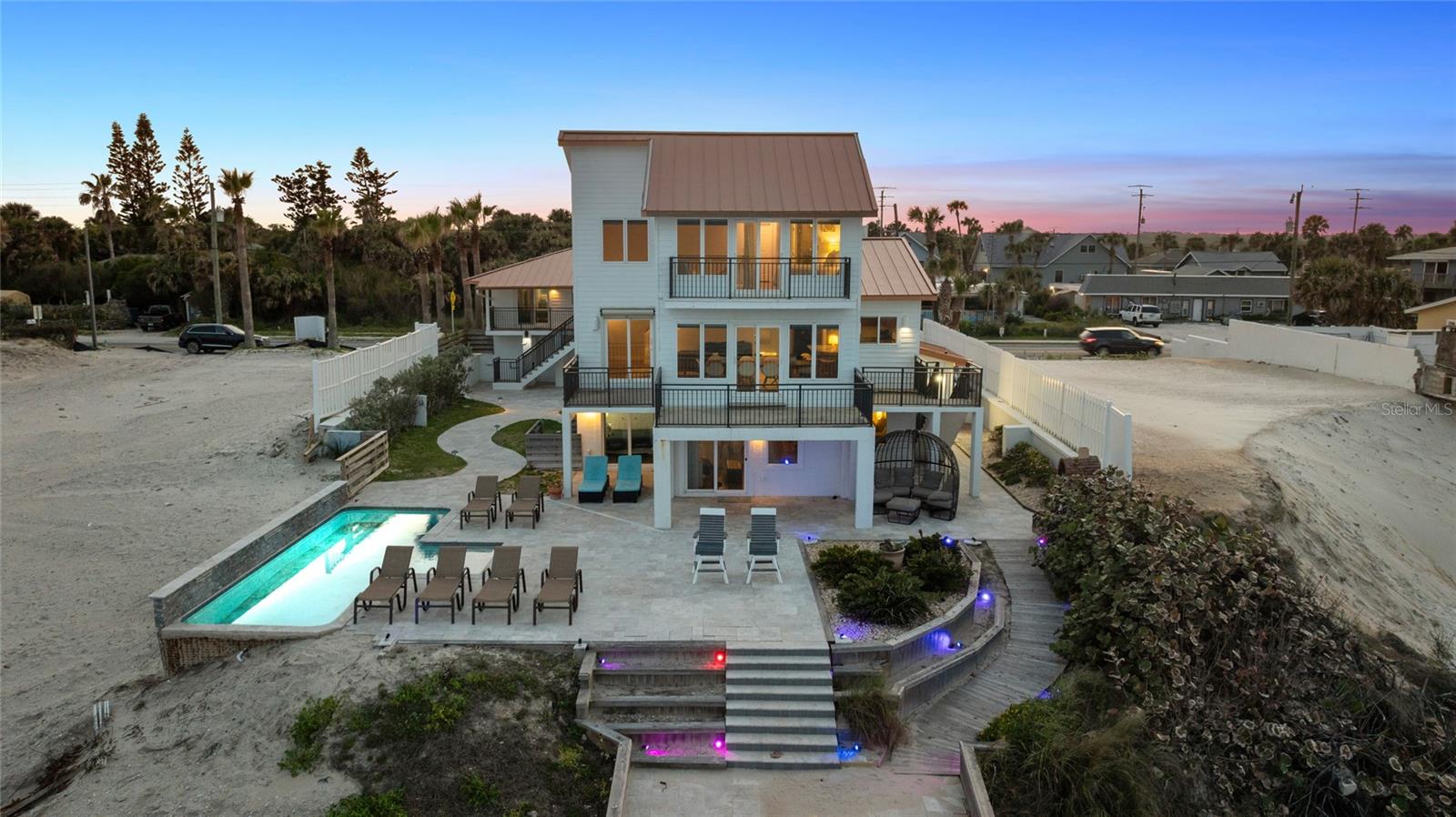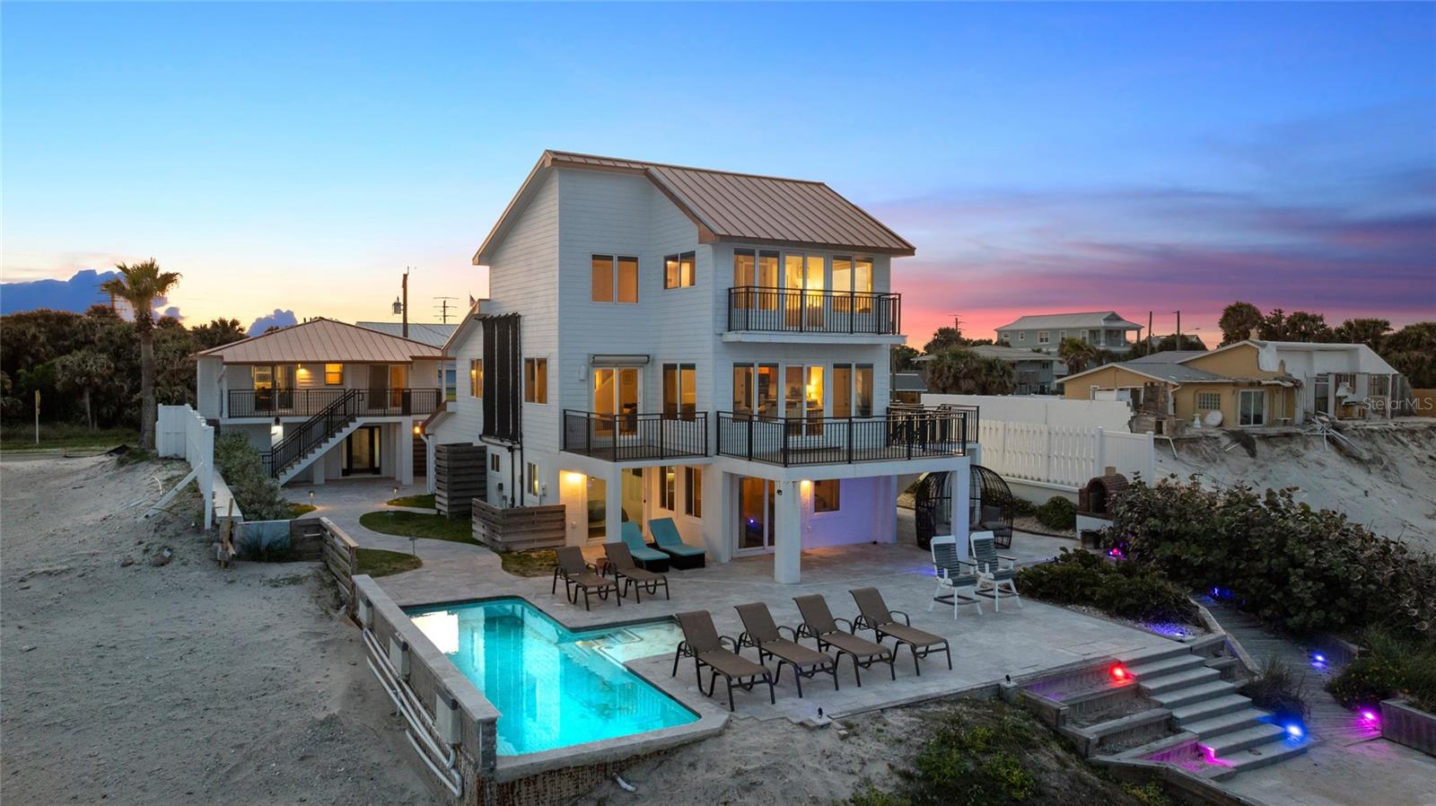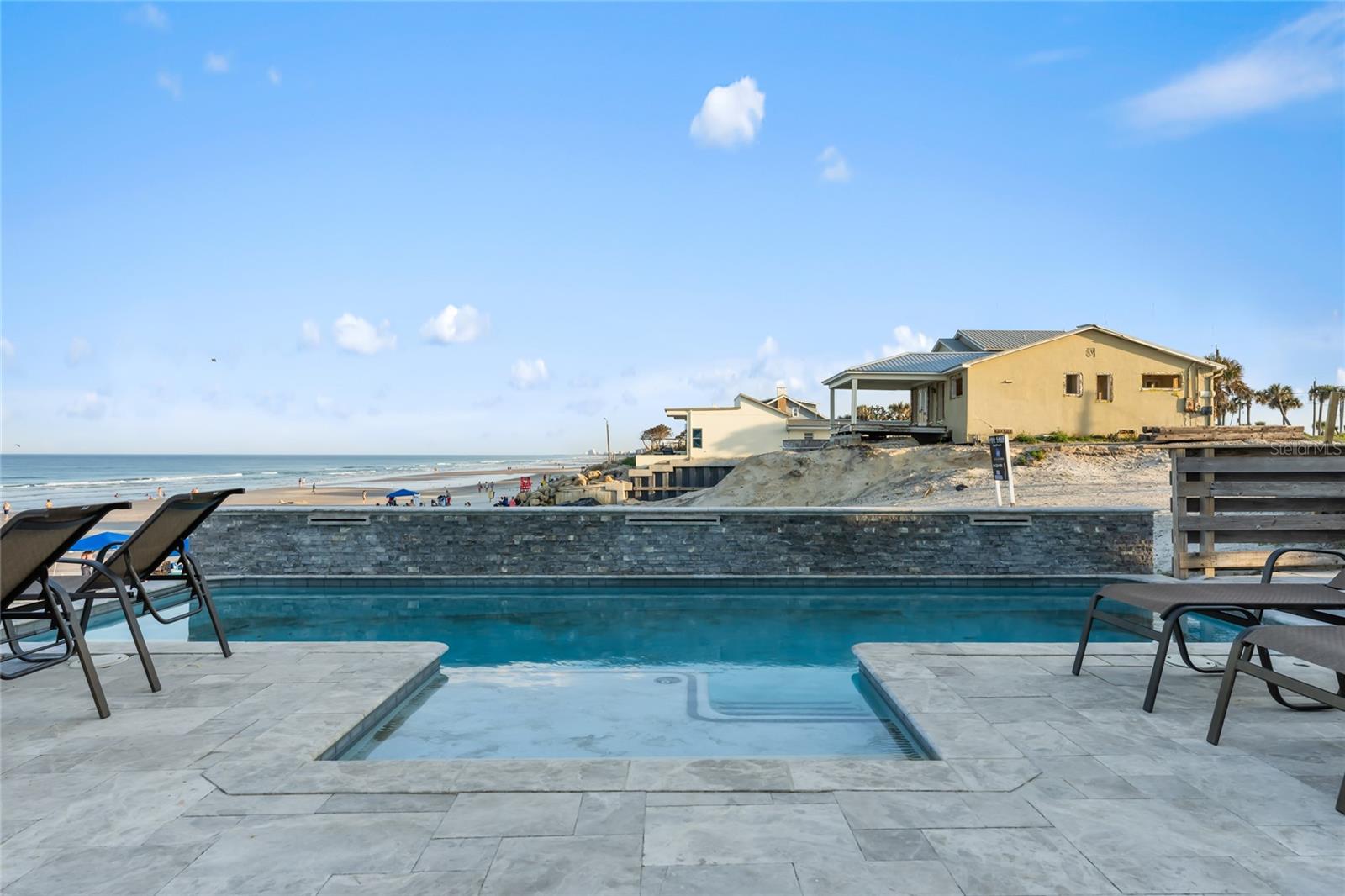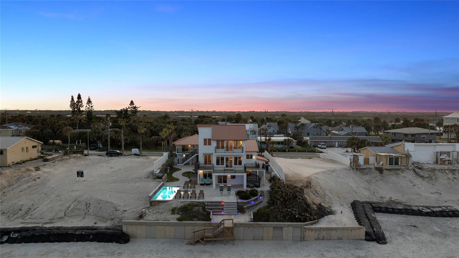 Welcome to your luxurious oceanfront retreat, a sprawling compound designed for both relaxation and entertainment. Nestled on the coastline, this property offers unparalleled views of the ocean and a wealth of amenities to ensure a truly indulgent experience. As you approach, the elegance of the estate is evident from the outset. The concrete driveway with turf inlay sets the stage for the European-inspired architecture that awaits. The main residence, spanning three levels, is a masterpiece of design and functionality. With 5 bedrooms, 5 baths, and a 1 car garage, it effortlessly accommodates both family living and entertaining on a grand scale. Additionally, the detached two-car garage introduces added flexibility with 2 separate guest quarters on the upper floor, each featuring private baths, kitchens, and Murphy beds. Upon entering the home, custom tile with herringbone accents welcomes you into the lower level chef's kitchen. Stone countertops, a center island, and upgraded cabinetry adorned with Viking appliances create a culinary haven that's as stylish as it is practical. The entry level seamlessly flows into the living room and breakfast nook, where large windows and French doors blur the lines between indoor and outdoor living. Step outside to discover a patio, outdoor dining area, and a pool, all framed by panoramic ocean views. Two guest rooms with ocean views and two guest bathrooms (one en-suite) complete the entry level. Ascend to the main level, where soaring 20-foot ceilings and Brazilian oak floors set the stage for a grandeur living experience. Oversized windows and French doors invite natural light to flood the space, showcasing the breathtaking vistas beyond. A second fully equipped water view kitchen, formal living and waterfront dining areas, plus 2 guest bedrooms, 2 guest baths and an office complete this level, offering both functionality and breathtaking vistas. Retreat to the third-floor owner's suite, where a private concrete balcony awaits. Enjoy sweeping ocean views from the comfort of your bed or indulge in the luxurious en-suite bath, complete with a tub and stand-up tile shower. A spacious closet ensures ample storage space, while every detail has been meticulously curated for maximum comfort and convenience. Outside, the indulgence continues with a saltwater solar-heated pool, a private outdoor shower, and a covered patio perfect for al fresco dining. Travertine decking and pathways lead to private beach access, inviting you to explore the pristine shoreline at your leisure. Whether you're seeking a private sanctuary for your family or a lucrative investment opportunity, this oceanfront retreat offers the best of both worlds. With a 30-day minimum for short-term rentals and a proven rental history, it promises both relaxation and potential for financial gain. Don't miss your chance to experience coastal living at its finest - schedule your private tour today.