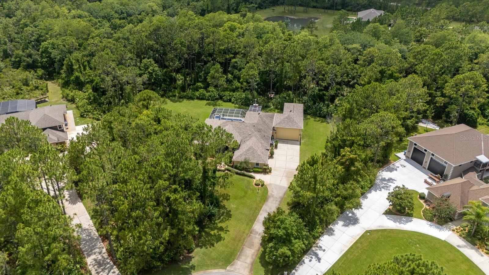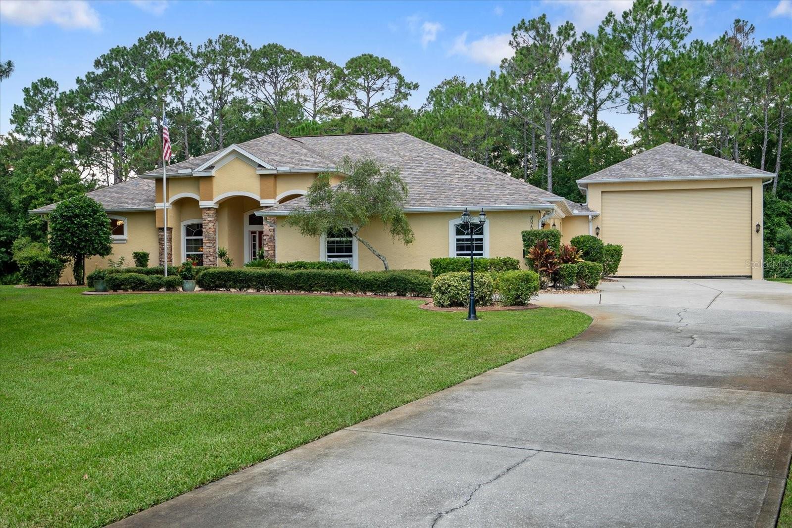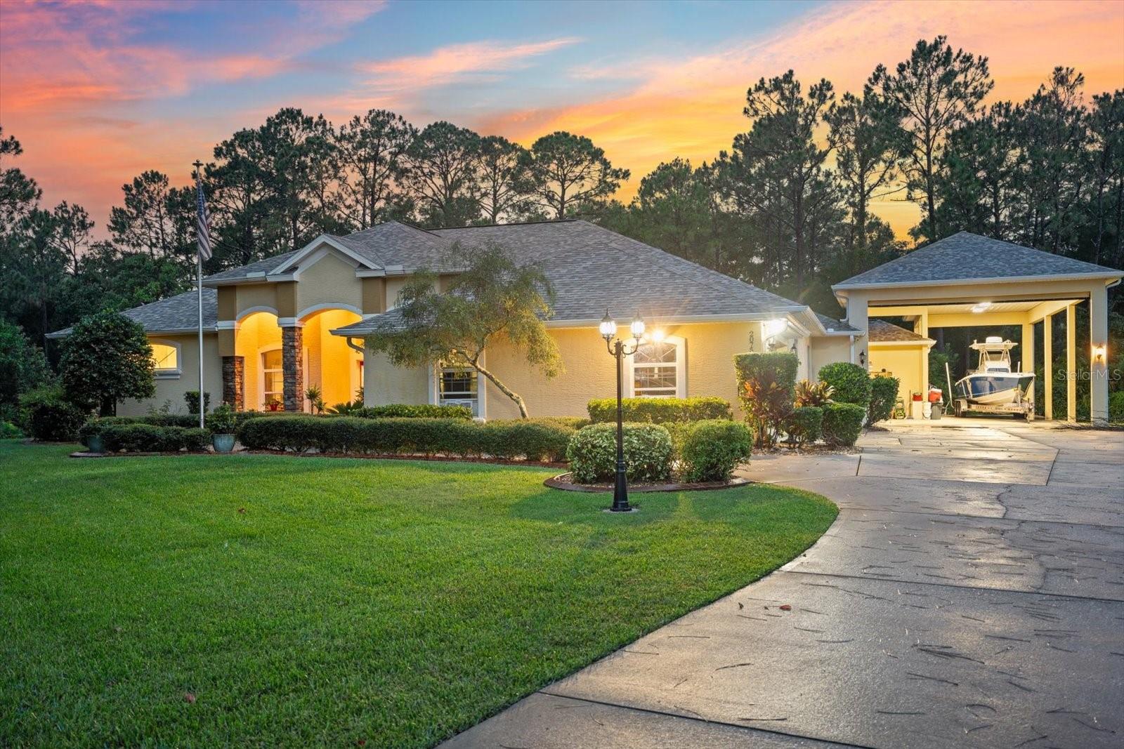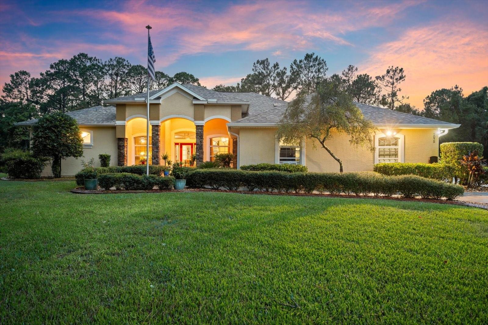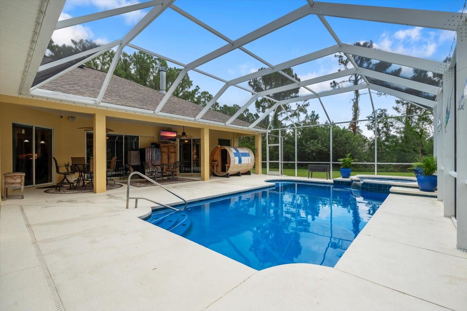 More than a home, are you looking for a lifestyle? Discover Florida luxury in this rare find: a meticulously maintained custom estate located in the exclusive and highly sought-after Whispering Creek Estates. This stunning property boasts 4 large bedrooms, 3 full baths, and an office or potential 5th bedroom, all situated on a high and dry 1.41-acre lot at the end of a cul-de-sac, backing up to conservation land that will never be developed. As you approach, you’ll be impressed by the expansive porte-cochère (52.6' x 24') with a commercial electric garage door, easily accommodating a class 1 RV or boat with extra room for all the toys, allowing for easy drive-through access. Additionally, there is a single garage space attached to the house, ideal for golf cart parking or extra storage. Step inside to find 3,128 square feet of living space, all on one floor, yet feeling much larger due to the well-thought-out design. Most rooms have serene views of the pool area through double slider glass doors and double pane windows with Corian sills. The home features two lighted niches, 10' ceilings, and beautiful wood floors throughout. The living room, with its remote control gas fireplace and 10' tray ceilings, exudes elegance and comfort. The state-of-the-art kitchen is a chef’s dream, equipped with custom maple cabinets, granite countertops, a custom tile backsplash, and top-grade stainless steel appliances, including a new convection and air fry oven. The large, double-door, lighted pantry provides ample storage space. Retreat to the expansive master suite, which opens directly to the pool area. The remodeled (May 2024) spa-style master bathroom features his and her vanities, a Jacuzzi jetted tub, zero entry walk-in shower with custom river rock tile to the ceiling, back-lit LED anti-fog mirrors, wood cabinets, granite countertops, a gorgeous chandelier, a separate water closet, and a walk-in closet. The fourth bedroom, perfect for guests or a mother-in-law suite, offers its own full bathroom and access to the pool area. It is connected to the second living room or "game room," which features a tray ceiling with a stunning sky mural and glass French double doors. Two additional large bedrooms share a bathroom on the opposite side of the house, and the fifth bedroom, ideal as an office or workout room, is located next to the master suite. All bedrooms feature walk-in closets. The large screened pool area is an entertainer's paradise, boasting a huge heated pool, a raised hot tub with a waterfall, and recent resurfacing. The outdoor kitchen includes a 10-seater stone bar, a Delta stainless steel BBQ, granite countertops, special night lighting, and surround sound speakers throughout the entire pool area and inside the house. Adjacent to the outdoor kitchen is a massive stone-faced, floor-to-ceiling wood-burning custom fireplace with another built-in stainless steel BBQ. Additional amenities include a 6-person sauna and a custom-built fire pit on the back lanai. This very private, fully irrigated lot in Whispering Creek Subdivision offers country living with the convenience of being just minutes from the beach, restaurants, shopping, and only 1 hour from Orlando. With too many amenities to list, this home is a must-see for those seeking luxury and tranquility in a prime location. Don’t miss this incredible opportunity to own a piece of paradise in Whispering Creek!