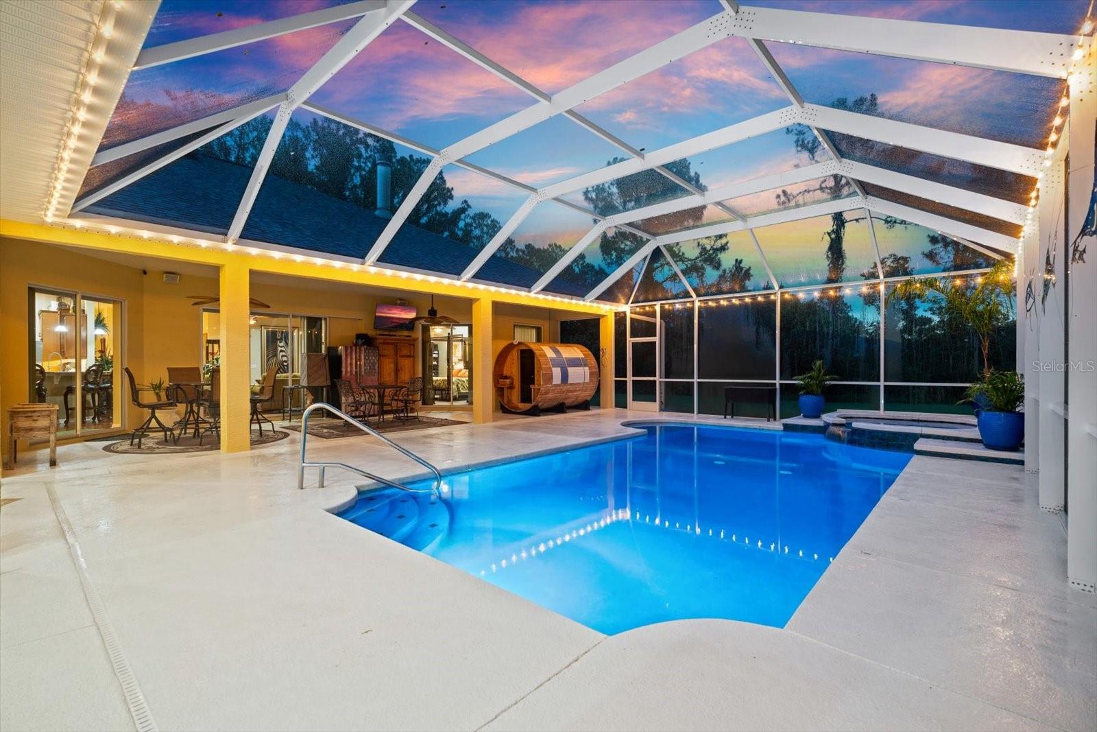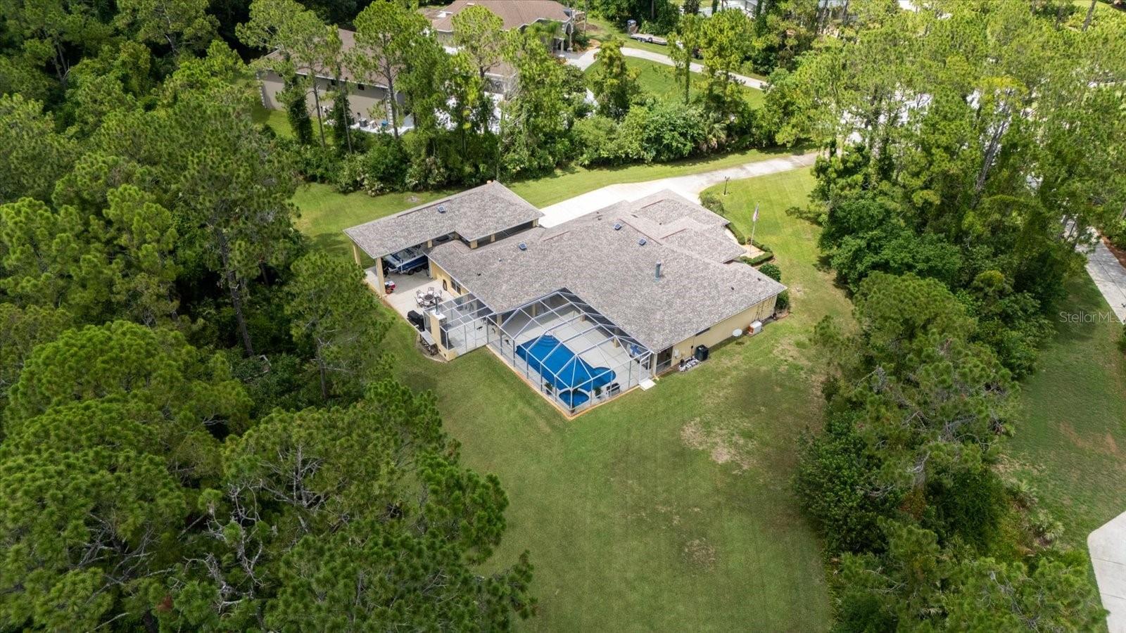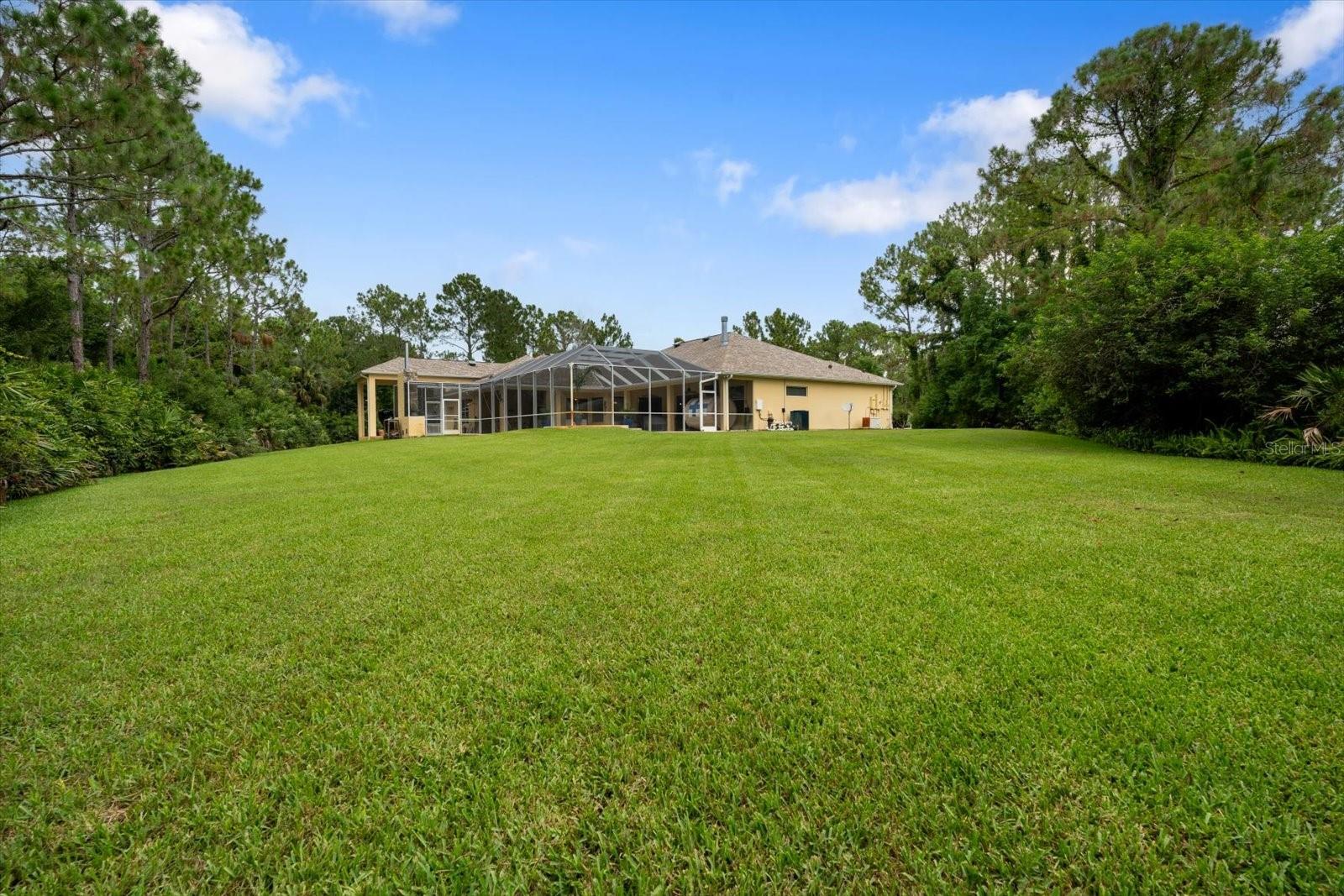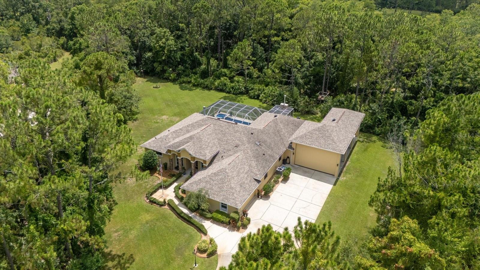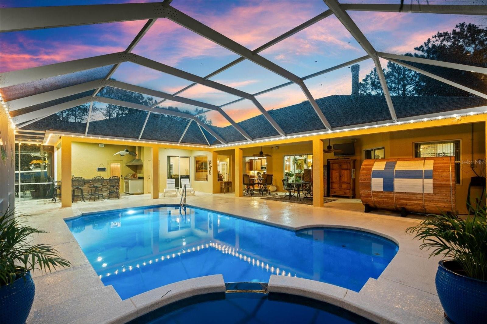 More than a home, are you looking for a lifestyle? Discover Florida luxury in this rare find: a meticulously maintained custom estate located in the exclusive and highly sought-after Whispering Creek Estates. This stunning property boasts 4 large bedrooms, 3 full baths, and an office or potential 5th bedroom, all situated on a high and dry 1.41-acre lot at the end of a cul-de-sac, backing up to conservation land that will never be developed. As you approach, you’ll be impressed by the expansive porte-cochère (52.6' x 24') with a commercial electric garage door, easily accommodating a class 1 RV or boat with extra room for all the toys, allowing for easy drive-through access. Additionally, there is a single garage space attached to the house, ideal for golf cart parking or extra storage. Step inside to find 3,128 square feet of living space, all on one floor, yet feeling much larger due to the well-thought-out design. Most rooms have serene views of the pool area through double slider glass doors and double pane windows with Corian sills. The home features two lighted niches, 10' ceilings, and beautiful wood floors throughout. The living room, with its remote control gas fireplace and 10' tray ceilings, exudes elegance and comfort. The state-of-the-art kitchen is a chef’s dream, equipped with custom maple cabinets, granite countertops, a custom tile backsplash, and top-grade stainless steel appliances, including a new convection and air fry oven. The large, double-door, lighted pantry provides ample storage space. Retreat to the expansive master suite, which opens directly to the pool area. The remodeled (May 2024) spa-style master bathroom features his and her vanities, a Jacuzzi jetted tub, zero entry walk-in shower with custom river rock tile to the ceiling, back-lit LED anti-fog mirrors, wood cabinets, granite countertops, a gorgeous chandelier, a separate water closet, and a walk-in closet. The fourth bedroom, perfect for guests or a mother-in-law suite, offers its own full bathroom and access to the pool area. It is connected to the second living room or "game room," which features a tray ceiling with a stunning sky mural and glass French double doors. Two additional large bedrooms share a bathroom on the opposite side of the house, and the fifth bedroom, ideal as an office or workout room, is located next to the master suite. All bedrooms feature walk-in closets. The large screened pool area is an entertainer's paradise, boasting a huge heated pool, a raised hot tub with a waterfall, and recent resurfacing. The outdoor kitchen includes a 10-seater stone bar, a Delta stainless steel BBQ, granite countertops, special night lighting, and surround sound speakers throughout the entire pool area and inside the house. Adjacent to the outdoor kitchen is a massive stone-faced, floor-to-ceiling wood-burning custom fireplace with another built-in stainless steel BBQ. Additional amenities include a 6-person sauna and a custom-built fire pit on the back lanai. This very private, fully irrigated lot in Whispering Creek Subdivision offers country living with the convenience of being just minutes from the beach, restaurants, shopping, and only 1 hour from Orlando. With too many amenities to list, this home is a must-see for those seeking luxury and tranquility in a prime location. Don’t miss this incredible opportunity to own a piece of paradise in Whispering Creek!