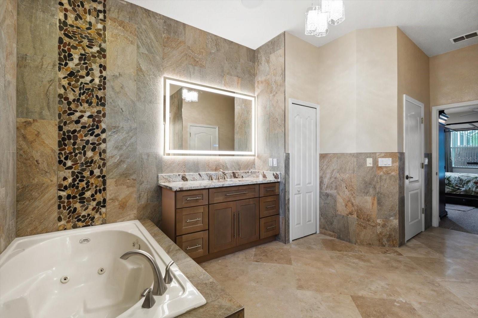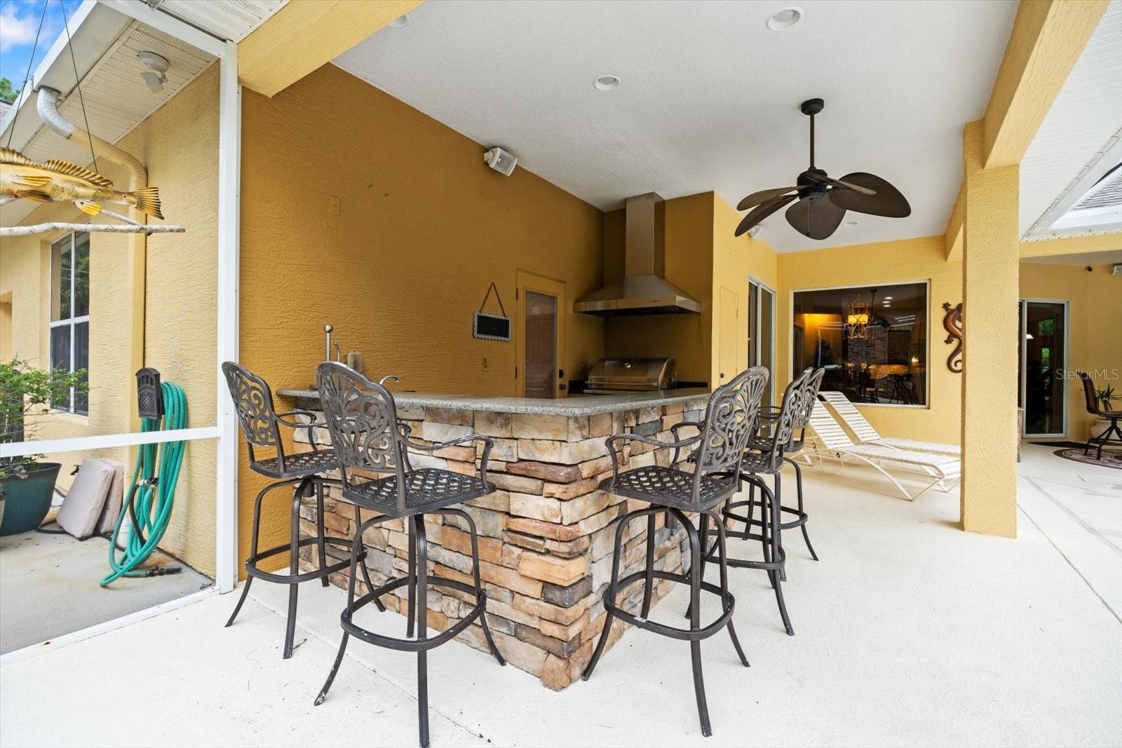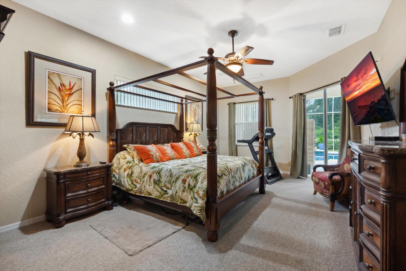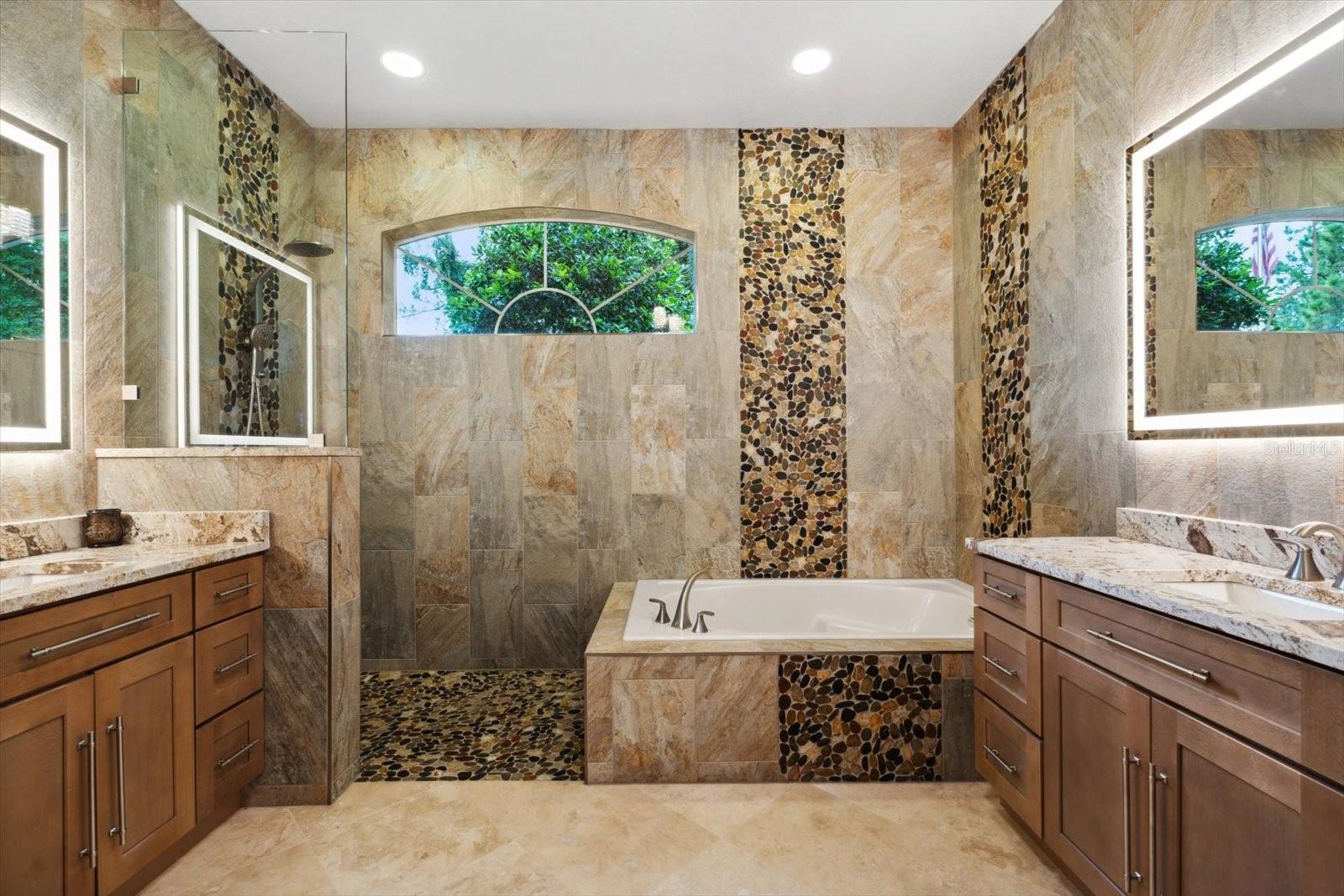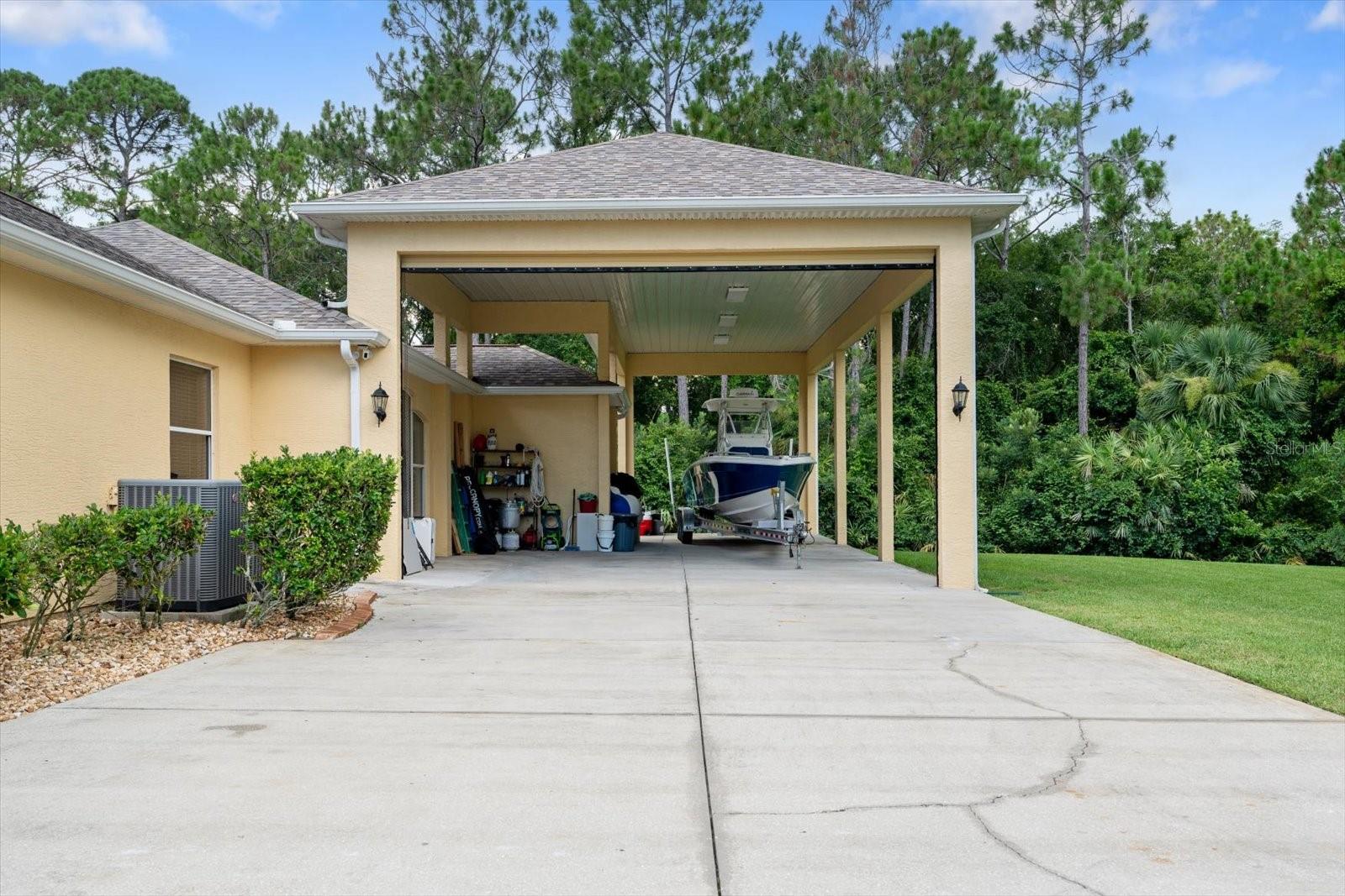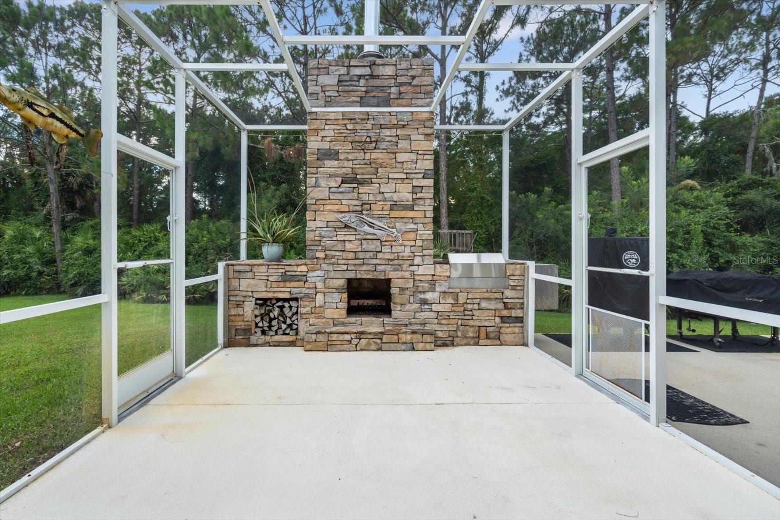 More than a home, are you looking for a lifestyle? Discover Florida luxury in this rare find: a meticulously maintained custom estate located in the exclusive and highly sought-after Whispering Creek Estates. This stunning property boasts 4 large bedrooms, 3 full baths, and an office or potential 5th bedroom, all situated on a high and dry 1.41-acre lot at the end of a cul-de-sac, backing up to conservation land that will never be developed. As you approach, you’ll be impressed by the expansive porte-cochère (52.6' x 24') with a commercial electric garage door, easily accommodating a class 1 RV or boat with extra room for all the toys, allowing for easy drive-through access. Additionally, there is a single garage space attached to the house, ideal for golf cart parking or extra storage. Step inside to find 3,128 square feet of living space, all on one floor, yet feeling much larger due to the well-thought-out design. Most rooms have serene views of the pool area through double slider glass doors and double pane windows with Corian sills. The home features two lighted niches, 10' ceilings, and beautiful wood floors throughout. The living room, with its remote control gas fireplace and 10' tray ceilings, exudes elegance and comfort. The state-of-the-art kitchen is a chef’s dream, equipped with custom maple cabinets, granite countertops, a custom tile backsplash, and top-grade stainless steel appliances, including a new convection and air fry oven. The large, double-door, lighted pantry provides ample storage space. Retreat to the expansive master suite, which opens directly to the pool area. The remodeled (May 2024) spa-style master bathroom features his and her vanities, a Jacuzzi jetted tub, zero entry walk-in shower with custom river rock tile to the ceiling, back-lit LED anti-fog mirrors, wood cabinets, granite countertops, a gorgeous chandelier, a separate water closet, and a walk-in closet. The fourth bedroom, perfect for guests or a mother-in-law suite, offers its own full bathroom and access to the pool area. It is connected to the second living room or "game room," which features a tray ceiling with a stunning sky mural and glass French double doors. Two additional large bedrooms share a bathroom on the opposite side of the house, and the fifth bedroom, ideal as an office or workout room, is located next to the master suite. All bedrooms feature walk-in closets. The large screened pool area is an entertainer's paradise, boasting a huge heated pool, a raised hot tub with a waterfall, and recent resurfacing. The outdoor kitchen includes a 10-seater stone bar, a Delta stainless steel BBQ, granite countertops, special night lighting, and surround sound speakers throughout the entire pool area and inside the house. Adjacent to the outdoor kitchen is a massive stone-faced, floor-to-ceiling wood-burning custom fireplace with another built-in stainless steel BBQ. Additional amenities include a 6-person sauna and a custom-built fire pit on the back lanai. This very private, fully irrigated lot in Whispering Creek Subdivision offers country living with the convenience of being just minutes from the beach, restaurants, shopping, and only 1 hour from Orlando. With too many amenities to list, this home is a must-see for those seeking luxury and tranquility in a prime location. Don’t miss this incredible opportunity to own a piece of paradise in Whispering Creek!