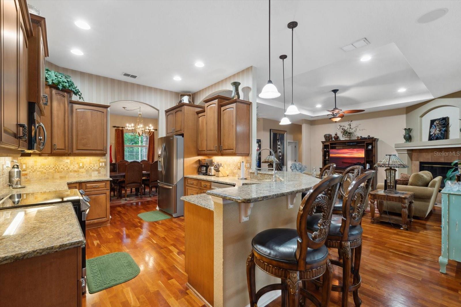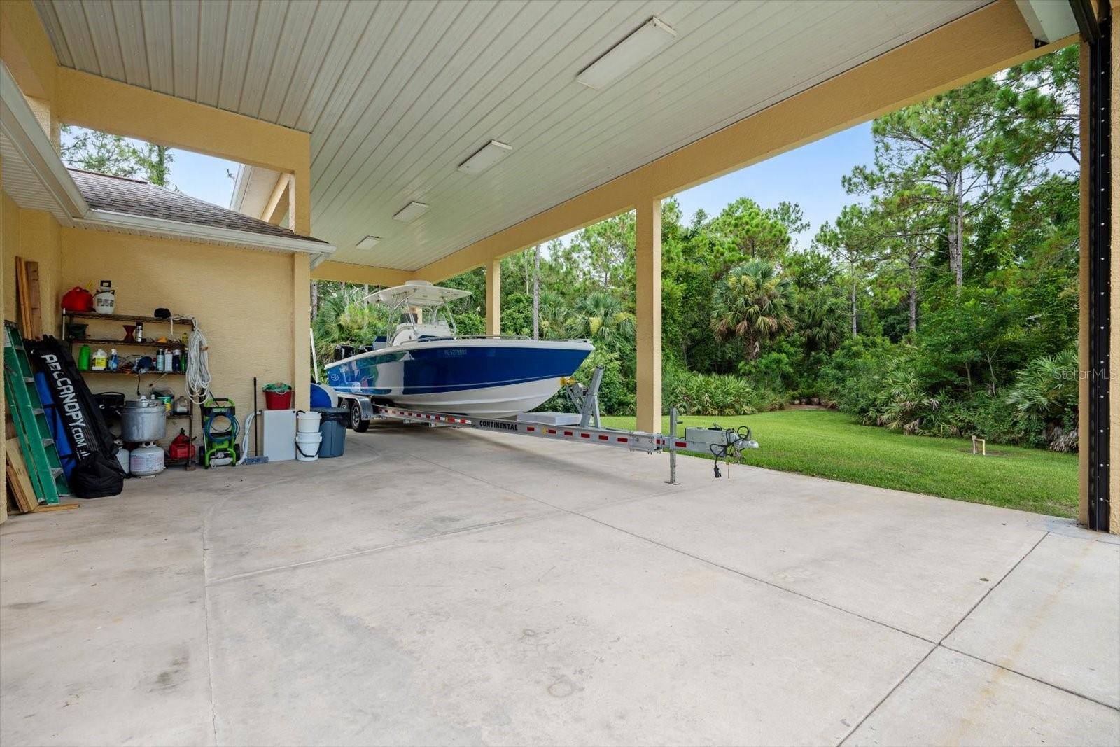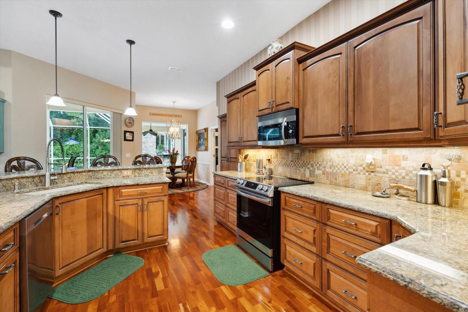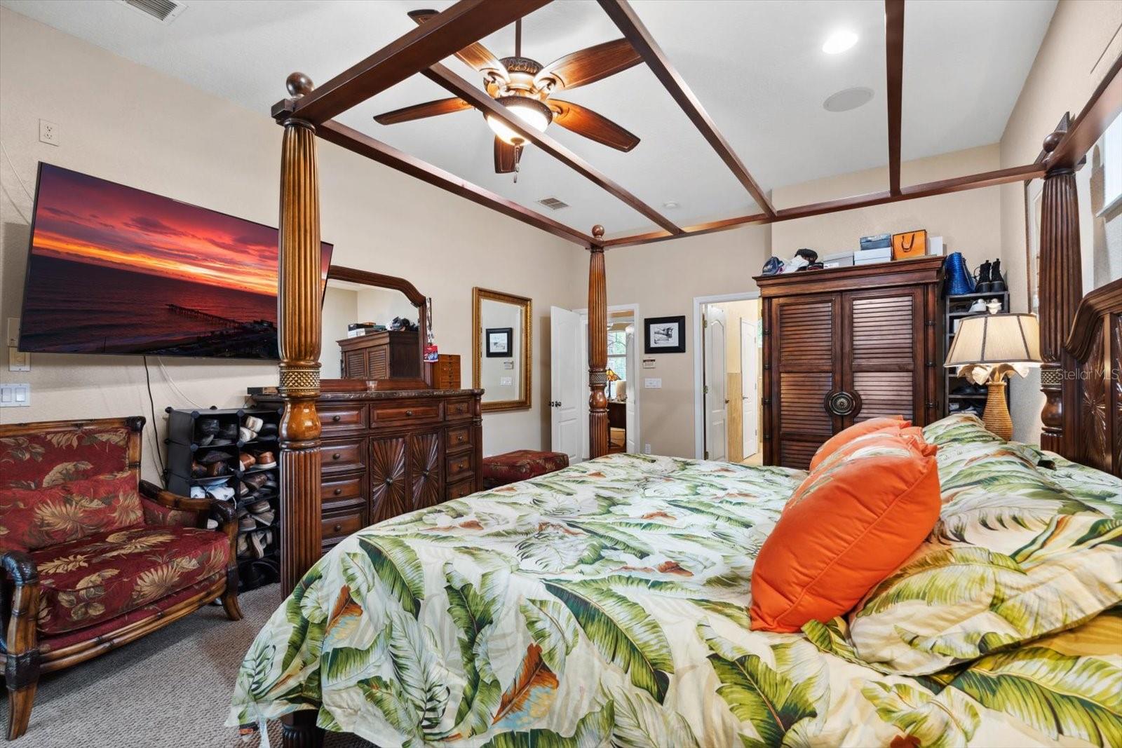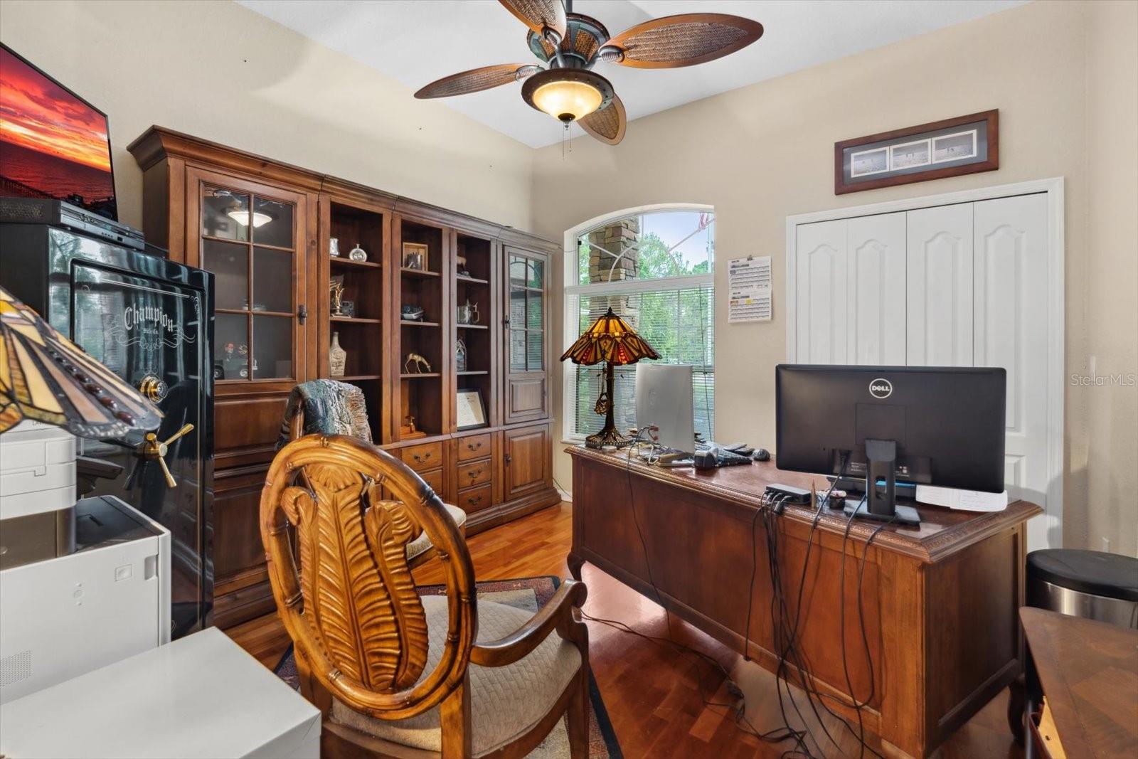 More than a home, are you looking for a lifestyle? Discover Florida luxury in this rare find: a meticulously maintained custom estate located in the exclusive and highly sought-after Whispering Creek Estates. This stunning property boasts 4 large bedrooms, 3 full baths, and an office or potential 5th bedroom, all situated on a high and dry 1.41-acre lot at the end of a cul-de-sac, backing up to conservation land that will never be developed. As you approach, you’ll be impressed by the expansive porte-cochère (52.6' x 24') with a commercial electric garage door, easily accommodating a class 1 RV or boat with extra room for all the toys, allowing for easy drive-through access. Additionally, there is a single garage space attached to the house, ideal for golf cart parking or extra storage. Step inside to find 3,128 square feet of living space, all on one floor, yet feeling much larger due to the well-thought-out design. Most rooms have serene views of the pool area through double slider glass doors and double pane windows with Corian sills. The home features two lighted niches, 10' ceilings, and beautiful wood floors throughout. The living room, with its remote control gas fireplace and 10' tray ceilings, exudes elegance and comfort. The state-of-the-art kitchen is a chef’s dream, equipped with custom maple cabinets, granite countertops, a custom tile backsplash, and top-grade stainless steel appliances, including a new convection and air fry oven. The large, double-door, lighted pantry provides ample storage space. Retreat to the expansive master suite, which opens directly to the pool area. The remodeled (May 2024) spa-style master bathroom features his and her vanities, a Jacuzzi jetted tub, zero entry walk-in shower with custom river rock tile to the ceiling, back-lit LED anti-fog mirrors, wood cabinets, granite countertops, a gorgeous chandelier, a separate water closet, and a walk-in closet. The fourth bedroom, perfect for guests or a mother-in-law suite, offers its own full bathroom and access to the pool area. It is connected to the second living room or "game room," which features a tray ceiling with a stunning sky mural and glass French double doors. Two additional large bedrooms share a bathroom on the opposite side of the house, and the fifth bedroom, ideal as an office or workout room, is located next to the master suite. All bedrooms feature walk-in closets. The large screened pool area is an entertainer's paradise, boasting a huge heated pool, a raised hot tub with a waterfall, and recent resurfacing. The outdoor kitchen includes a 10-seater stone bar, a Delta stainless steel BBQ, granite countertops, special night lighting, and surround sound speakers throughout the entire pool area and inside the house. Adjacent to the outdoor kitchen is a massive stone-faced, floor-to-ceiling wood-burning custom fireplace with another built-in stainless steel BBQ. Additional amenities include a 6-person sauna and a custom-built fire pit on the back lanai. This very private, fully irrigated lot in Whispering Creek Subdivision offers country living with the convenience of being just minutes from the beach, restaurants, shopping, and only 1 hour from Orlando. With too many amenities to list, this home is a must-see for those seeking luxury and tranquility in a prime location. Don’t miss this incredible opportunity to own a piece of paradise in Whispering Creek!