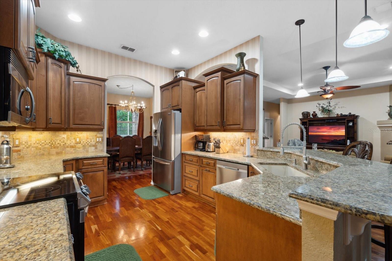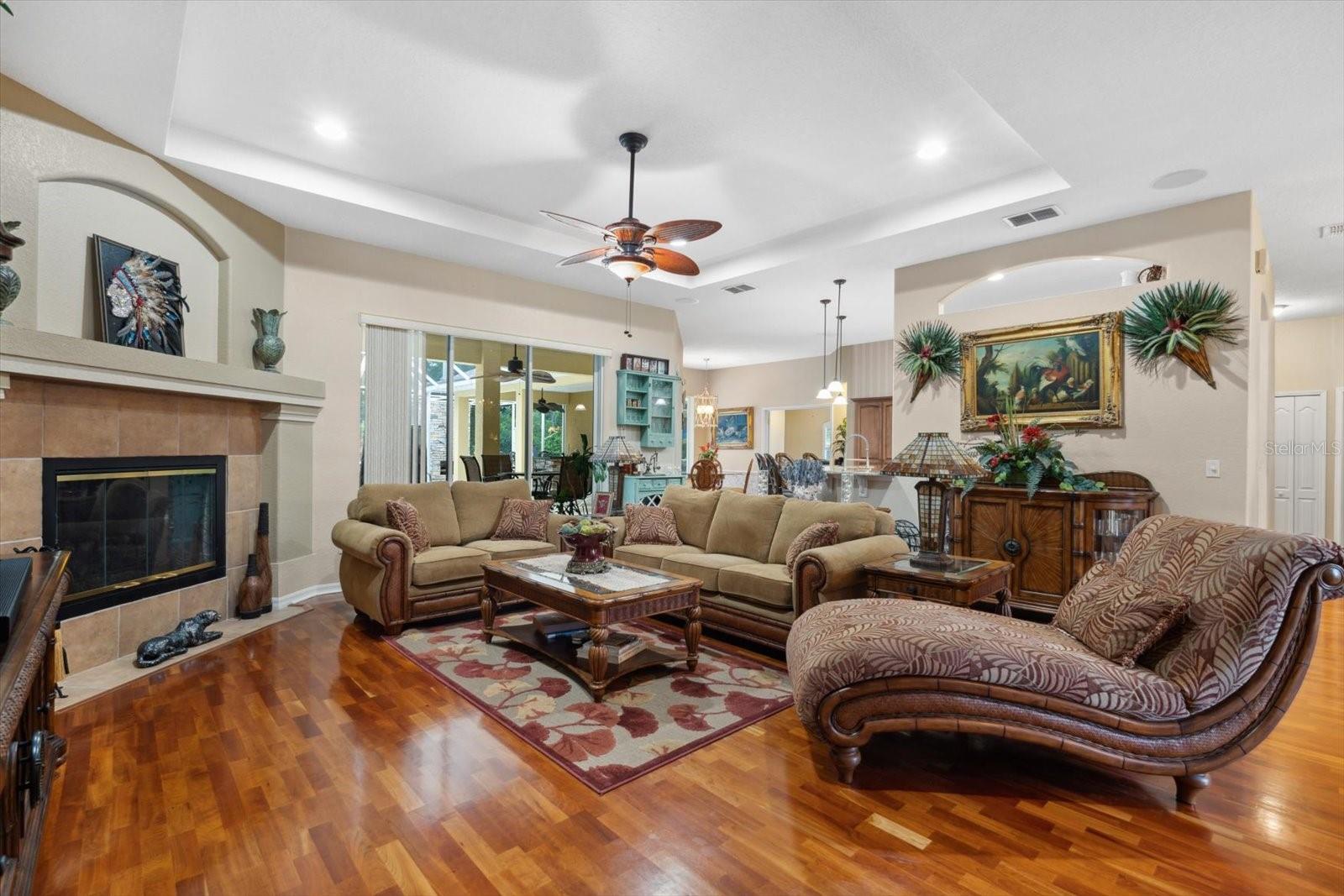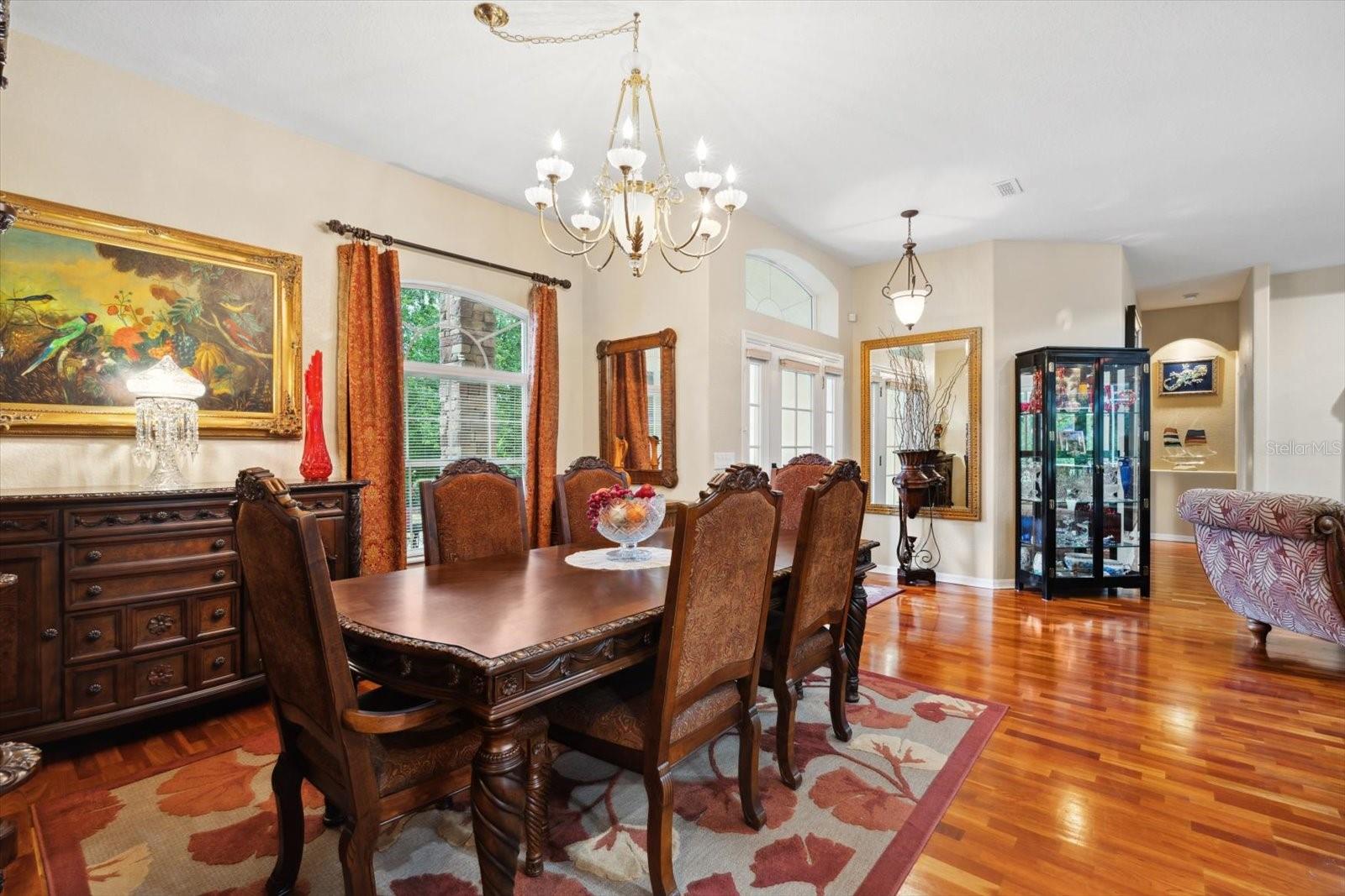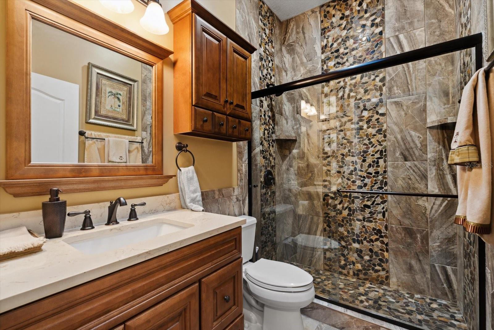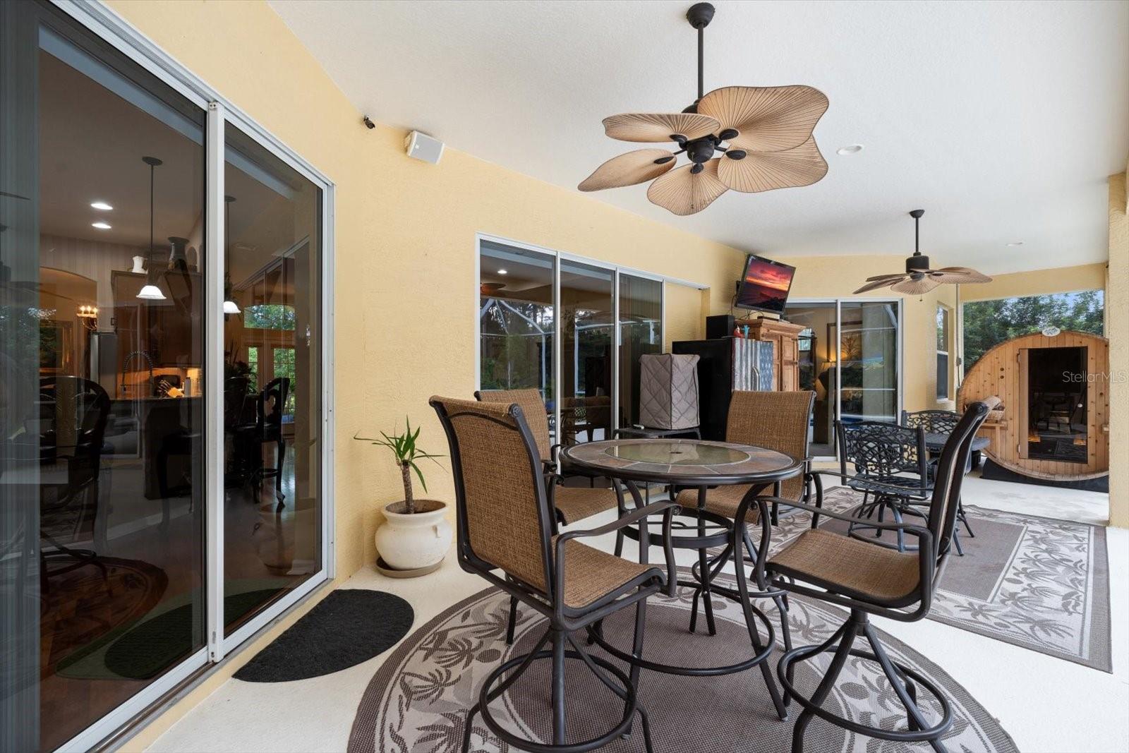More than a home, are you looking for a lifestyle? Discover Florida luxury in this rare find: a meticulously maintained custom estate located in the exclusive and highly sought-after Whispering Creek Estates. This stunning property boasts 4 large bedrooms, 3 full baths, and an office or potential 5th bedroom, all situated on a high and dry 1.41-acre lot at the end of a cul-de-sac, backing up to conservation land that will never be developed. As you approach, you’ll be impressed by the expansive porte-cochère (52.6' x 24') with a commercial electric garage door, easily accommodating a class 1 RV or boat with extra room for all the toys, allowing for easy drive-through access. Additionally, there is a single garage space attached to the house, ideal for golf cart parking or extra storage. Step inside to find 3,128 square feet of living space, all on one floor, yet feeling much larger due to the well-thought-out design. Most rooms have serene views of the pool area through double slider glass doors and double pane windows with Corian sills. The home features two lighted niches, 10' ceilings, and beautiful wood floors throughout. The living room, with its remote control gas fireplace and 10' tray ceilings, exudes elegance and comfort. The state-of-the-art kitchen is a chef’s dream, equipped with custom maple cabinets, granite countertops, a custom tile backsplash, and top-grade stainless steel appliances, including a new convection and air fry oven. The large, double-door, lighted pantry provides ample storage space. Retreat to the expansive master suite, which opens directly to the pool area. The remodeled (May 2024) spa-style master bathroom features his and her vanities, a Jacuzzi jetted tub, zero entry walk-in shower with custom river rock tile to the ceiling, back-lit LED anti-fog mirrors, wood cabinets, granite countertops, a gorgeous chandelier, a separate water closet, and a walk-in closet. The fourth bedroom, perfect for guests or a mother-in-law suite, offers its own full bathroom and access to the pool area. It is connected to the second living room or "game room," which features a tray ceiling with a stunning sky mural and glass French double doors. Two additional large bedrooms share a bathroom on the opposite side of the house, and the fifth bedroom, ideal as an office or workout room, is located next to the master suite. All bedrooms feature walk-in closets. The large screened pool area is an entertainer's paradise, boasting a huge heated pool, a raised hot tub with a waterfall, and recent resurfacing. The outdoor kitchen includes a 10-seater stone bar, a Delta stainless steel BBQ, granite countertops, special night lighting, and surround sound speakers throughout the entire pool area and inside the house. Adjacent to the outdoor kitchen is a massive stone-faced, floor-to-ceiling wood-burning custom fireplace with another built-in stainless steel BBQ. Additional amenities include a 6-person sauna and a custom-built fire pit on the back lanai. This very private, fully irrigated lot in Whispering Creek Subdivision offers country living with the convenience of being just minutes from the beach, restaurants, shopping, and only 1 hour from Orlando. With too many amenities to list, this home is a must-see for those seeking luxury and tranquility in a prime location. Don’t miss this incredible opportunity to own a piece of paradise in Whispering Creek!