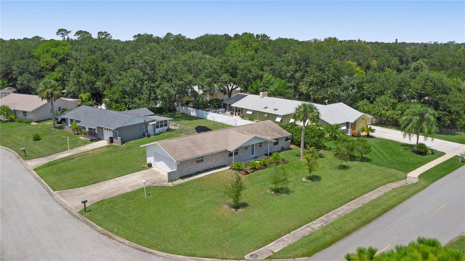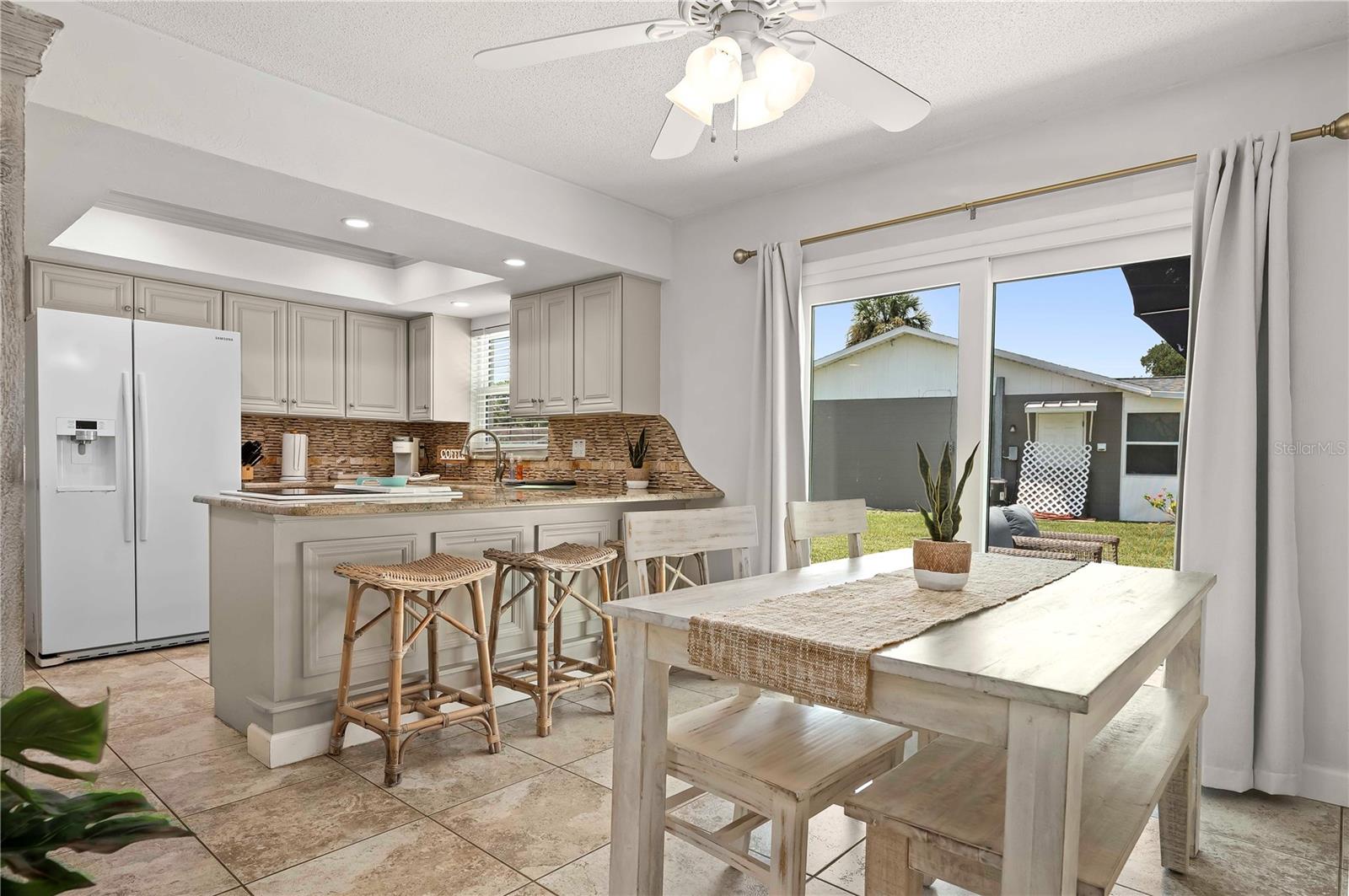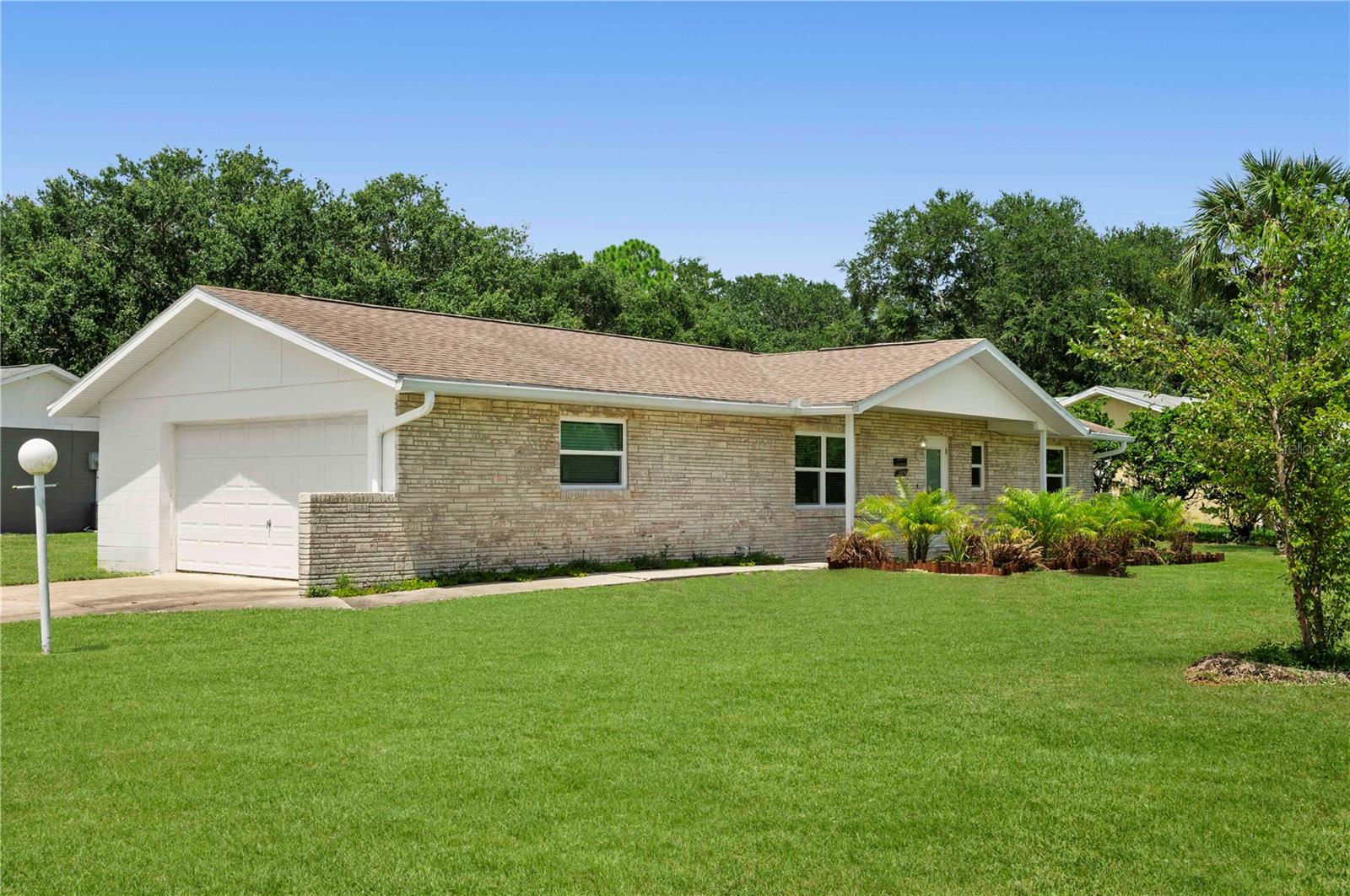 Welcome to this beautifully upgraded 2-bedroom, 2-bathroom TURN KEY home on a desirable corner lot in Port Orange. As you step inside, you're greeted by an abundance of natural light that fills the spacious living room, where front-facing windows showcase the meticulously landscaped front yard. The modern kitchen boasts new cabinets, a granite peninsula, and opens to a dedicated dining space—perfect for entertaining. The primary bedroom offers a serene retreat with an ensuite bathroom featuring a stunning tiled shower and seamless glass door. The generous guest bedroom is conveniently located near the upgraded guest bathroom, complete with a shower/tub combo. Outside, enjoy a large backyard with a patio, perfect for outdoor living. This home also features new floors, hurricane-impact windows and doors, soffits/gables, and fresh paint. With a 2017 roof and new water heater, and just minutes from the river and beach, this home is a must-see!