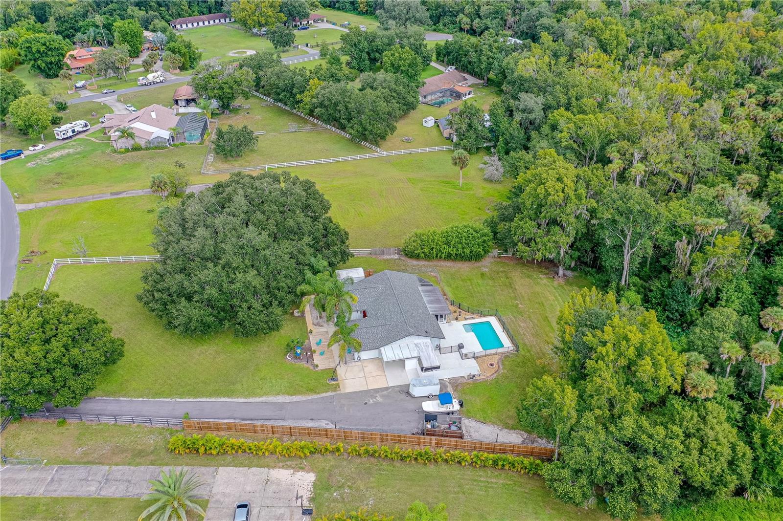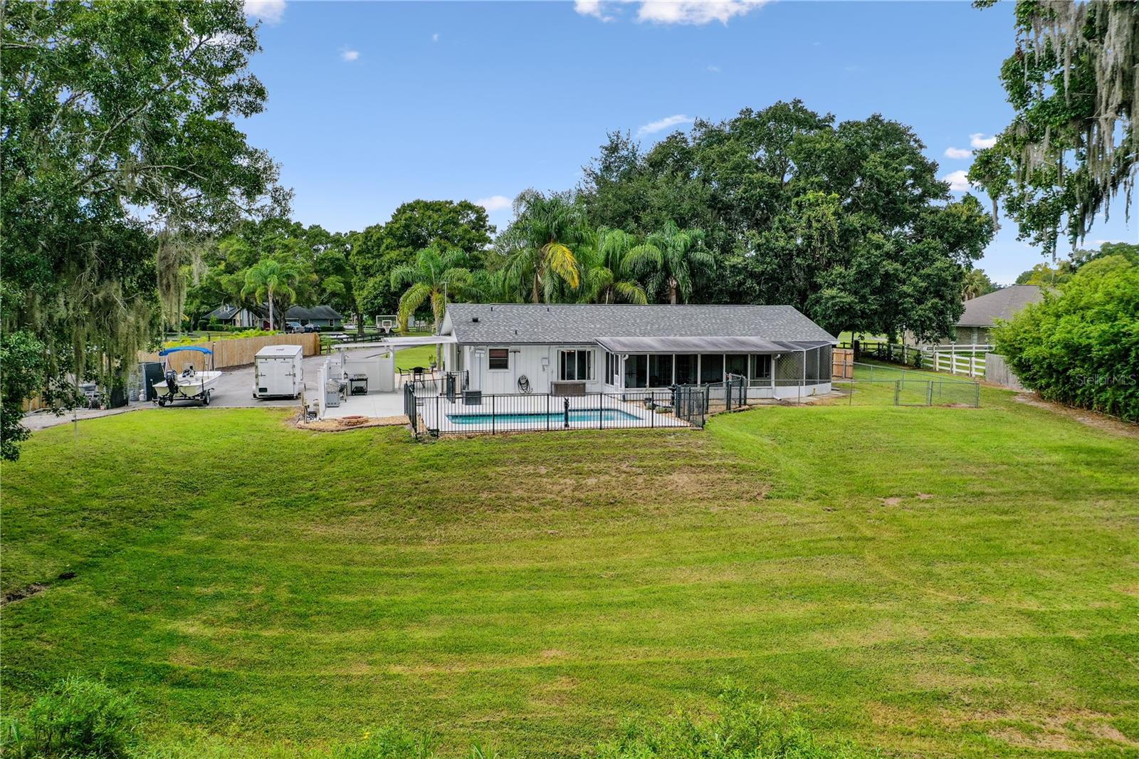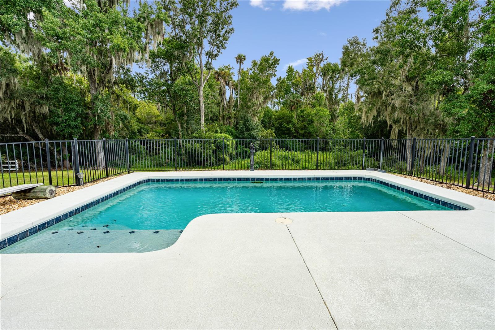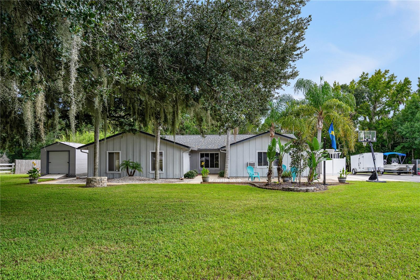 Nature Lover's Paradise - Spacious Ranch Home on 2.52 Acres! Tucked away on 2.52 lush acres, this four-bedroom, 2.5-bath Gem invites you to experience the joys of family life in a setting where the rhythm of nature is the soundtrack of your life. This ranch-style retreat offers a private sanctuary with creek access, perfect for launching kayaks or simply enjoying the peaceful flow of the water. Watch deer wander, from your secluded backyard or the sparkling pool area. The pool can easily convert back to a saltwater oasis. The outdoor amenities enhance the sense of freedom - a carport with a hot water shower, a sink for cleaning your daily catch and the ideal spot for an outdoor kitchen. The two-car oversized garage is cooled by a window AC unit that also has heat, and provides plenty of room for your vehicles and hobbies. Inside, over 2,000 sq ft of thoughtfully designed living space awaits. Modern tile floors flow through the updated kitchen, complete with a breakfast nook, convection oven, newer refrigerator and dishwasher. Living areas offer room for every occasion, and the Family Room can also be used as a Formal Dining Room. If your Family needs more Elbow Room you'll Appreciate the Split Bedroom Plan and the Primary bedroom connects to a second bedroom, with a pocket door for privacy. This home has Storage space Galore. The indoor laundry room with a half bath makes freshening up after outdoor adventures easy. Entertain on the expansive front deck overlooking beautiful Oak trees, or relax on the screened-in porch overlooking the pool deck. A fenced-in dog run adds a delightful feature for your furry friends. With updated electrical, double insulation for energy efficiency, two water heaters, and a four-zone/ 40 sprinkler system fed by a deep well, every detail is designed to provide comfort and convenience!