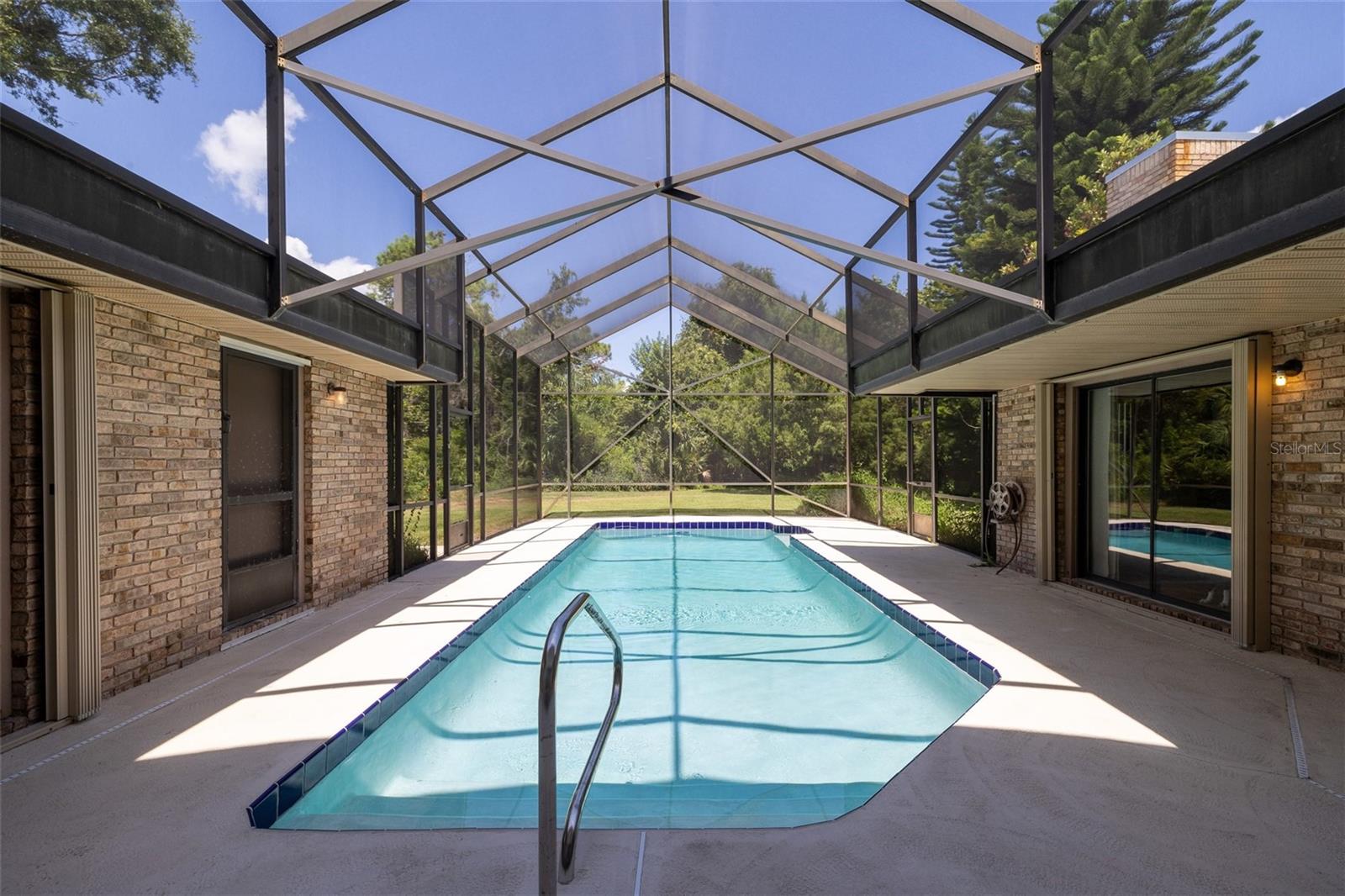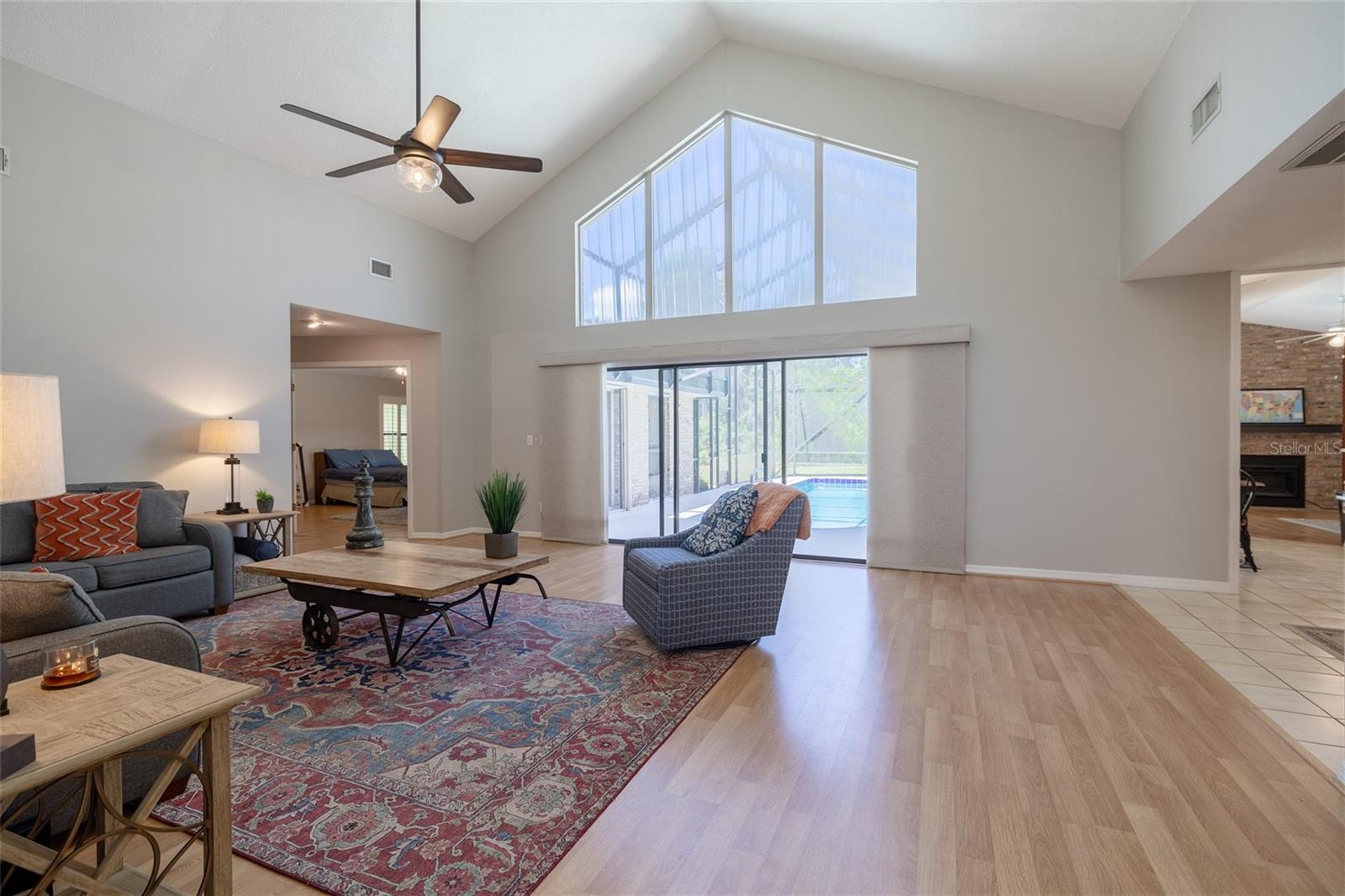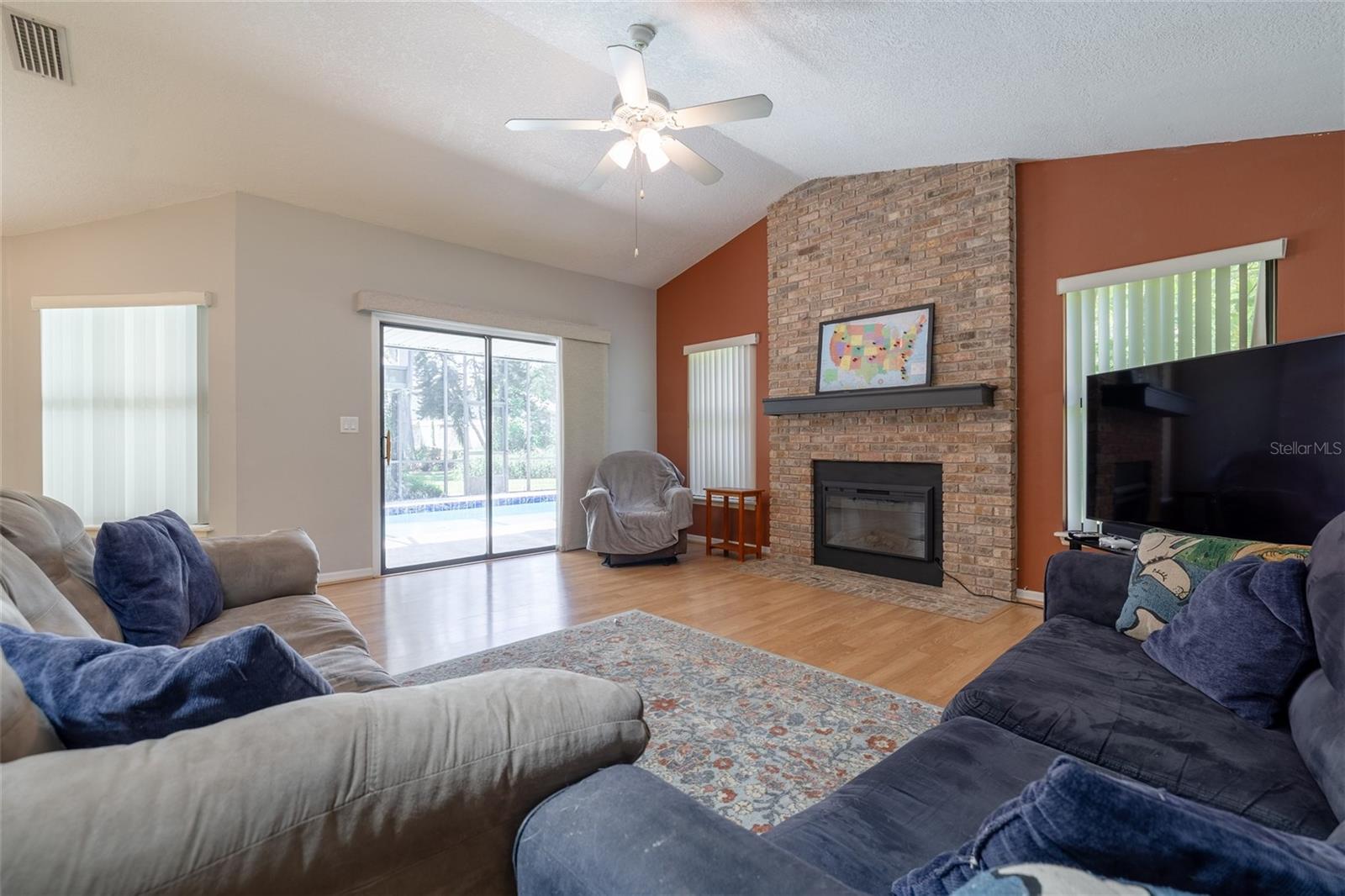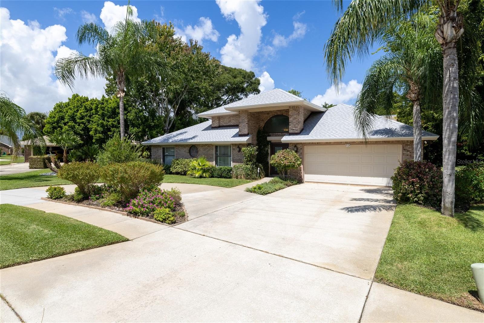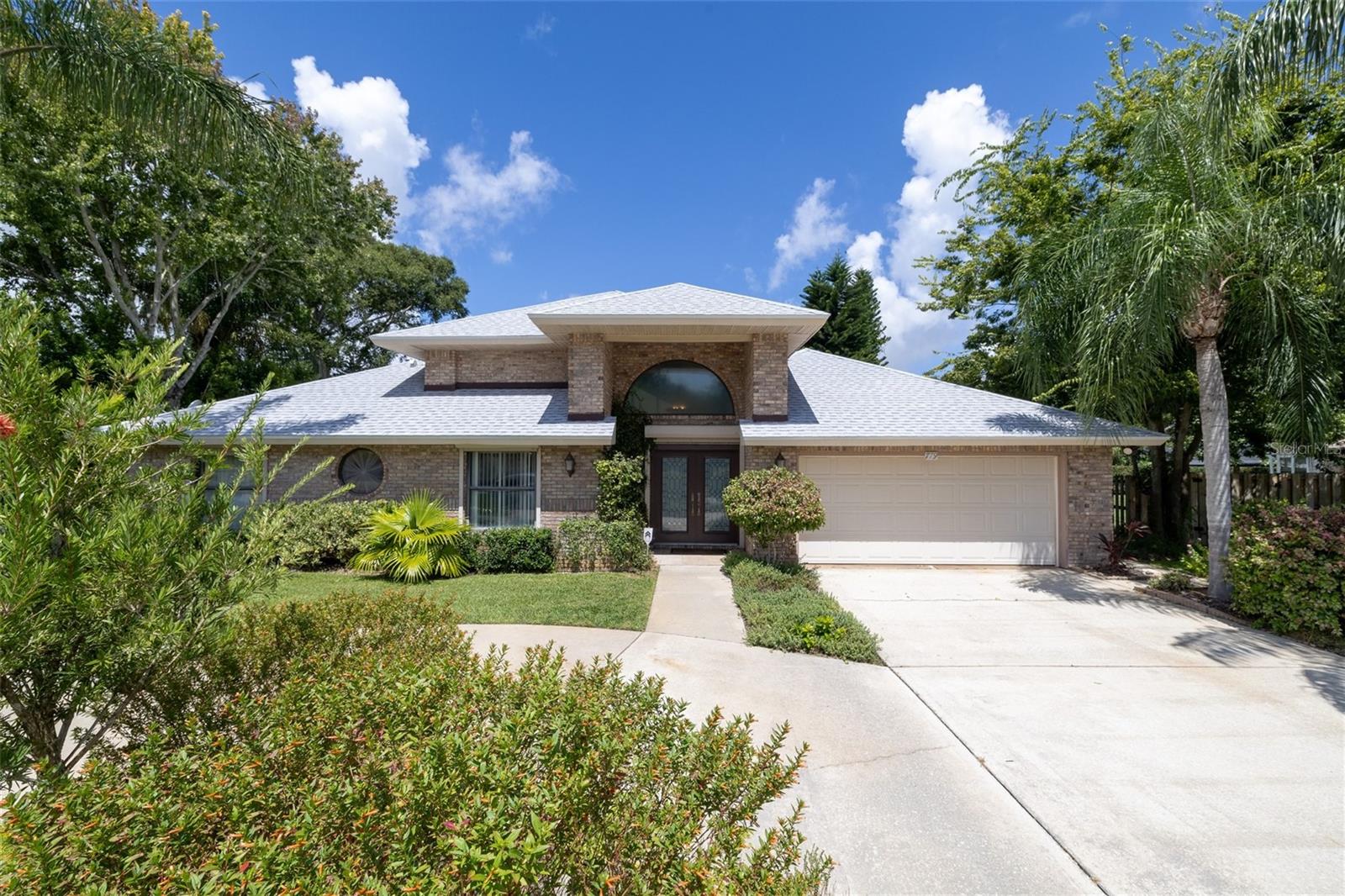 You'll Fall in Love with this Home! Situated in a gated community, this all-brick residence offers maintenance-free living without compromising comfort or style. Arrive via the circular driveway to nearly half an acre of lush land, featuring a saltwater screened-in pool and a serene wooded backyard that feels like your own private retreat. The well-designed floor plan blends elegance and functionality, with a spacious living room overlooking the pool, Soaring ceilings, modern kitchen with stainless steel appliances, a family room with an electric fireplace, and a formal dining room. The primary bedroom is a true sanctuary, offering walk-in closets and a spa-like en-suite with a walk-in shower and separate Jacuzzi tub. Recent upgrades include a new roof (2023) w/transferable warranty, updated electrical (2024), hurricane shutters, New Appliances, and a termite bond, making this home move-in ready. With shopping, schools, and beaches just minutes away, convenience is within effortless reach. Your dream lifestyle awaits!