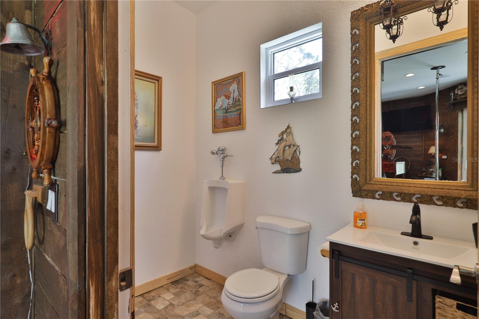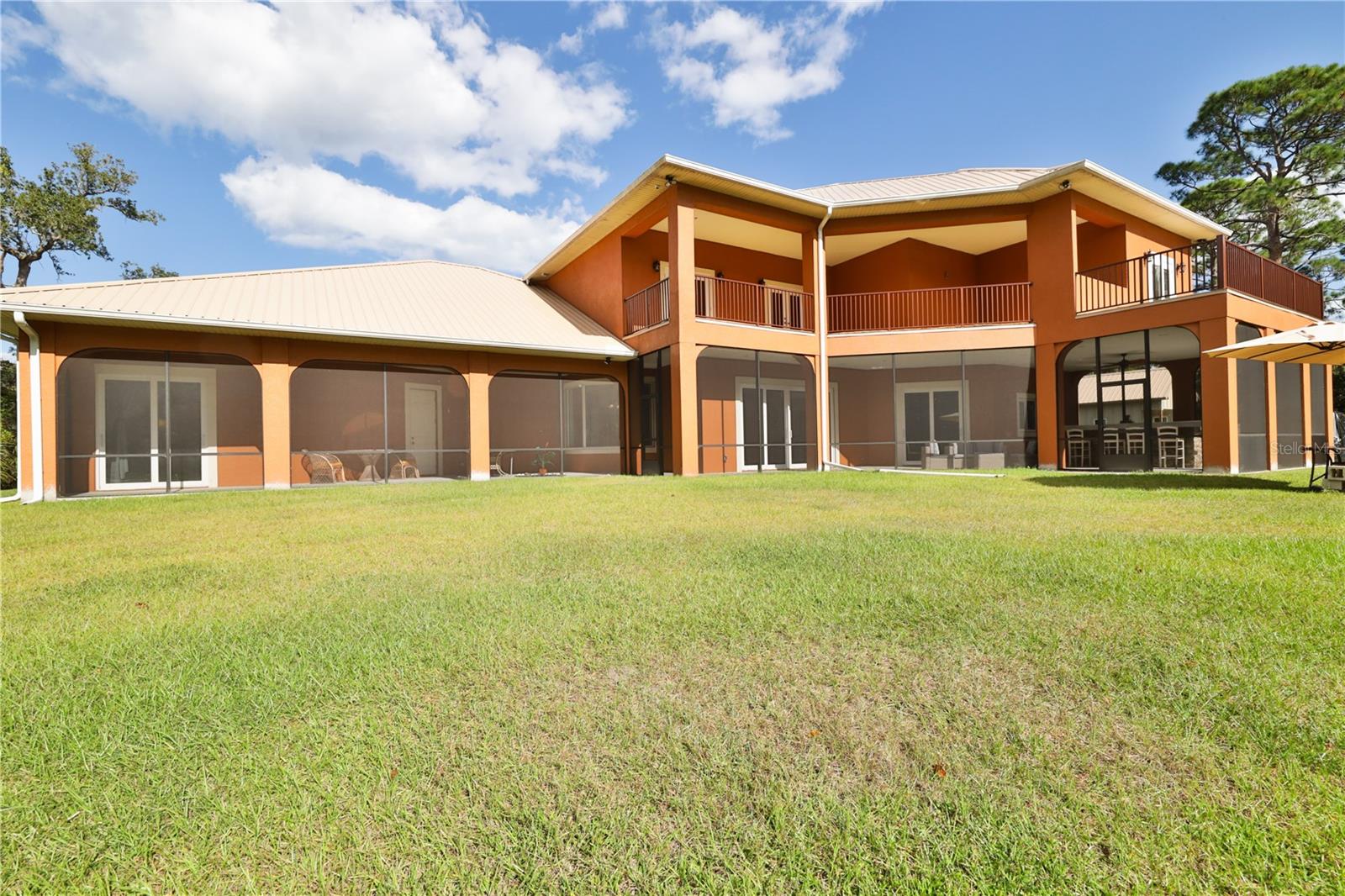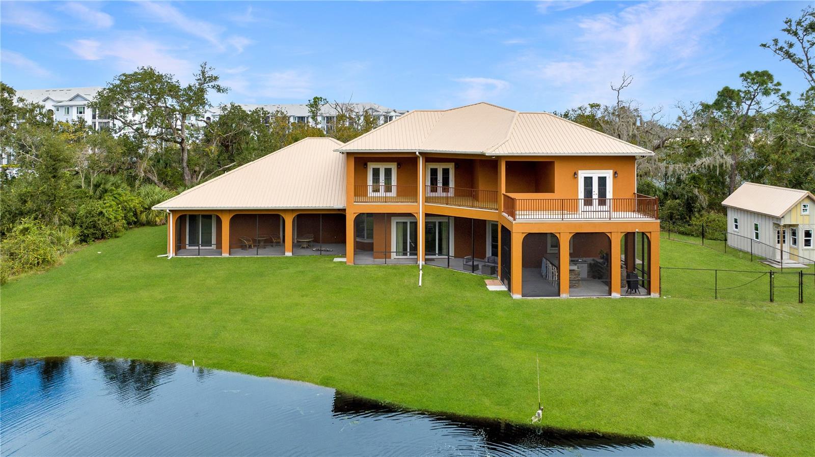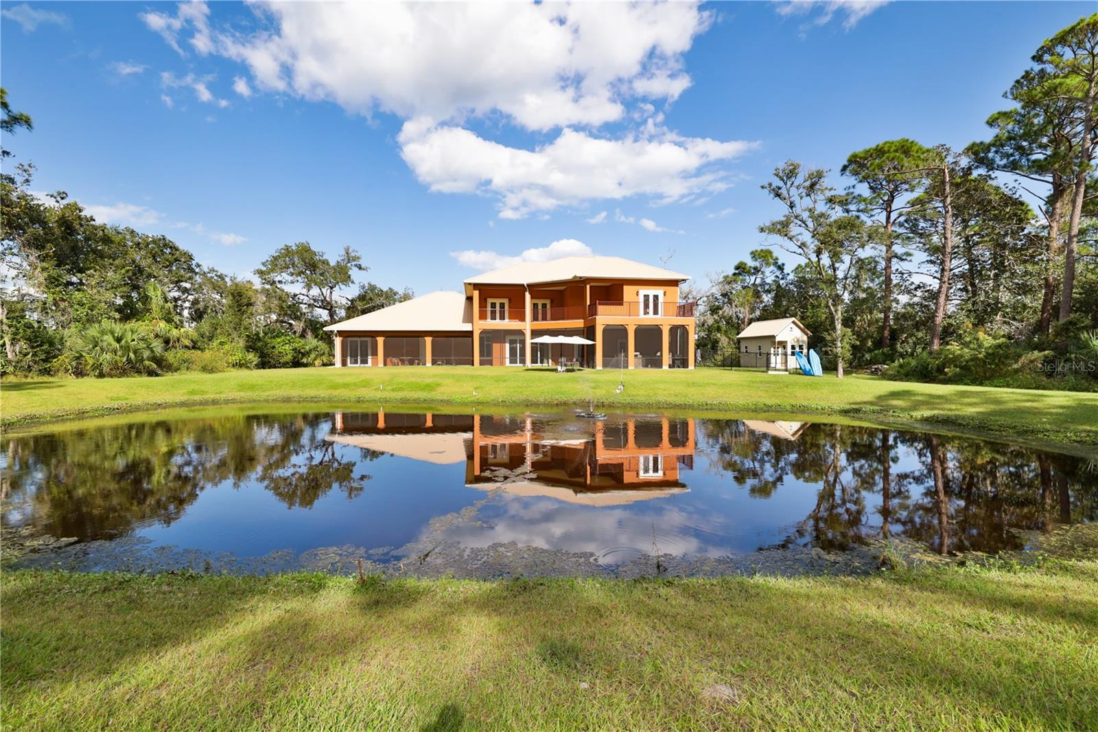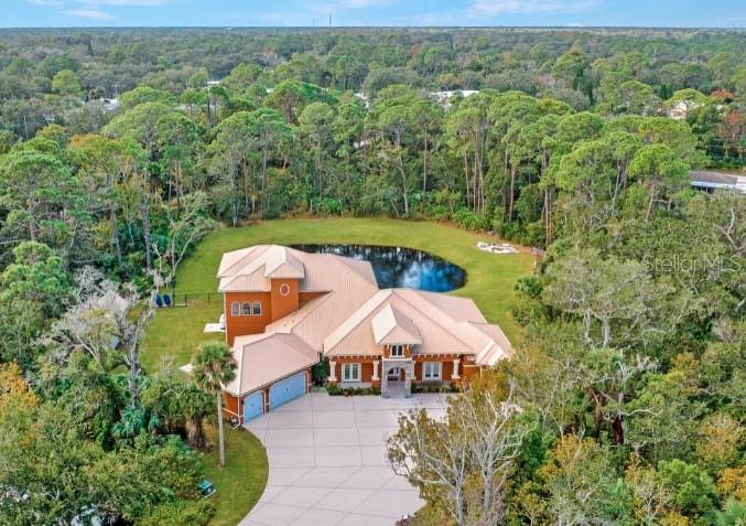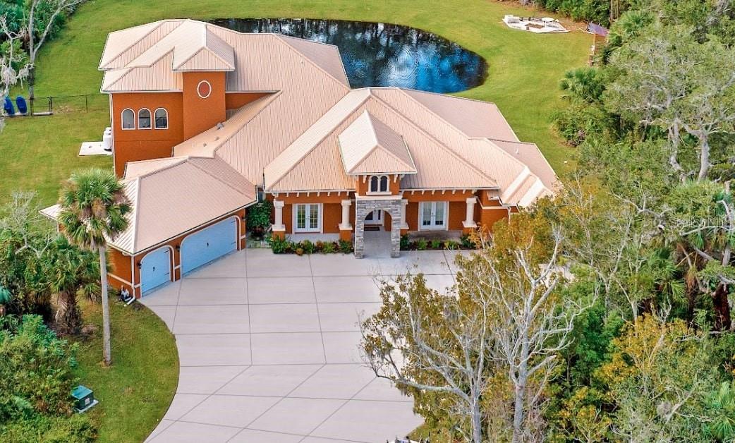 Bring your Creativity and Imagination to this Hidden Oasis and Unique Home!! Located in the Heart of Town and Near the Beach, Zoning also allows for Short-Term Rentals. Plenty of room to grow and develop into a variety of options!! Owner/Builder will consider Seller Financing. Nestled on over 3 acres of secluded paradise in the heart of the city, this meticulously designed and custom-crafted haven is a true masterpiece. Designed by the owner/builder with thoughtful precision, this property seamlessly combines tasteful luxury, family functionality, and hurricane preparedness in a unique package. As you approach the property, a discreet entrance gives no hint of the treasure hidden within. The powered gate swings open to reveal the custom home, a 4677 sq ft living space, featuring 4 bedrooms, 6 baths with a 3-car garage, The property also features a tiny house, and a stocked private pond surrounded by natural tree-lined barriers and creeks on two sides providing complete privacy. Short term rentals are allowed for this property. Upon entry, you are welcomed by a formal living room transformed into a gallery, showcasing collections and a custom-designed "family tree" on the wall. Tile flooring flows through the entire first floor, leading you into the heart of the house - the gourmet kitchen. This culinary haven boasts custom appliances, including a propane-powered 6 burner range with commercial venting system, a double oven and pot filler, custom cabinetry and storage, granite countertops, a center island, a breakfast bar, and a designated coffee bar area. The main floor surprises you with a "Harry Potter-themed" guest bathroom featuring a whimsical brick barrel ceiling. The first floor master bedroom suite offers privacy with well thought out features and design. It is a luxurious retreat offering separate walk-in closets, a rainforest shower, soaking tub, and dual vanities. A uniquely hidden and private office space is accessible from the outside front porch of the home and also by a secret bookcase entry from the interior. The entertainment space takes a unique turn with the Pirate Bar, complete with karaoke, custom bar, and liquor back bar. Rum barrels integrated into the bar carry the theme, connecting seamlessly with the outdoor living space. A built-in fish tank with a pirate ship and turtle creates a unique ambiance for gatherings. Ascending to the second floor, a massive chandelier illuminates a staircase landing with a cozy sitting area and custom bookcase. Natural light flows through, highlighting a multi-level movie theater with a smooth coat movie screen and integrated speakers. Guest bedrooms feature ensuite baths and private balconies with serene views of the backyard. Outside, the backyard unfolds as a secluded oasis with a fully stocked pond, a screened enclosure, and a Florida kitchen for outdoor gatherings. The property prioritizes energy efficiency with a heavy gauge metal roof, insulated doors and windows, and thoughtful attic foam insulation, resulting in remarkably low energy bills. Equipped for hurricane preparedness, the property features a generator hookup and a dedicated hurricane-friendly panel, ensuring functionality during outages. Overall, this meticulously designed property offers an array of unique features and spaces, catering to various interests and providing a haven for relaxation, entertainment, and practical living and security.