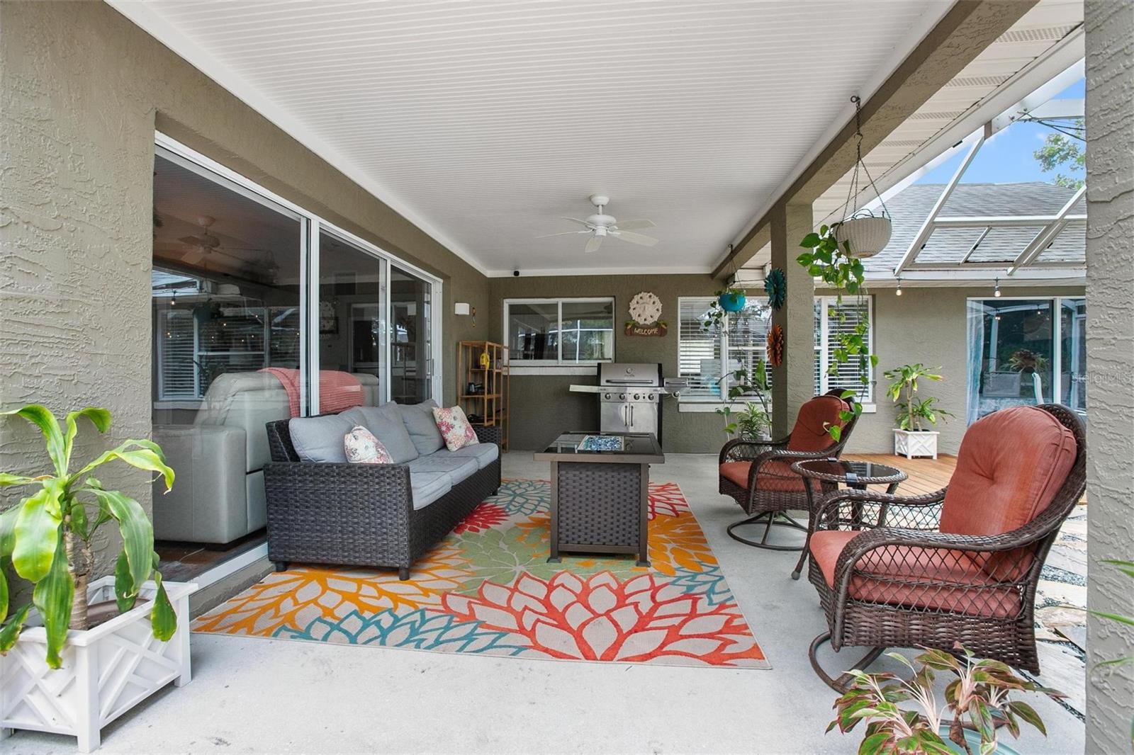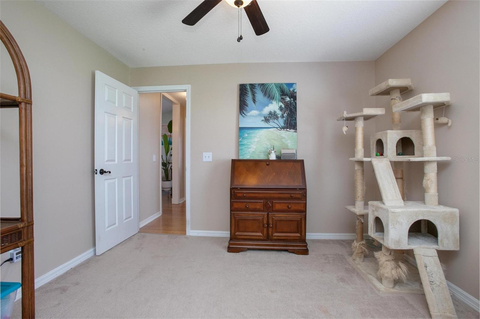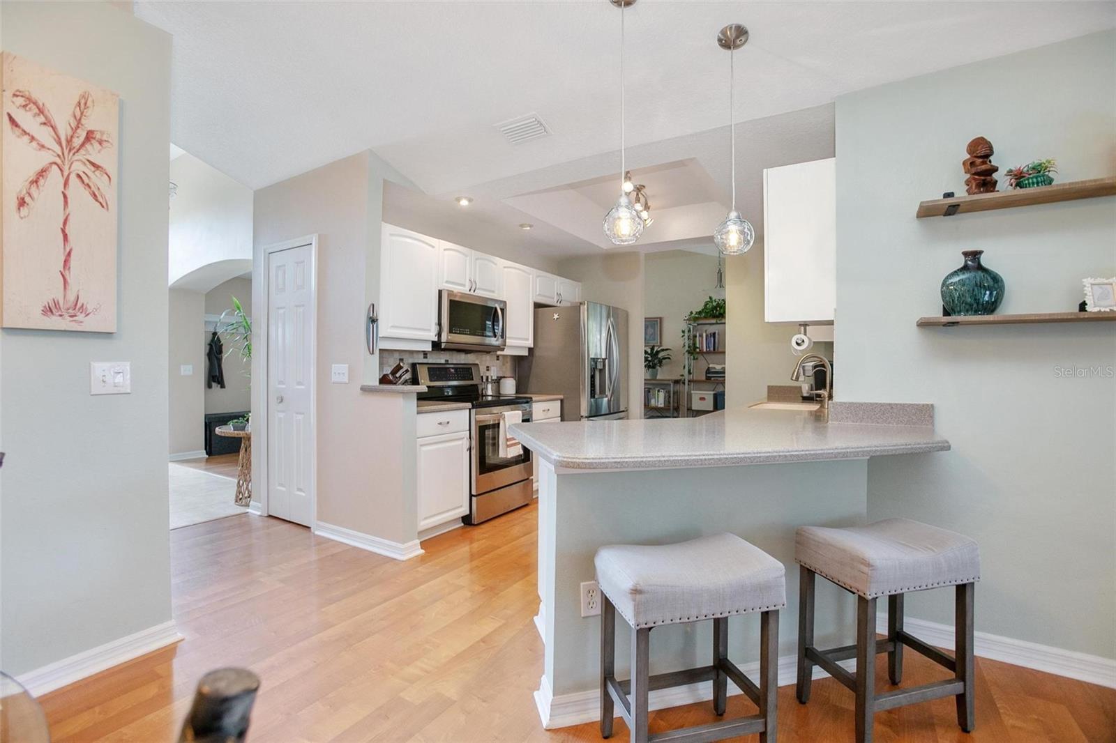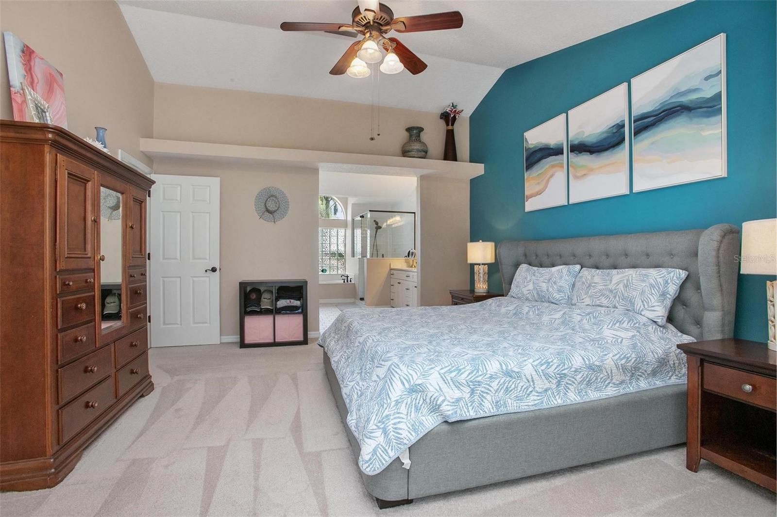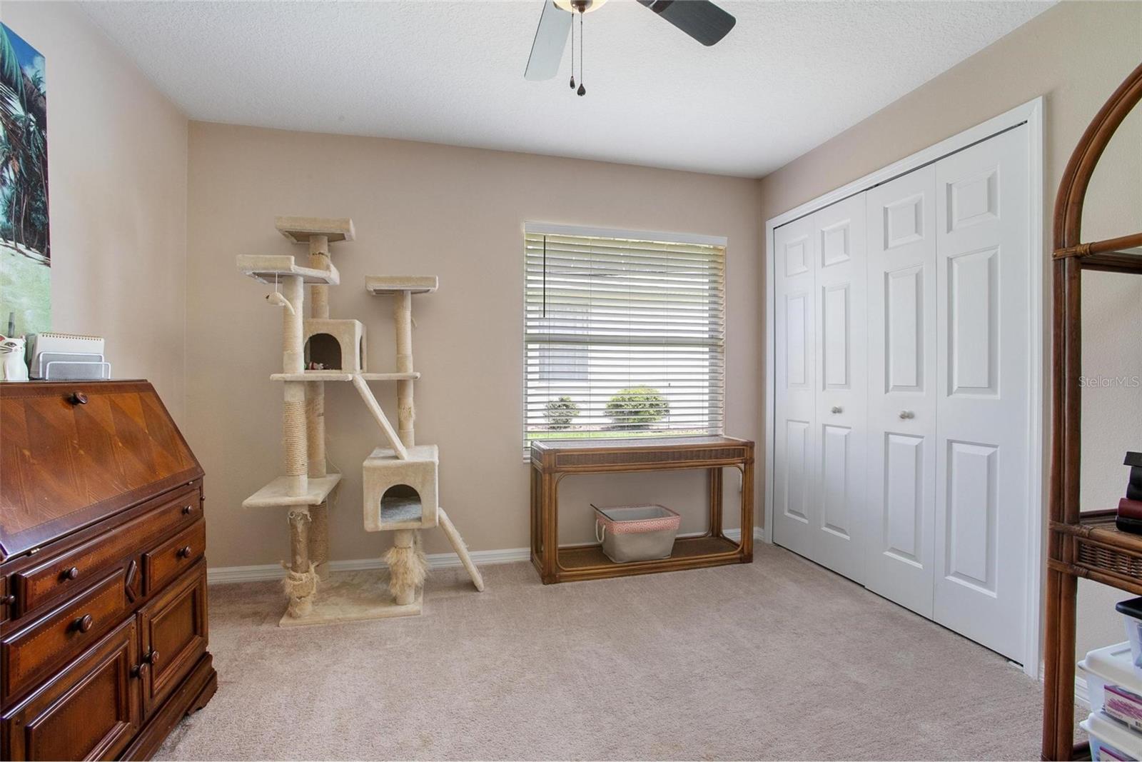 Welcome to this beautifully maintained 3-bedroom, 2-bathroom brick home nestled in the Countryside West neighborhood. Offering 1,850 sq ft of thoughtfully designed living space, this residence boasts high ceilings, a desirable split floor plan, and tasteful upgrades throughout. As you approach, you'll be greeted by a tastefully landscaped exterior and new concrete curbing (2024), setting the tone for the care and attention given to this home. Inside, a seamless flow connects the kitchen, living, and dining areas, ideal for entertaining or everyday comfort. The kitchen features stainless steel appliances, tray ceilings, ample cabinet space, and a view into the beautifully landscaped backyard. The spacious primary suite offers a large walk-in closet and a tastefully updated en-suite bathroom with a dual sink vanity, soaking tub, and glass-enclosed shower. The living room features an expansive slider that fills the space with natural light and opens to a screened-in back patio oasis (NEW screen enclosure 2023). Additional highlights include a 2019 roof with a transferable 10-year warranty, indoor laundry room, and a hot water heater less than one year old. Step outside to enjoy a generous backyard complete with decked patio areas, a stone firepit, palm tree landscaping, and a tranquil pond—all enclosed by wood shadow box fencing for privacy. A storage shed is also included for added convenience. Located on a comfortable-sized lot in a peaceful, well-established community, this home checks all the boxes for style, function, and value. Schedule your private showing today!