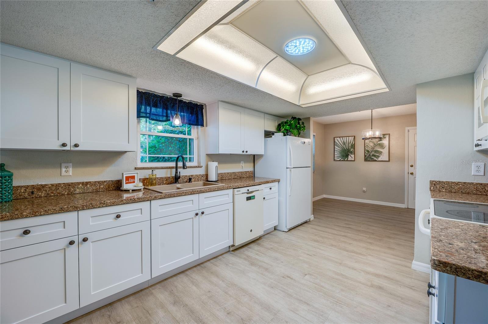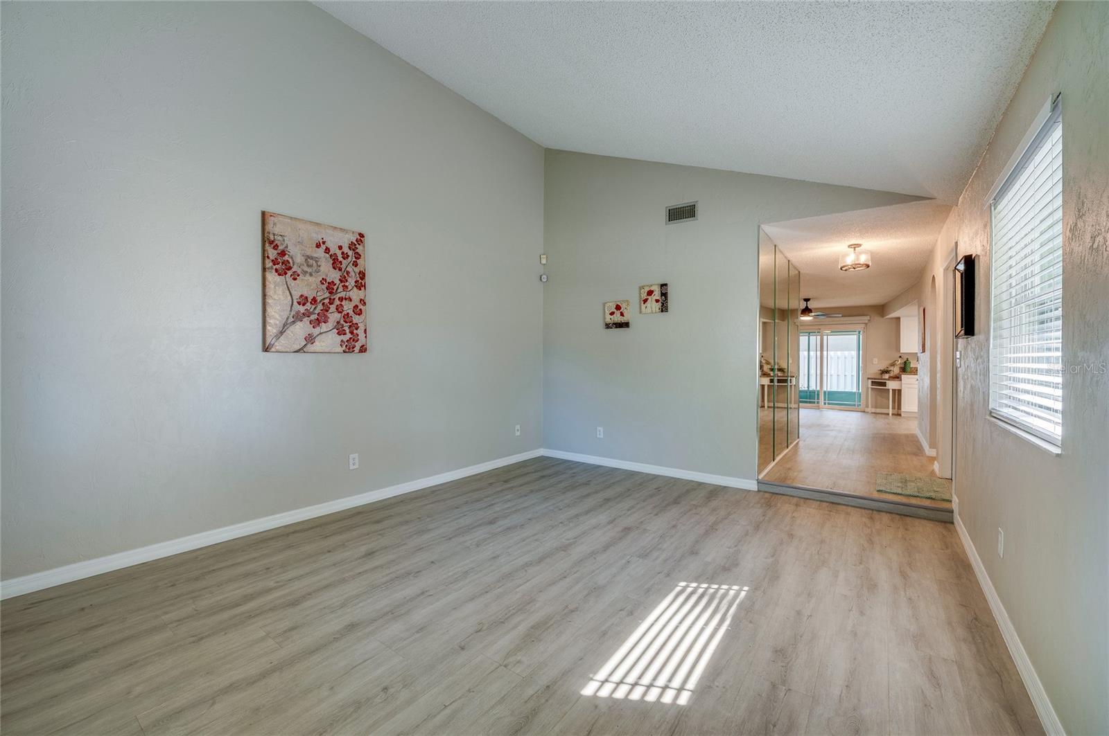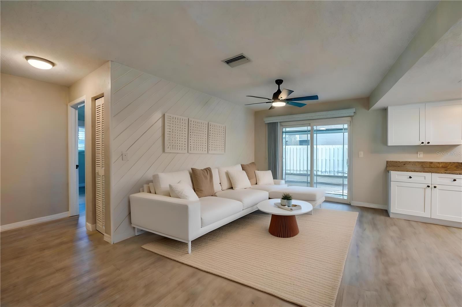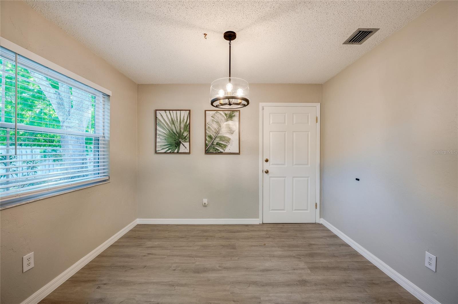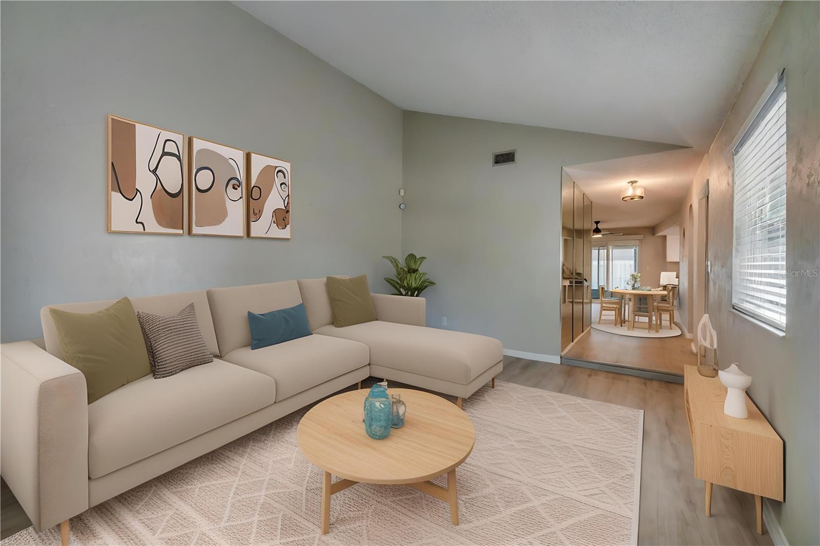 One or more photo(s) has been virtually staged. This beautifully updated 3-bedroom, 2-bathroom home in Deep Forest Village offers spacious living, thoughtful upgrades, a large corner lot, and a New Roof with acceptable offer. With an abundance of upgrades, including new windows and sliding glass doors, freshly painted interior and exterior. Step inside to a bright open concept floor plan with luxury vinyl flooring throughout. The living area features vaulted ceilings enhancing the sense of space, while the family room has a stylish shiplap feature wall, creating a welcoming interior. The stylish kitchen is both functional and inviting, featuring white shaker cabinetry, granite countertops, and a full appliance package. There is a breakfast nook for casual dining, and the separate dining room provides the ideal space for hosting family dinners and holiday gatherings. The primary suite is generously sized with a large closet and an en-suite bath with tiled, walk-in shower. Two additional bedrooms offer flexibility for family, guests or a home office. The second full bathroom includes a shower/tub combo, and a skylight that bathes the room in natural sunlight. Enjoy seamless indoor-outdoor living with a screened, tiled porch overlooking the fully fenced private backyard shaded by mature trees. The oversized corner lot is beautifully landscaped with defined garden beds, palm trees, and curved borders. With no HOA restrictions there is extra flexibility for RV or boat storage. Situated in a prime location, this home offers easy access to I-95 and is just minutes from The Pavilion, top-rated dining, shopping, movie theaters, medical facilities, and a variety of entertainment venues. Don't miss this exceptional opportunity to make this home your own. All information recorded in the MLS is intended to be accurate but cannot be guaranteed.