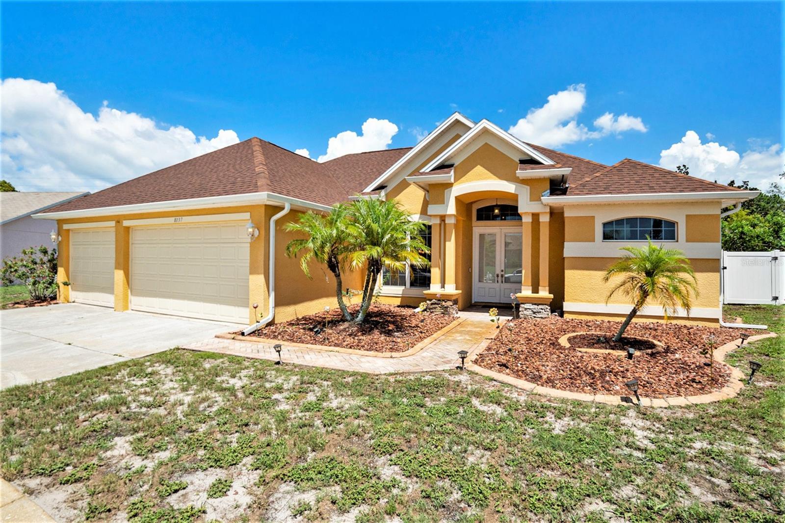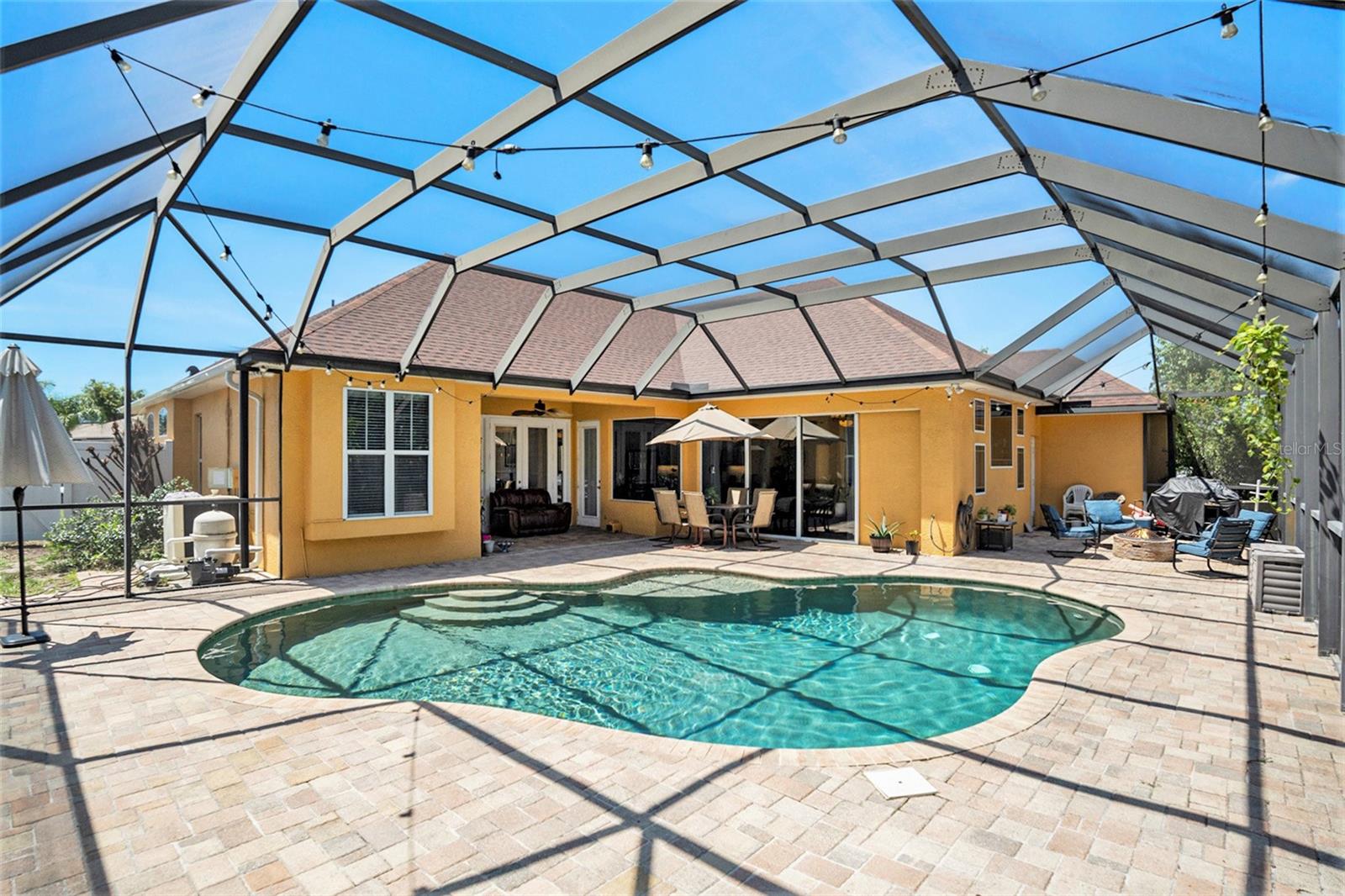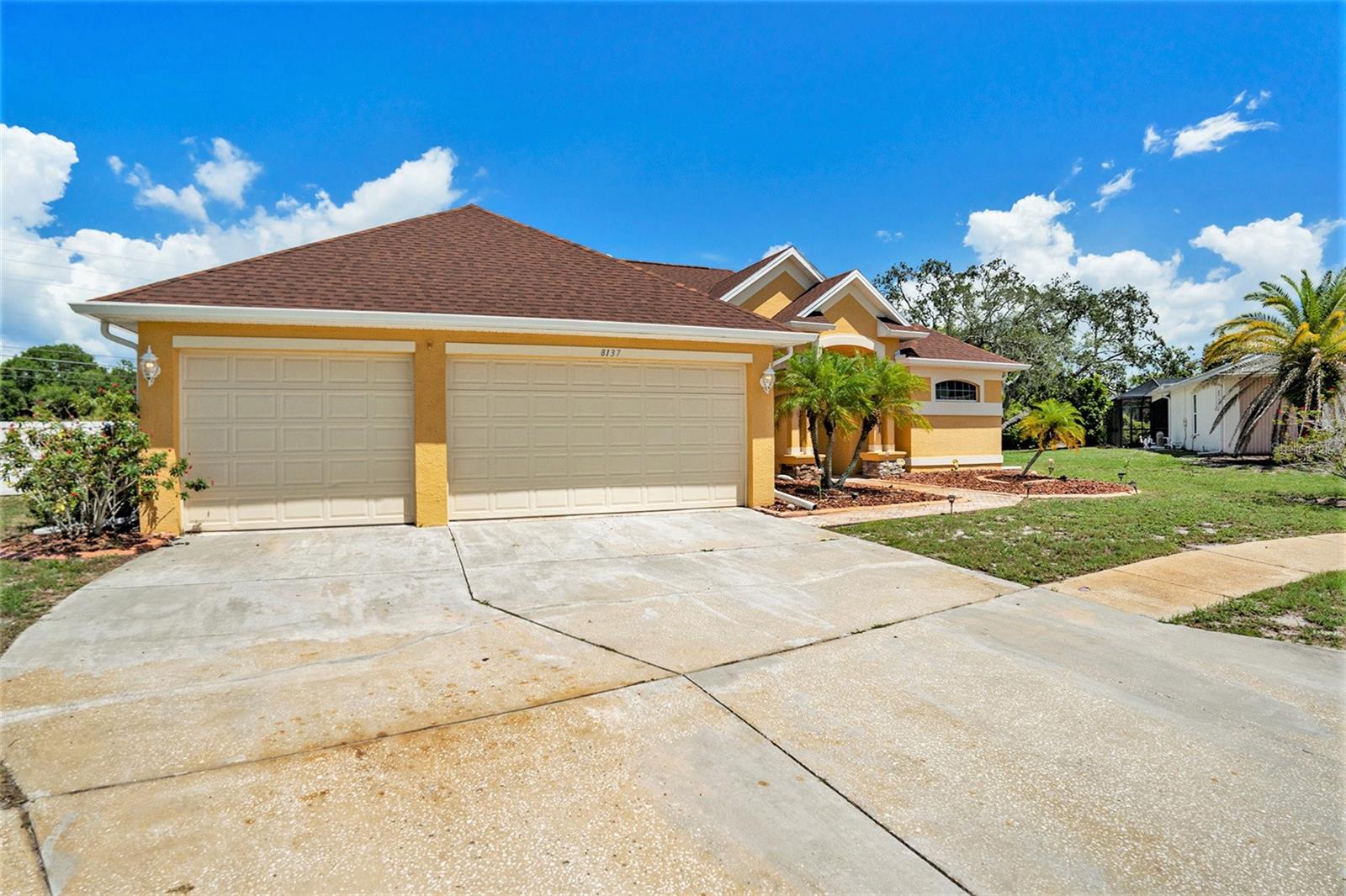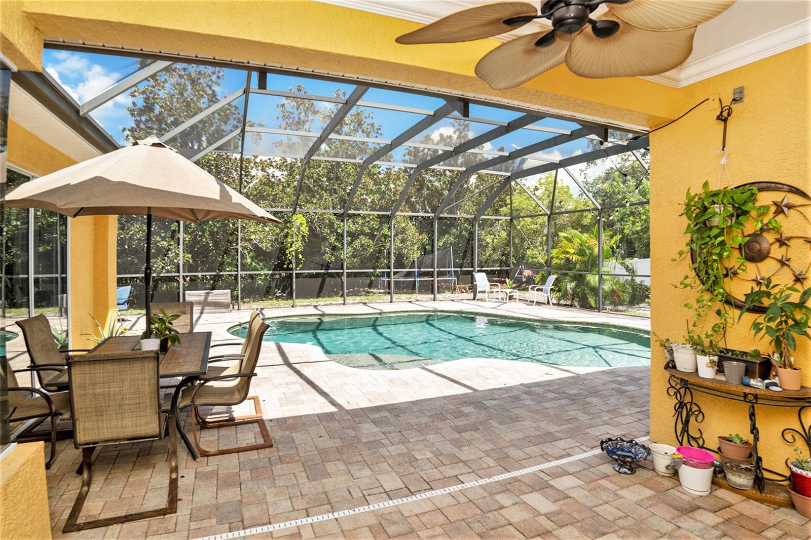 This Beautiful custom house is a dream come true. It has the right design and construction, it is a reflection of your personality, style, and lifestyle. The details and custom additions in this home are not average. They are in the details everywhere you look with the natural light, double door entryway, Hardwood floor, High Architectural Tray Ceilings, 3 pocket doors from the family room that gives a relaxed view to the pool, and that fully open to the gorgeous paved bird-caged pool. Lanai has three areas to Relax and Entertain. The Roof was replaced in 2023, the brand new 2024 pool motor also has a water heater that the Sellers have never used, the AC 2016 is well maintained, and the 3-car garage is bigger than the regular garage size. Appliances 2021, salt water pool with pavers around the patio, wet bar and built-in desk near to kitchen with lights, 2 thermostats with individual modification for the different room temperatures, elegant crown molding around the house, ring bell camera, vinyl fenced for privacy. The guest bath is beautifully remodeled and it has access to the pool. The house has a well tank (optional) and Sprinkle system. You will find an extra space (room) that you can use as an office/den. Master Suite with Walk-In Closet, Master bath with Dual Sinks, Tub, & Shower. This home has a breakfast bar and both a family and living room. This house is located in a big lot (1/4 to 1/2 acre) so there is an extra space to put your trampoline or any additional things to enjoy. This house really will impress you.