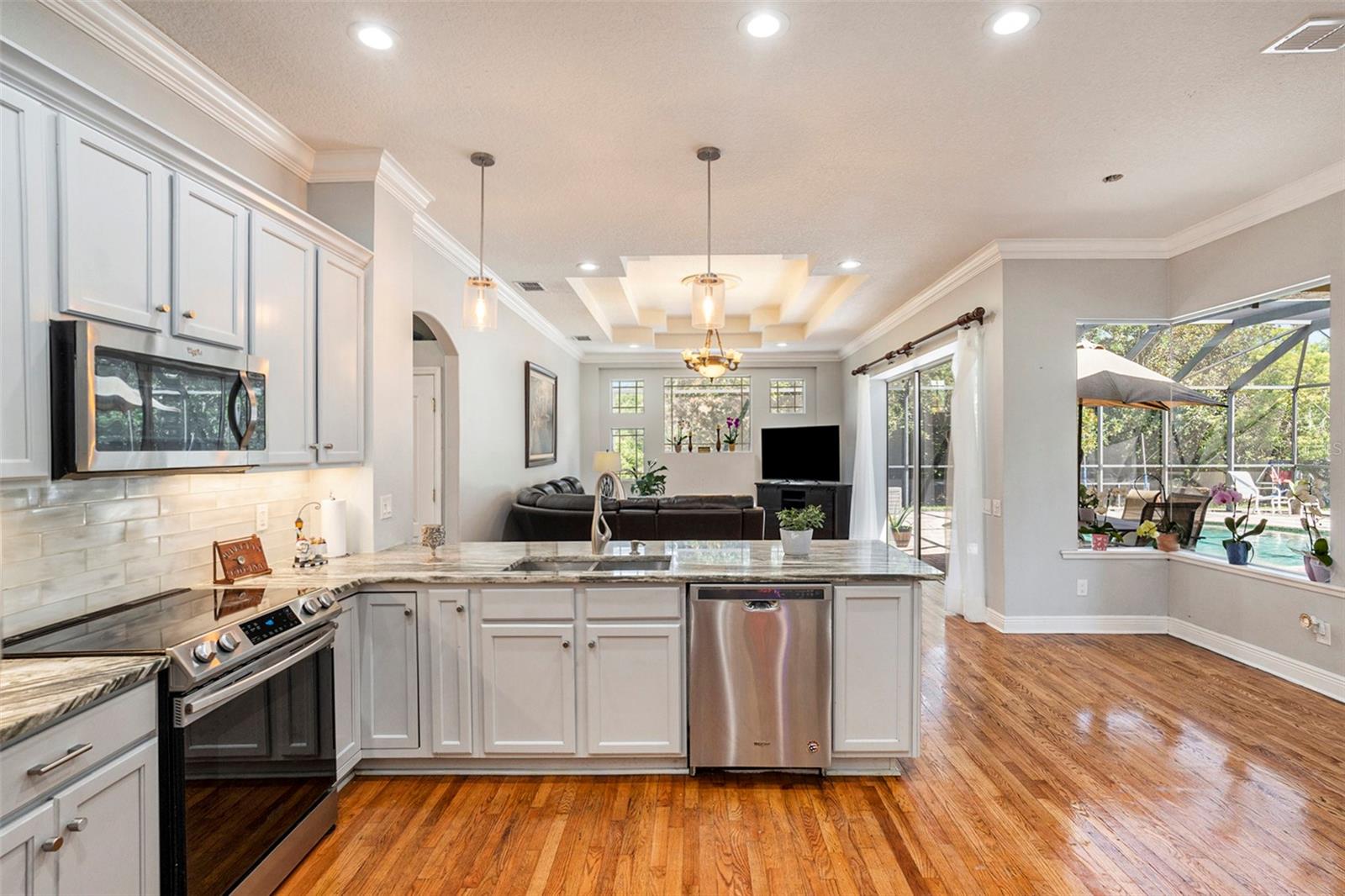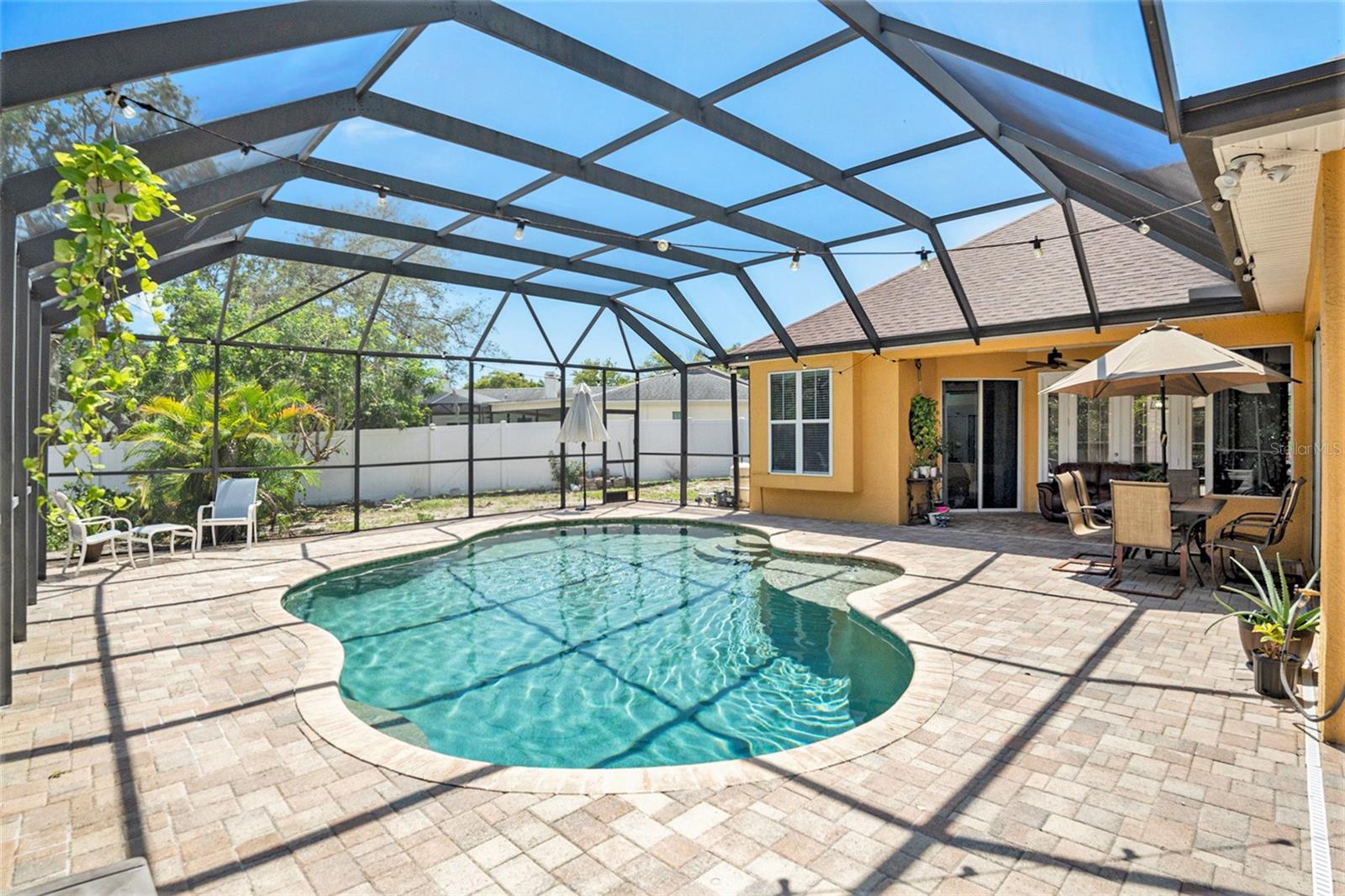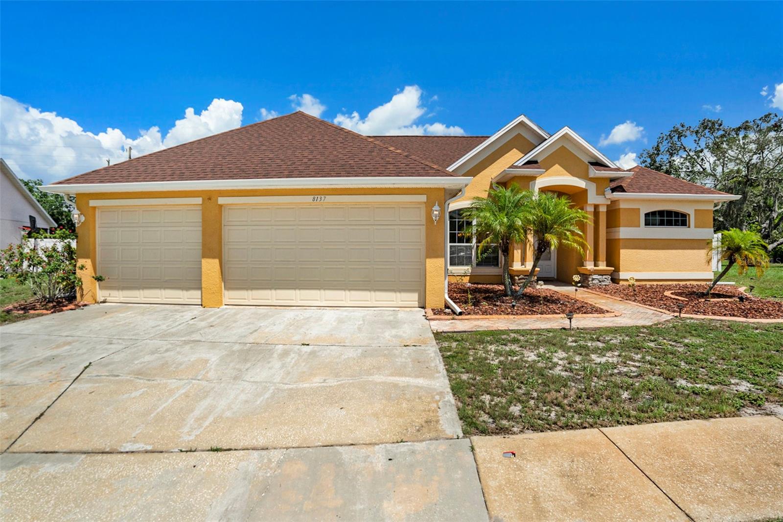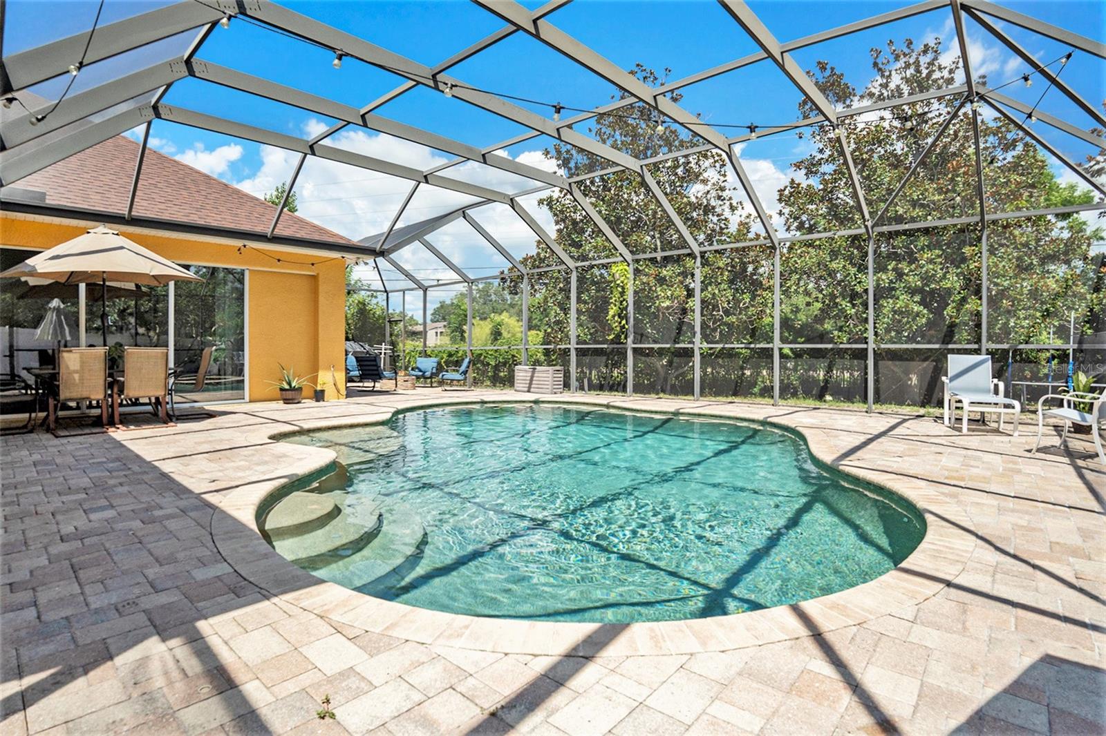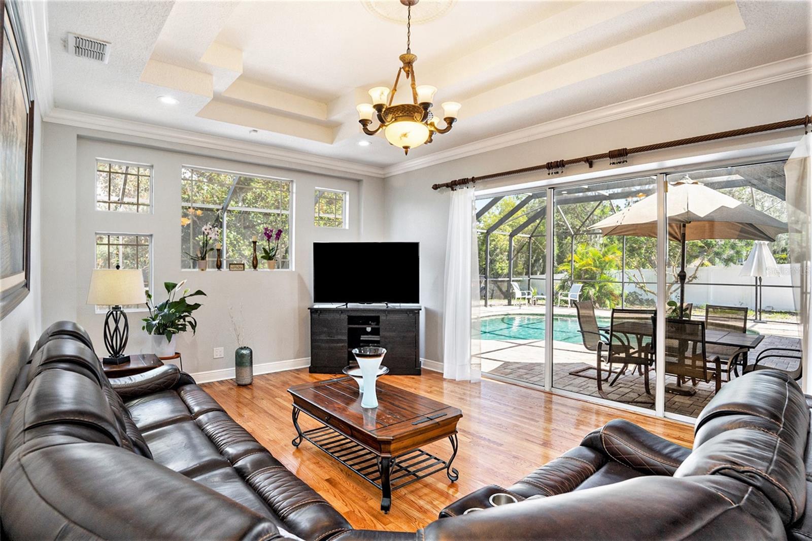 This Beautiful custom house is a dream come true. It has the right design and construction, it is a reflection of your personality, style, and lifestyle. The details and custom additions in this home are not average. They are in the details everywhere you look with the natural light, double door entryway, Hardwood floor, High Architectural Tray Ceilings, 3 pocket doors from the family room that gives a relaxed view to the pool, and that fully open to the gorgeous paved bird-caged pool. Lanai has three areas to Relax and Entertain. The Roof was replaced in 2023, the brand new 2024 pool motor also has a water heater that the Sellers have never used, the AC 2016 is well maintained, and the 3-car garage is bigger than the regular garage size. Appliances 2021, salt water pool with pavers around the patio, wet bar and built-in desk near to kitchen with lights, 2 thermostats with individual modification for the different room temperatures, elegant crown molding around the house, ring bell camera, vinyl fenced for privacy. The guest bath is beautifully remodeled and it has access to the pool. The house has a well tank (optional) and Sprinkle system. You will find an extra space (room) that you can use as an office/den. Master Suite with Walk-In Closet, Master bath with Dual Sinks, Tub, & Shower. This home has a breakfast bar and both a family and living room. This house is located in a big lot (1/4 to 1/2 acre) so there is an extra space to put your trampoline or any additional things to enjoy. This house really will impress you.
