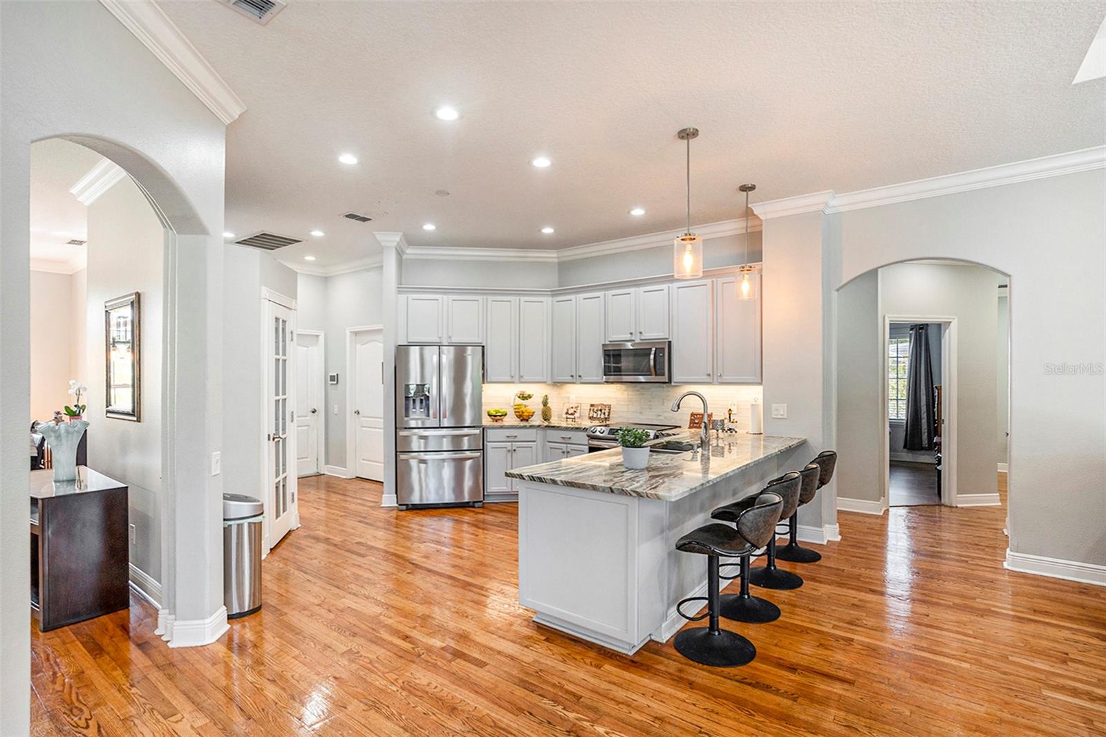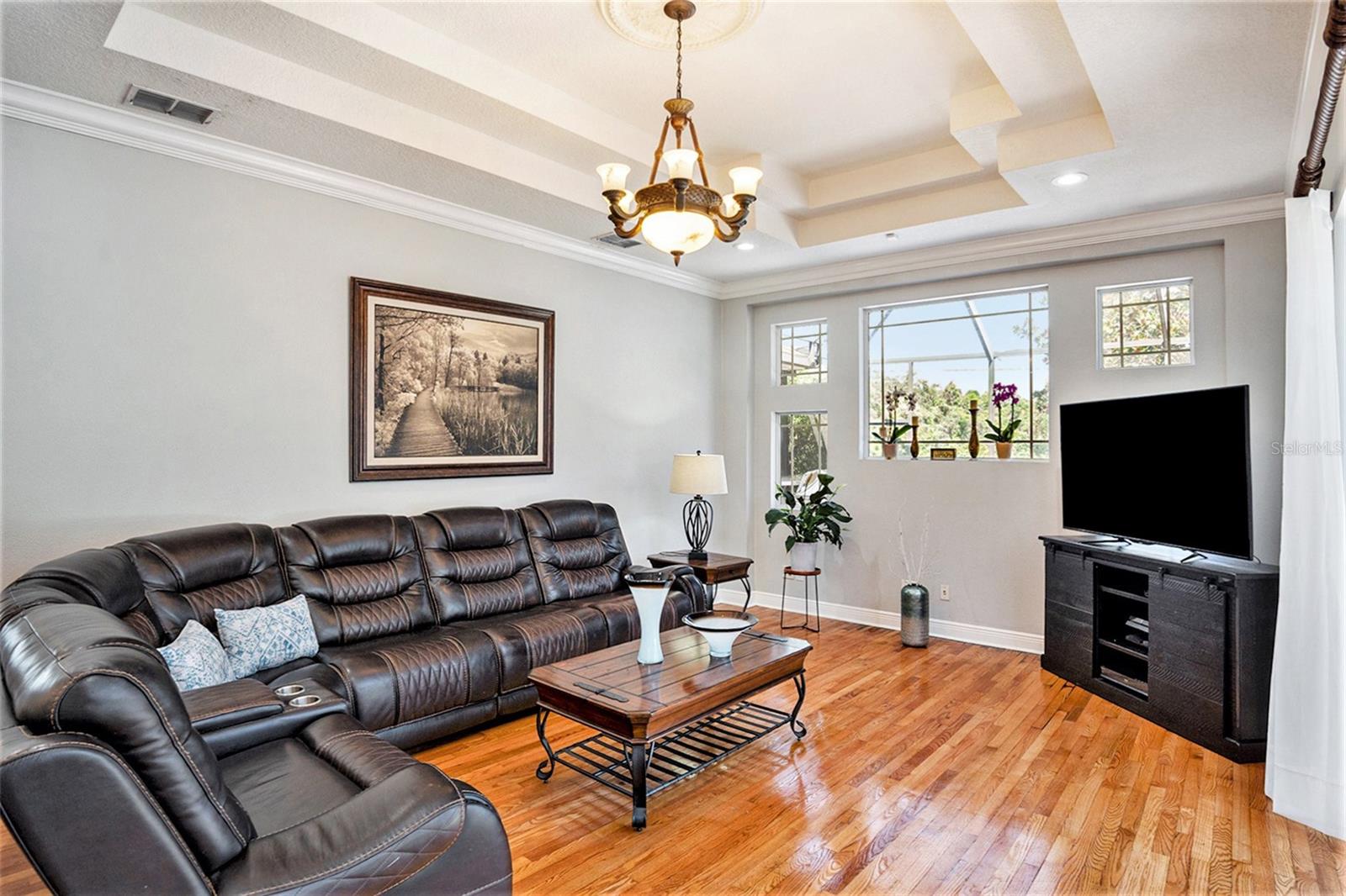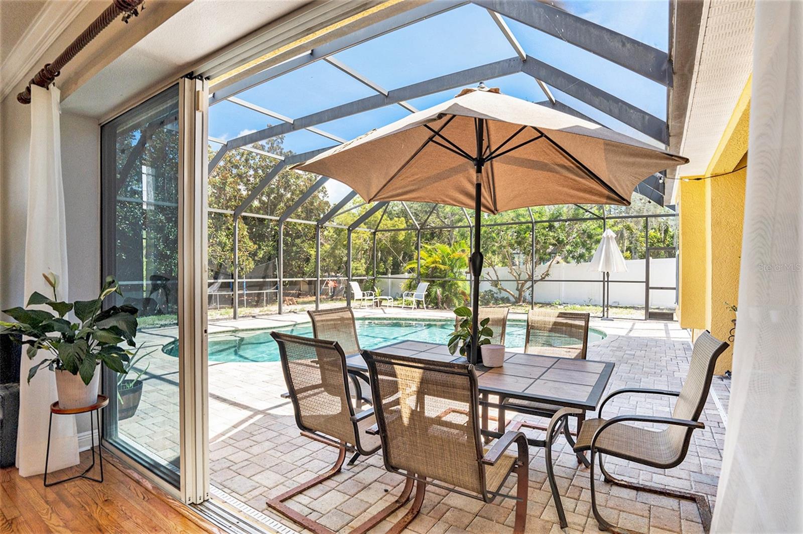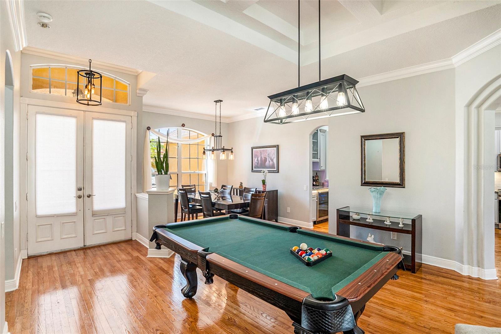 This Beautiful custom house is a dream come true. It has the right design and construction, it is a reflection of your personality, style, and lifestyle. The details and custom additions in this home are not average. They are in the details everywhere you look with the natural light, double door entryway, Hardwood floor, High Architectural Tray Ceilings, 3 pocket doors from the family room that gives a relaxed view to the pool, and that fully open to the gorgeous paved bird-caged pool. Lanai has three areas to Relax and Entertain. The Roof was replaced in 2023, the brand new 2024 pool motor also has a water heater that the Sellers have never used, the AC 2016 is well maintained, and the 3-car garage is bigger than the regular garage size. Appliances 2021, salt water pool with pavers around the patio, wet bar and built-in desk near to kitchen with lights, 2 thermostats with individual modification for the different room temperatures, elegant crown molding around the house, ring bell camera, vinyl fenced for privacy. The guest bath is beautifully remodeled and it has access to the pool. The house has a well tank (optional) and Sprinkle system. You will find an extra space (room) that you can use as an office/den. Master Suite with Walk-In Closet, Master bath with Dual Sinks, Tub, & Shower. This home has a breakfast bar and both a family and living room. This house is located in a big lot (1/4 to 1/2 acre) so there is an extra space to put your trampoline or any additional things to enjoy. This house really will impress you.