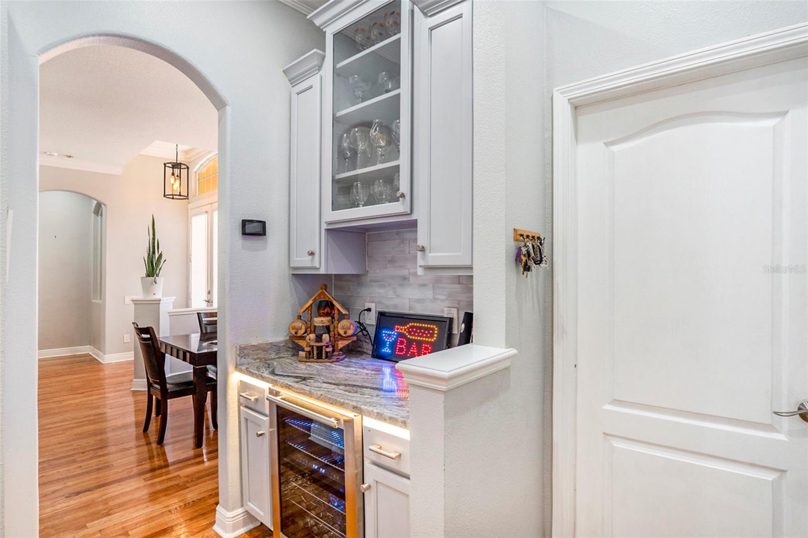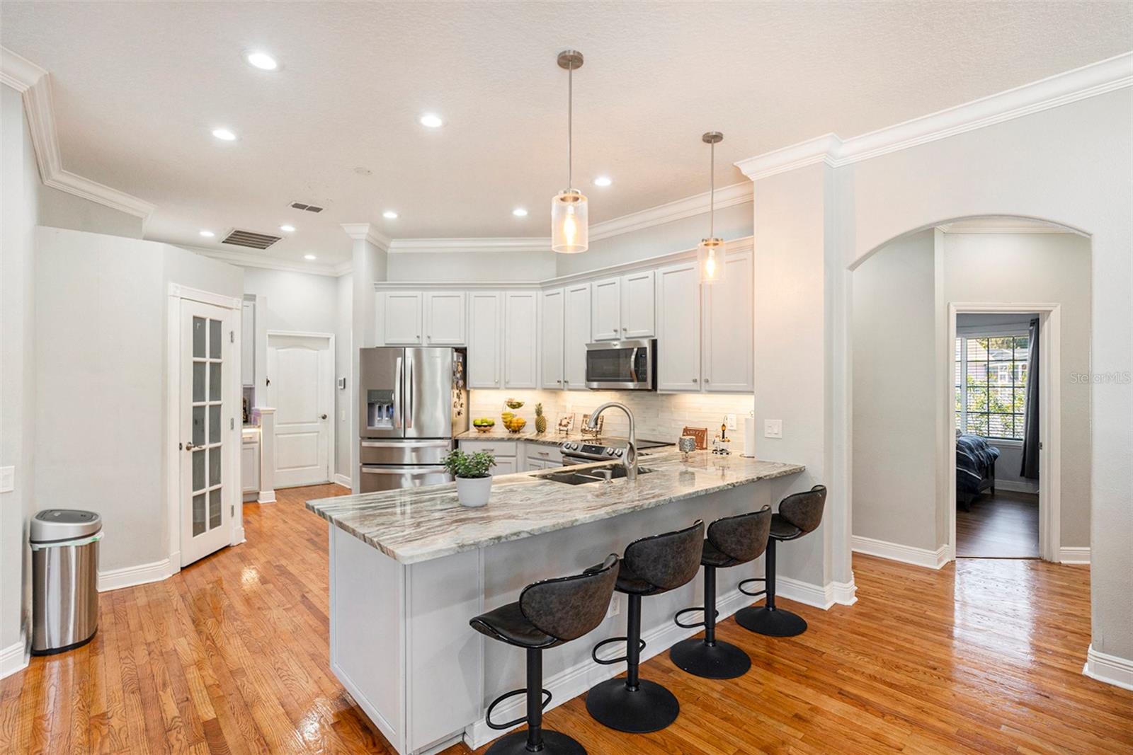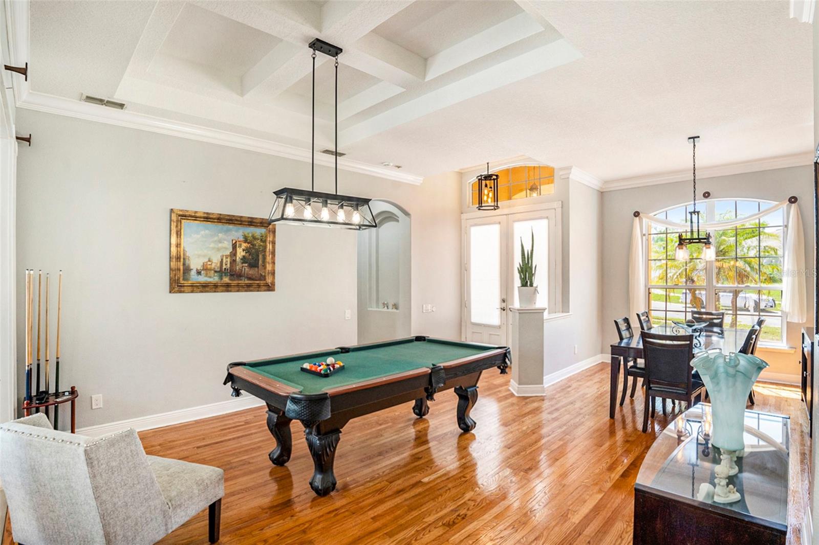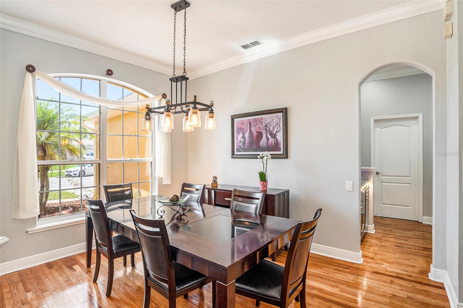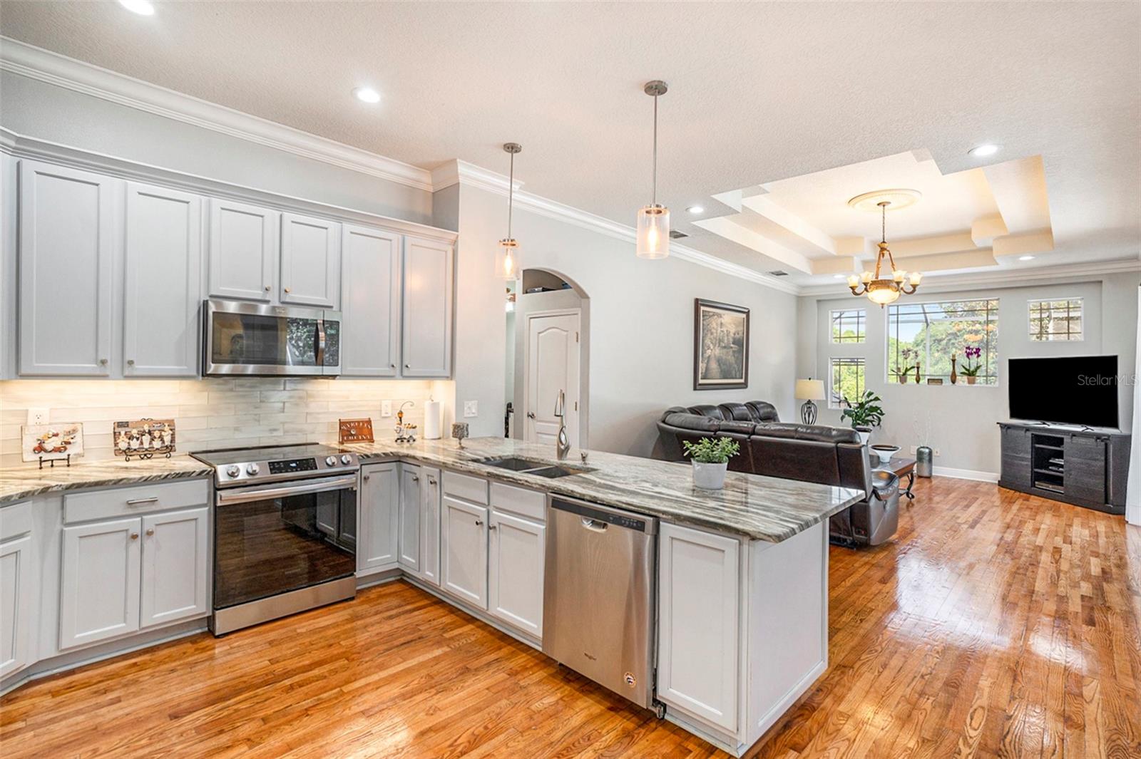 This Beautiful custom house is a dream come true. It has the right design and construction, it is a reflection of your personality, style, and lifestyle. The details and custom additions in this home are not average. They are in the details everywhere you look with the natural light, double door entryway, Hardwood floor, High Architectural Tray Ceilings, 3 pocket doors from the family room that gives a relaxed view to the pool, and that fully open to the gorgeous paved bird-caged pool. Lanai has three areas to Relax and Entertain. The Roof was replaced in 2023, the brand new 2024 pool motor also has a water heater that the Sellers have never used, the AC 2016 is well maintained, and the 3-car garage is bigger than the regular garage size. Appliances 2021, salt water pool with pavers around the patio, wet bar and built-in desk near to kitchen with lights, 2 thermostats with individual modification for the different room temperatures, elegant crown molding around the house, ring bell camera, vinyl fenced for privacy. The guest bath is beautifully remodeled and it has access to the pool. The house has a well tank (optional) and Sprinkle system. You will find an extra space (room) that you can use as an office/den. Master Suite with Walk-In Closet, Master bath with Dual Sinks, Tub, & Shower. This home has a breakfast bar and both a family and living room. This house is located in a big lot (1/4 to 1/2 acre) so there is an extra space to put your trampoline or any additional things to enjoy. This house really will impress you.