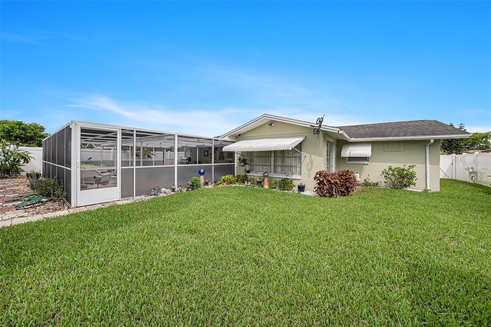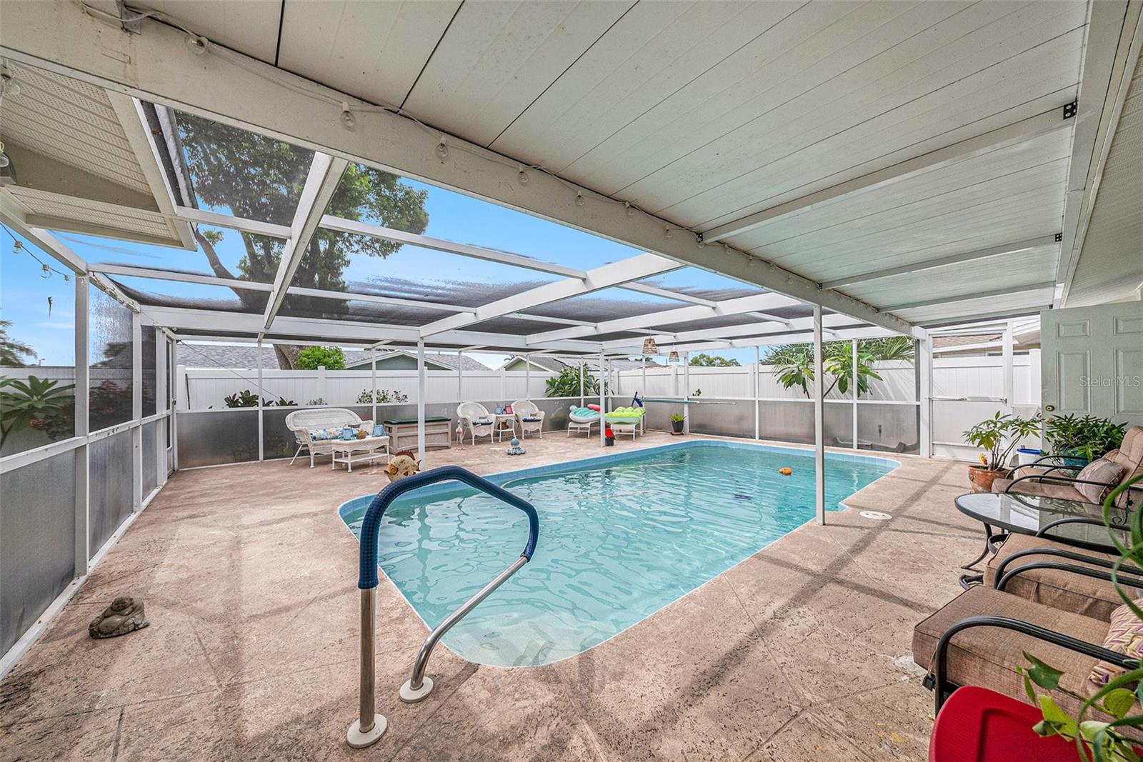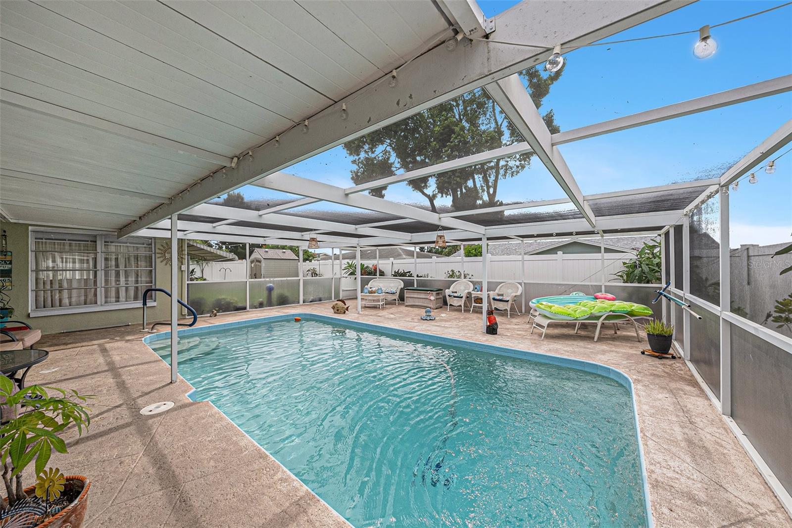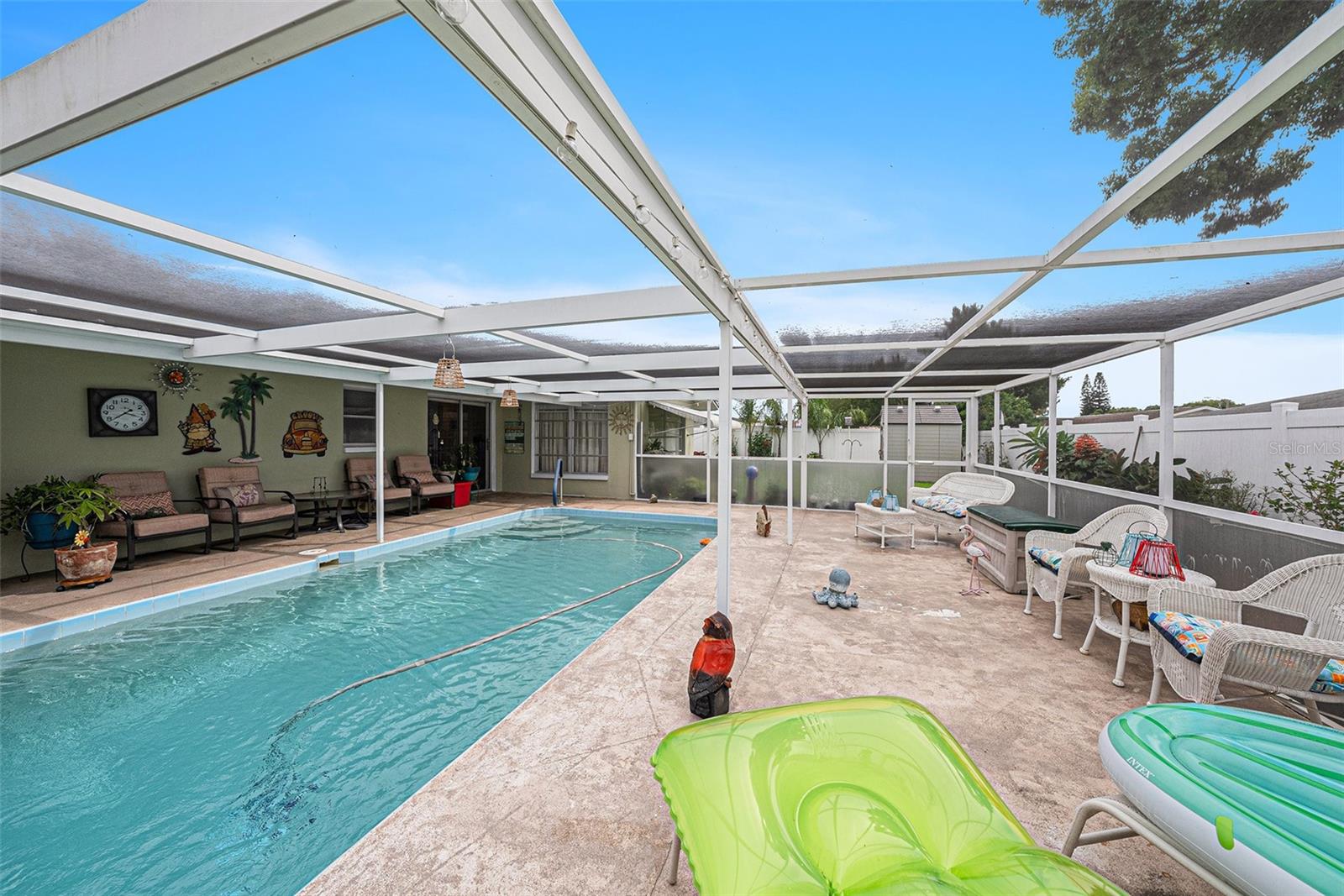 Welcome to your dream retreat in a serene, HOA-free neighborhood! This beautifully updated two-bedroom, two-bath home features a spacious open-concept living area where the modern kitchen seamlessly flows into the inviting living room. Enjoy the luxury of brand-new flooring and contemporary kitchen finishes while overlooking your sparkling caged pool, perfect for relaxing or entertaining year-round. The fenced yard offers privacy and security. Unique to this property is the oversized garage that includes a conveniently located second bath. This clever addition ensures that guests can access a restroom without having to enter the main home, making it perfect for pool parties and gatherings. With its blend of practical upgrades and stylish living spaces, this home is a rare find that combines convenience, comfort, and charm in a peaceful setting.