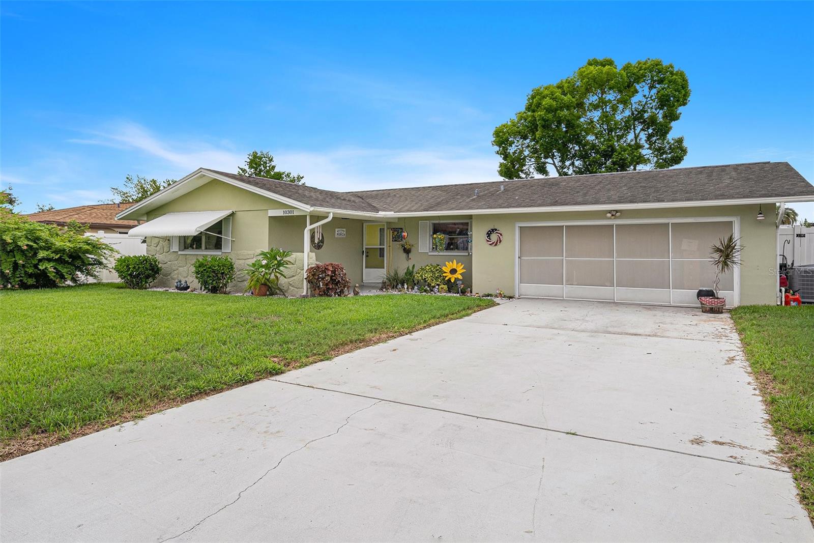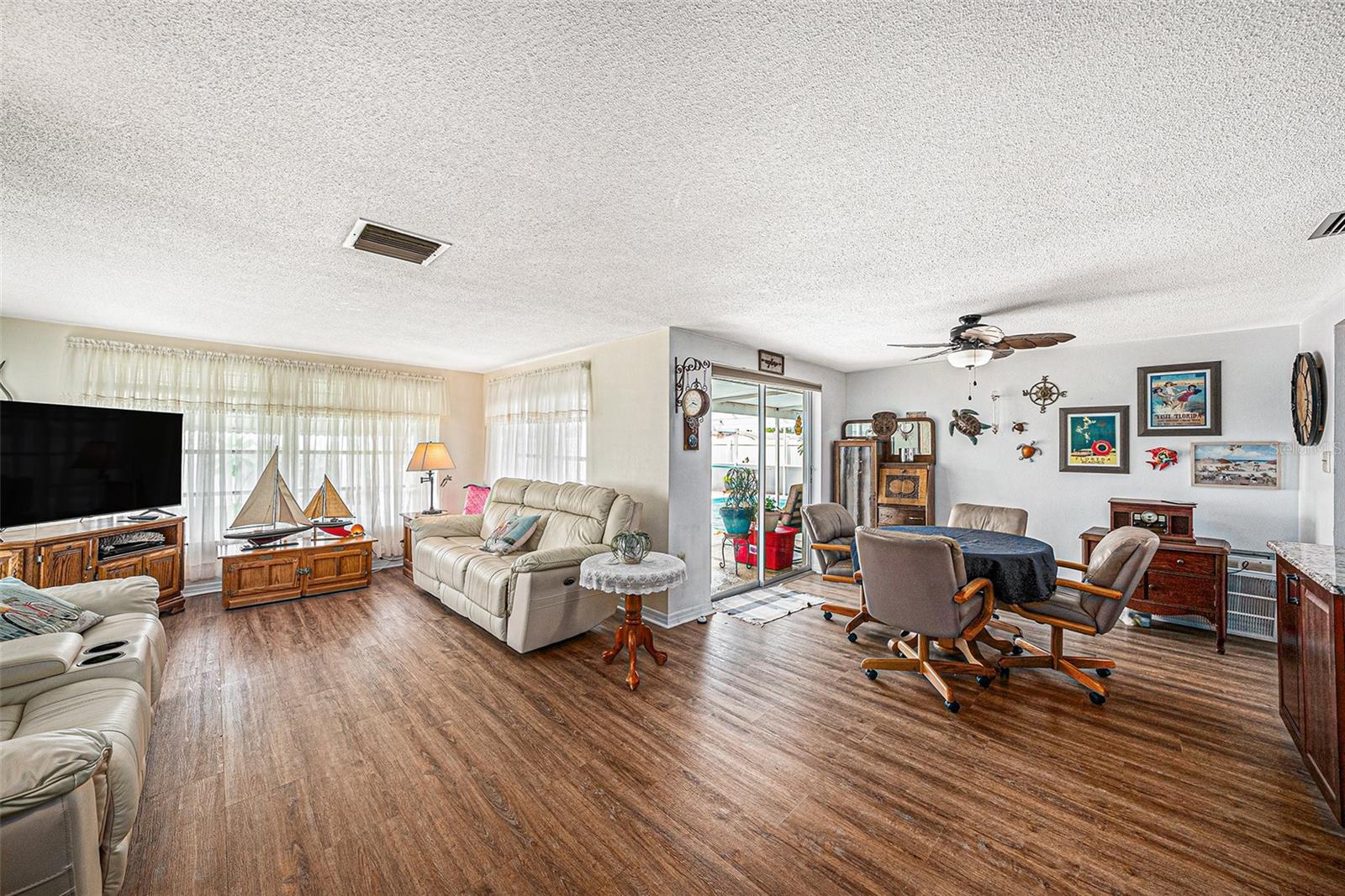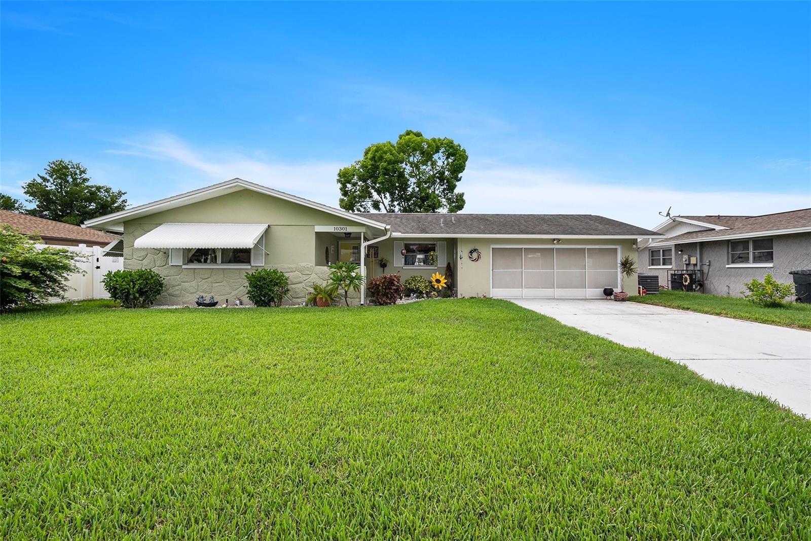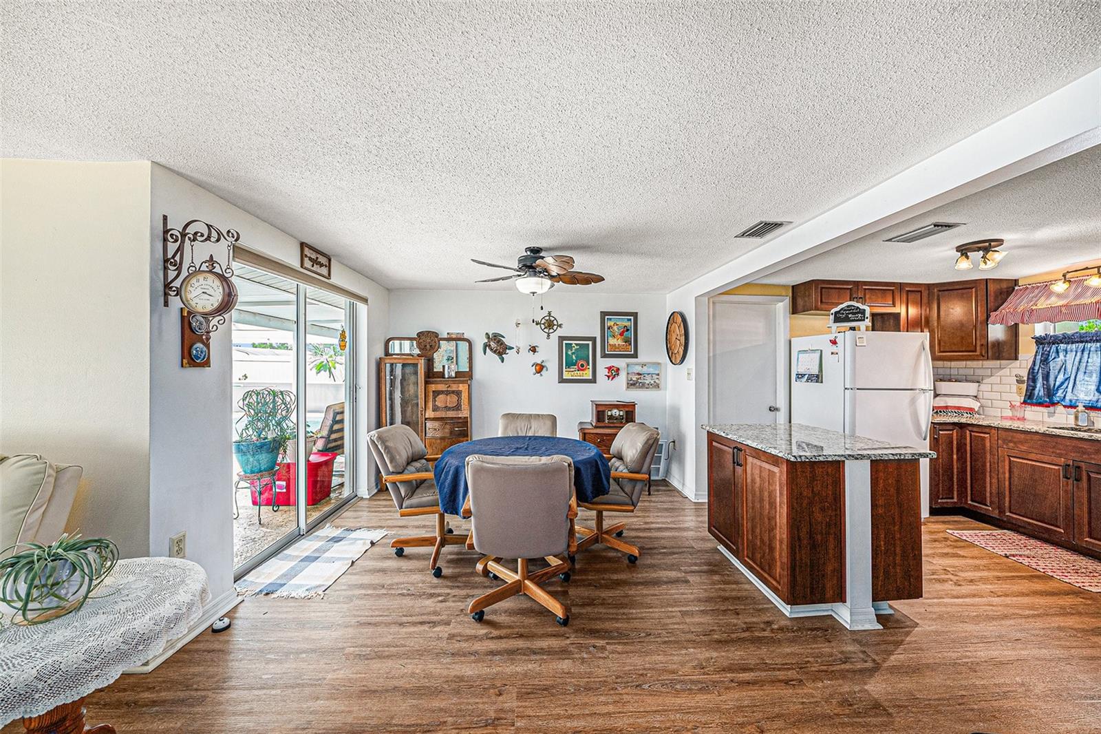 Welcome to your dream retreat in a serene, HOA-free neighborhood! This beautifully updated two-bedroom, two-bath home features a spacious open-concept living area where the modern kitchen seamlessly flows into the inviting living room. Enjoy the luxury of brand-new flooring and contemporary kitchen finishes while overlooking your sparkling caged pool, perfect for relaxing or entertaining year-round. The fenced yard offers privacy and security. Unique to this property is the oversized garage that includes a conveniently located second bath. This clever addition ensures that guests can access a restroom without having to enter the main home, making it perfect for pool parties and gatherings. With its blend of practical upgrades and stylish living spaces, this home is a rare find that combines convenience, comfort, and charm in a peaceful setting.