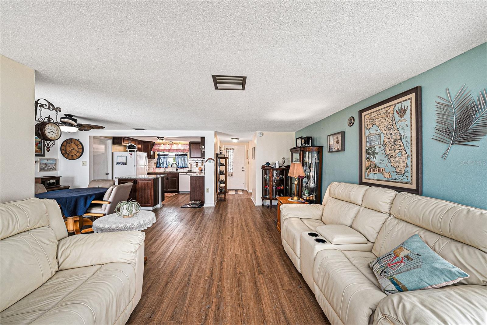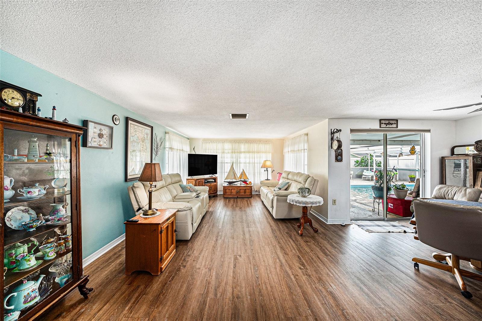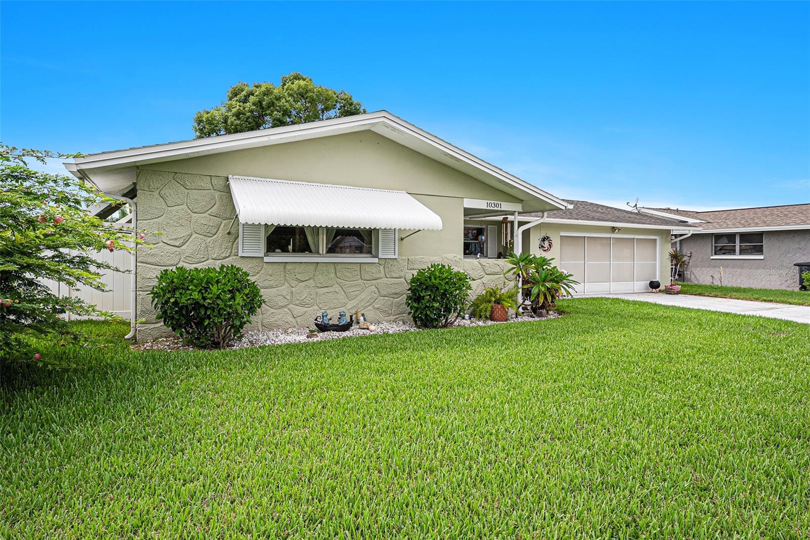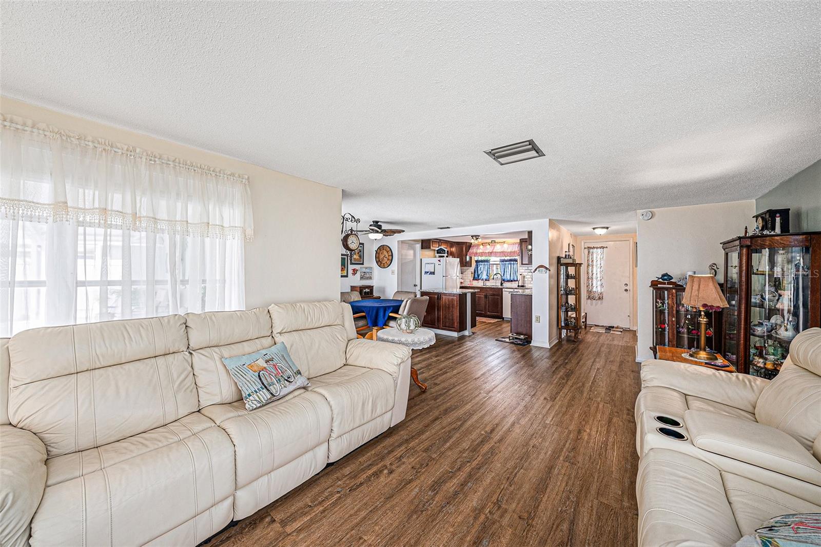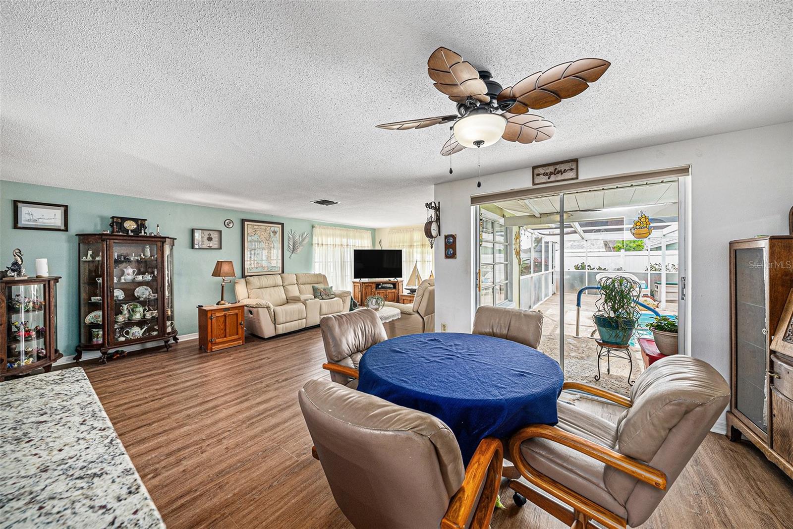 Welcome to your dream retreat in a serene, HOA-free neighborhood! This beautifully updated two-bedroom, two-bath home features a spacious open-concept living area where the modern kitchen seamlessly flows into the inviting living room. Enjoy the luxury of brand-new flooring and contemporary kitchen finishes while overlooking your sparkling caged pool, perfect for relaxing or entertaining year-round. The fenced yard offers privacy and security. Unique to this property is the oversized garage that includes a conveniently located second bath. This clever addition ensures that guests can access a restroom without having to enter the main home, making it perfect for pool parties and gatherings. With its blend of practical upgrades and stylish living spaces, this home is a rare find that combines convenience, comfort, and charm in a peaceful setting.