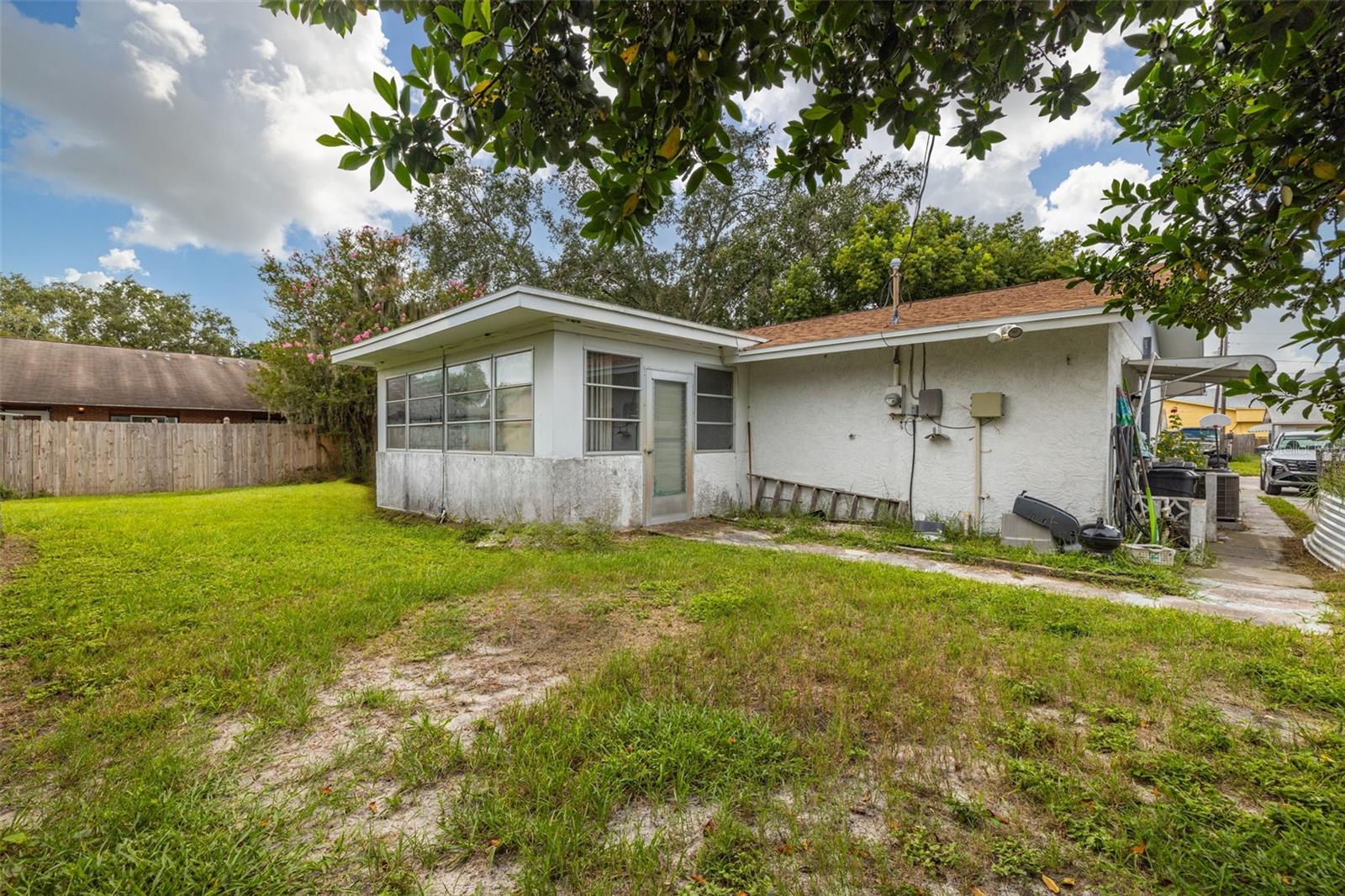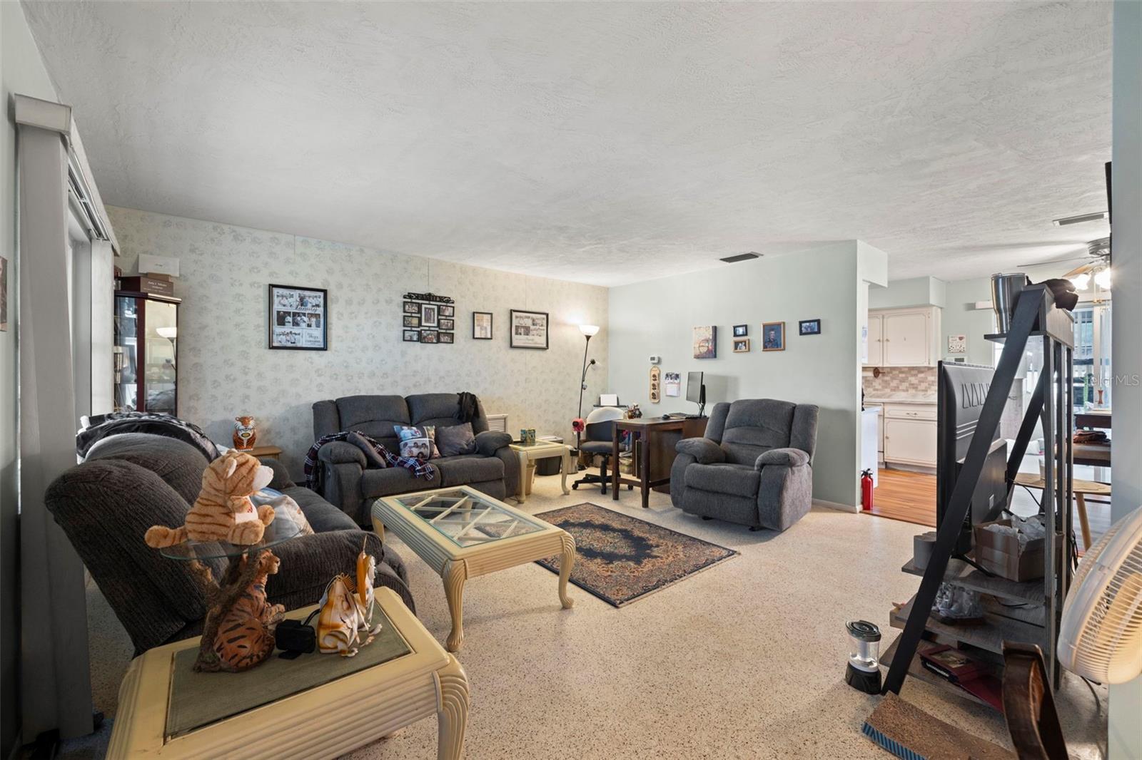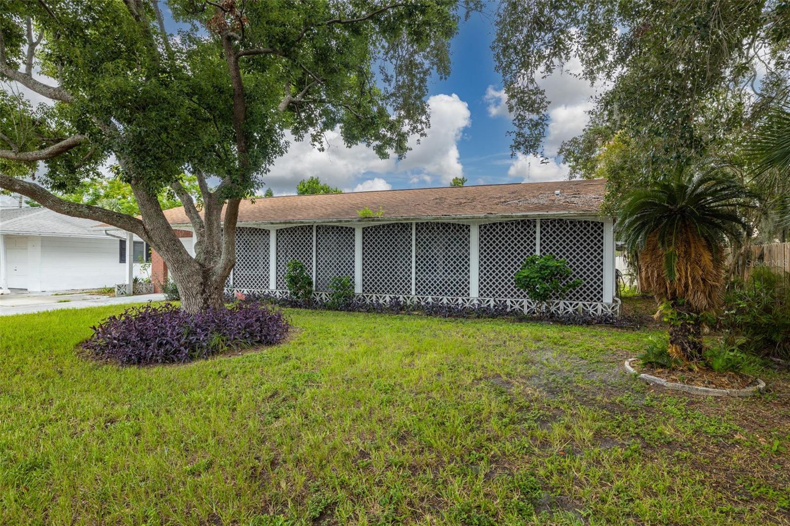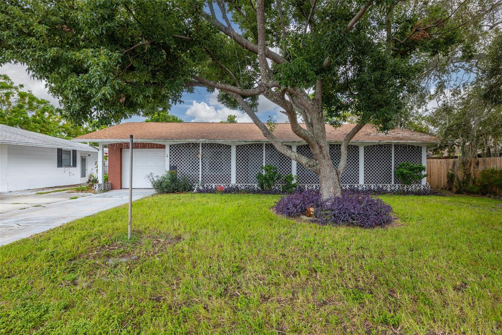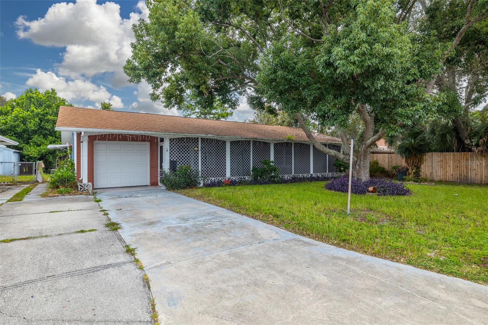 Cute 2 Bedrooms, 2 Bathrooms, 1 Car Garage, Plus Large Bonus Room Home is Move In Ready! Double Front Doors enter into Living Room with Terrazzo Flooring. Kitchen is spacious with a lot of Counter Tops & Cabinets and Open to the Dining Area. Sliders lead to Bonus Room / Lanai. Primary Bedroom has ensuite Bathroom & Walk In Closet. Additional Bedroom and Bathroom with Tub. Located at the end of the street with a Large Fenced Back Yard. Roof installed in 2018. No Flood Zone & No HOA. Short drive to Restaurants, Shopping, Parks, & Hudson Beach. This Is Paradise!