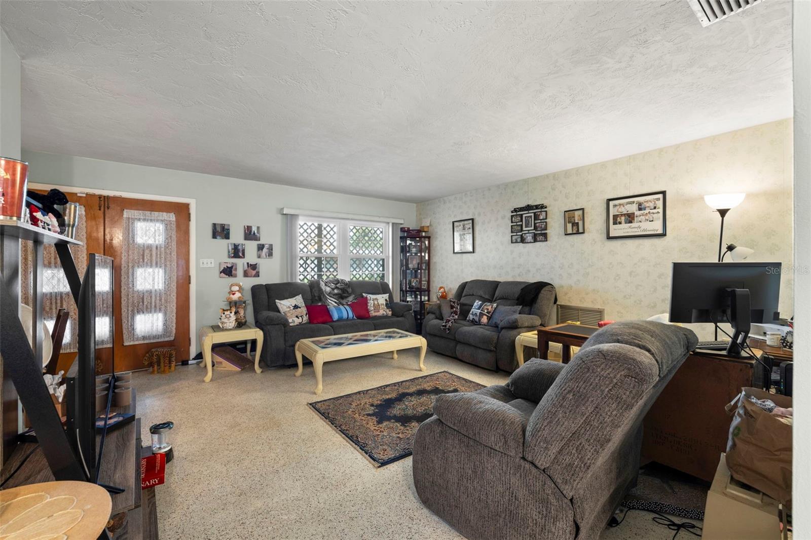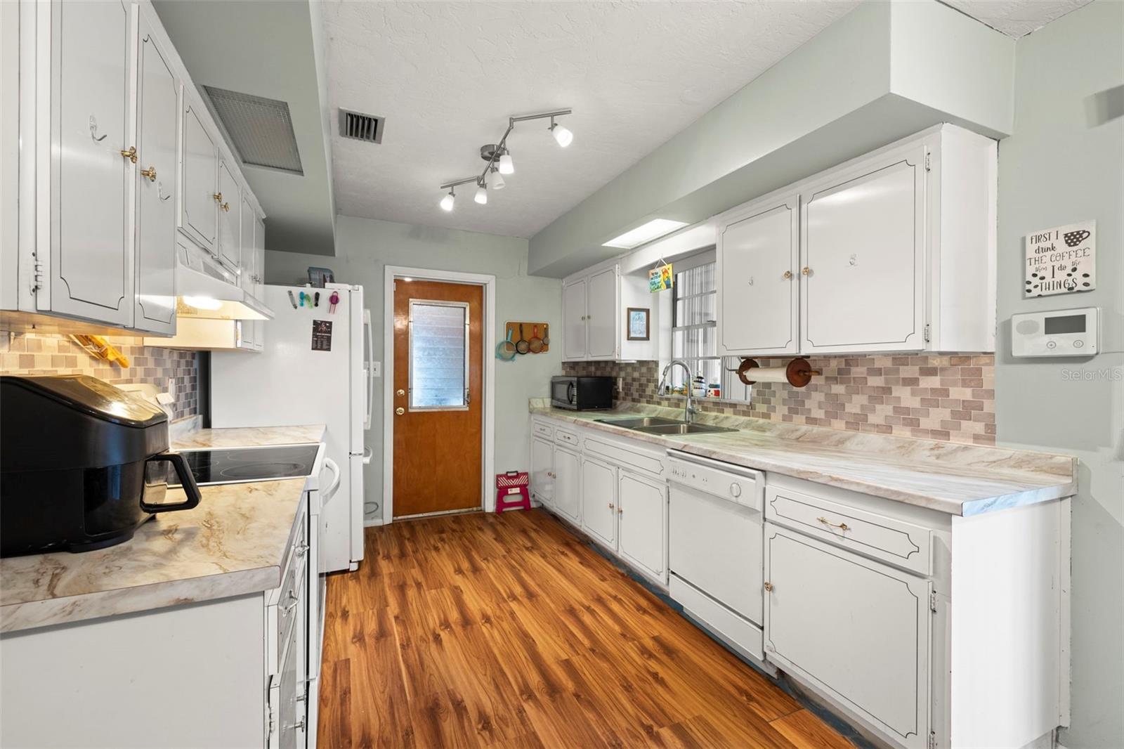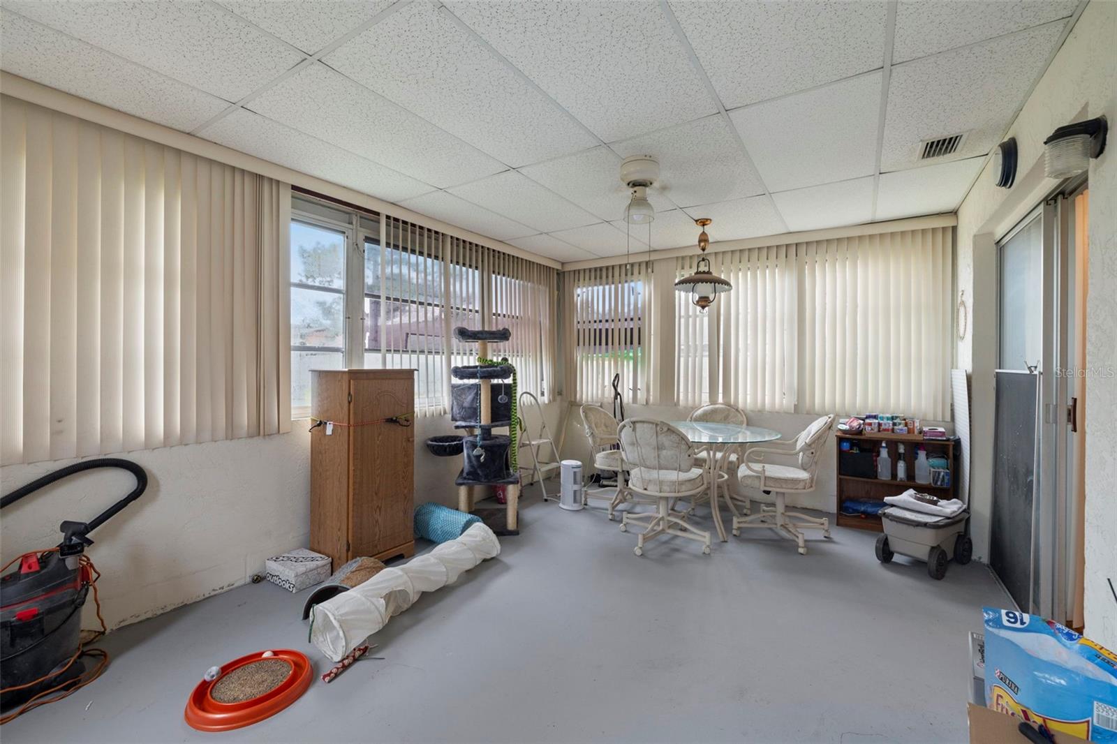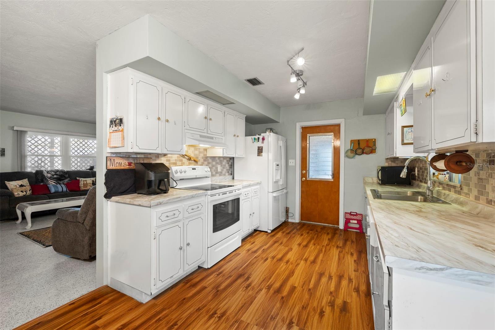 Cute 2 Bedrooms, 2 Bathrooms, 1 Car Garage, Plus Large Bonus Room Home is Move In Ready! Double Front Doors enter into Living Room with Terrazzo Flooring. Kitchen is spacious with a lot of Counter Tops & Cabinets and Open to the Dining Area. Sliders lead to Bonus Room / Lanai. Primary Bedroom has ensuite Bathroom & Walk In Closet. Additional Bedroom and Bathroom with Tub. Located at the end of the street with a Large Fenced Back Yard. Roof installed in 2018. No Flood Zone & No HOA. Short drive to Restaurants, Shopping, Parks, & Hudson Beach. This Is Paradise!