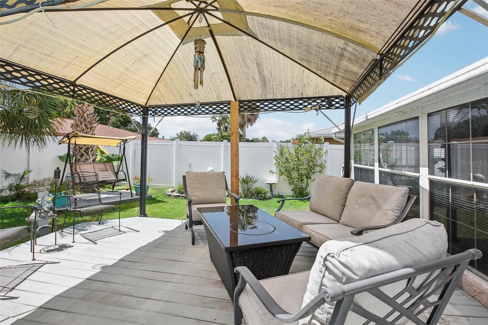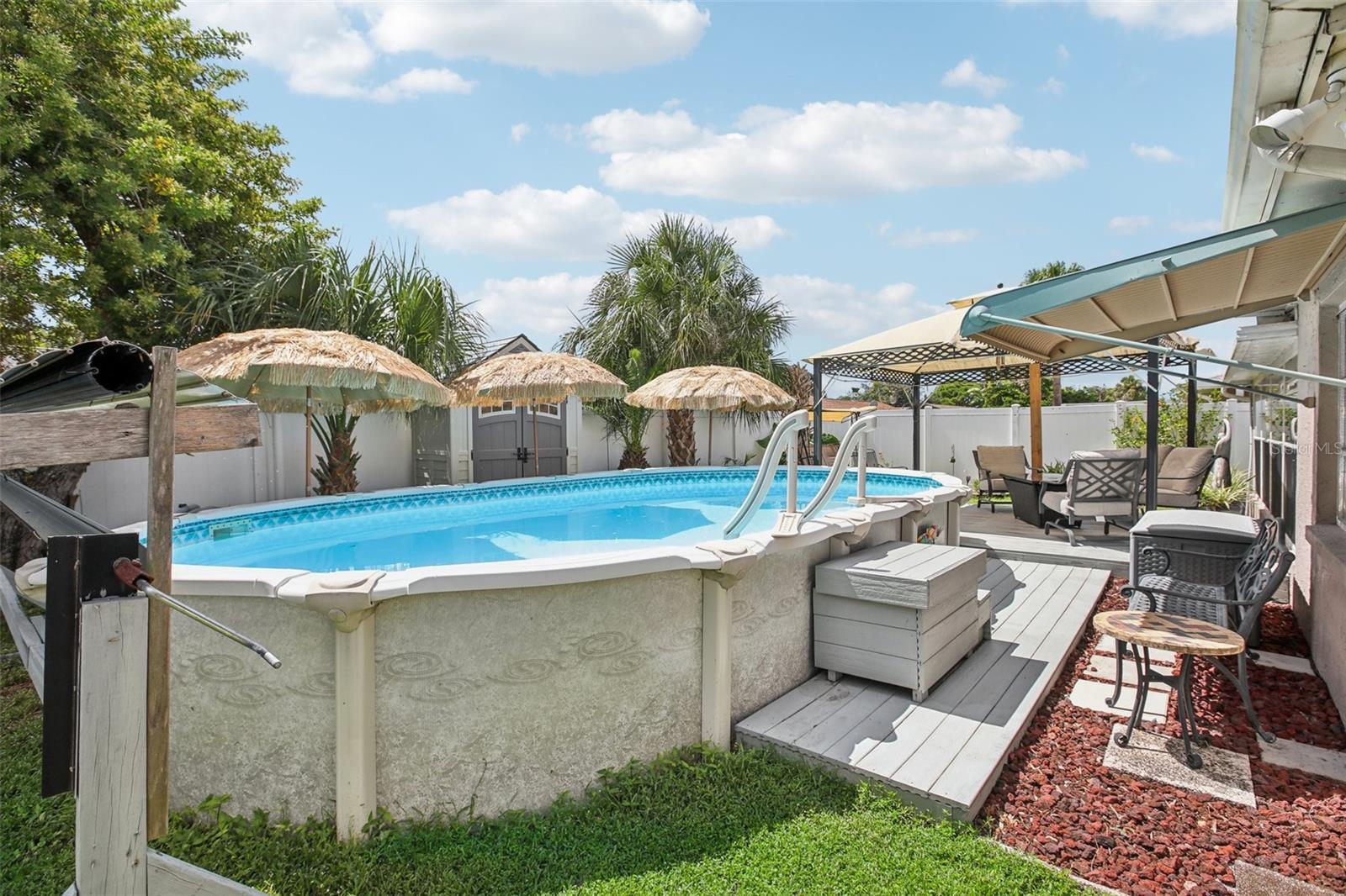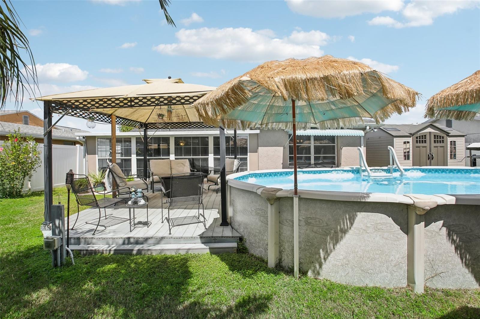 Welcome to 6124 Seabreeze Dr, just steps away from the water and situated within West Port in Port Richey, FL. This beautifully updated 3-bedroom, 1.5-bath residence boasts a perfect blend of comfort and modern living with nearly 1400SF of living space. As you step inside, you'll be greeted by a spacious layout featuring stunning ceramic wood tile throughout the kitchen, dining room, and family room, enhancing both style and durability. The kitchen is a chef’s delight, complete with stainless steel appliances, elegant granite countertops, and a chic tile backsplash. Retreat to any of the cozy bedrooms which are adorned with laminate flooring, nice size closets, and lots of natural light. Enjoy your morning coffee or unwind in the evening on the private enclosed porch, equipped with a new wall A/C unit to keep you cool during warmer months. Perhaps, you prefer to unwind in the evening in your spa located within the enclosed patio or soak in the outdoor space, which is an entertainer's paradise! Dive into relaxation with an above-ground pool and unwind on the covered deck, perfect for your patio furniture and gatherings. Two storage sheds offer ample space for all your outdoor essentials. Additional features and upgrades include: Newer Electrical Panel, Roof, HVAC, and Water Heater. Conveniently located close to restaurants, shops, beaches, parks, and major medical centers, this gem offers the perfect lifestyle without the burden of CDD or HOA fees. Don’t miss this opportunity to make this charming home yours—schedule a showing today!