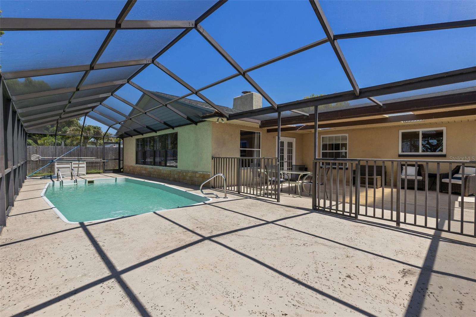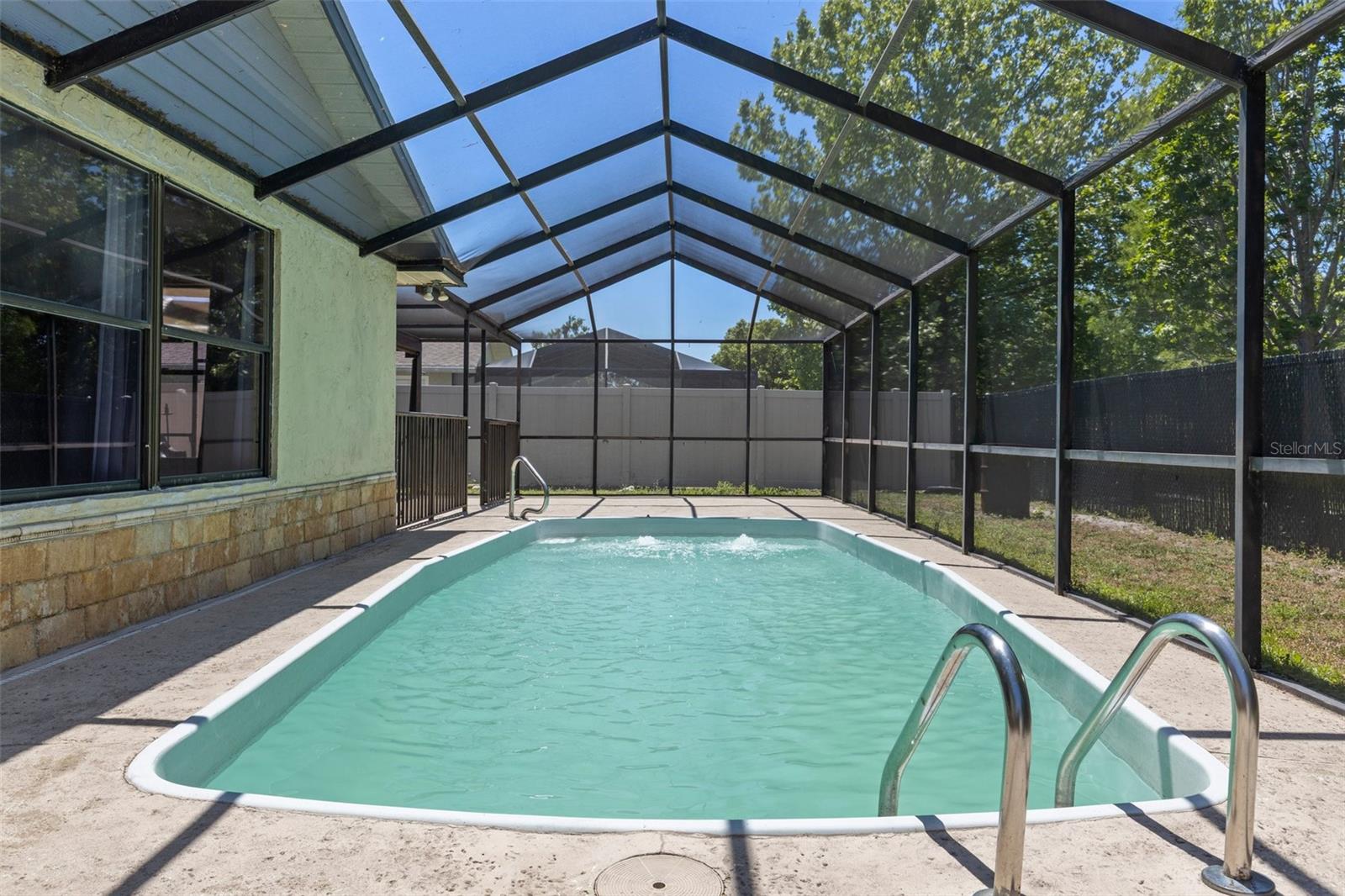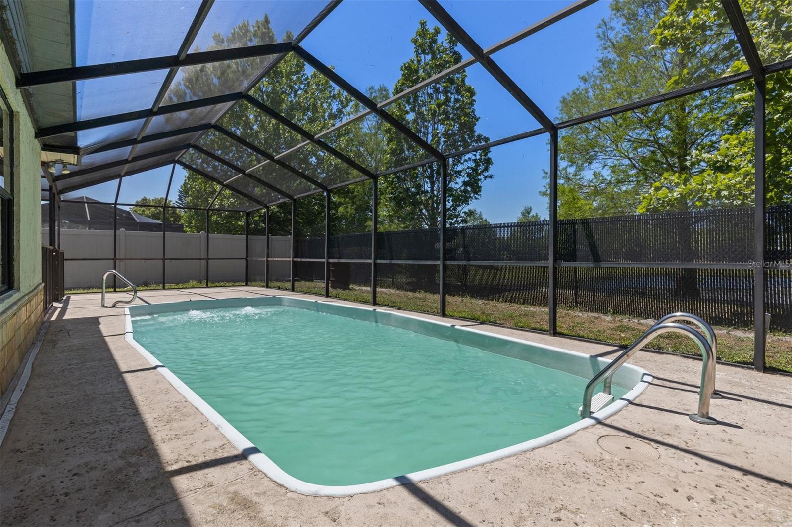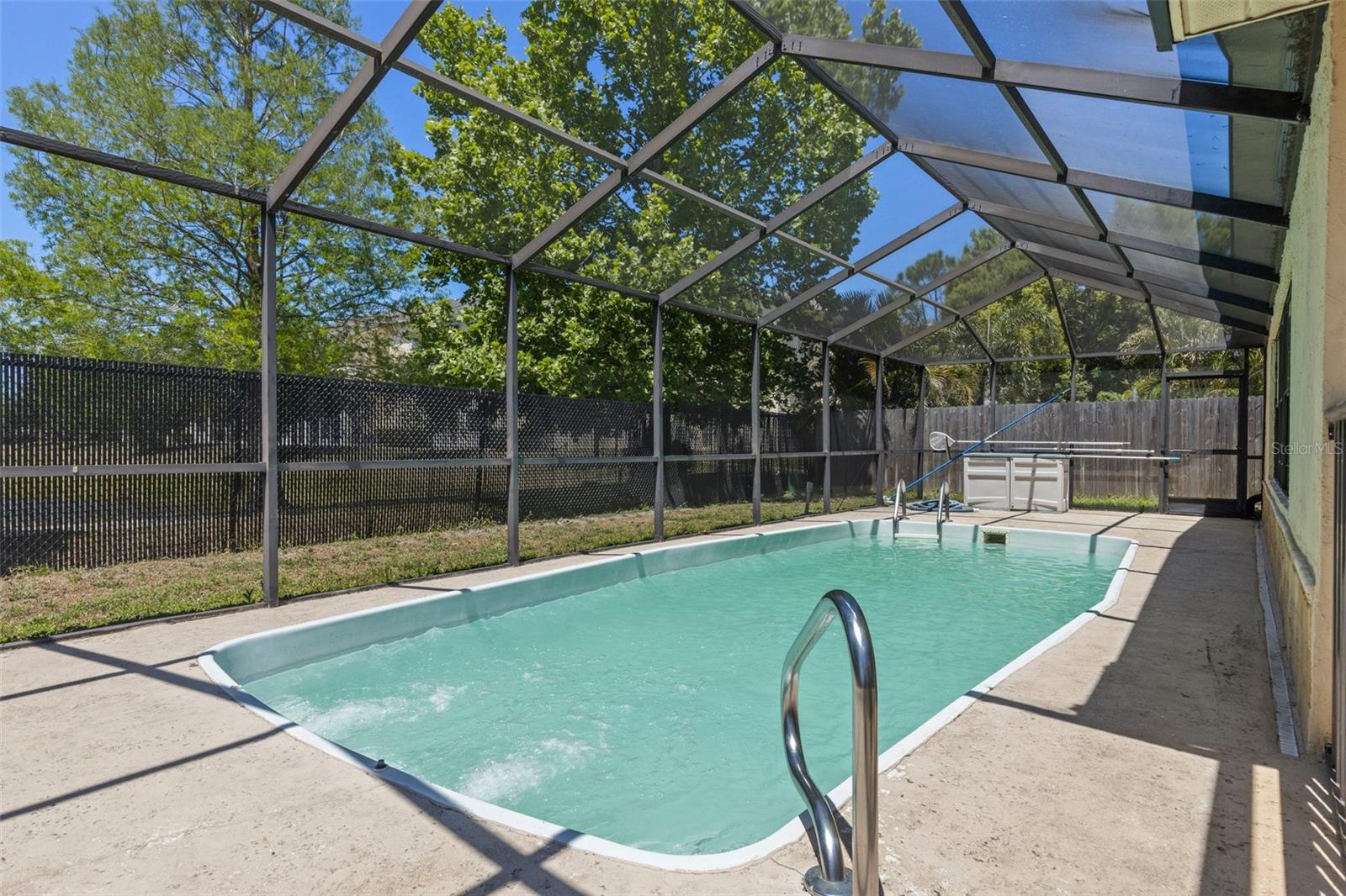 Under contract-accepting backup offers. Spacious Pool Home! This home is an absolute gem. Large, spacious rooms with an abundance of natural light. The light filled living room with electric fireplace opens up to an enormous screened in patio with a beautiful sparkling swimming pool. The huge kitchen is made for large gatherings with an abundance of cabinet and counterspace. The large dining room has a lovely stone wood burning fireplace. The primary bedroom has an updated en-suite bathroom with double vanities. There are 3 additional bedrooms and 2 additional full bathrooms. Storage is not an issue in this home with a large garage and an indoor laundry room. The fenced backyard backs up to a pond so lots of privacy with no backyard neighbors. NO HOA or CDD required. NO flood insurance required. Schedule your showing today to see this lovely home.