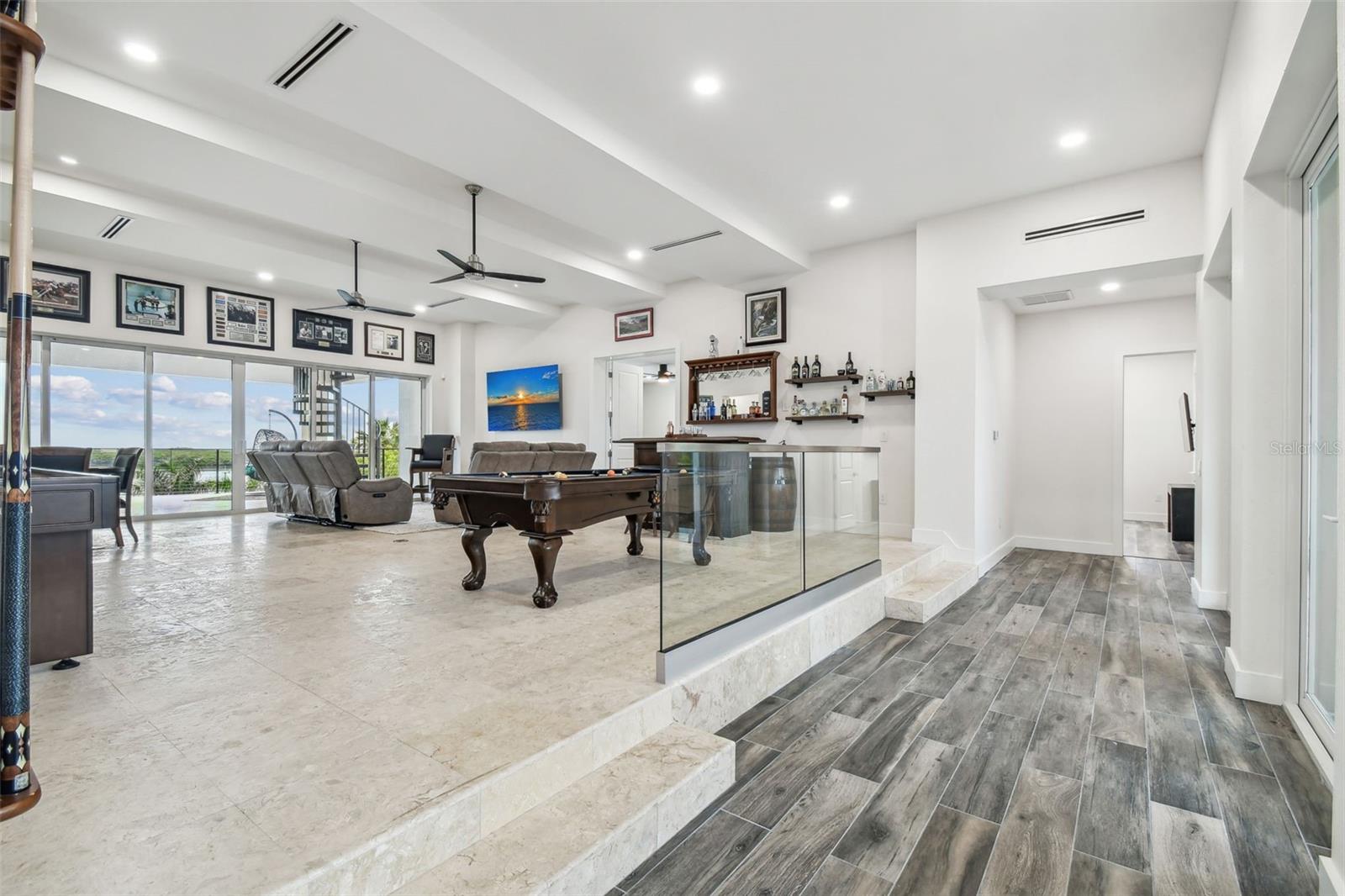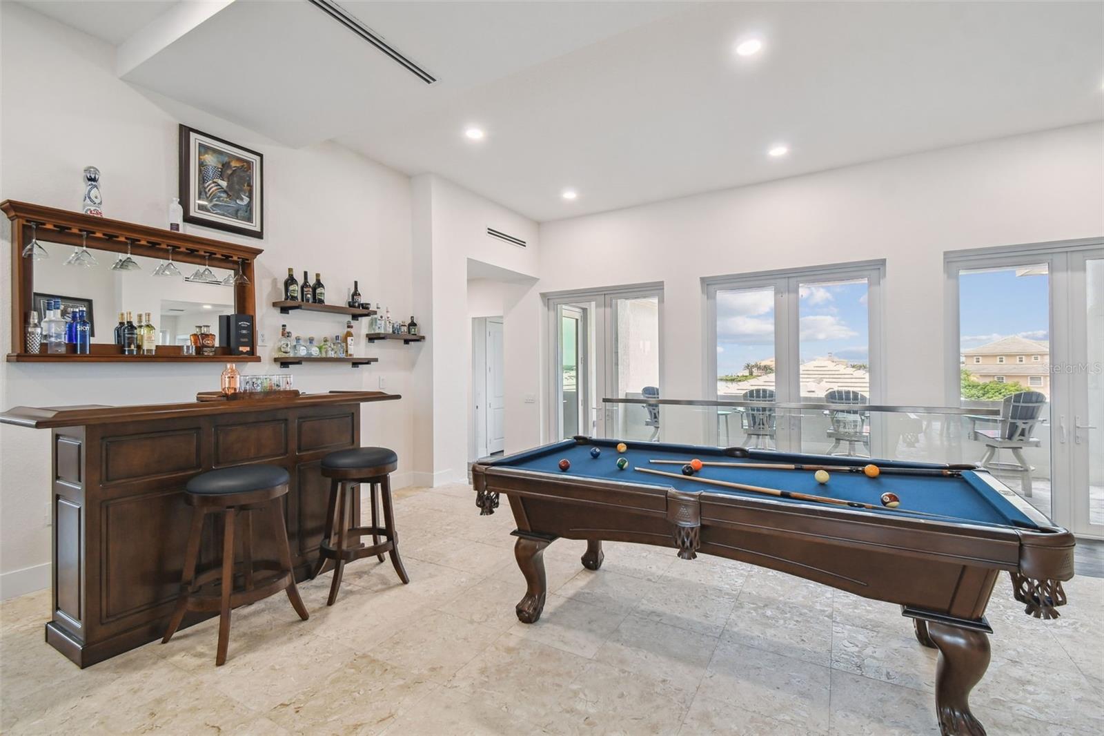 Welcome to coastal living at its finest. Tucked in a private, double-gated community on the stunning shores of the Gulf of Mexico, this one-of-a-kind, 3-story modern concrete estate offers unmatched strength, elegance, and serenity. Thoughtfully constructed with enduring concrete block slab, walls, floor, this home is as solid as it is spectacularly designed to withstand time and elements while delivering a lifestyle of elevated comfort and peace of mind. From the moment you arrive, the grand circular driveway, framed by a tranquil koi pond and towering architectural presence, sets a tone of sophistication and permanence. This home was built to impress and built to last. Inside, a private elevator effortlessly connects all three floors, blending everyday ease with luxury. The main living area is anchored by a stunning great room, where a dramatic Versace marble accent wall features an inset fireplace, creating a bold yet refined focal point. This elegant space is complemented by uninterrupted water views framed through expansive 10-foot sliding glass doors that span the entire second level, seamlessly merging indoor and outdoor living. Also on the second level, the primary suite is a retreat, featuring an elegantly tiled accent wall with an inset fireplace, adding warmth and ambiance to the already serene space. Sweeping Gulf views pour in through 10-foot sliding glass doors, filling the room with natural light. The spa-inspired en-suite bath, wrapped in exotic stone, offers a luxurious double shower with multiple showerheads on both sides, dual rainfall fixtures, and an oversized jetted soaking tub an indulgent sanctuary designed for ultimate relaxation. Go outside onto a one-of-a-kind walkway bridge that gracefully spans over the saltwater pool and spa, connecting the second level to the beautifully landscaped backyard. This resort-style design feature enhances the indoor-outdoor flow while offering breathtaking views of cascading water and lush tropical surroundings. Upstairs on the third floor, you'll find five generously sized guest bedrooms, three full baths, a waterfront fitness room, and a spacious bar and game room arranged for entertaining and unwinding. At day’s end, retreat to the private rooftop lookout to take in the panoramic Gulf views and unforgettable sunsets. For car collectors and enthusiasts, the garage offers space for up to eight vehicles and includes a rare professional-grade oil change and mechanic’s pit. A whole-home Generac generator ensures full power during any storm or outage, adding another layer of comfort and confidence. From its concrete construction and hurricane-ready design to its refined finishes and Gulf-front setting, this exceptional estate offers the best of coastal living, delivering beauty and resilience in equal measures.