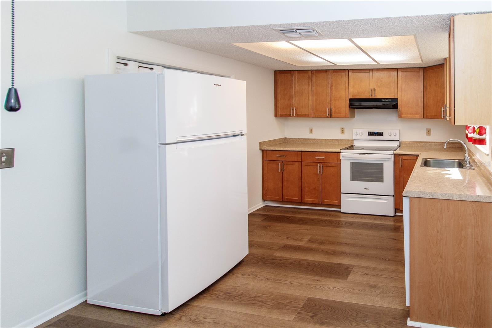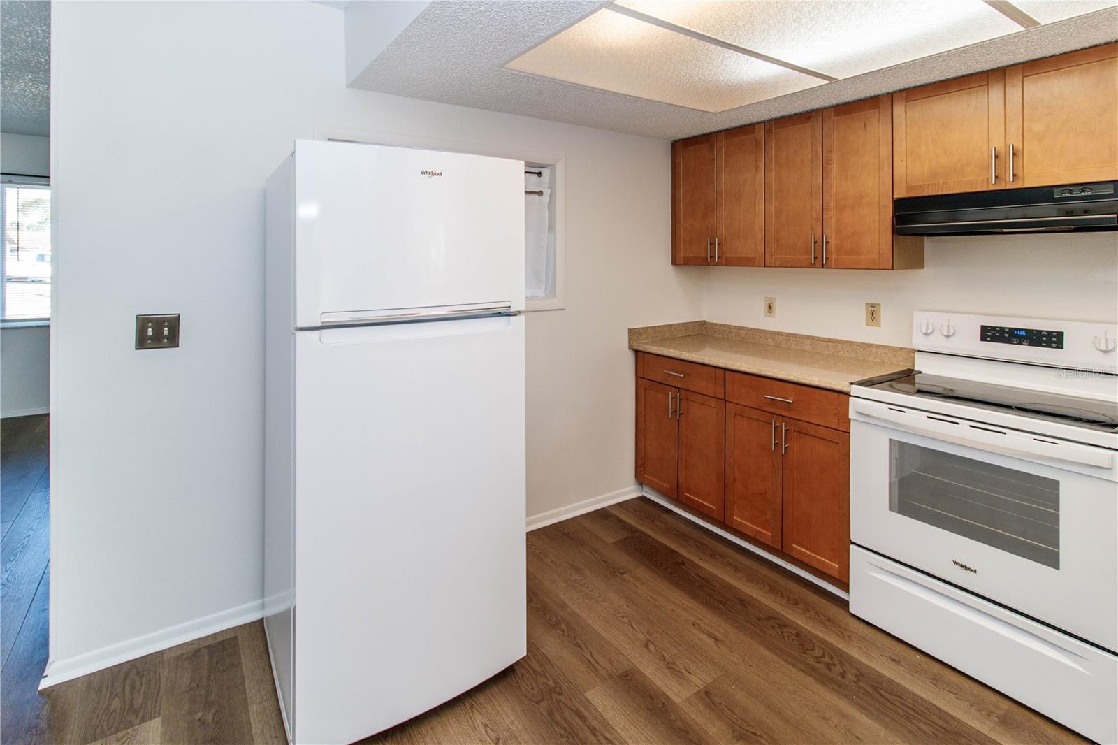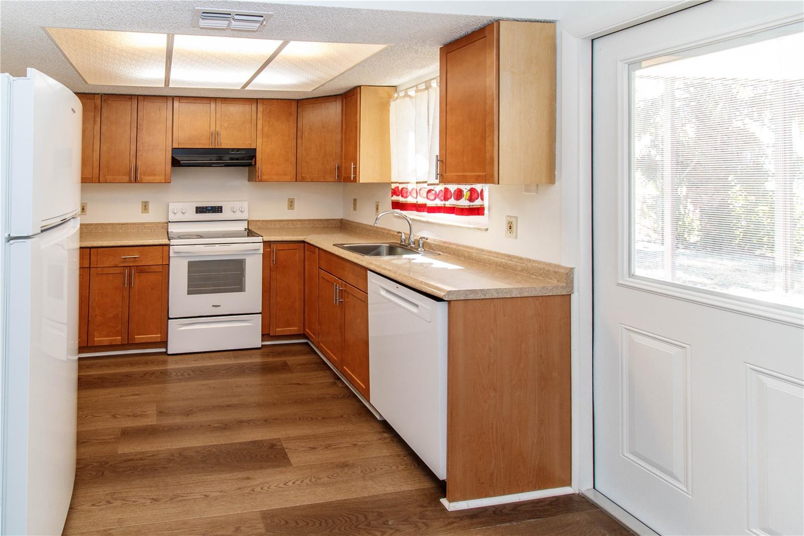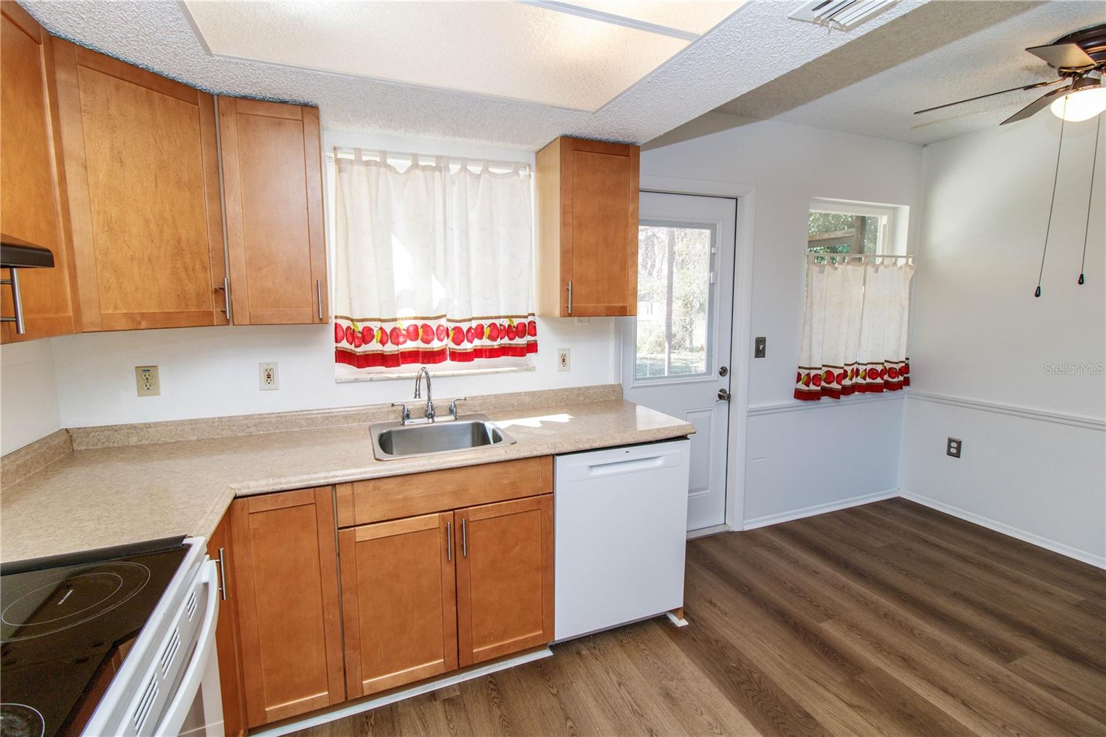Absolutely beautiful home with nothing to do but unpack. This wonderful home in Bear Creek features updated luxury vinyl flooring in main living areas. Open layout, nice sized kitchen overlooking an amazing fenced back yard with plenty of room for a pool, swing set, or just room for children to play with lots of shade....covered lanai perfect for entertaining, grilling, or just relaxing. This move in ready home features 2 bedrooms, completely updated bathroom with a tiled walk in shower, kitchen with counter space any chef would love, kitchen also has updated cabinets and a dishwasher as well as plenty of room for a table, all appliances new in 2025. Newer double pane vinyl frame windows throughout home, including hurricane shutters. One car garage attached with new garage door and opener in 2025, washer and dryer included. Home interior was recently painted. Come view this wonderful home that the owners have taken the utmost care of to ensure you years of happiness!