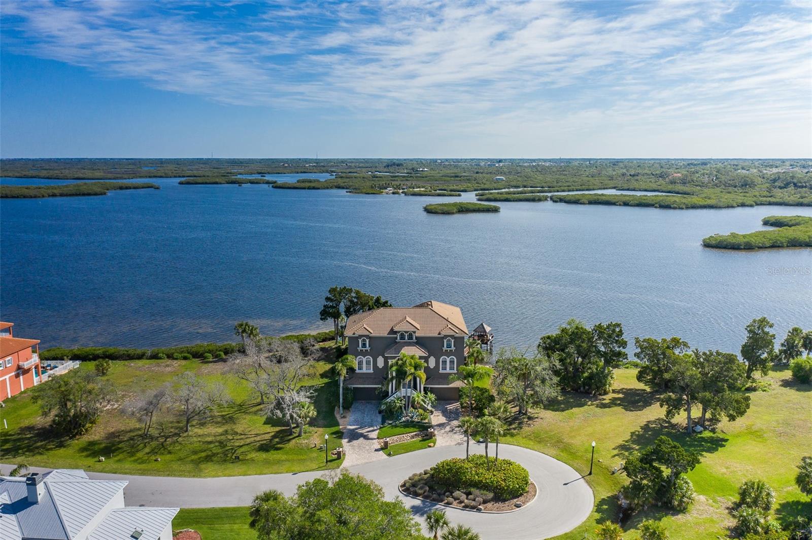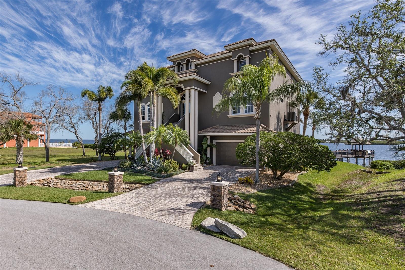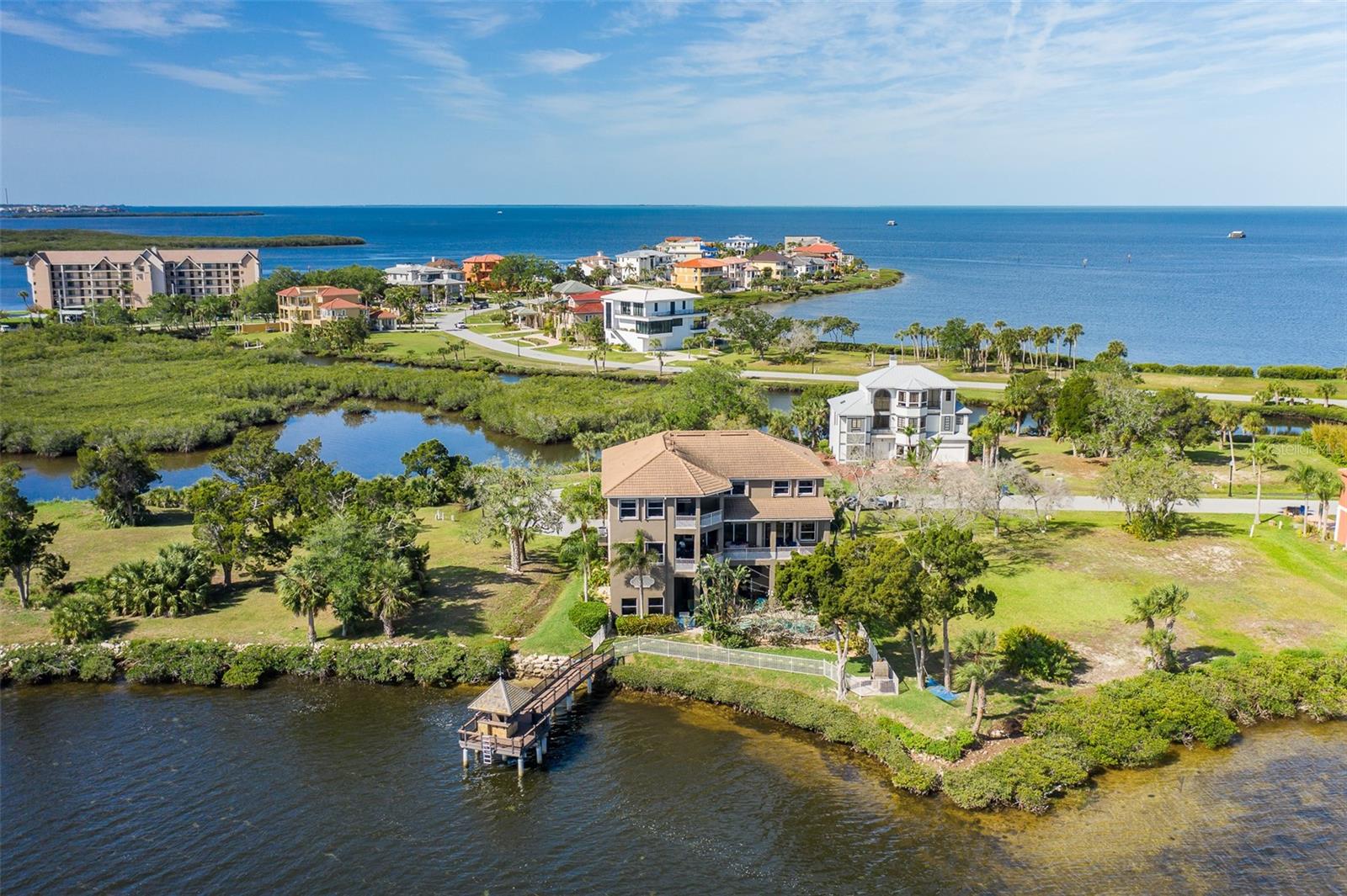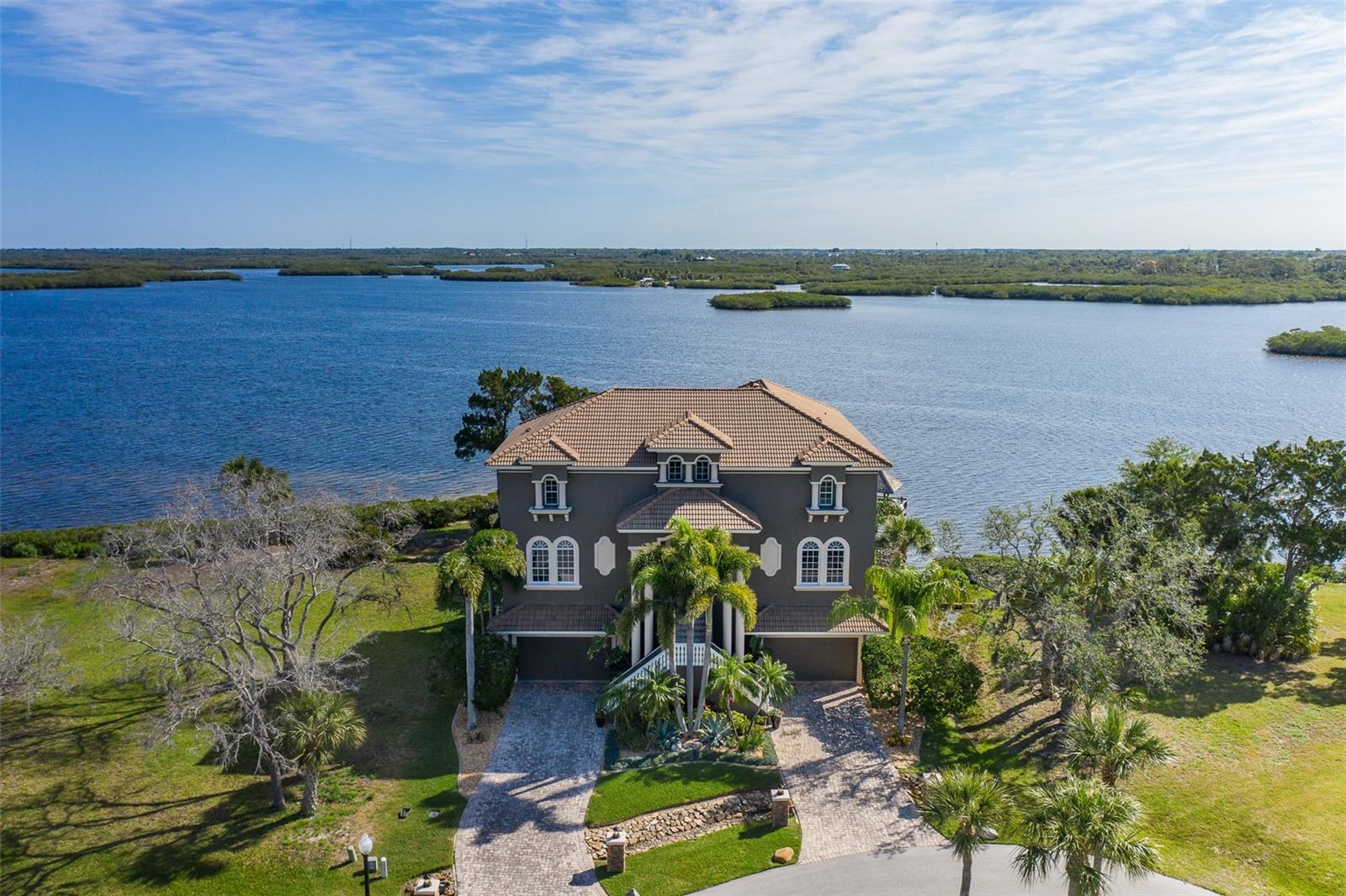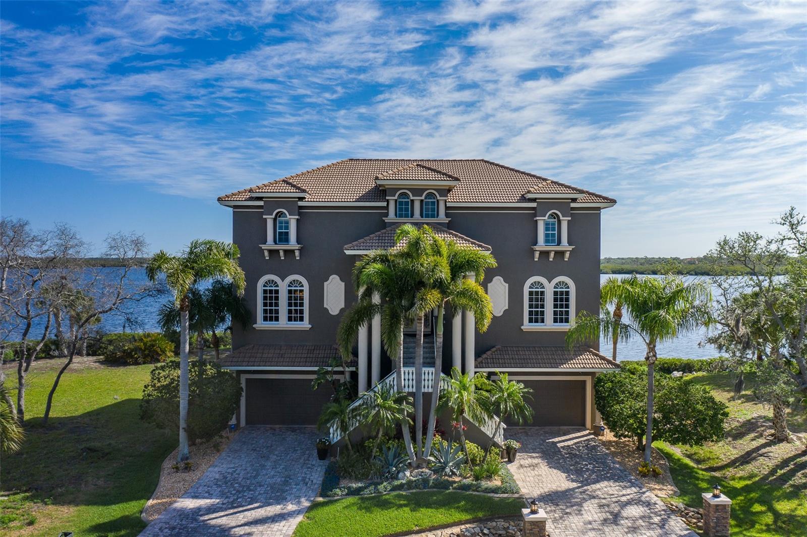 REDUCED!! LIVE THE ULTIMATE SALT LIFE IN THIS GULF FRONT DREAM HOME IN DOUBLE GATED HARBORPOINTE! Enjoy the sweeping water views and the easy access DIRECT TO THE GULF from this elegant, waterfront home located in the double gated community of Harborpointe. Built to meticulous standards, this home is concrete block construction on all 3 levels from slab to roof and the list of extra features is extensive: 3 STOP ELEVATOR, sauna, climate controlled 800 bottle walk-in wine cellar, walk-in cigar humidor, central vacuum system, and a garage that will accommodate 7 vehicles, PLUS a separate storage room and another room ideal for a home gym or workshop/hobby space. Enter this home through double doors and step into the grand family room with finished in place hardwood floors, 23 foot ceilings, crown molding, a gas fireplace, a wet bar and glass doors leading to the balcony with gorgeous WIDE WATER VIEWS for as far as the the eye can see. The kitchen is appointed with wood cabinets, granite countertops, double wall ovens and a warming drawer. A generous sized dining room provides an ideal space for entertaining and the formal living room is yet another space to take in the exceptional water views. The grand, curved staircase leads up to the second level which is open to the first floor and features 2 additional bedrooms PLUS the luxurious master suite AND a separate, private den/office. The master suite has a gas fireplace, a private balcony with STUNNING Gulf views, and a wonderful spa-like bathroom complete with a jetted tub, a walk-in sauna, spacious closets with built in organizers and an oversized shower. When it's time to relax and unwind head outside to the gas heated POOL and SPA WITH WATERFALL, which is surrounded by lush foliage and offers privacy and more views of the water. There is an outdoor kitchen and a poolside gas fire pit and an observation deck and tiki hut that extends out over the water. A community marina provides an assigned boat slip #22 with a lift which will accommodate up to a 34 ft boat. Come enjoy the WATERFRONT LIFESTYLE with every possible comfort in place. This home has been meticulously maintained with many upgrades thoughtfully constructed with no detail overlooked. Soothing colors, neutral decor and plenty of natural light, this home is a must see! Upgrades: *New Stone sinks in Master Bedroom *New faucets in polished bronze *New cabinet hardware in polished bronze (hinges, pulls, and handles) *2 new a/c units *New gas hot water heater *New ceiling fans in all bedrooms, tiki hut, balconies and pool area *Pool converted to salt water *New aqualink installed for remote pool operation *New polaris pool cleaner *New pool fire feature and pool valves *New fireplace in family room *new touches faucet in kitchen and new faucets at each utility sink location *completely revamped tiki hut with new added structural support, custom railings, resin decking, underwater lighting, water, electric ladder and tv *New ADT alarm system with smoke detection *New Ring camera doorbell and at boat slip in Marina *upgraded landscaping and added stone as well as boulders installed along shoreline *New stainless steel grills (2) and upgraded outdoor kitchen on second level with grill, sink. electric hood vent with lighting *new landscape lighting with remote operation *tesla charging station *New added A/C vents installed on upper level *New ice makers and wine chillers
