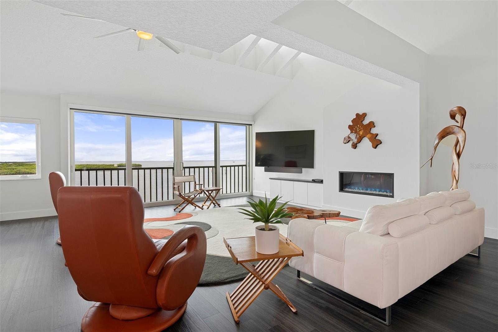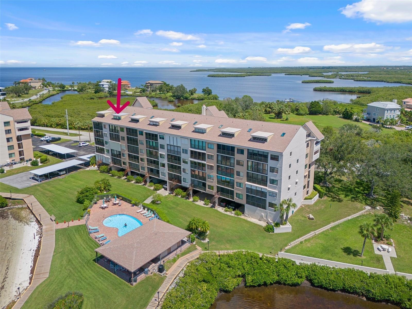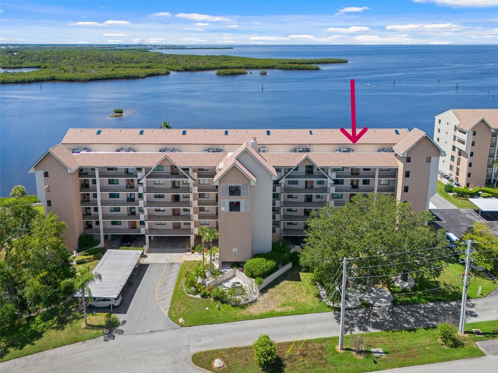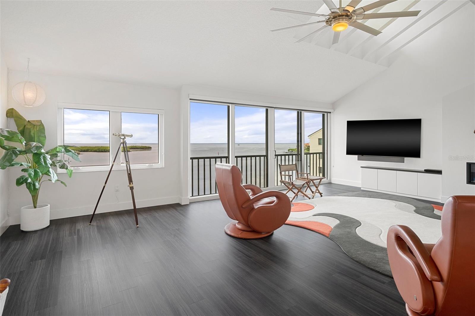 AMAZING, TWO STORY, PENTHOUSE condo with direct waterfront view of the Gulf of Mexico. There are only EIGHT units in all of Sand Pebble that boast this floor plan- and they don't come on the market very often. Don't miss this opportunity! The interior of this spacious unit is truly breathtaking. The kitchen has been updated with white cabinets, stainless appliances, island, built in pantry and extra storage. 25" TV . The main living area offers very high vaulted ceilings. This great room has a built in electric fireplace, 75" TV, built in display cabinets with windows and sliders providing a panoramic view of the waterfront. Sun shades on window and sliding doors, dormer windows have black out shades operable with remote. In the front of the condo is the large guest bedroom with deep closet and plantation shutters, the guest bath with new vanity, new toilet and Tub/Shower. Off of the great room there is a 1/2 bath with laundry closet. This 1/2 bath has a new vanity and new toilet. Just up the spiral staircase you will find the very large master bedroom/loft with view of the Gulf of Mexico through dormer windows and access to a large master bath with jetted tub, his/her new vanities and large WIC shower. Mirrors open as medicine chests. Skylight in master loft and master bath provide extra natural light. UPDATES: AC 2009 per Owner, Range 2017, Hot water heater 2020, Water softener 2020, Dishwasher 2020, Microwave 2021, Refrigerator 2024, All new Weather Tight windows throughout and new sliders (impact resistant). Luxury Vinyl Plank flooring throughout. Knock down texture on ceiling throughout (no popcorn). One reserved parking space under the building #57 and one reserved storage locker #57. Community offers 24 hr manned gate, waterfront boardwalk, private beach, waterfront pool, fishing pier, boat ramp, clubhouse with game tables, fitness and library, Tennis, Pickleball and Putting green! Close to all conveniences: shopping, waterfront dining, medical, historic downtown New Port Richey (restaurants, nightclubs, live theatre, shopping, The Hacienda Hotel, Simms Park-with seasonal festivals and activities). Approx 20 min to Tarpon Sponge Docks, Fred Howard Park, The Aquarium, Freedom boat club, Approx 40 minutes to Caladesi Island and Honeymoon Island and downtown Dunedin, and Approx 60 min to famous Clearwater Beach and Tampa. Tampa offers an international airport, international cruise port, sports arenas, theme parks, live theatre, fine dining, Ybor city and so much more! Over 1800 sq feet of direct GULF front condo living is VERY hard to find at this price - call today!! ***The documented heated sq feet includes area of lanai that has been enclosed, enlarging the great room*** Furnishings are Optional- price negotiable. Few items do not convey- listed in Realtor Only Remarks. NO PETS. NOT AGE RESTRICED. 40 ft RV/BOAT carport with 8 x 10 shed available for separate purchase (after seller offers to current owners x 2 week waiting period), 22 ft Boston Whaler center console available for purchase. **OWNER WILL PAY ASSESSMENT AT CLOSING OR ESCROW FUNDS- SEE REALTOR ONLY REMARKS.