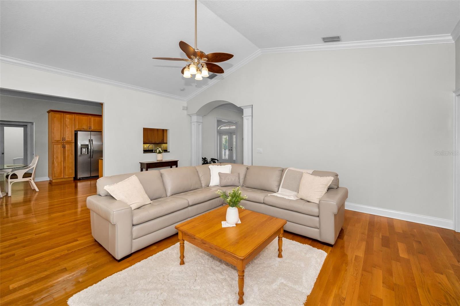 Welcome to this stunning elevated 3 BR, 2.5 bath home in Port Richey, FL, offering both elegance and comfort. The home’s impressive curb appeal includes a wide front porch and a circular driveway, providing ample parking and a welcoming entrance. Step into the foyer, where you’ll be greeted by beautiful wood floors and crown molding that add a touch of sophistication throughout the home. Off the foyer, you’ll find a versatile office/flex space, perfect for a home office, reading nook, or playroom—tailored to fit your needs. The open floor plan enhances the spacious feel while vaulted ceilings and large windows provide abundant natural light, creating a bright and airy atmosphere. The French doors from the great room lead to the screened-in Florida room, where you can relax and enjoy the serene views of the backyard. The Florida room opens onto a deck, offering a wonderful space for outdoor living and entertaining. The kitchen features wood cabinetry, quartz countertops, stainless steel appliances, and staggered cabinet heights. The eating area in the kitchen is perfect for casual meals, while the formal dining room provides an elegant setting for special occasions. Throughout the home, crown molding adds a polished, cohesive look. The home boasts a split floor plan, with the spacious primary suite thoughtfully separated from the guest bedrooms, providing privacy and tranquility. The primary suite is a true retreat, featuring an ensuite bath with dual sinks, quartz countertops, a vanity, a walk-in shower, and a large walk-in closet with plenty of storage space. The guest bedrooms are generously sized, offering comfort and ample closet space, and share a well-appointed full bath. The screened-in Florida room and deck overlook the private backyard, perfect for enjoying the outdoors in privacy. This elevated home also features an oversized garage with high ceilings (great for storage) and 10-foot garage doors. Ideally located just a short walk from the Gulf and near shopping, dining, and medical facilities, this home offers both convenience and a serene lifestyle. Move-in ready and beautifully maintained, this home is a true gem—don’t miss the opportunity to make it yours!