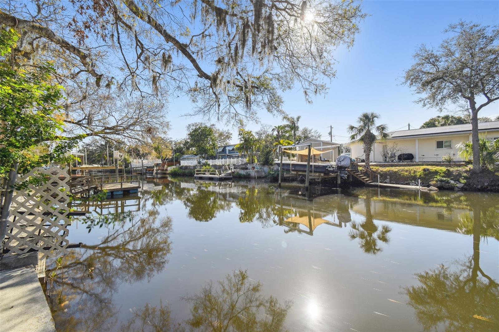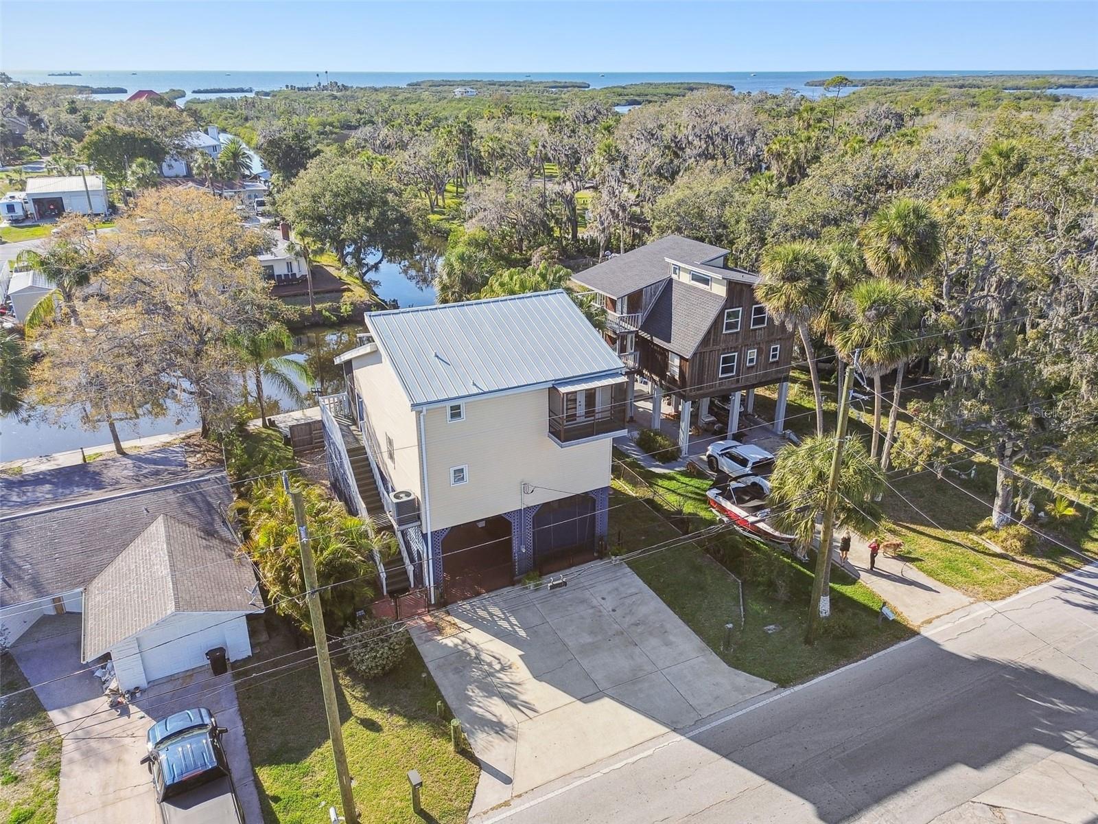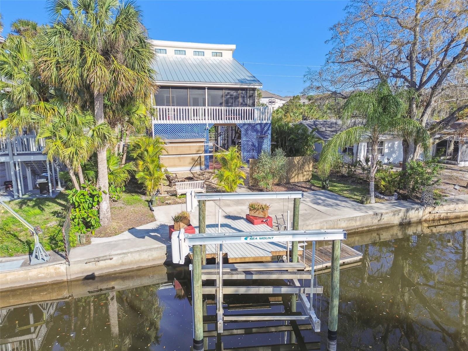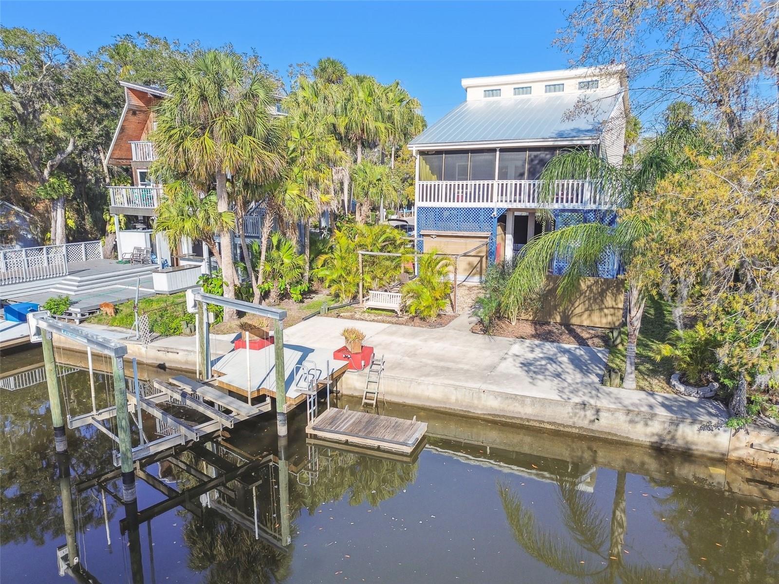 Stilt home on a canal with direct Gulf access. NO Storm or Wind damage offering unmatched peace of mind. Bring your RV, camper, boat, or golf cart—there’s plenty of room to park under the home. Head upstairs and enter through the front door or the spacious screened-in porch, featuring a No-See-Ums screen and stunning water views. Inside, soaring vaulted ceilings and an open floor plan make this home perfect for entertaining. The main level includes a large living and dining area that flows into an industrial-style kitchen with a generous pantry. A convenient laundry closet is just off the kitchen, leading to a renovated full bathroom. There's also a main-level bedroom with direct access to the bath. Upstairs, the master loft offers a spacious walk-in closet, a beautifully renovated full bath with a tub, and a private screened-in balcony. Natural light pours in through the loft windows, stretching the length of the house. The lush, mature landscaping adds to the tropical feel of the property. The backyard is designed for relaxation, with a seating area, fire pit, kayak/paddleboard rack, and an outdoor shower. Key features include a metal roof (2020), impact-rated windows (2020), HVAC/Heat (2019), vinyl flooring (2019), carpet (2021), and a remote-controlled 10K boat lift (2020) with composite decking. Parking is plentiful with a gate clearance of 9'10" wide and 11' high, providing space for a boat, large truck, or camper. There's also an additional boat/trailer pad (16’x10’) behind a locked gate, a shed for storage, and easy access to incredible boating and kayaking spots. Boat to your favorite restaurants and bars in Miller’s Bayou, cruise down the Cottee River, or take a day trip to Anclote Key. Brasher Park is just down the street, that you can walk or bike to. You’re just a short walk to Walmart, Dunkin Donuts, Culver's, and local hot spots, and conveniently located only 45 minutes to Tampa International. Downtown City of New Port Richey in 5 minutes. BOAT available for sale 2015 Sportsmans Heritage, less than 850 hours on the engine. Don’t miss out on this rare waterfront paradise—call today for your private showing!
