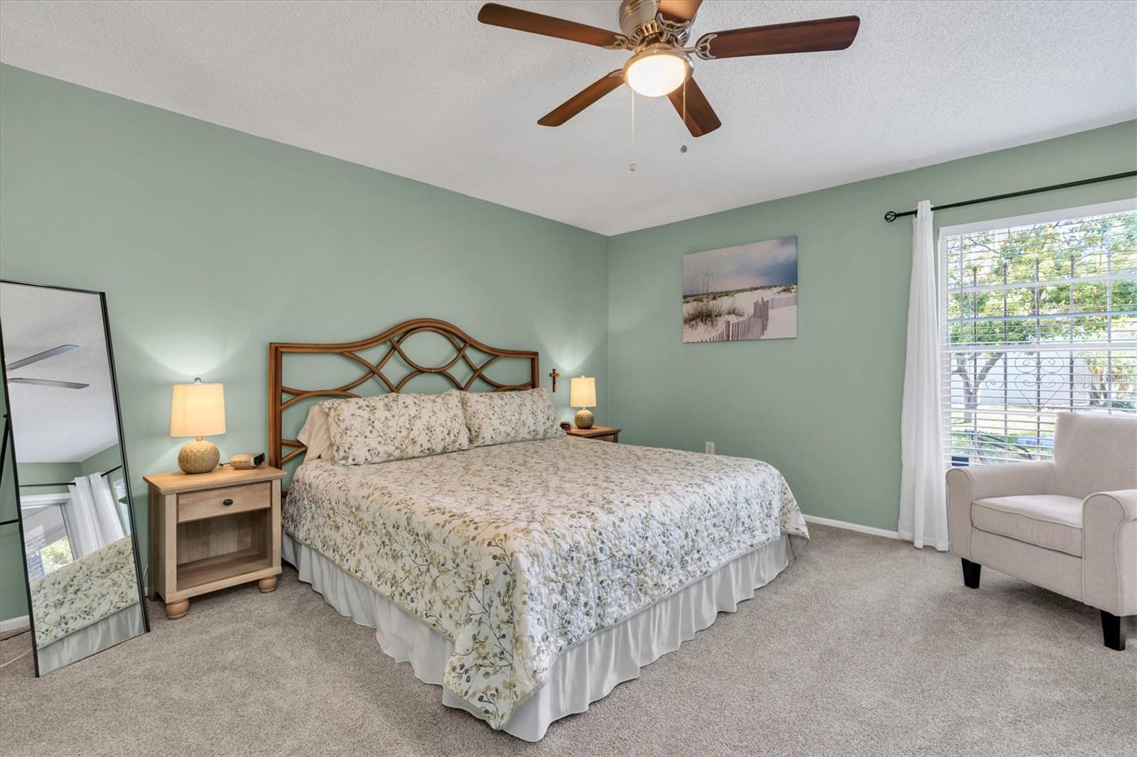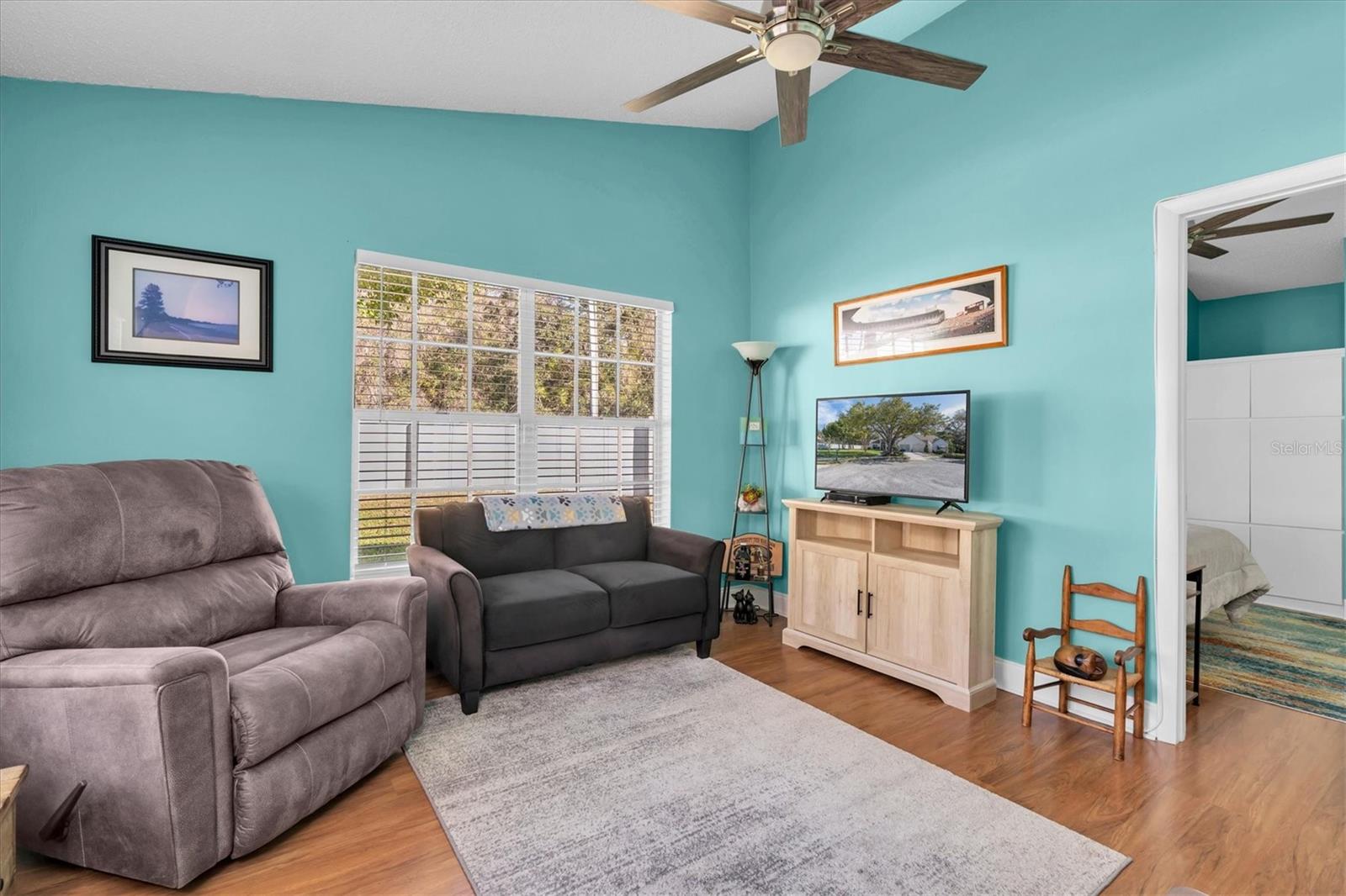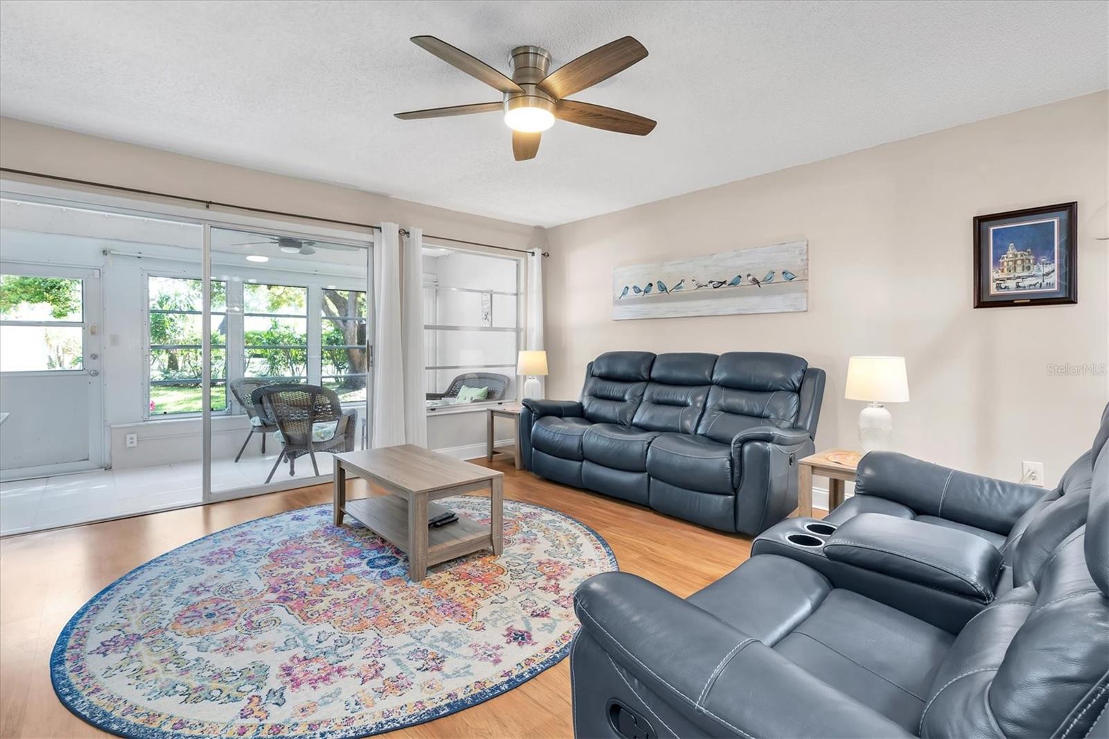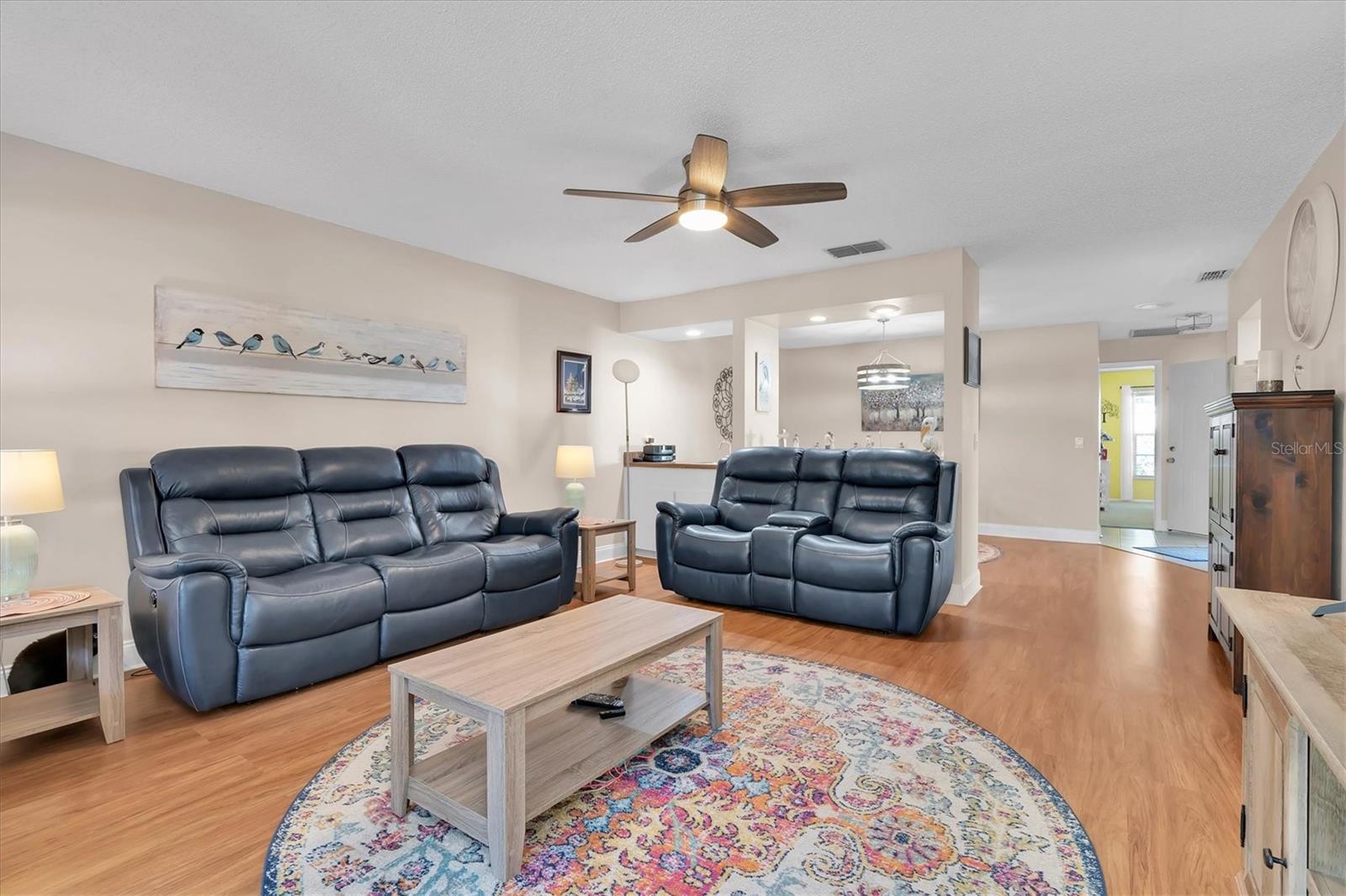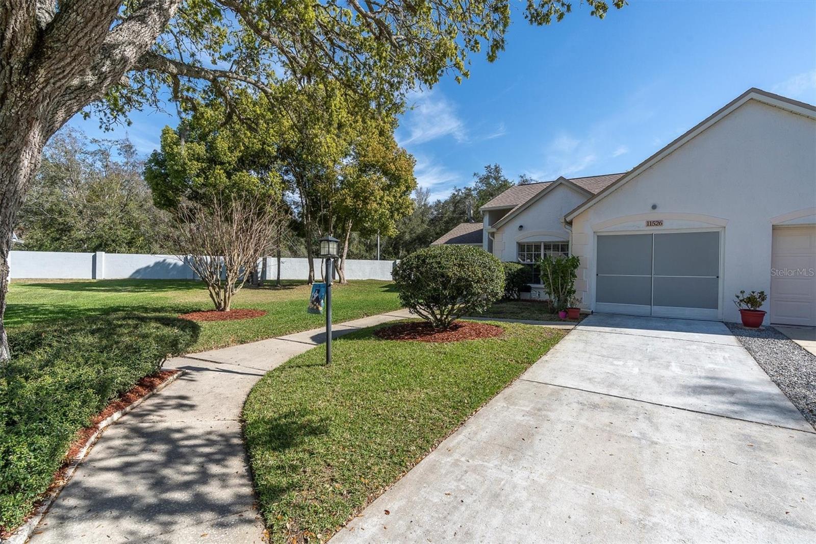 Rare Find! This 3-bedroom + den attached villa, nestled in a quiet cul-de-sac on an expansive 0.29-acre lot in the sought-after 55 plus community of Timber Oaks, offers a spacious and well-designed split floor plan with plenty of natural light. LOW HOA fee of 50.00 per month!! The bright living and dining area features a wet bar, perfect for entertaining, while sliding glass doors lead to an enclosed Florida Room, vented for heat and AC but not included in the square footage, providing a peaceful retreat. Just outside, a concrete patio and mature trees create a private backyard oasis. The kitchen boasts stainless steel appliances, including a one-year-old refrigerator, a cupboard pantry, and a cozy breakfast nook. The primary suite features a walk-in closet and ensuite bath with serene backyard views. A second bedroom is conveniently located near a full bath, while the third bedroom, with an attached den or study and vaulted ceilings, offers versatility as a home office or additional living space. This home has been meticulously maintained with recent updates, including a new roof in 2024, A/C in 2018, a water heater in 2023, a water softener, new gutters in 2021, and carpet replaced just last year. As a bonus, the irrigation system runs on a well. This active 55+ community offers fantastic amenities, including a clubhouse with a pool overlooking the lake, a fitness center, tennis courts, billiards, and more. As well, not far from the entertainment and restaurants of downtown New Port Richey! Don’t miss this rare opportunity—schedule your private tour today!