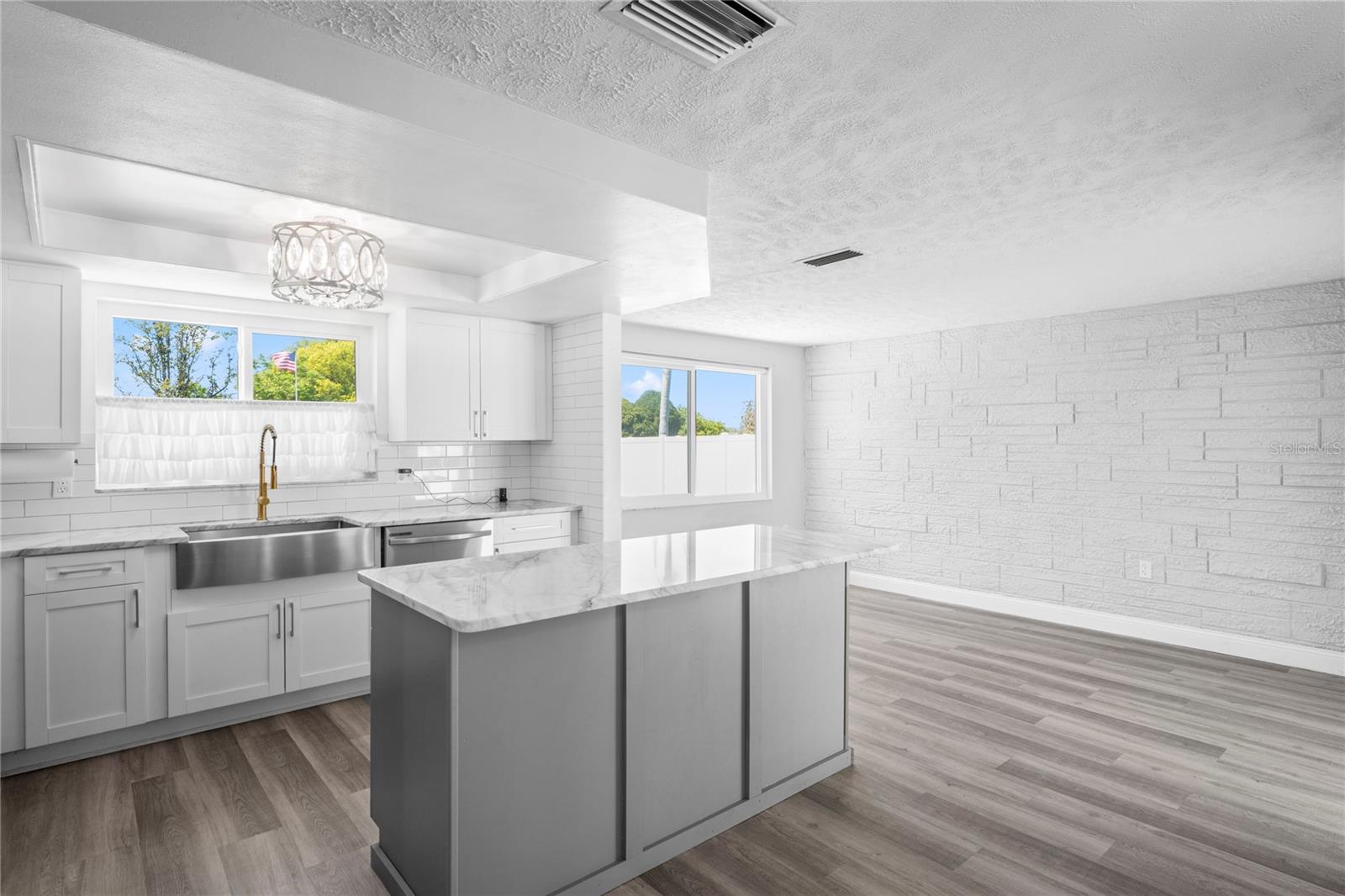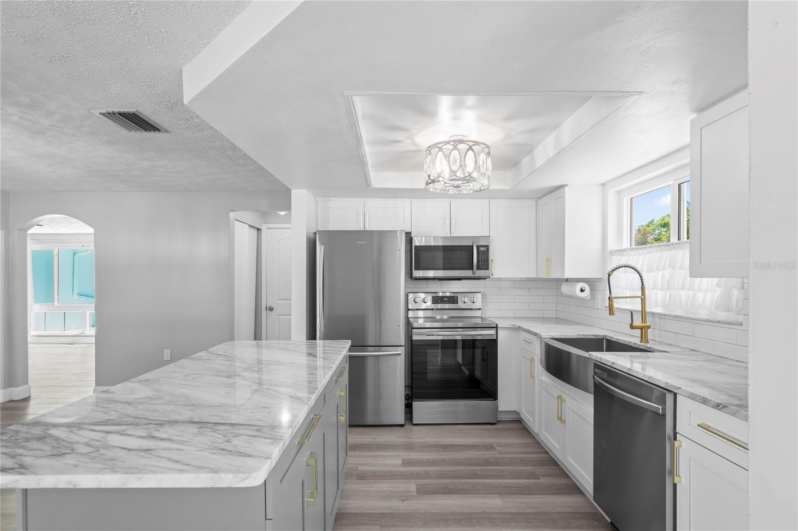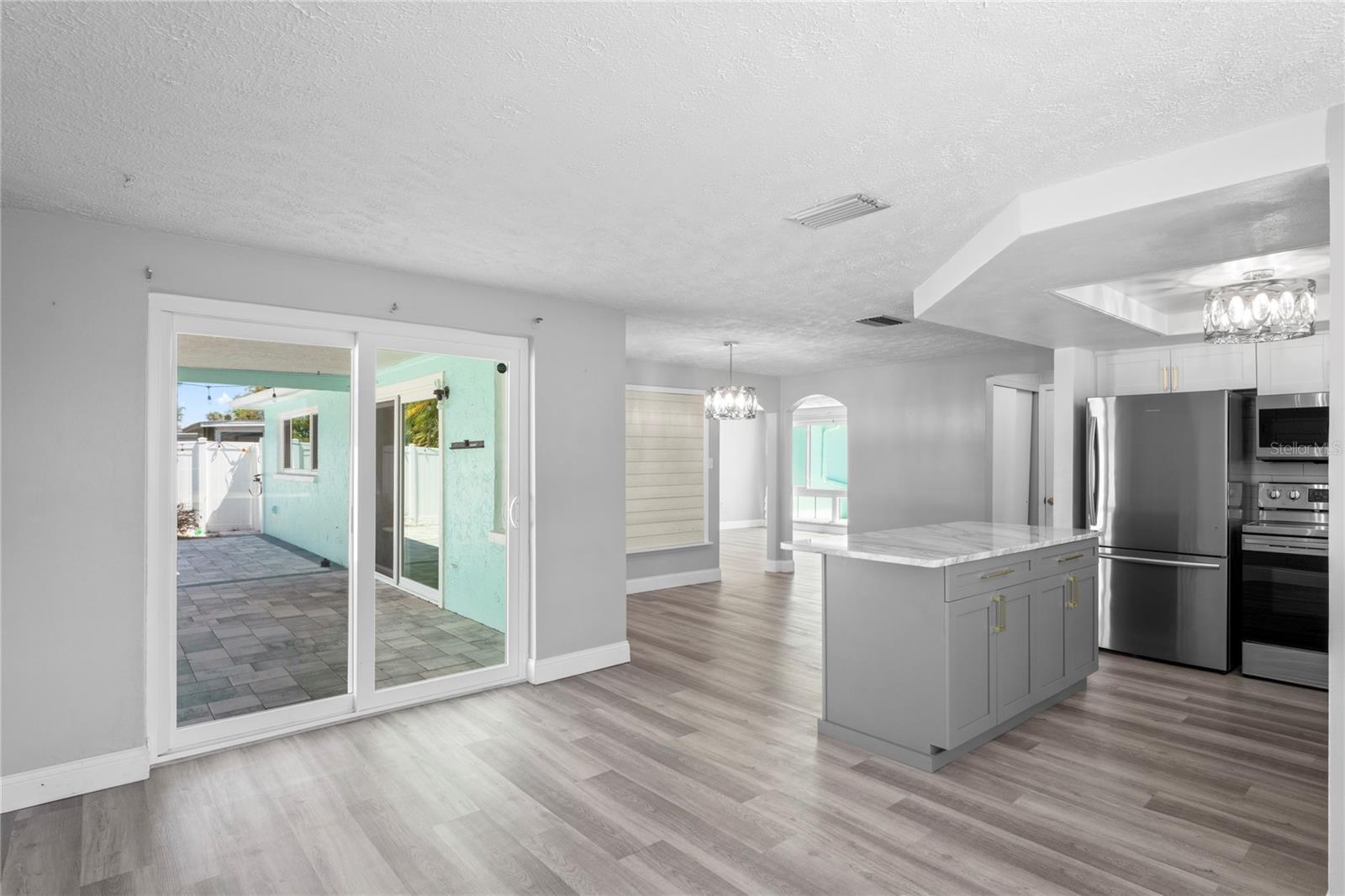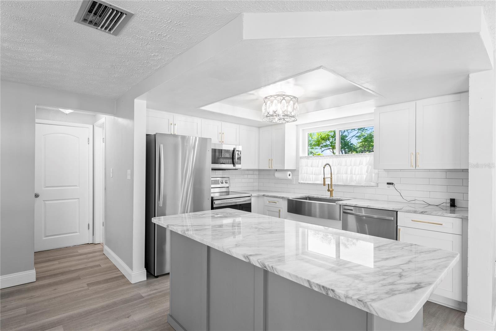 This residence is move-in ready, with an array of exceptional features. A brand-new roof, newer AC, and windows complement the comprehensive remodel. Upon entering, the living room seamlessly transitions into the open kitchen, complete with white cabinetry, quartz countertops, counter height center island, and stainless-steel appliances including the refrigerator, microwave, range, dishwasher, and farm sink. The kitchen flows into the family room and dinette area, while the family room features expansive glass sliders leading to a covered porch. The interior is bathed in natural light. The primary bedroom features an expansive walk-in closet and convenient access to the full bathroom. Additional highlights include luxury vinyl flooring, upgraded lighting fixtures, and a low-maintenance backyard with brick pavers, beautiful landscaping and vinyl fencing making it very private and perfect for backyard parties and BBQs. The garage features a washer/dryer hookup, laundry sink and includes the appliances. Freshly painted outside. An extra side driveway accommodates guest parking. Ideally located near shopping centers, this property offers effortless access to various amenities. Schedule a viewing today.
