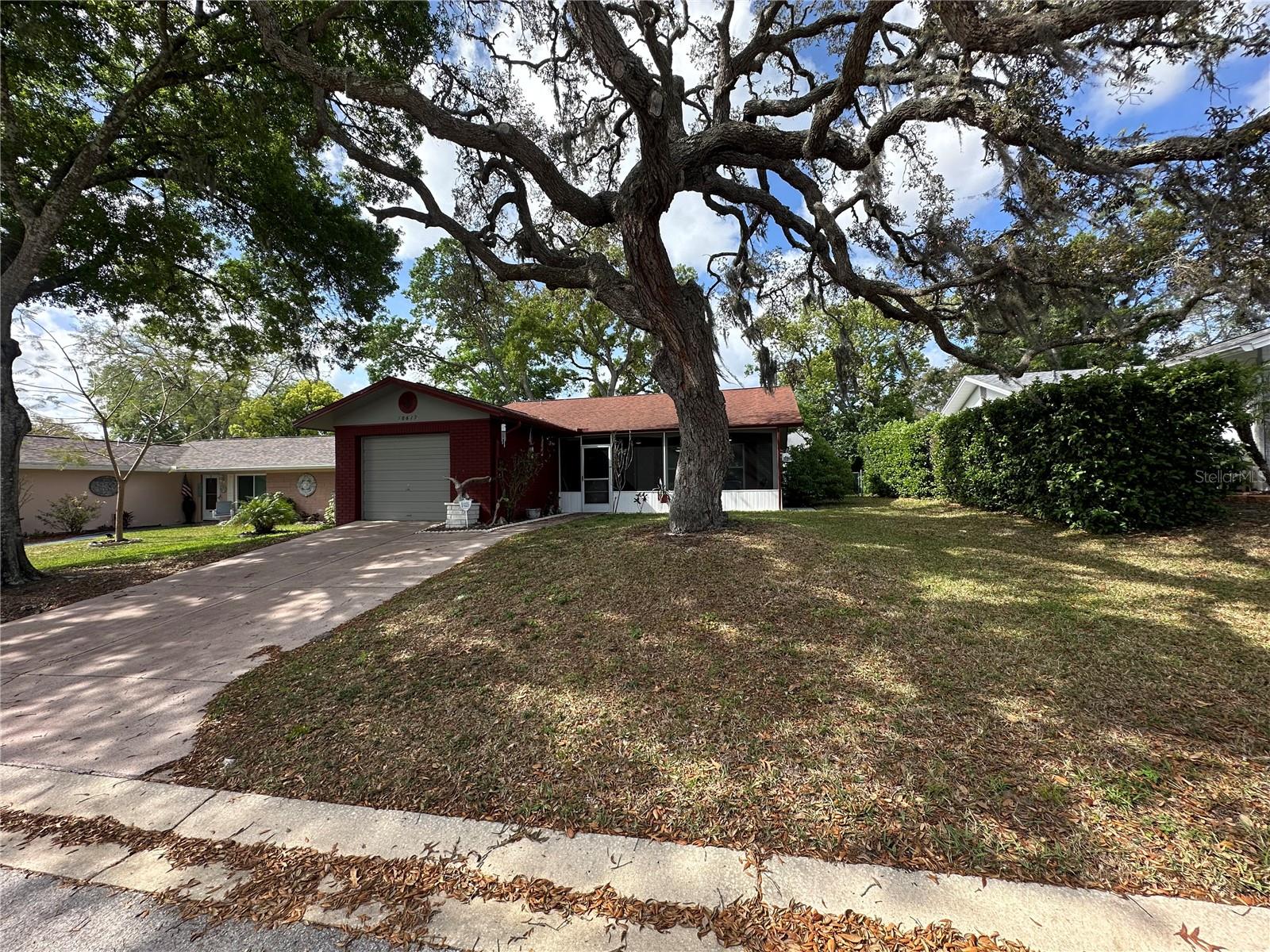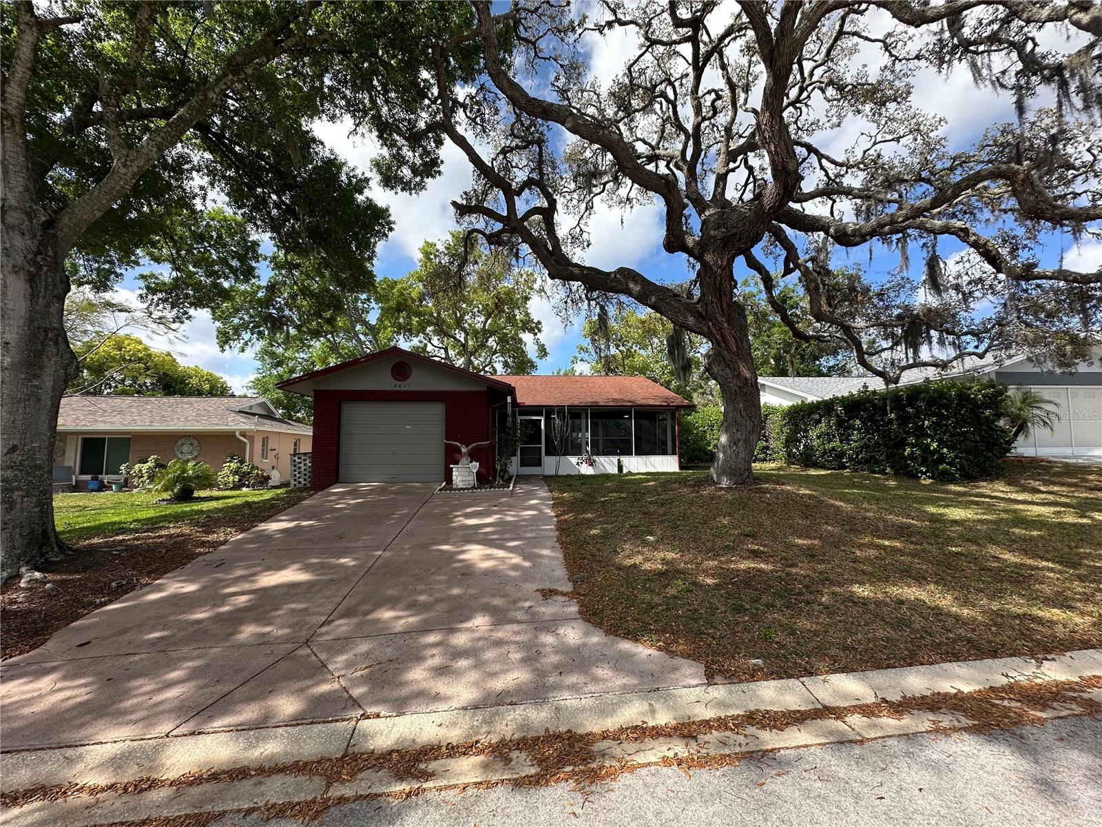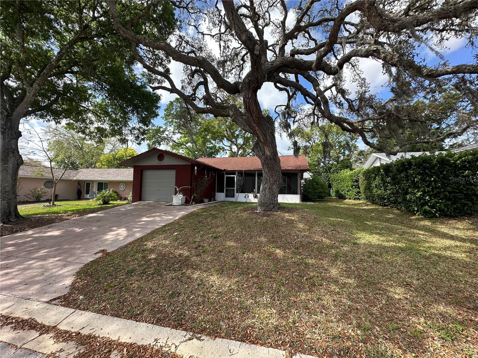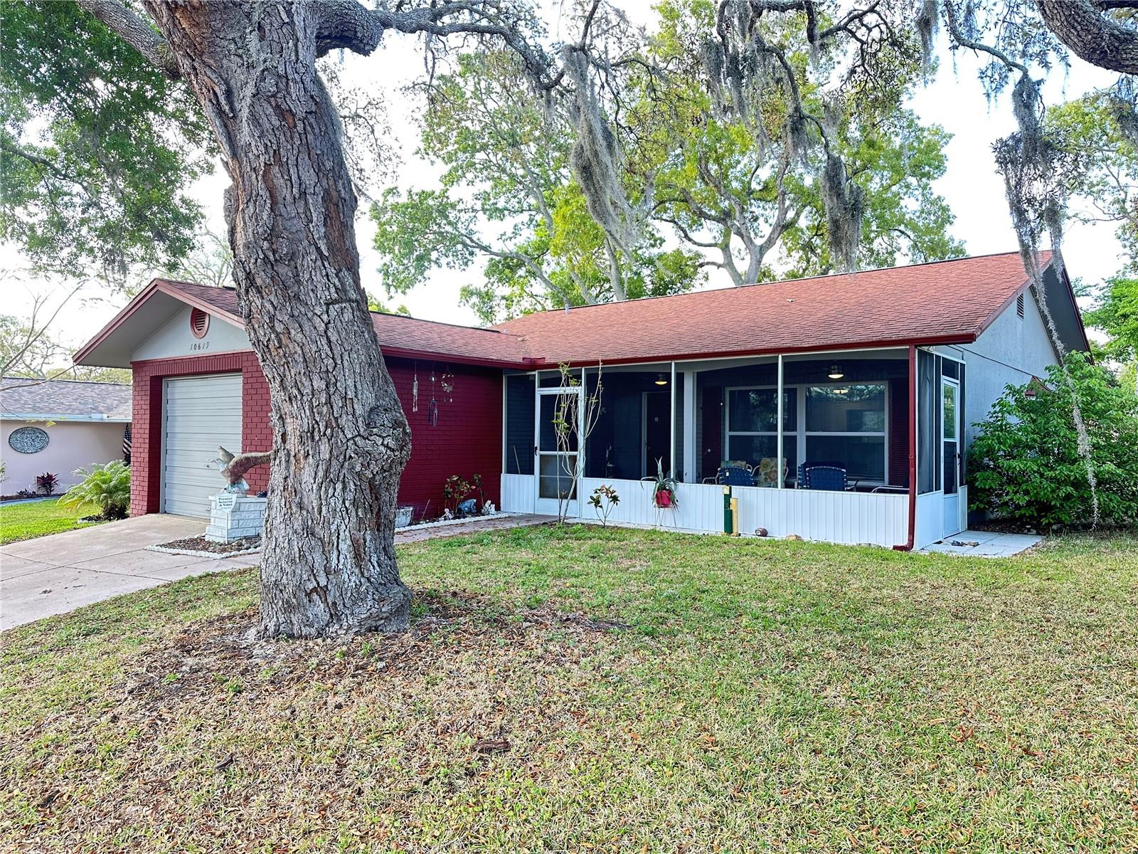 This well-maintained 2-bedroom, 2-bath home with an oversized 1-car garage is a must-see! Featuring a blend of tile and laminate flooring throughout, an eat-in kitchen with updated countertops, and a spacious walk-in closet, this home offers both comfort and functionality. Step onto the charming front porch or relax in the fenced-in backyard, shaded by mature trees including a stately grandfather oak. The dining room is highlighted by a beautiful bay window that fills the space with natural light, while the fully enclosed, heated and air-conditioned lanai provides additional year-round living space. Located in a desirable 55+ deed-restricted community with low monthly HOA fees, residents enjoy access to a lakeside clubhouse with stunning views and a vibrant social atmosphere. Amenities include a heated pool with water exercise classes, relaxing spa, tennis and pickleball courts, shuffleboard, bocce, a billiards room, and more. The community is known for its active lifestyle and friendly neighbors. Conveniently located near shopping, hospitals, and beautiful Gulf Coast beaches, and just 45 minutes from both Tampa and St. Pete airports—this home offers the perfect blend of peaceful living and accessibility.