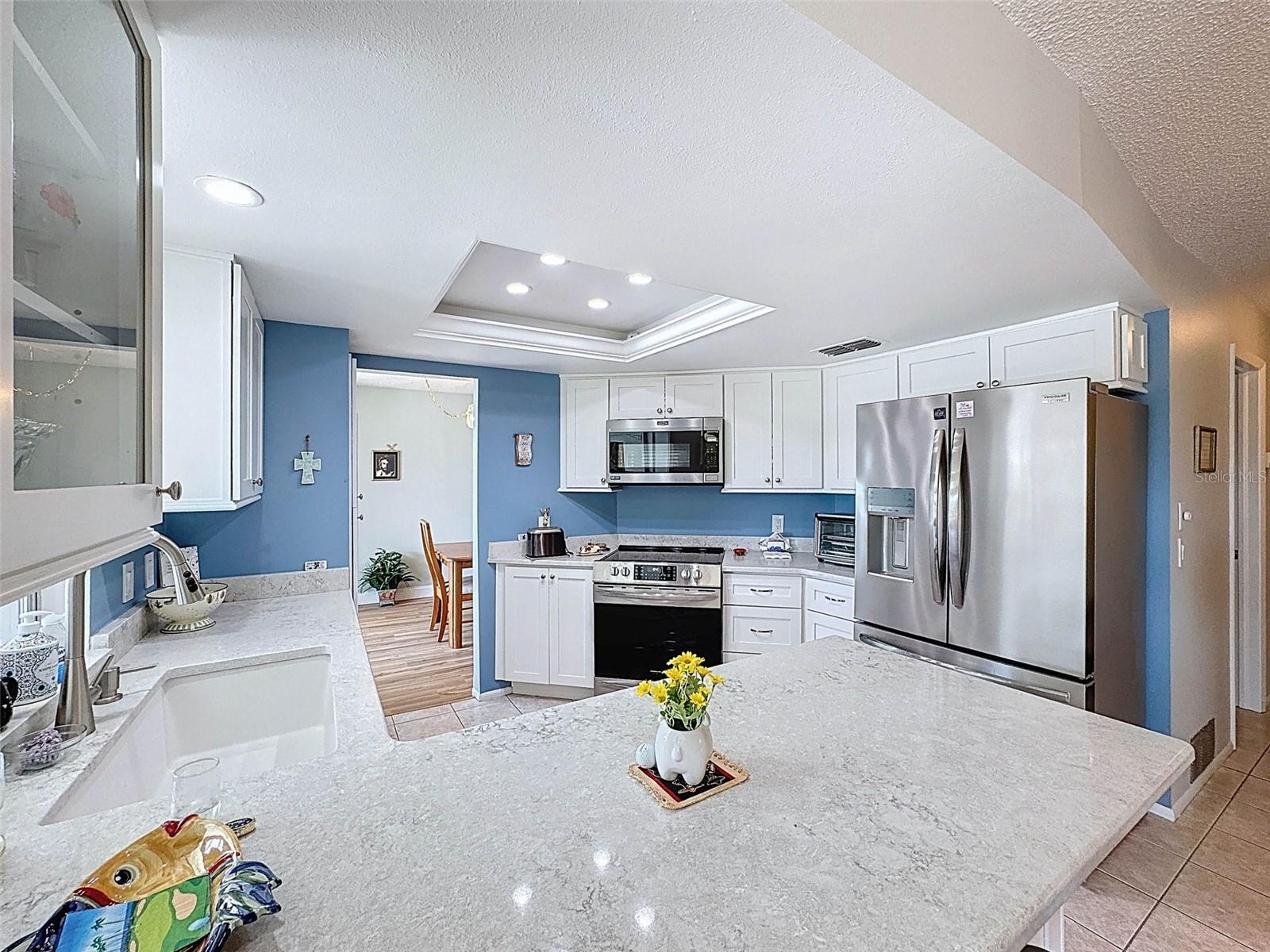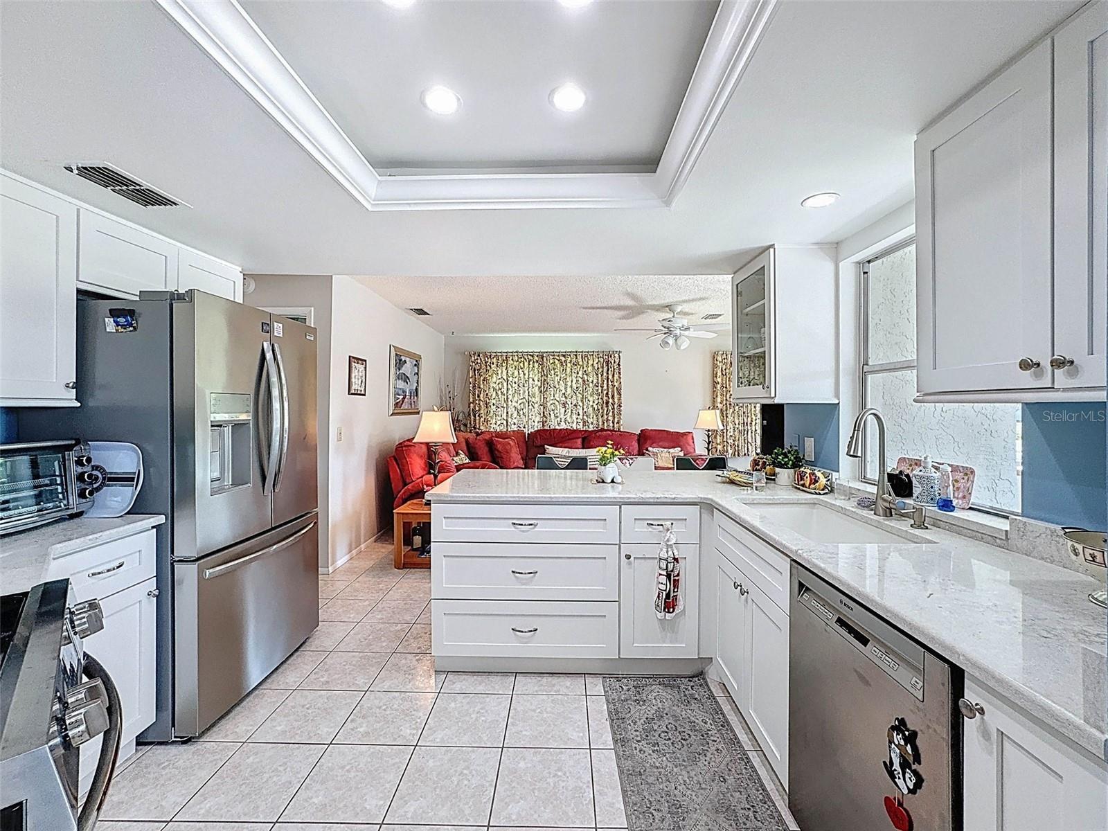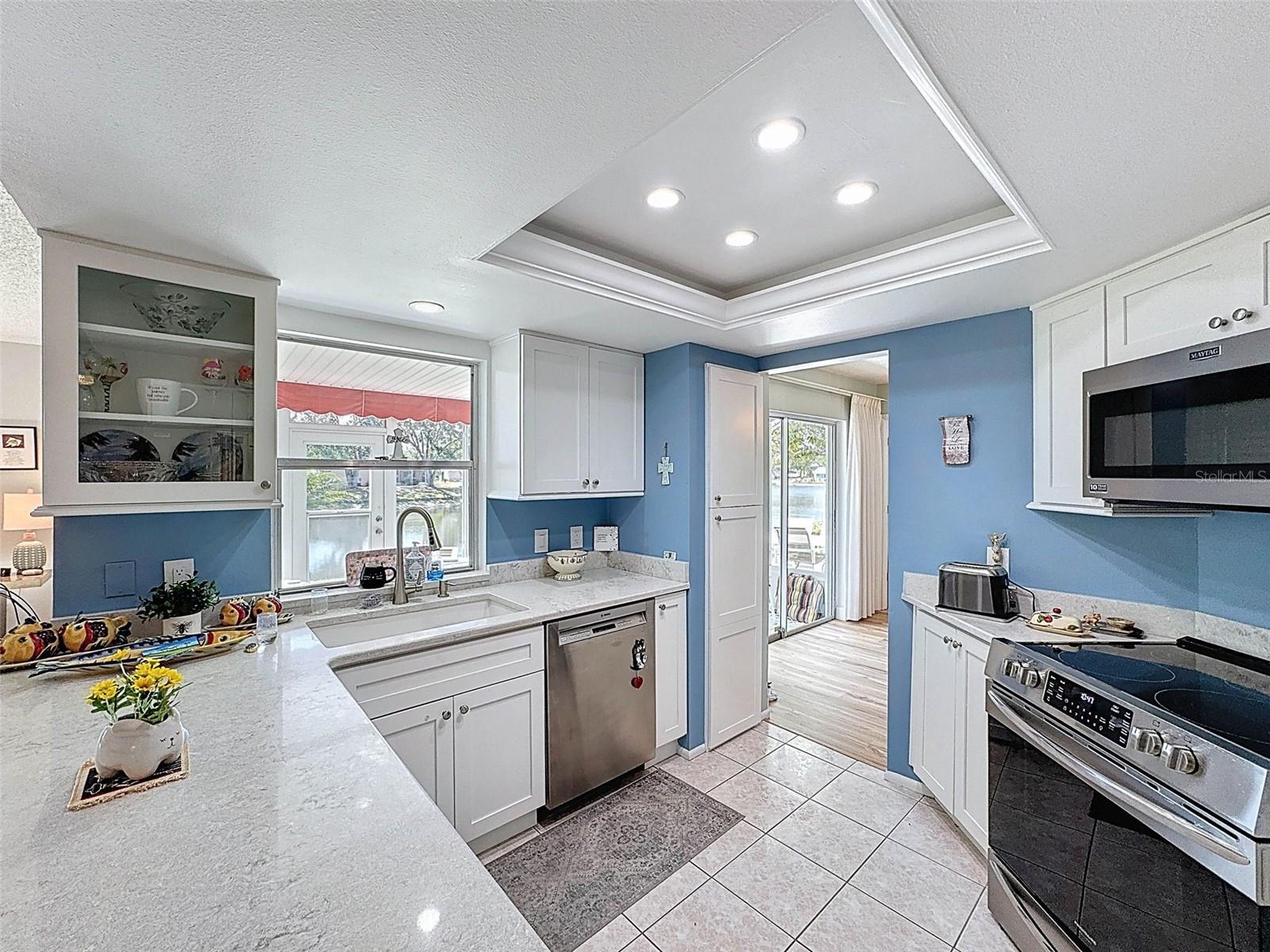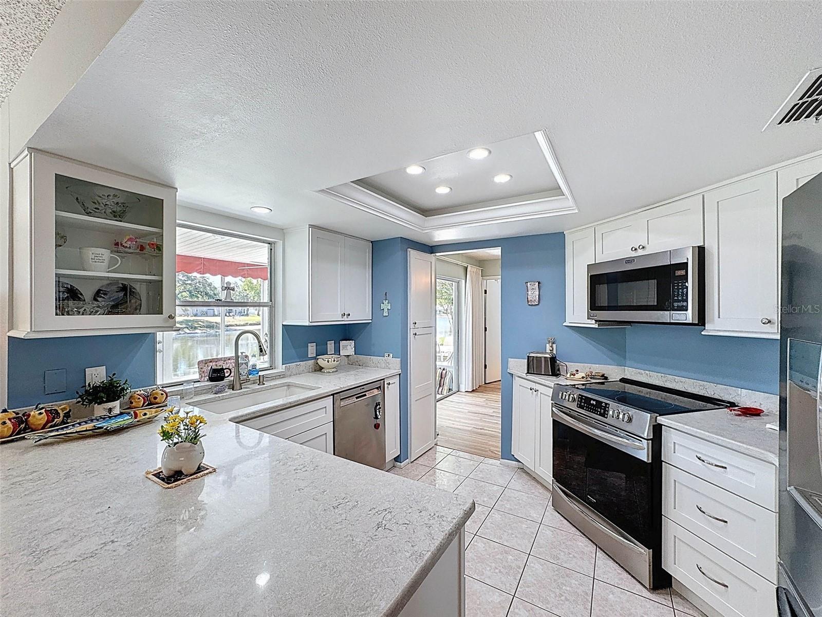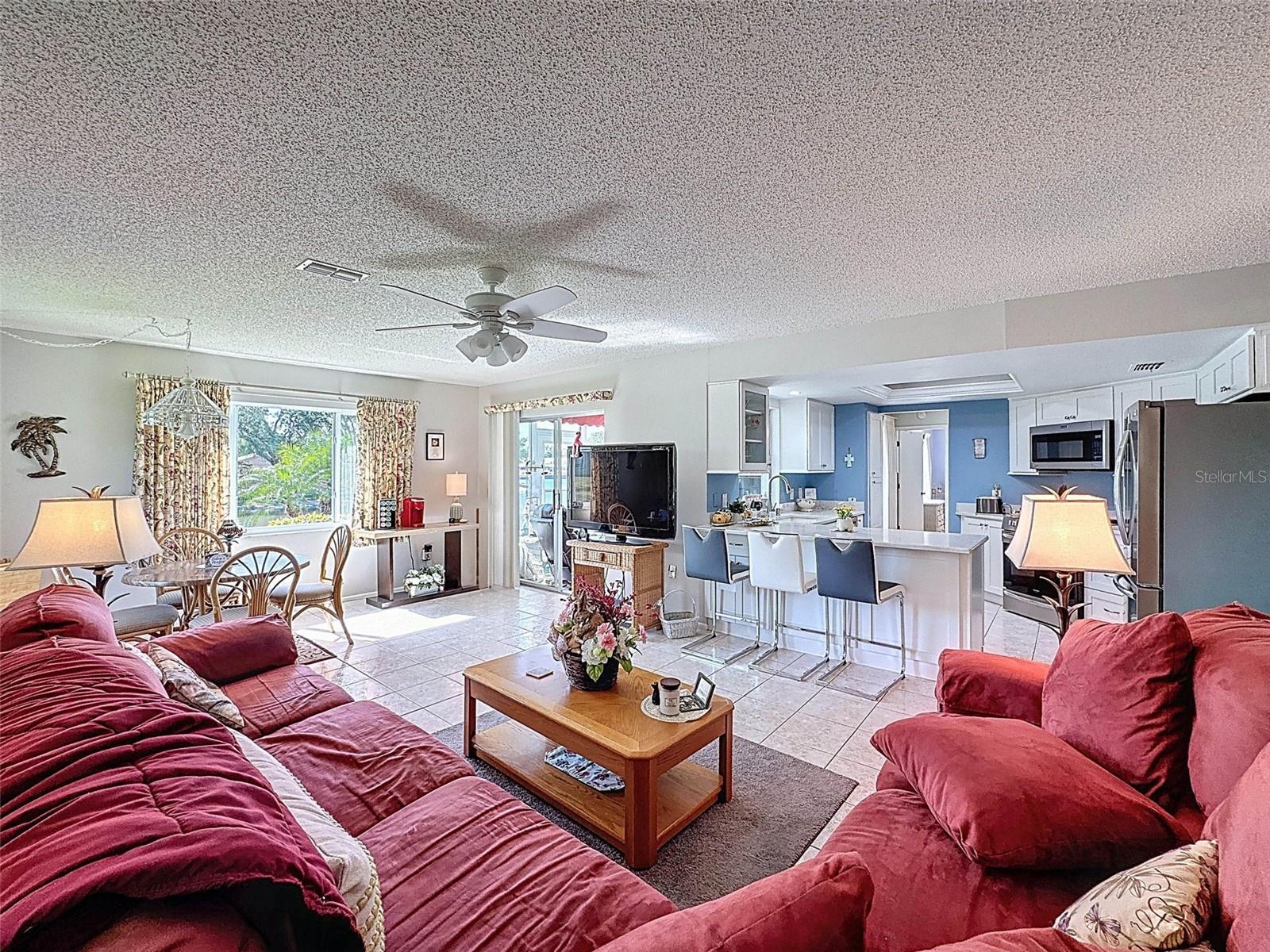 Timber Oaks Jewel! Beautifully updated and impeccably maintained 2 bedroom home with 2 full baths and oversized 2 car garage. Possibly the best location in Timber Oaks, with lake frontage, and on a quiet cul de sac. Relax lakeside and enjoy the serenity of waterfront life in this active 55+ community, complete with Community Pool and Clubhouse, Tennis and loads of activities to get involved!! First, tasteful landscaping and a sweeping driveway welcomes you home. Through the glass front door, you come inside the home into a warm living room /dining area. The kitchen is completely remodeled, with stunning cabinets and stainless appliances. The convenient breakfast bar is a great place to sit and chat while meals are prepped. Chill out in the family room and enjoy coffee overlooking the lake and watch the birds light on the surface. The bedrooms are generously sized with an elegant en suite bath in the primary bedroom. The guest bedroom and bath are set up for privacy when guests stay over, and inside laundry room makes that chore easy. The enclosed lanai provides the best vantage point to look out on the lake and revel in the Florida lifestyle!! And, here's the nuts n bolts...Roof is 2.5 years new, HVAC only 5 years, and water heater replaced 3 years ago!! Come and live your best life in Timber Oaks!!