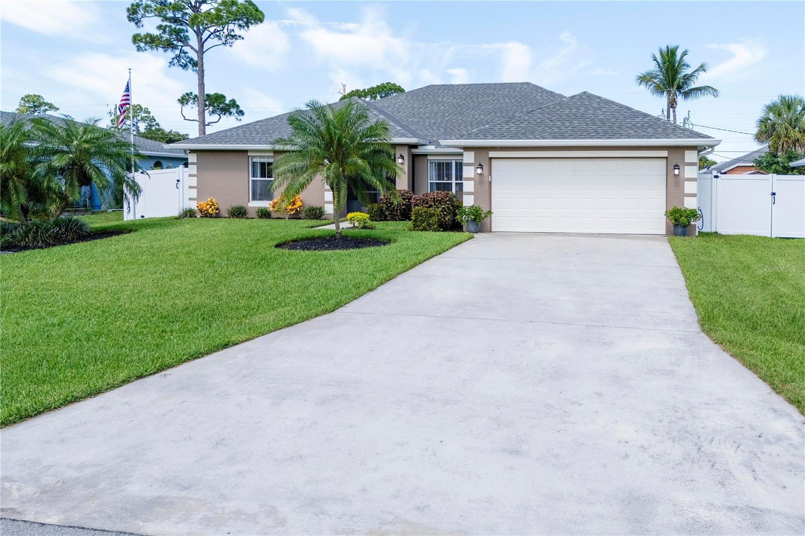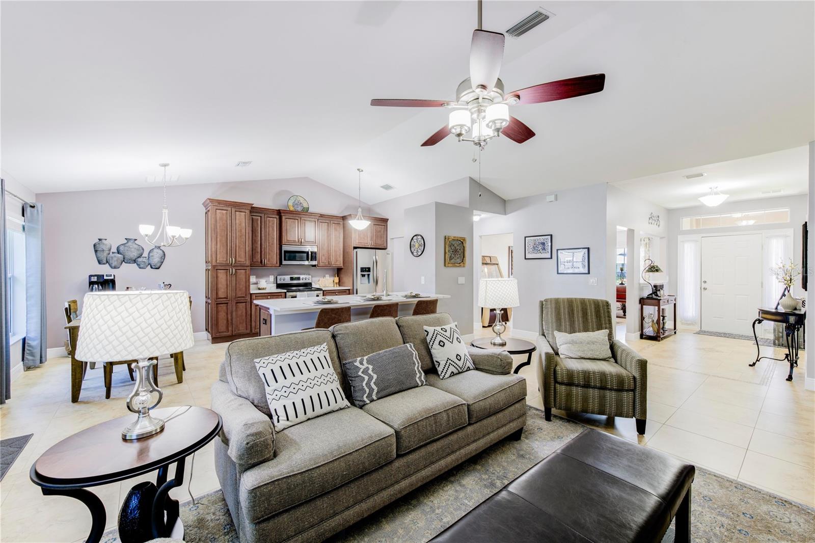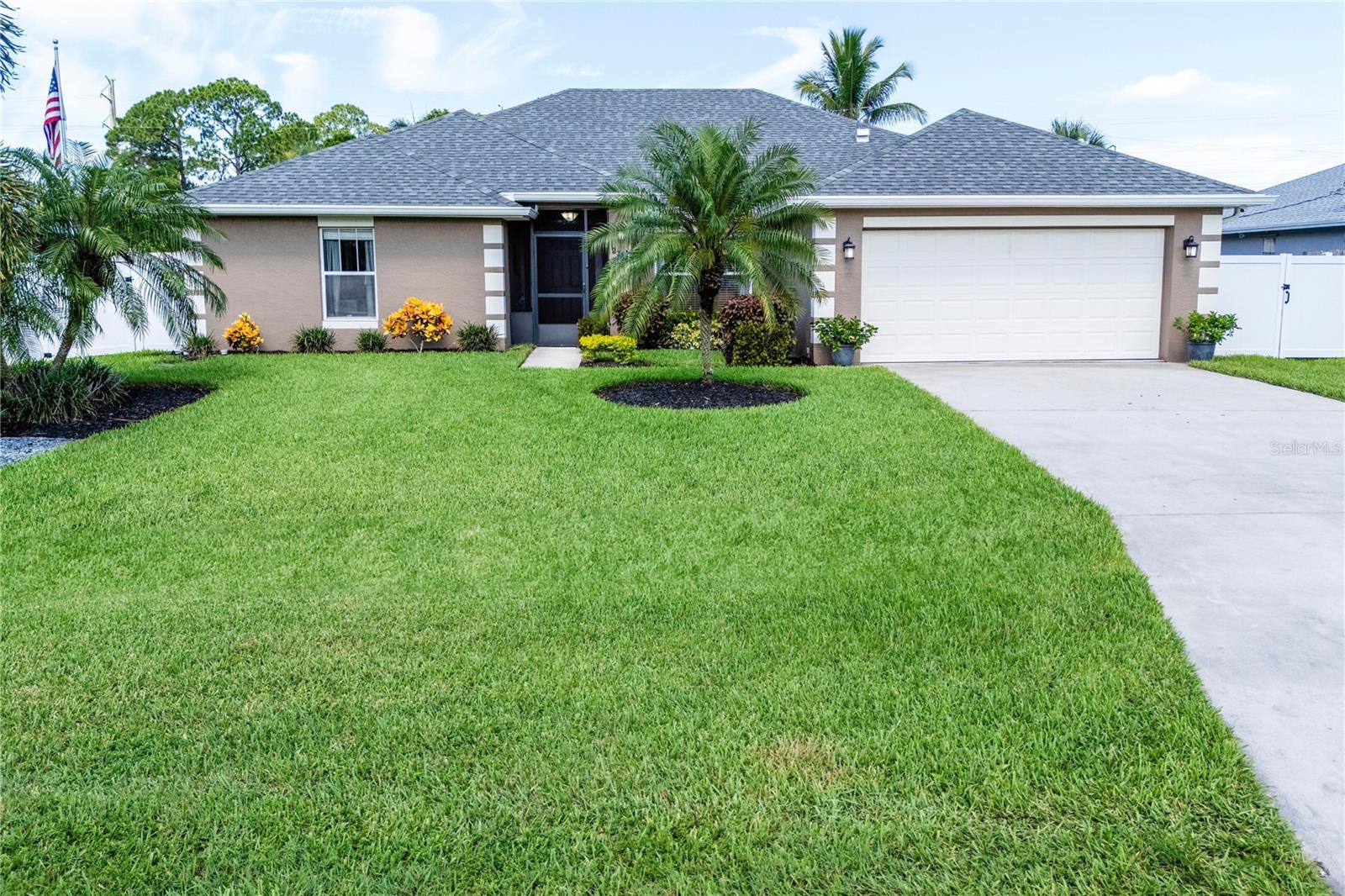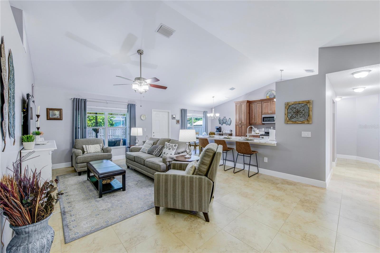 Welcome to your new home! This beautifully maintained 4-bedroom, 3-bathroom residence features vaulted ceilings in the main living area, creating an airy and spacious feel. The upgraded kitchen boasts sleek counters and cabinets, while the bathrooms feature modern countertops. Enjoy the screened-in lanai and a fenced backyard—perfect for relaxation and play. The property is adorned with a well-manicured front and back lawn and has been freshly painted inside and out for a crisp, contemporary look. Located conveniently near restaurants, highways, and shopping centers, this home offers both style and convenience.ONLY 5 MINUTES FROM TRADITION COMMUNITY AND AMMENITIES! Don’t miss the chance to make it yours! ROOF 2023 - AC 2018 - NEW IRRIGATION SYSTEM - E GLASS WINDOWS!