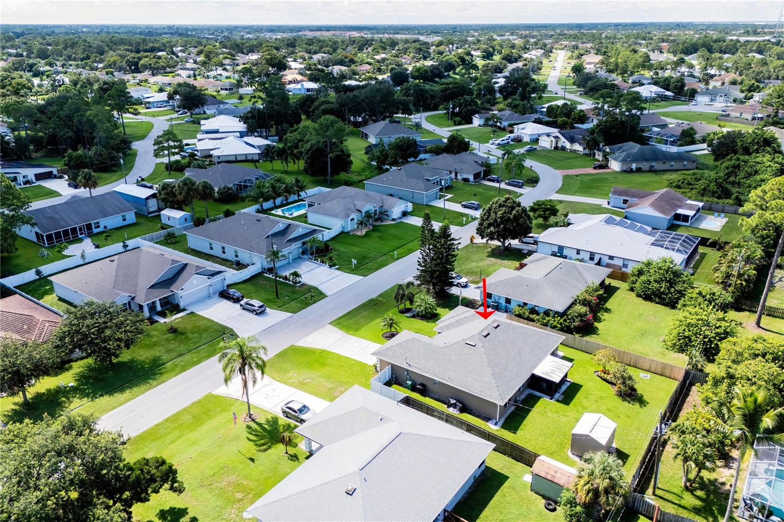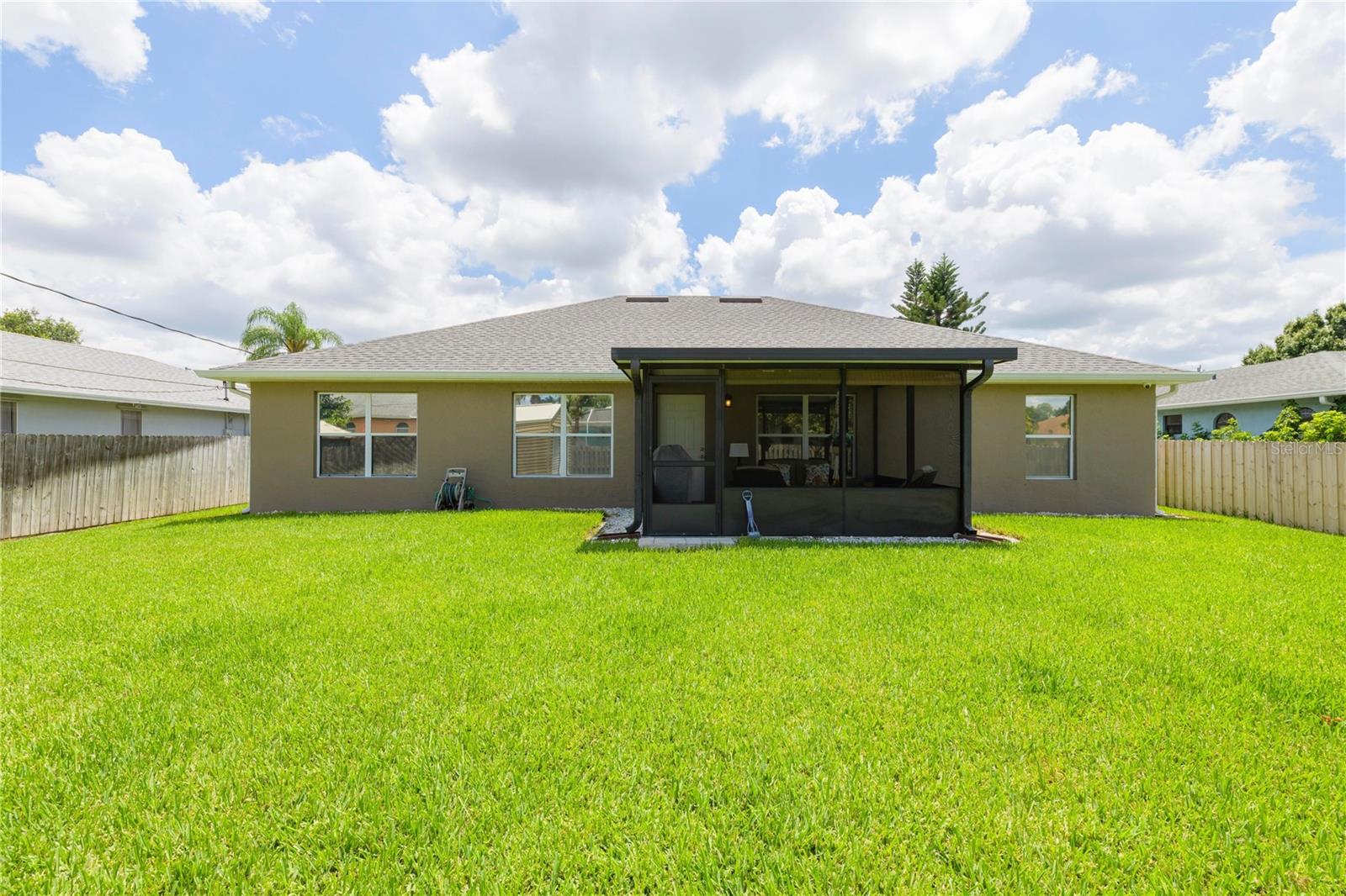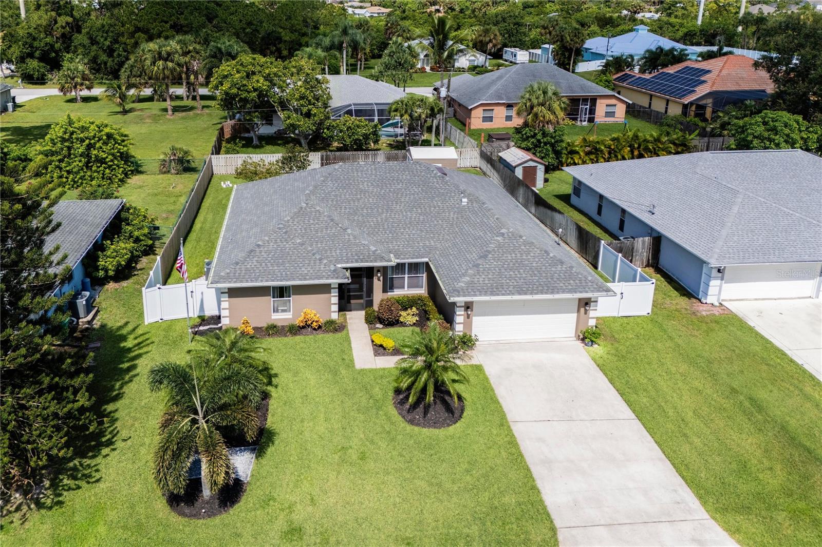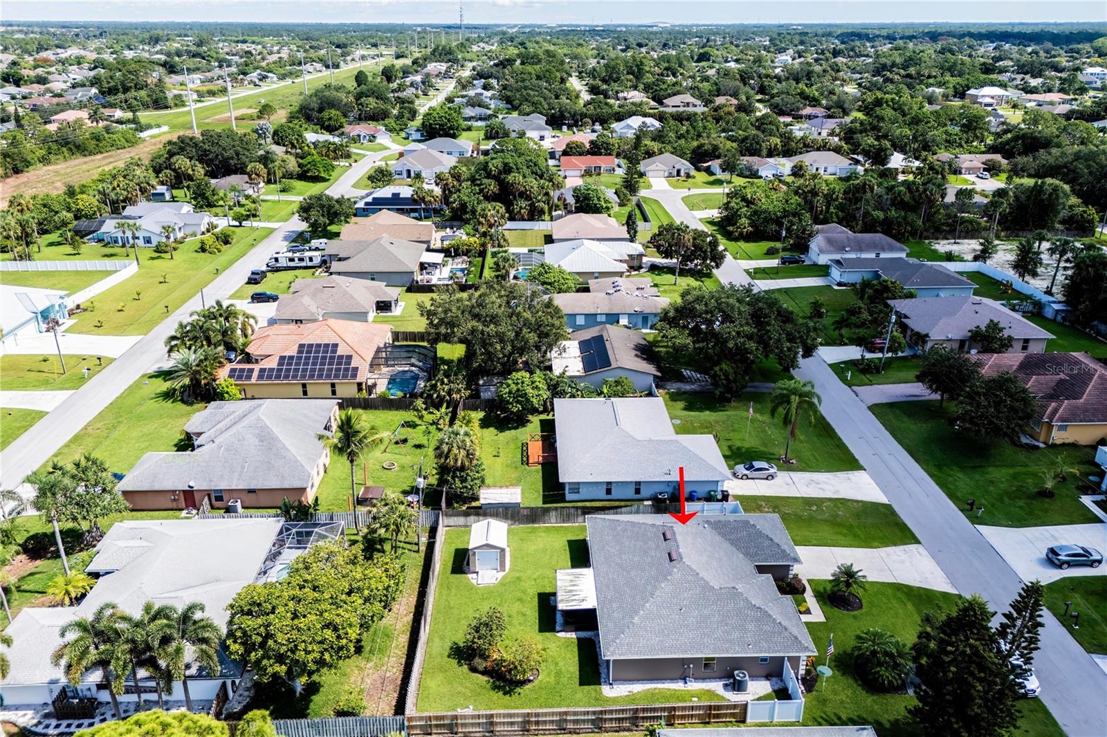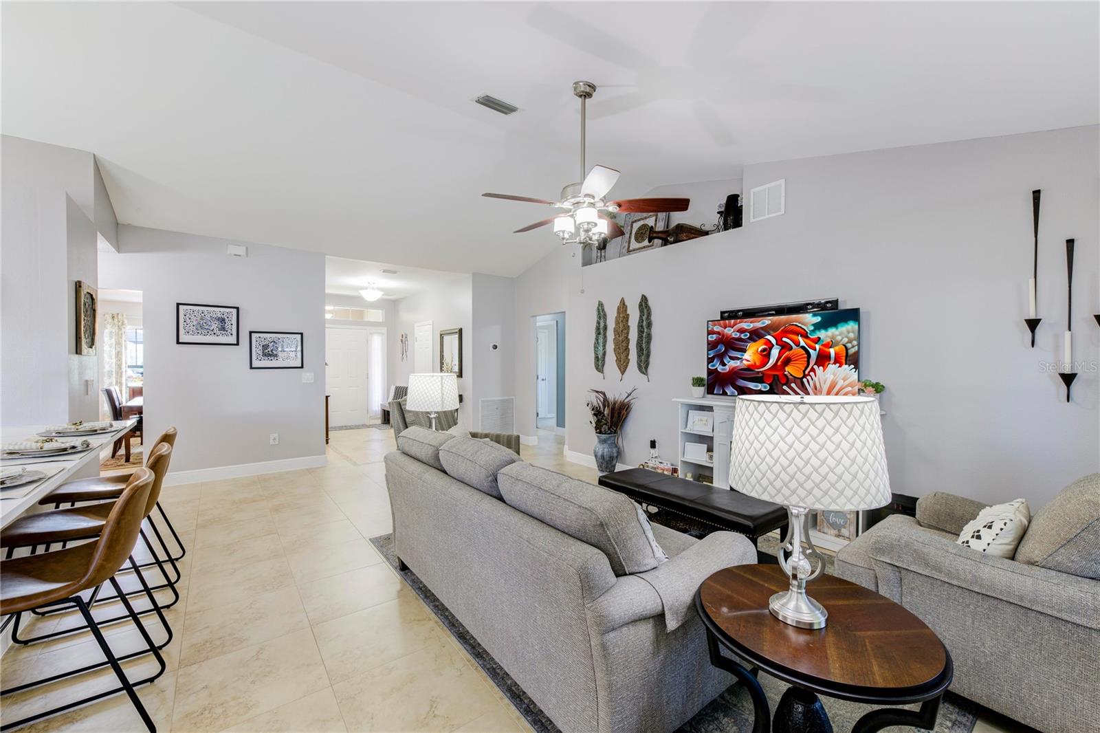 Welcome to your new home! This beautifully maintained 4-bedroom, 3-bathroom residence features vaulted ceilings in the main living area, creating an airy and spacious feel. The upgraded kitchen boasts sleek counters and cabinets, while the bathrooms feature modern countertops. Enjoy the screened-in lanai and a fenced backyard—perfect for relaxation and play. The property is adorned with a well-manicured front and back lawn and has been freshly painted inside and out for a crisp, contemporary look. Located conveniently near restaurants, highways, and shopping centers, this home offers both style and convenience.ONLY 5 MINUTES FROM TRADITION COMMUNITY AND AMMENITIES! Don’t miss the chance to make it yours! ROOF 2023 - AC 2018 - NEW IRRIGATION SYSTEM - E GLASS WINDOWS!