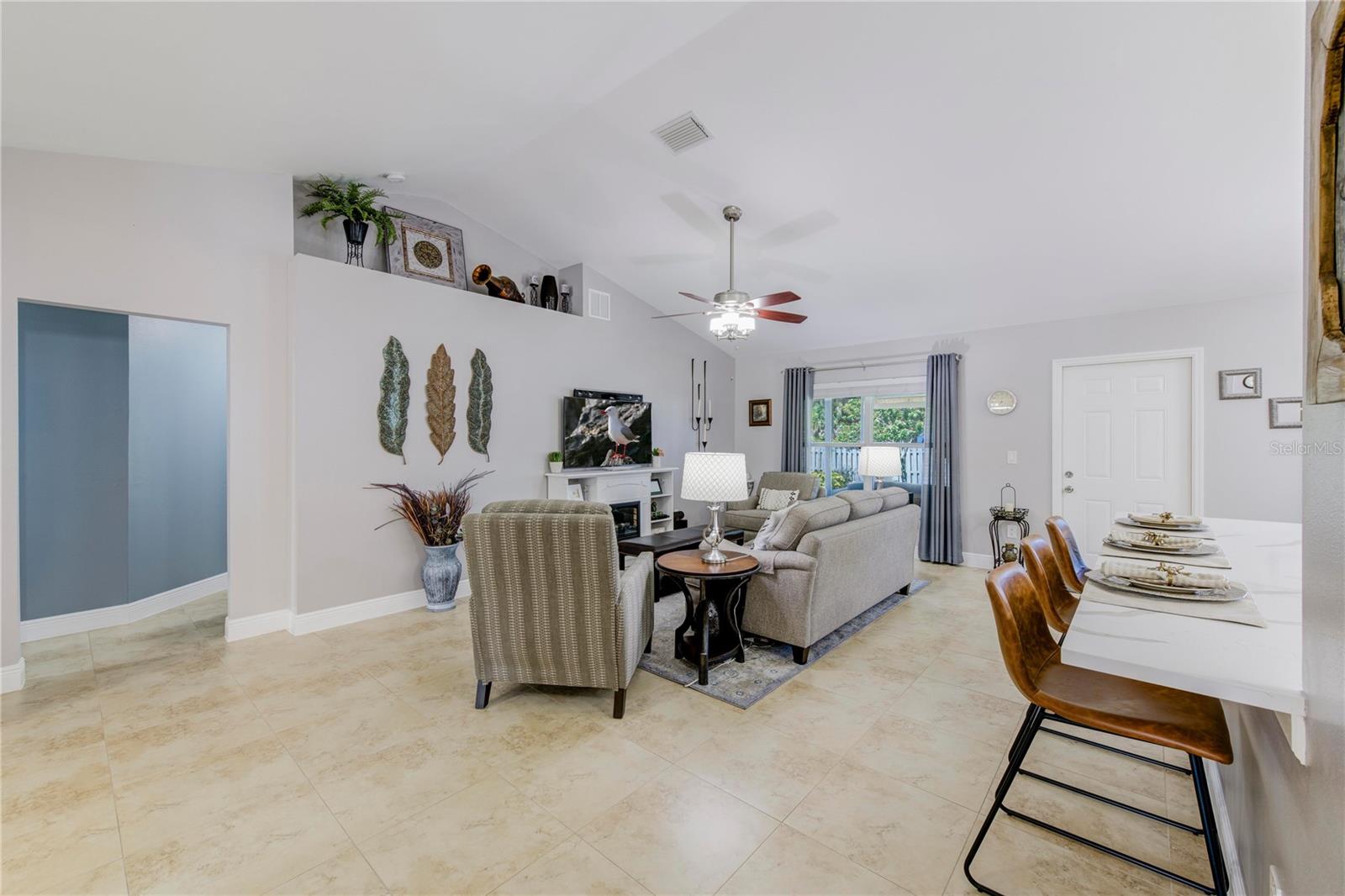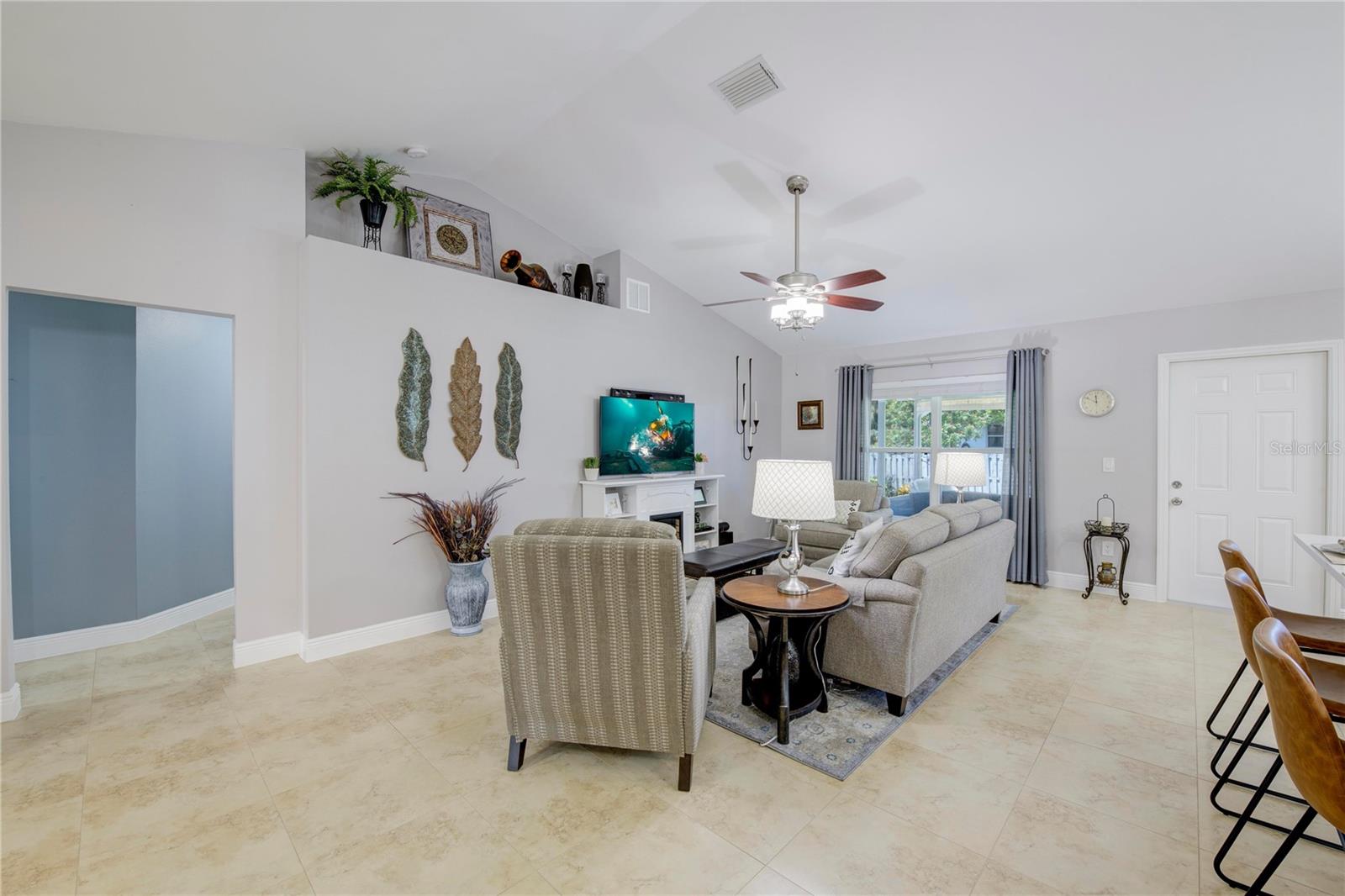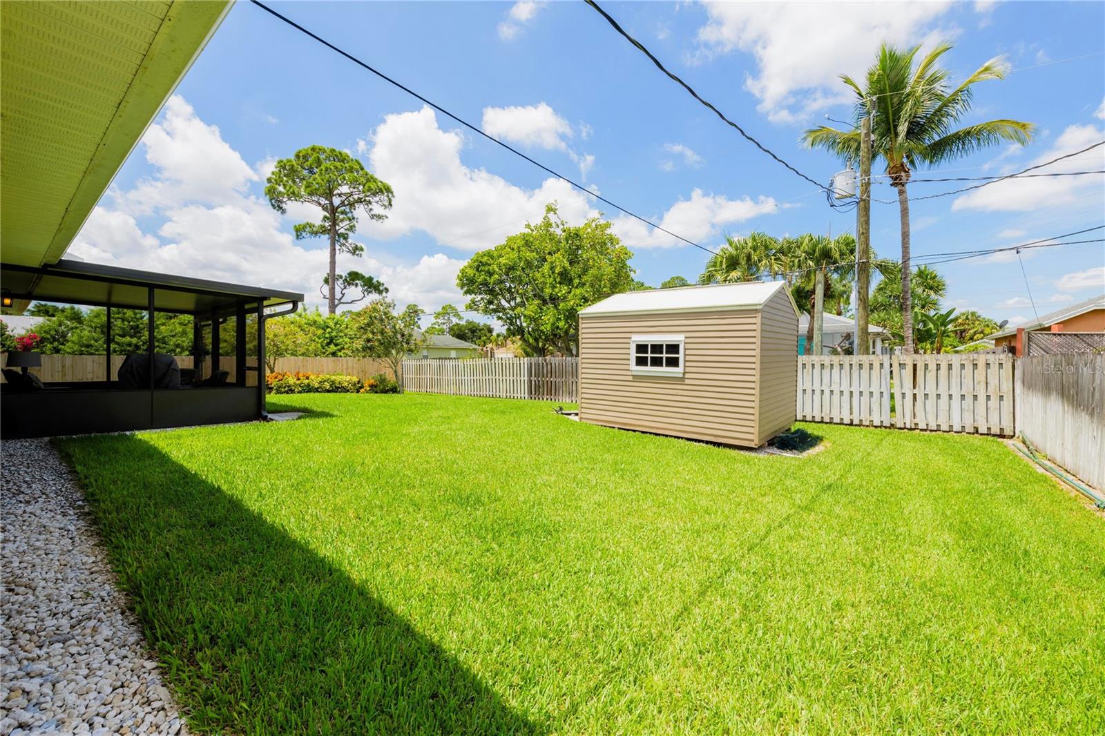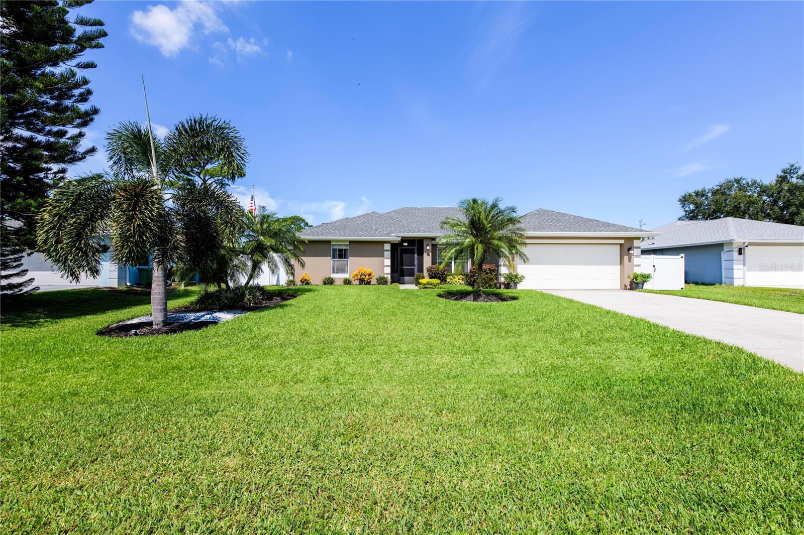 Welcome to your new home! This beautifully maintained 4-bedroom, 3-bathroom residence features vaulted ceilings in the main living area, creating an airy and spacious feel. The upgraded kitchen boasts sleek counters and cabinets, while the bathrooms feature modern countertops. Enjoy the screened-in lanai and a fenced backyard—perfect for relaxation and play. The property is adorned with a well-manicured front and back lawn and has been freshly painted inside and out for a crisp, contemporary look. Located conveniently near restaurants, highways, and shopping centers, this home offers both style and convenience.ONLY 5 MINUTES FROM TRADITION COMMUNITY AND AMMENITIES! Don’t miss the chance to make it yours! ROOF 2023 - AC 2018 - NEW IRRIGATION SYSTEM - E GLASS WINDOWS!