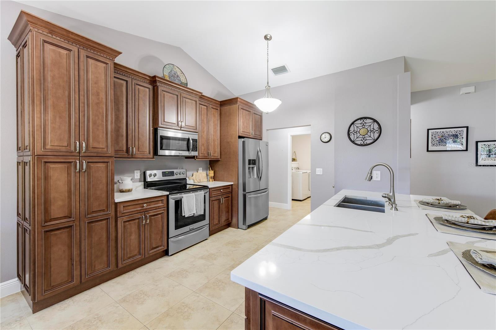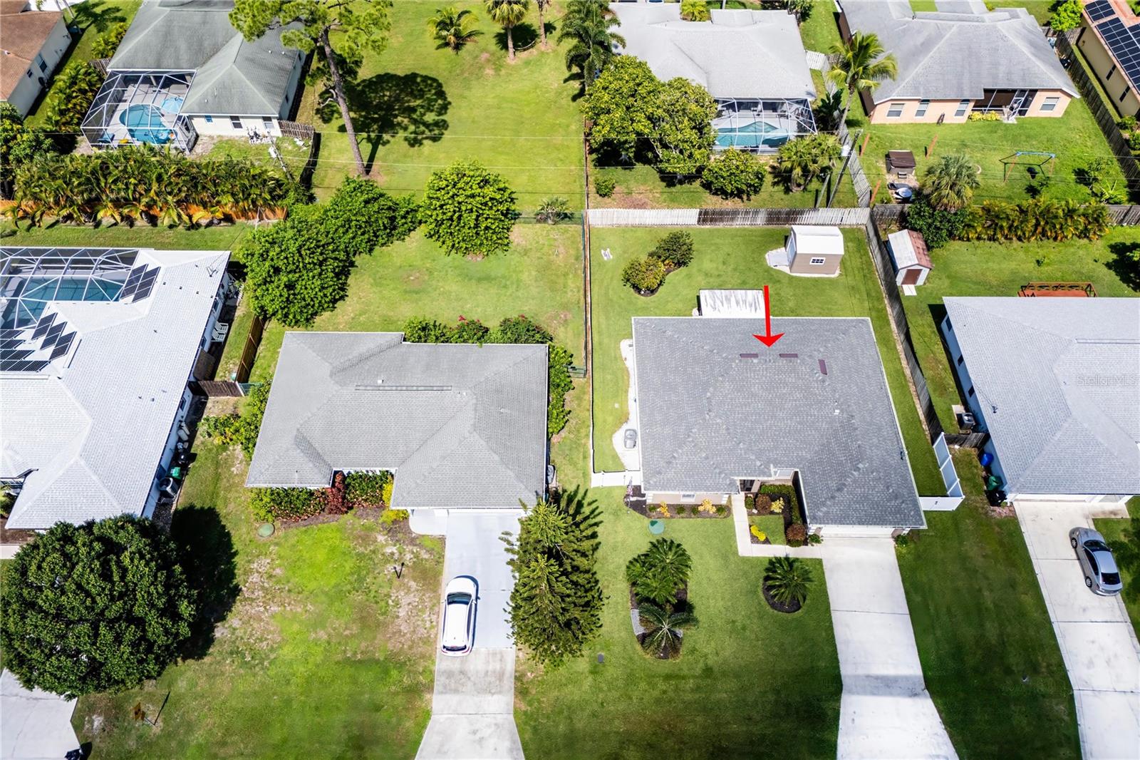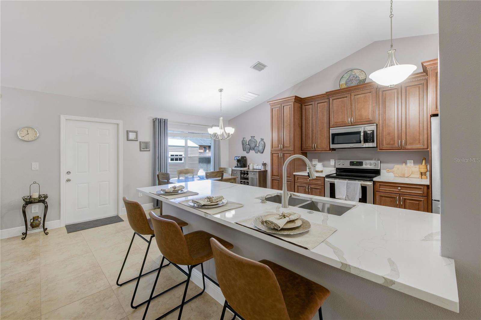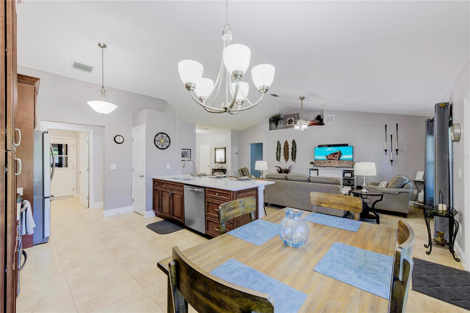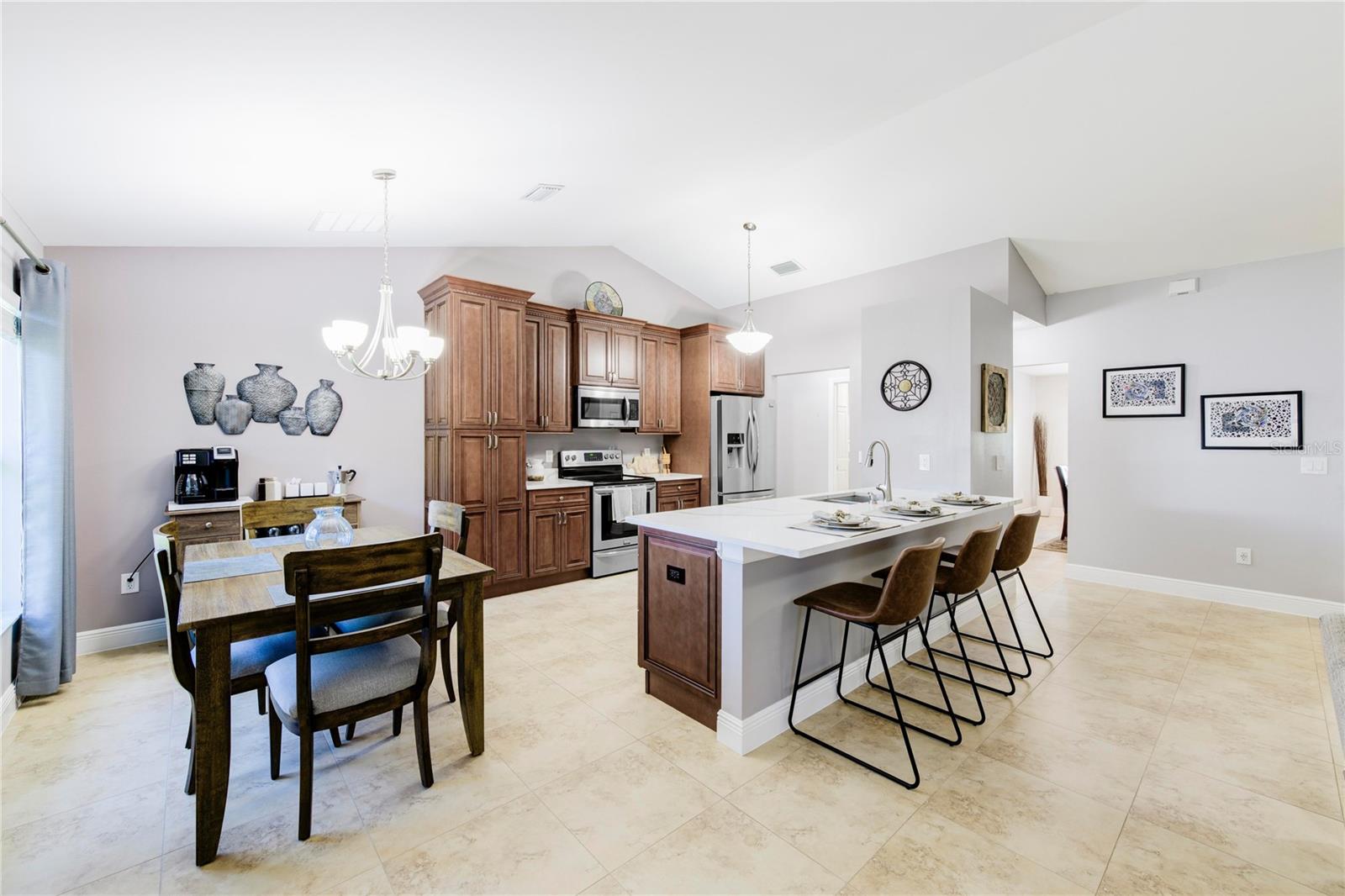 Welcome to your new home! This beautifully maintained 4-bedroom, 3-bathroom residence features vaulted ceilings in the main living area, creating an airy and spacious feel. The upgraded kitchen boasts sleek counters and cabinets, while the bathrooms feature modern countertops. Enjoy the screened-in lanai and a fenced backyard—perfect for relaxation and play. The property is adorned with a well-manicured front and back lawn and has been freshly painted inside and out for a crisp, contemporary look. Located conveniently near restaurants, highways, and shopping centers, this home offers both style and convenience.ONLY 5 MINUTES FROM TRADITION COMMUNITY AND AMMENITIES! Don’t miss the chance to make it yours! ROOF 2023 - AC 2018 - NEW IRRIGATION SYSTEM - E GLASS WINDOWS!