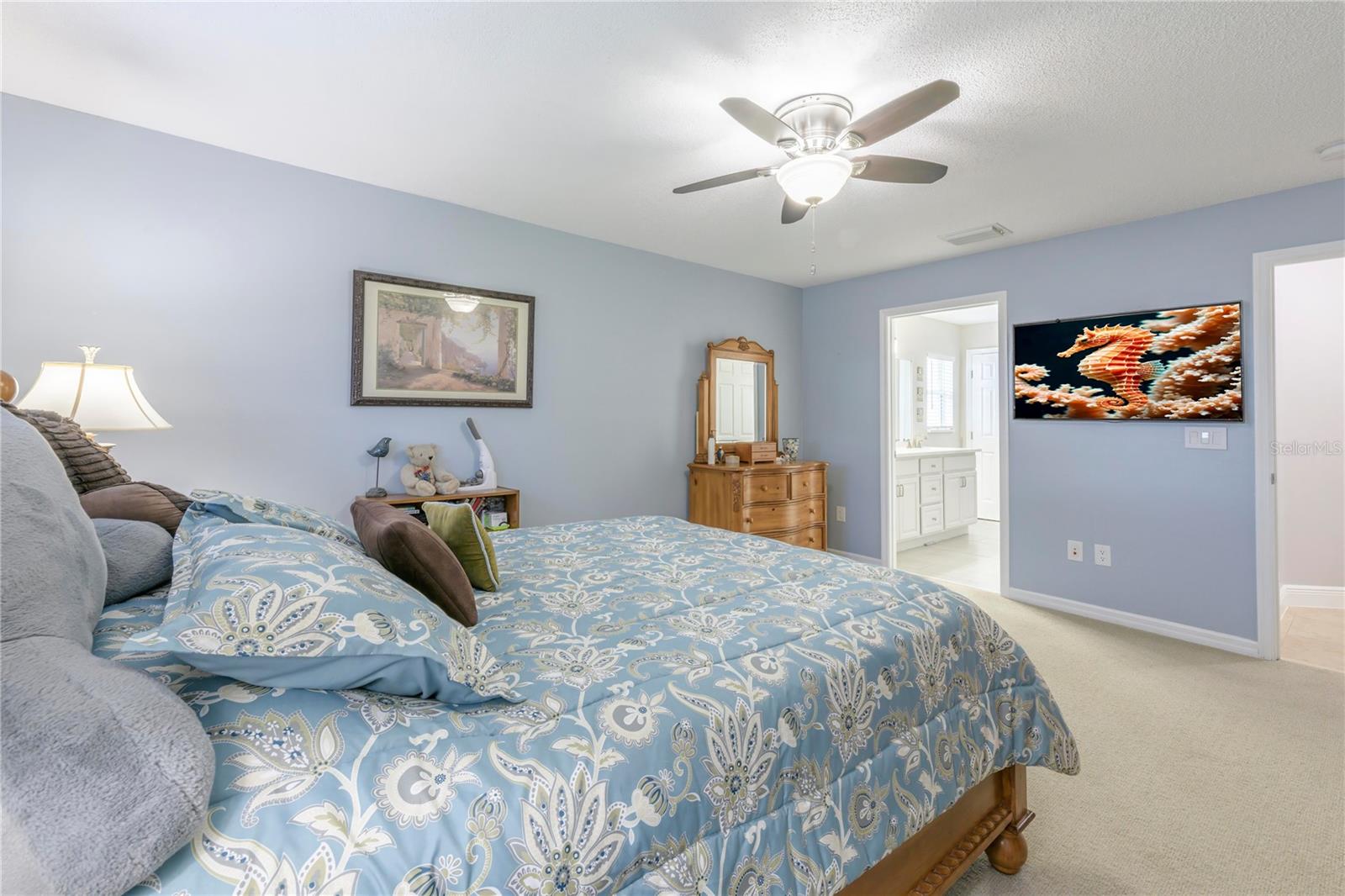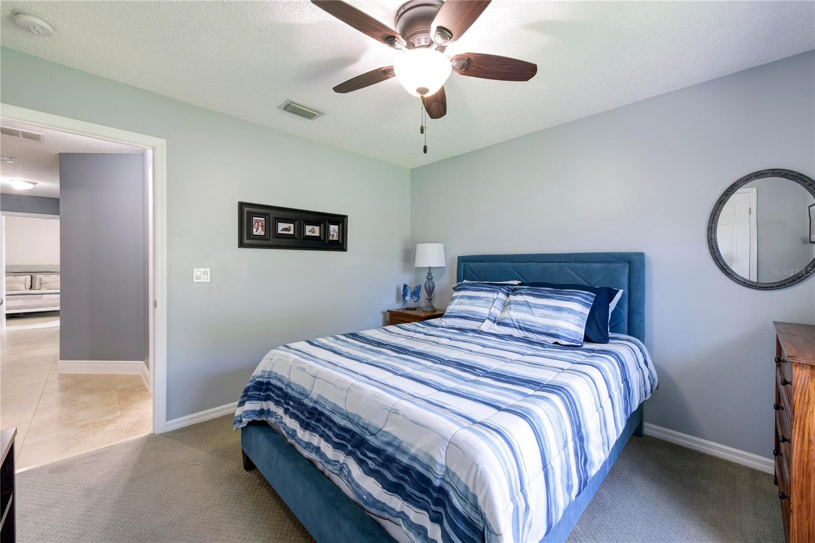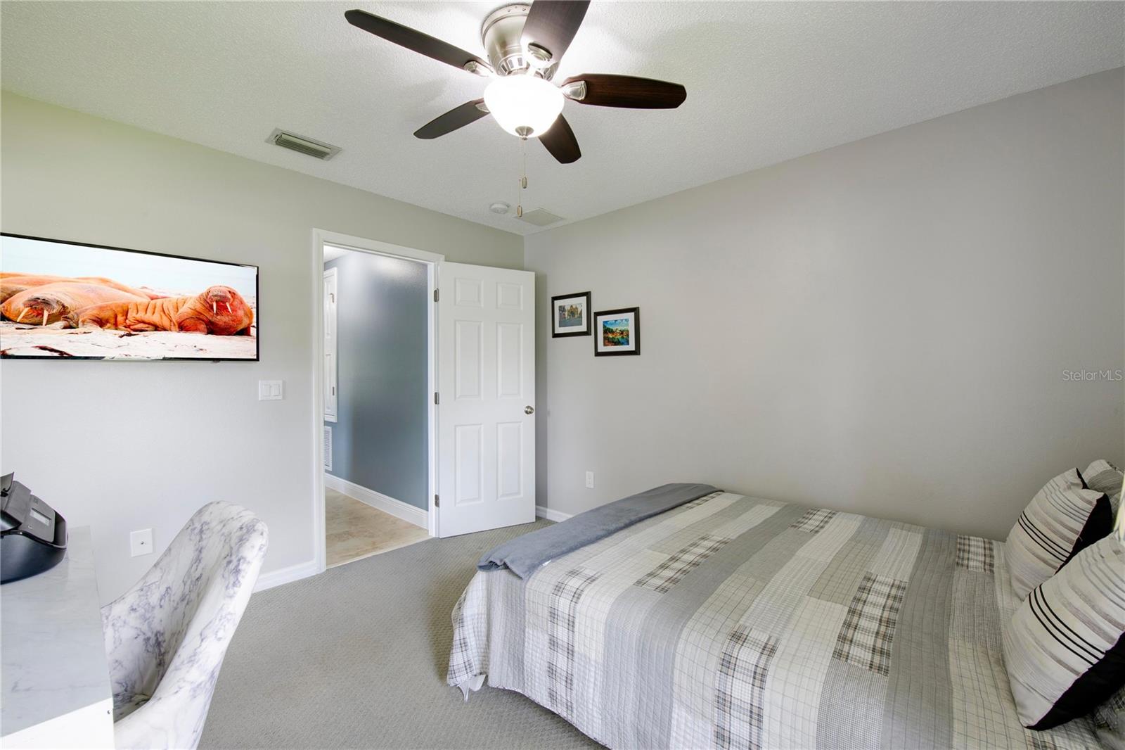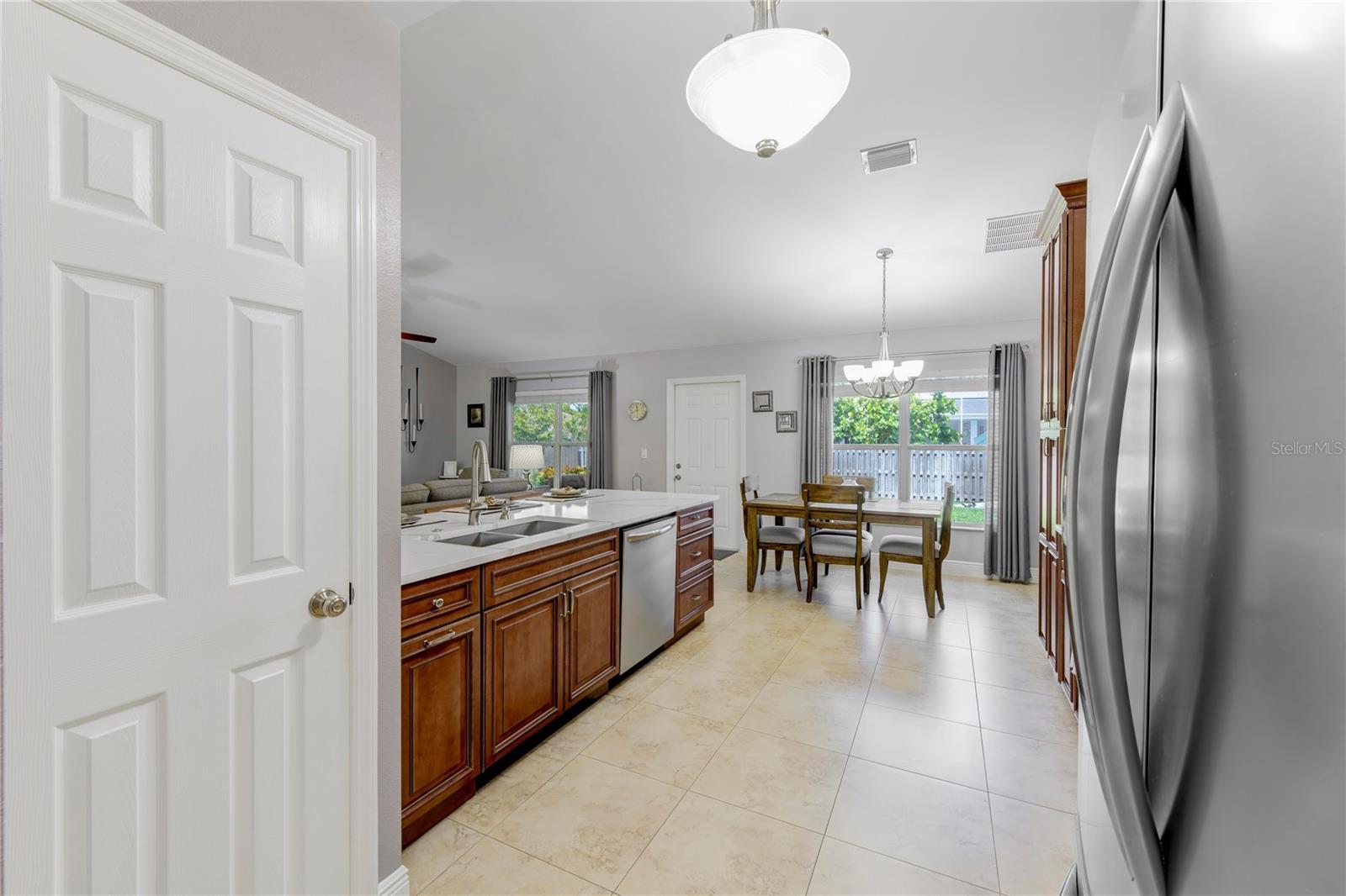 Welcome to your new home! This beautifully maintained 4-bedroom, 3-bathroom residence features vaulted ceilings in the main living area, creating an airy and spacious feel. The upgraded kitchen boasts sleek counters and cabinets, while the bathrooms feature modern countertops. Enjoy the screened-in lanai and a fenced backyard—perfect for relaxation and play. The property is adorned with a well-manicured front and back lawn and has been freshly painted inside and out for a crisp, contemporary look. Located conveniently near restaurants, highways, and shopping centers, this home offers both style and convenience.ONLY 5 MINUTES FROM TRADITION COMMUNITY AND AMMENITIES! Don’t miss the chance to make it yours! ROOF 2023 - AC 2018 - NEW IRRIGATION SYSTEM - E GLASS WINDOWS!