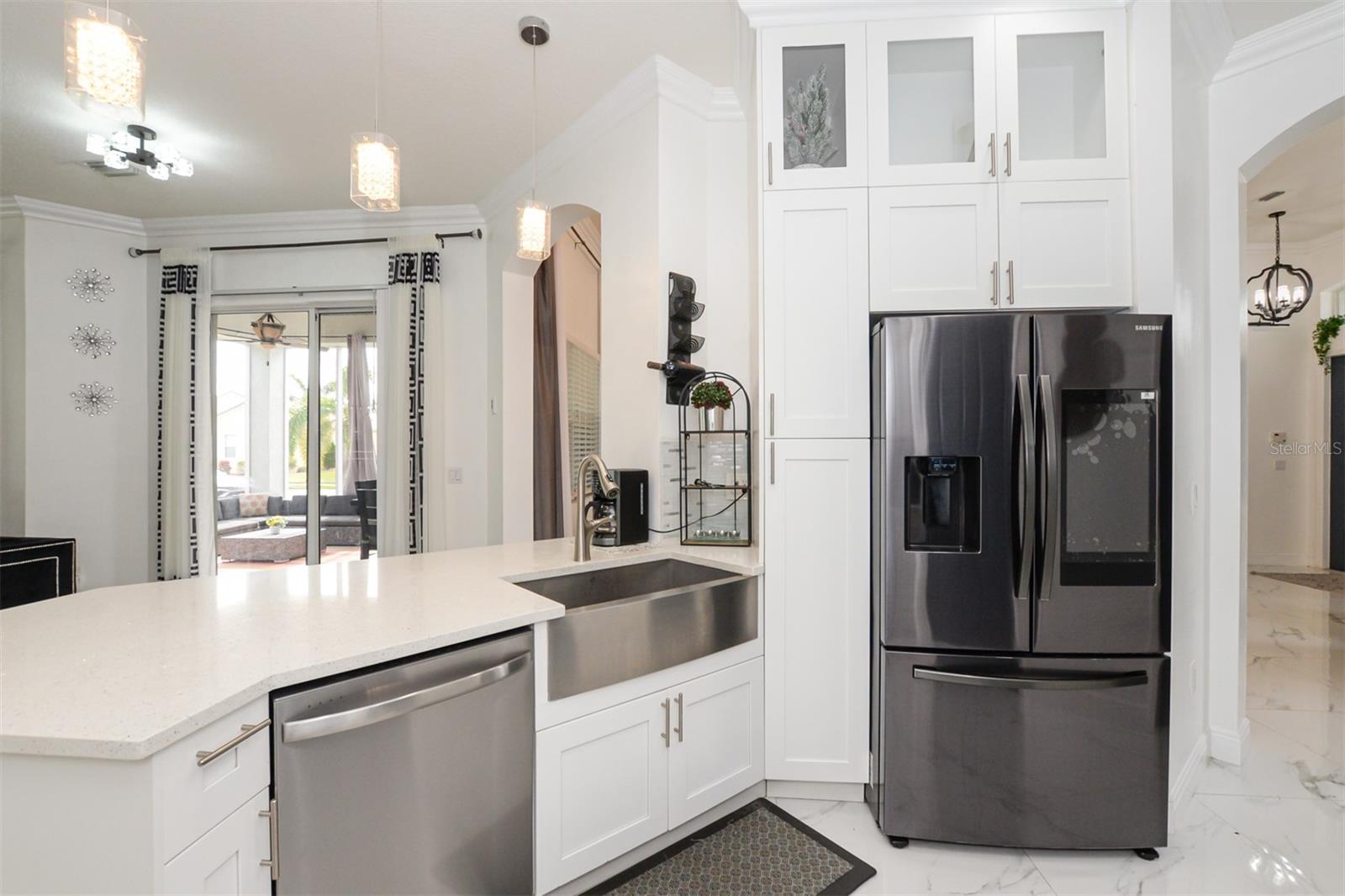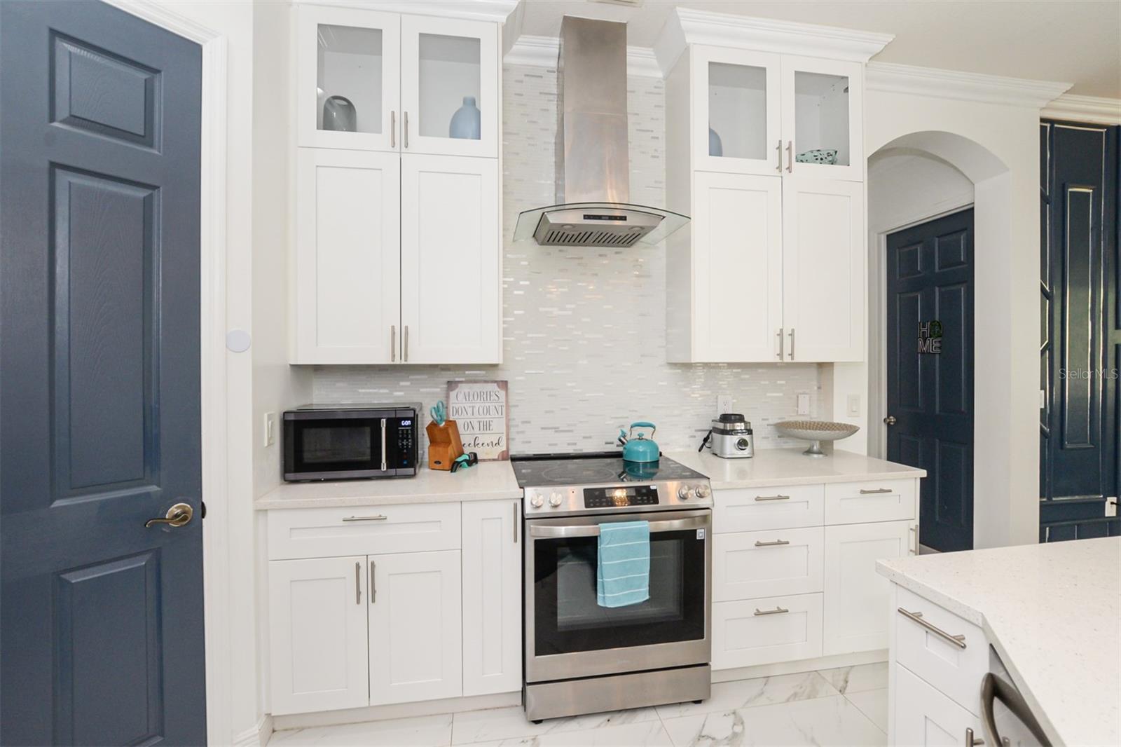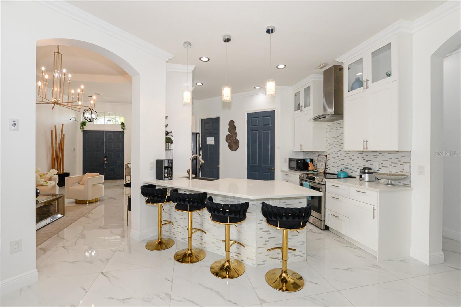 Stunning upgrades in this immaculately kept Lake Forest gem! This home sits on a corner lot. It was fully renovated in 2023, Gorgeous Calcutta Marble tile throughout. New kitchen with shaker cabinets and quartz tops with stainless upgrades including farmhouse apron sink & smart appliances, W+D, hot water heater. Soaring12ft ceilings. Beautifully accented walls create depth and luxury.The home is fully furnished and all items can convey with the sale or with a separate contract. Partial lake view from the back yard. Beautiful composite roof and herringbone pavered driveway. Lake Forest is a gated community that features 2 pools, jacuzzi tub, club house, playground, picnic area, fitness room and is dog friendly! HOA includes internet, cable & lawn maintenance.