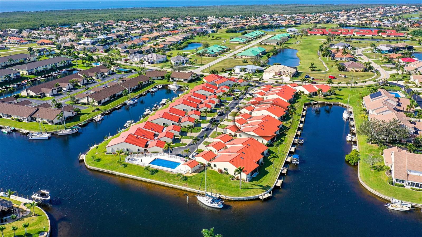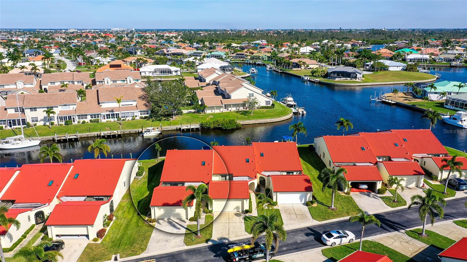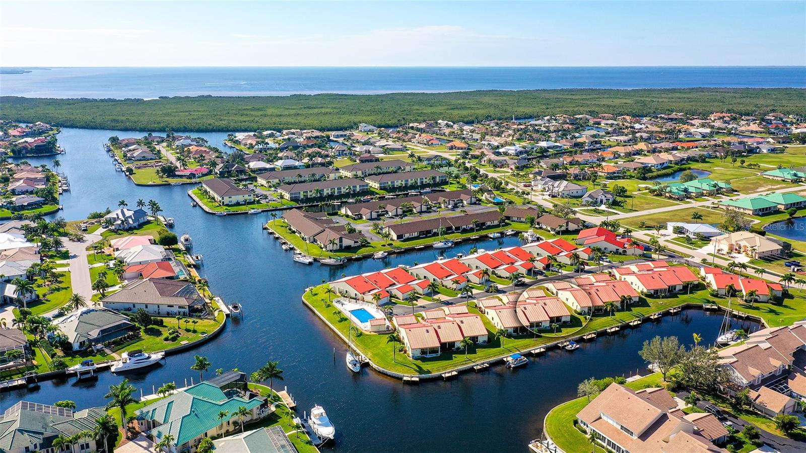 Waterfront, dock & views! Easy access to harbor from this 3 bedroom, 2 bath spacious end unit villa with a new roof and a 2 car garage! Attractive updated kitchen with new appliances! This light & bright home is located in a beautiful smaller community in the heart of Punta Gorda Isles! Enjoy the sun & meet up with your neighbors at gorgeous swimming waterfront community pool! Feel safe with the hurricane shutters throughout. There is lots of storage in this unit. The bricked garden terrace awaits your green thumb! Enjoy common wildlife sightings & evening breezes from your lanai with all new sliding windows or from your dock on the water. Park your vessel, throw in your fishing line or just enjoy the nature from your own dock. It's a couple of miles to Fishermans Village & a couple more miles to the darling town of Punta Gorda with many restaurants & intriguing boutiques & shops. Villas at Bal Harbor is an active community with miles of walkable sidewalks in Punta Gorda. St Andrews Golf Club is across the street. Punta Gorda Airport is only 6 and half miles from your door. Presenting a lifestyle, location & price that is hard to beat!