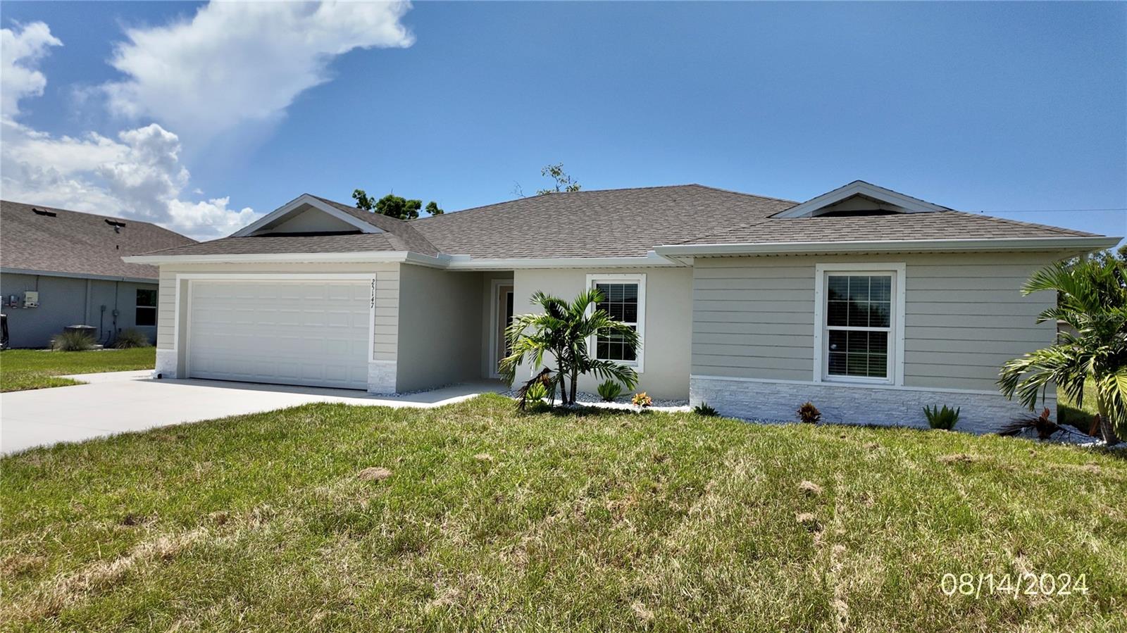 Ready for move-in!. Synergy Homes is renowned for its efficient building processes and timely delivery, and this stunning 4-bedroom, 2-bathroom residence is no exception. Step inside and experience the meticulous attention to detail that sets this home apart. The heart of the home is the inviting great room, filled with natural light streaming through glass sliders that lead to the spacious 10x16 under-truss lanai area, perfect for enjoying the Florida sunshine. The charming kitchen is a chef's delight, boasting ample cabinet space, sleek stainless steel appliances, luxurious Quartz countertops, and a convenient breakfast bar – ideal for entertaining or casual dining. Retreat to the primary bedroom, complete with an ensuite bathroom featuring dual sinks and a spacious shower, large walk-in shower, offering a tranquil oasis of relaxation. Three additional bedrooms provide flexibility and space for family or guests, sharing a well-appointed guest bathroom with dual sinks and a tub/shower combo. Garage epoxy flooring adds durability and a touch of sophistication to the home, while the exterior will feature a paver driveway & walkway, along with lush, freshly laid sod, creating a welcoming and picturesque curb appeal. Nestled in the peaceful setting of Burnt Store Village, with a reasonable HOA fee, this home offers an ideal location between Punta Gorda and the rapidly developing Pine Island Corridor in Cape Coral – ensuring convenience and access to a variety of amenities and attractions. FULL BUILDERS WARRANTY INCLUDED! Plus, enjoy the opportunity to speak directly with the builder, ensuring personalized service and peace of mind throughout the home-buying process. Don't miss out on this rare opportunity to own a brand-new home without the long wait. Schedule your viewing today and make your dream of homeownership a reality! Have your own lot? Builder can also build one for you on it!